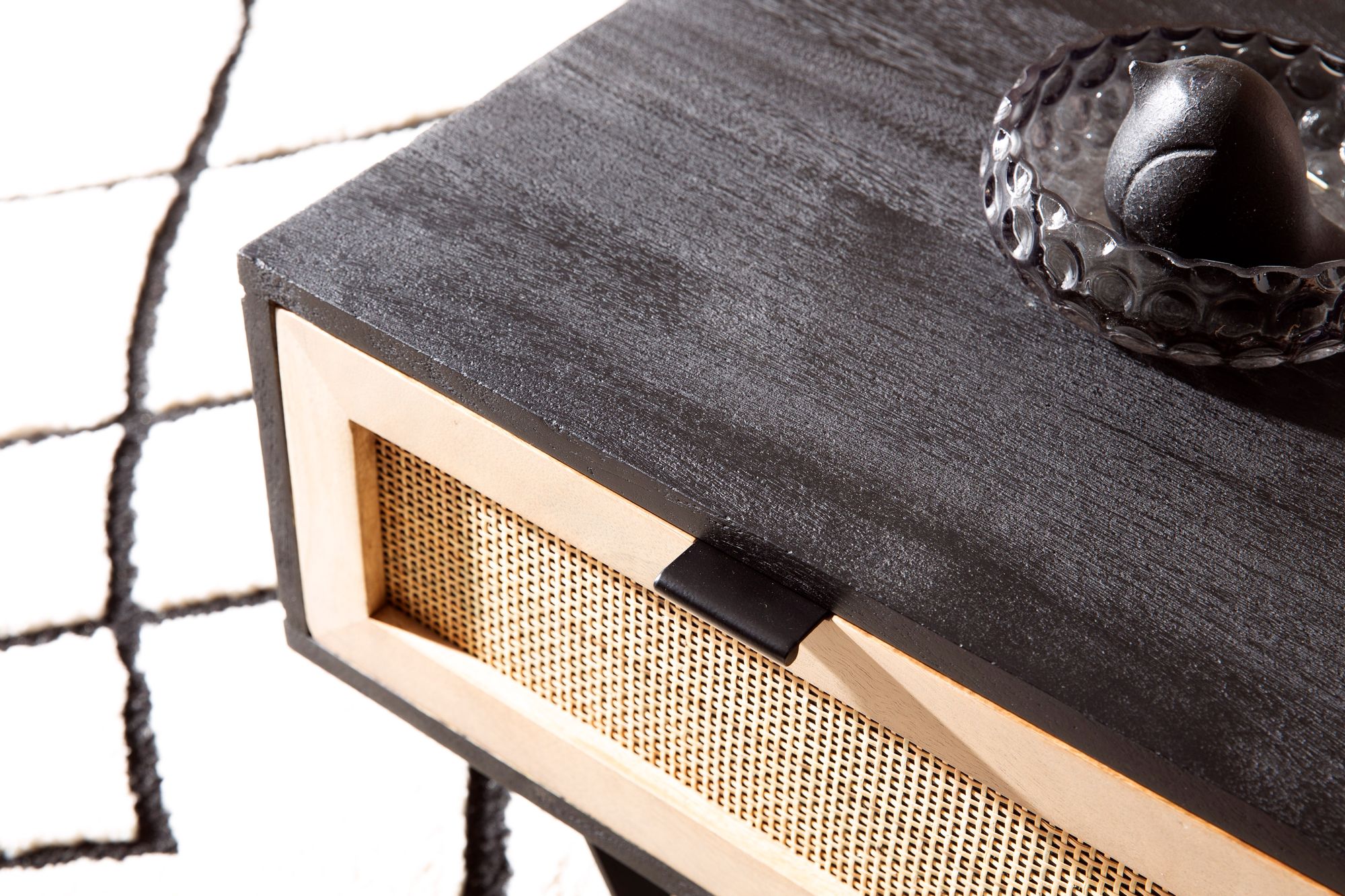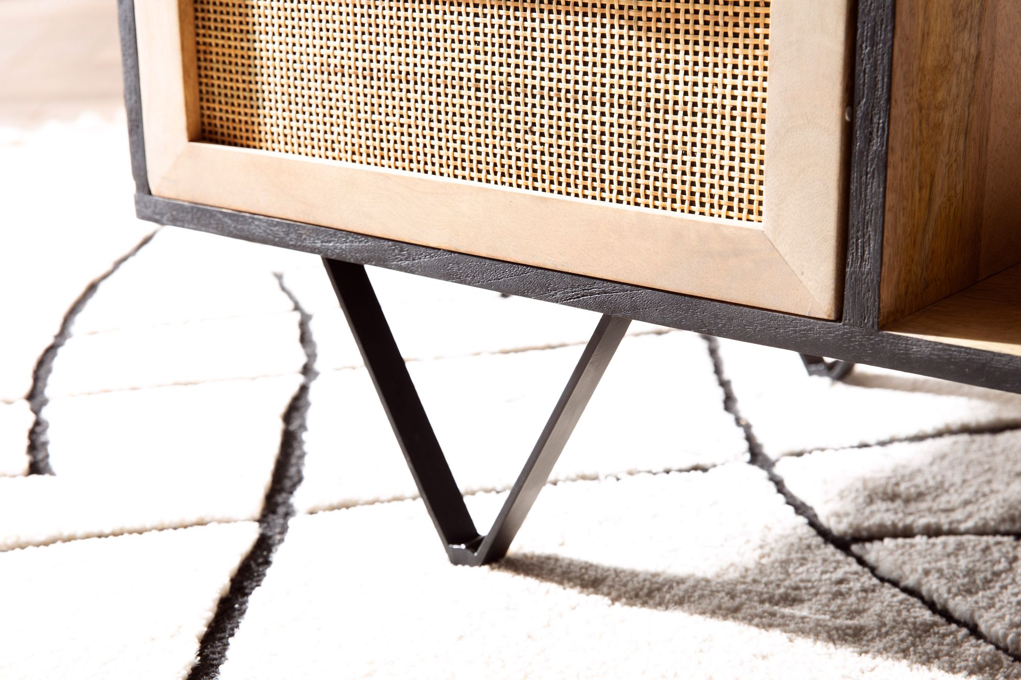 - Material: Mango Massivholz (Korpus und Schublade), Schilfrohrgeflecht (Schubladenfront), pulverbeschichtetes Eisen (Griff und Beine)