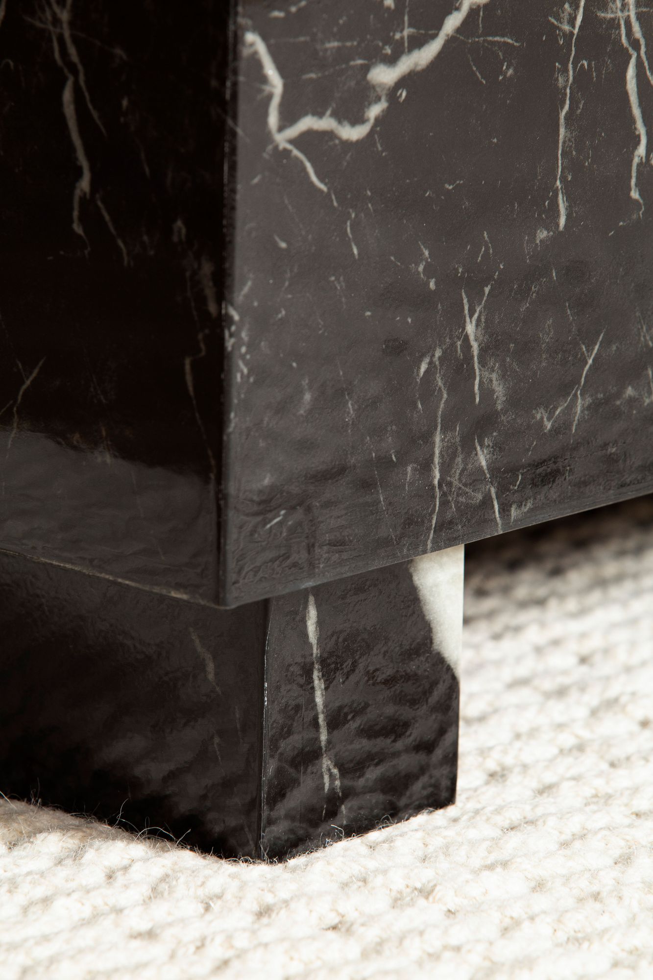 Verleihen Sie Ihrem Wohnzimmer mit dem Couchtisch MONOBLOC einen zeitgemäßen Hauch von Eleganz. Gefertigt aus foliertem MDF in Schwarz Hochglanz mit ausdrucksstarker Marmoroptik bietet er ein modernes und edles Design, das in jede Einrichtung passt.