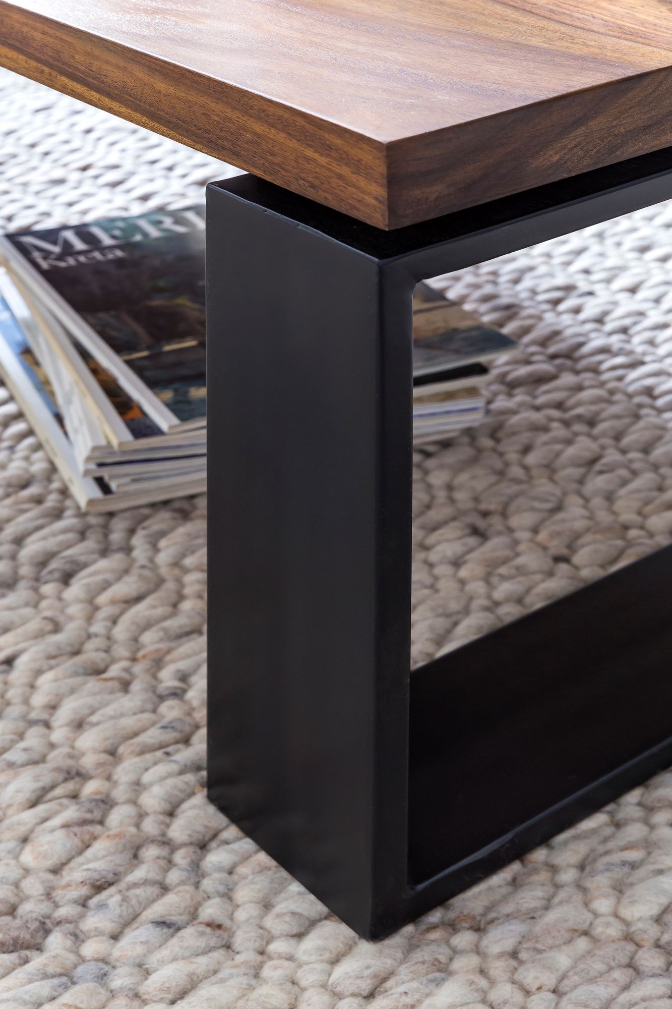 Bringen Sie mit diesem Couchtisch aus massivem Sheeshamholz einen industriellen und natürlichen Akzent in Ihr Wohnzimmer. Die Kombination aus naturbelassener Holzplatte und robusten, schwarz lackierten Metallbeinen schafft ein stabiles und stilvolles Möbelstück.