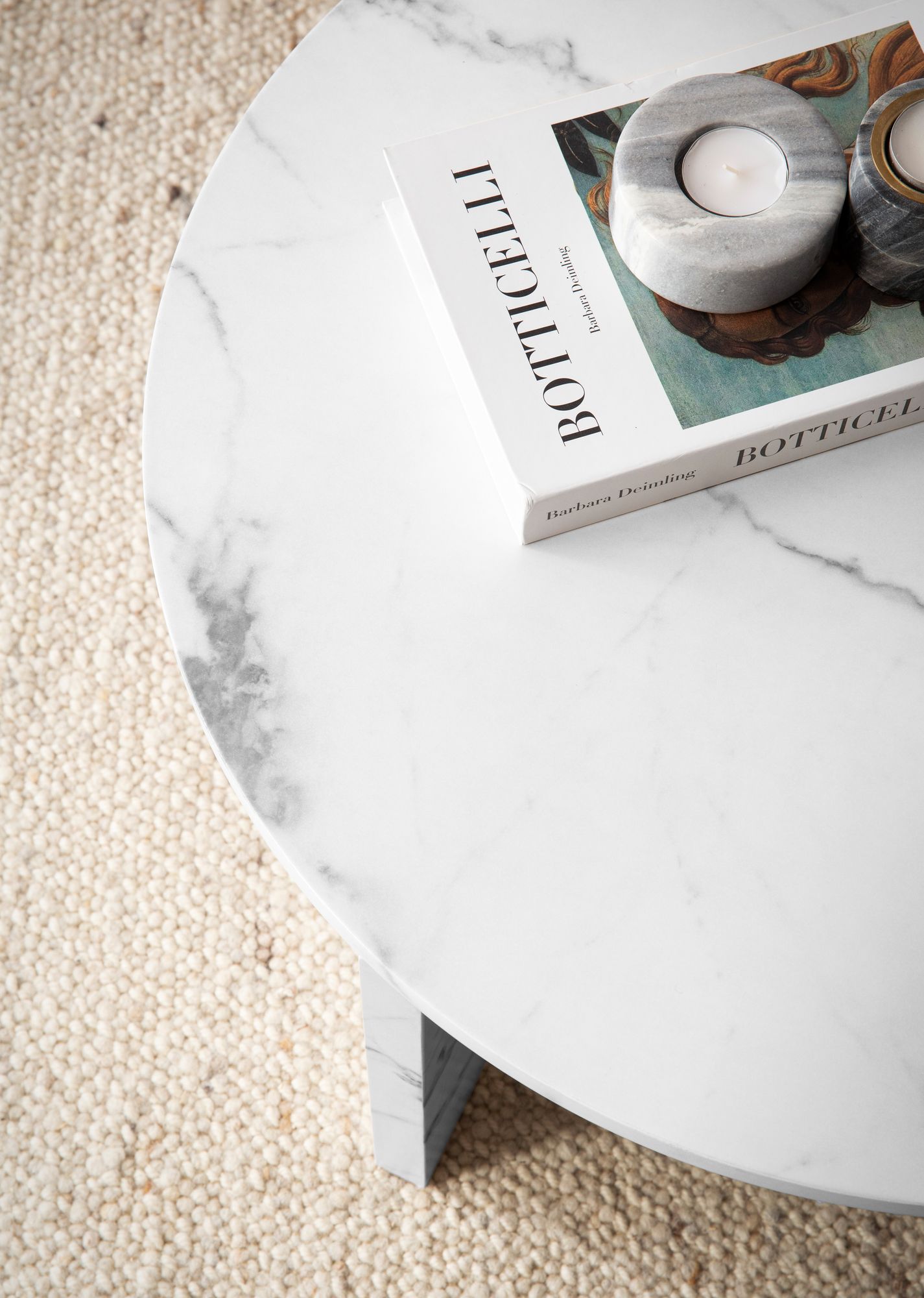 Bringen Sie mit diesem runden Couchtisch in Weiß aus foliertem MDF mit matter Marmoroptik eine helle und elegante Atmosphäre in Ihr Wohnzimmer. Das schlanke, moderne Design integriert sich nahtlos in verschiedene Wohnräume.