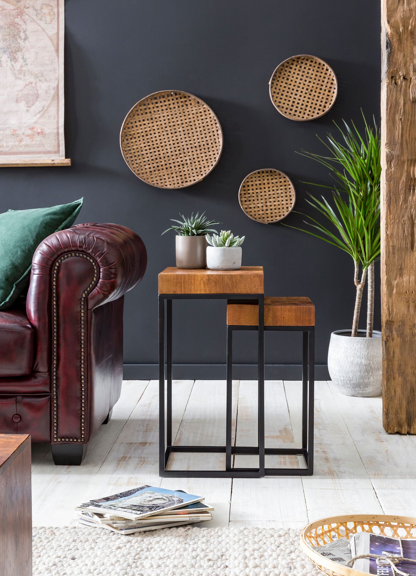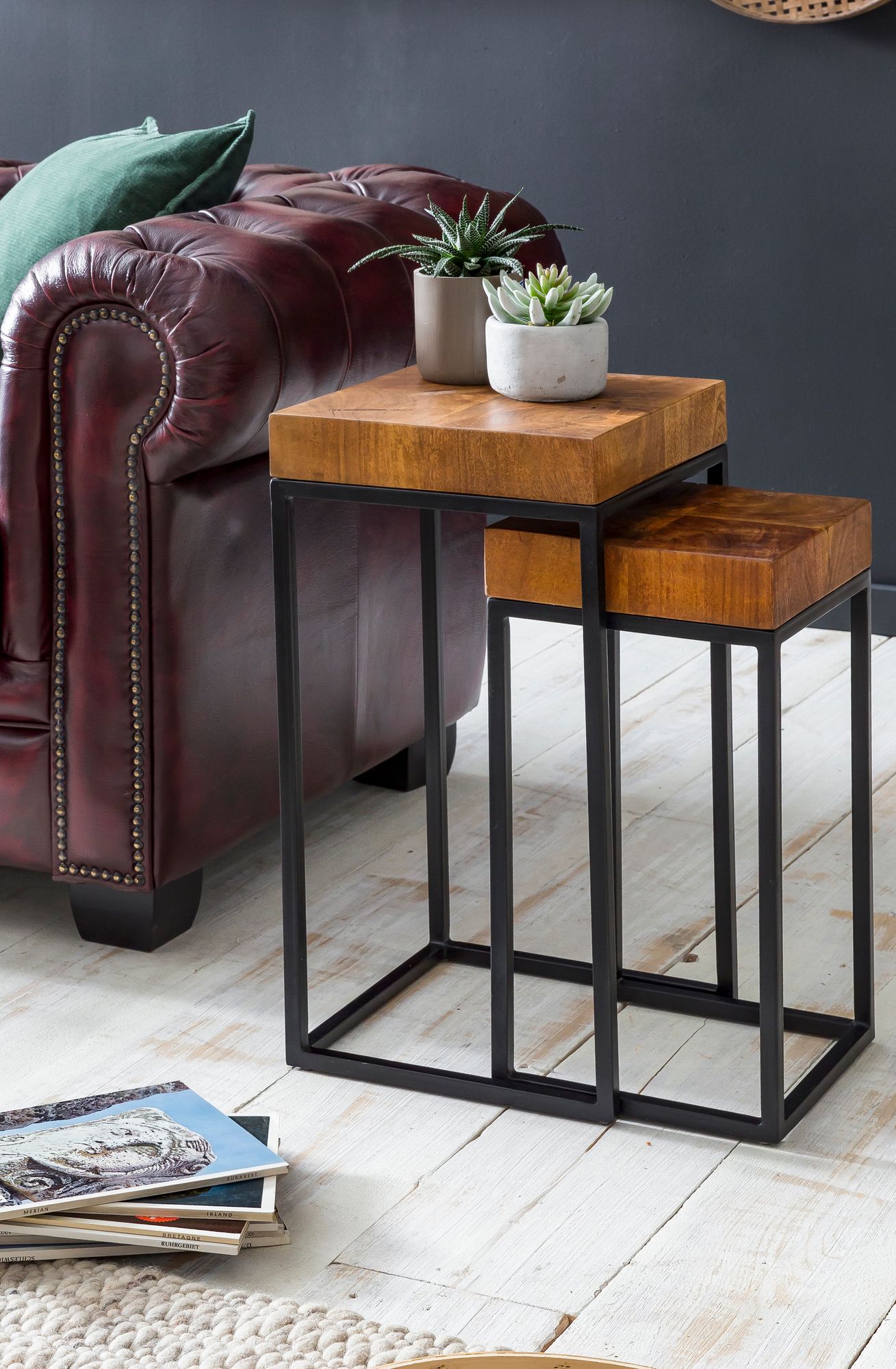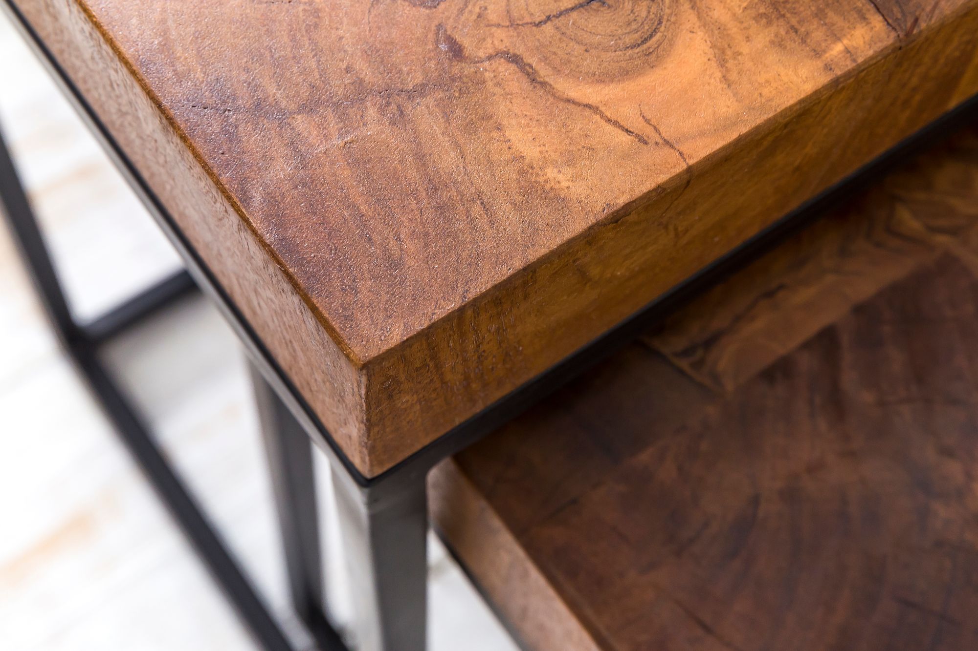 Bringen Sie mit diesem zweiteiligen Satztisch-Set im angesagten Industrial-Design Eleganz in Ihr Wohnzimmer. Jeder Tisch ist handgefertigt und durch die einzigartige Maserung des Sheesham-Holzes ein Unikat.