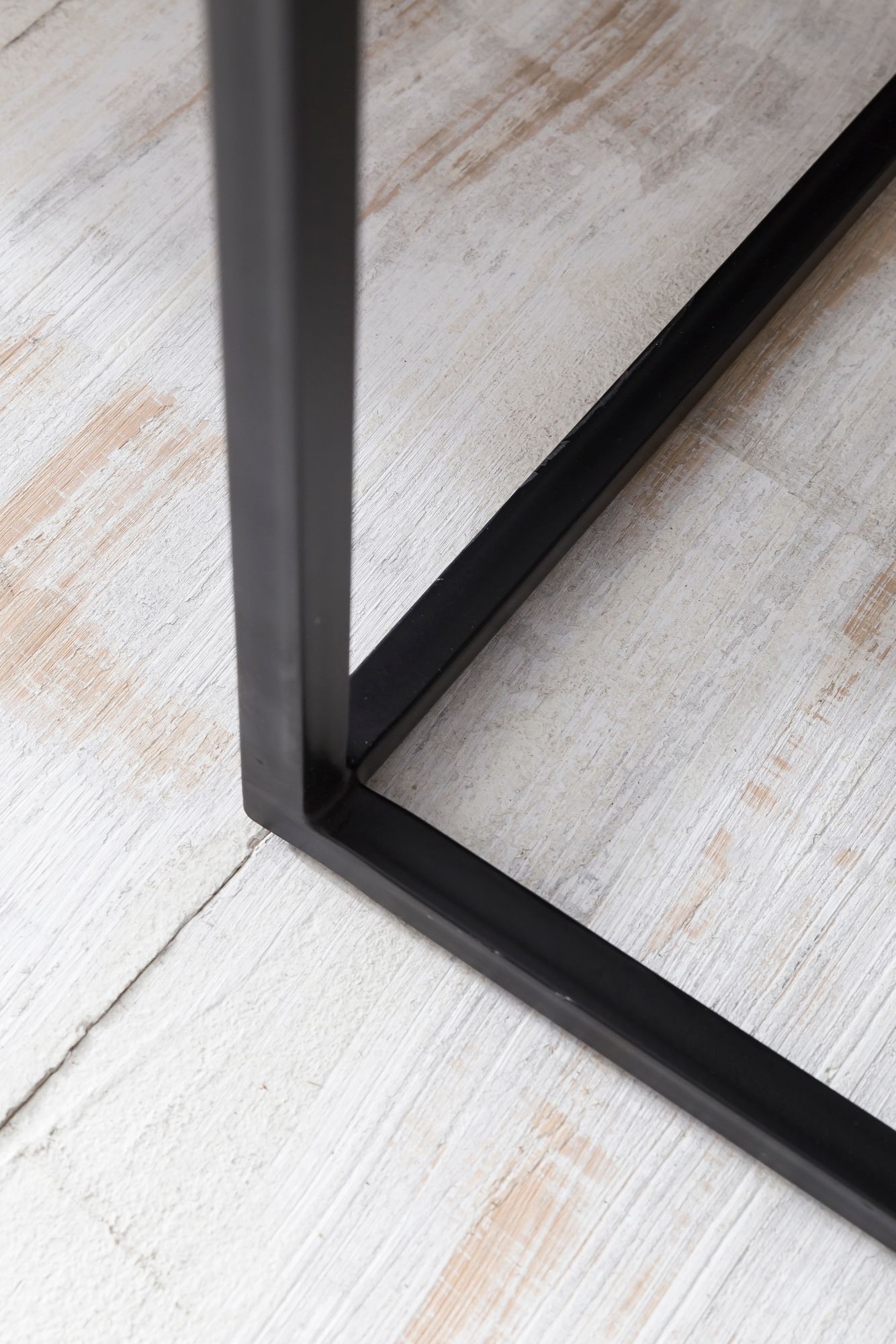 - Materialmix aus massivem Sheesham-Holz und pulverbeschichteten Edelstahlbeinen in matt Schwarz