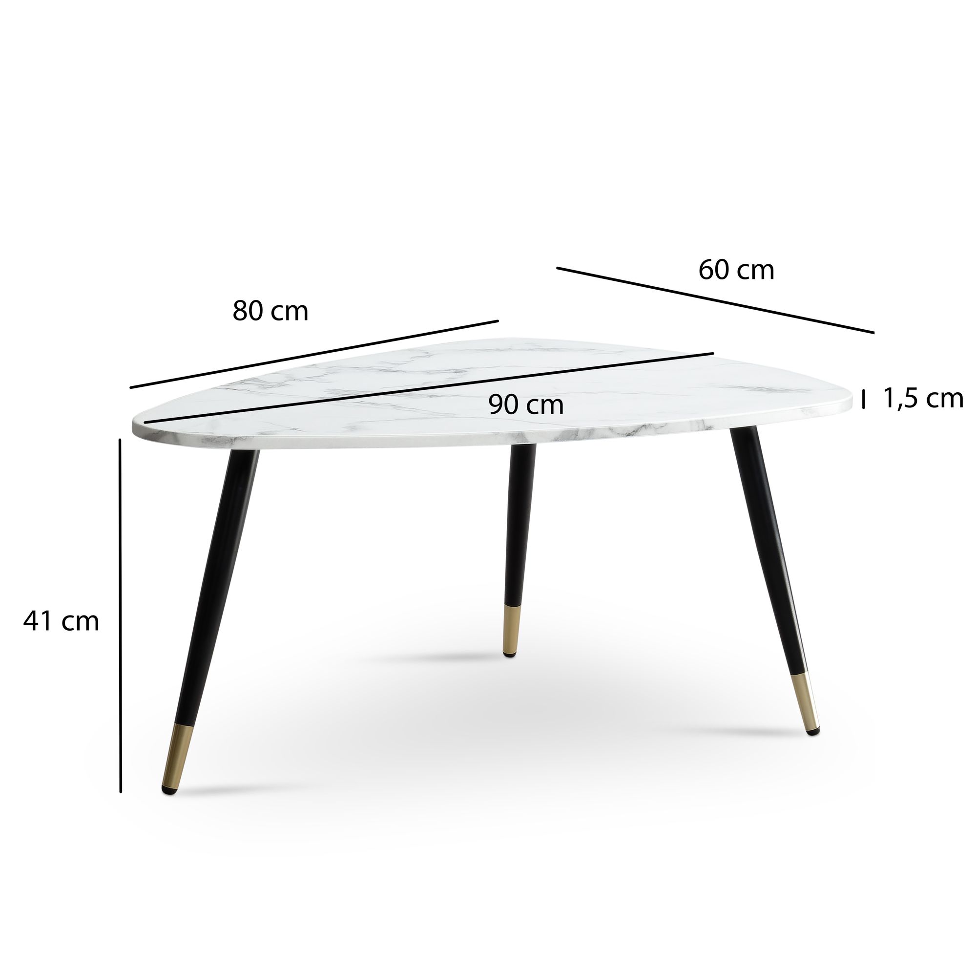Produktinformationen "Dreieckiger Couchtisch 90x60x41 cm | Weiß Marmor Optik | Metallgestell Schwarz und Gold"