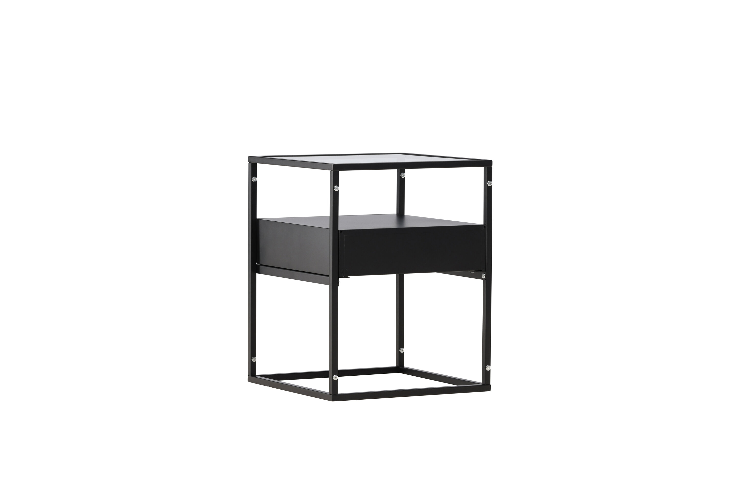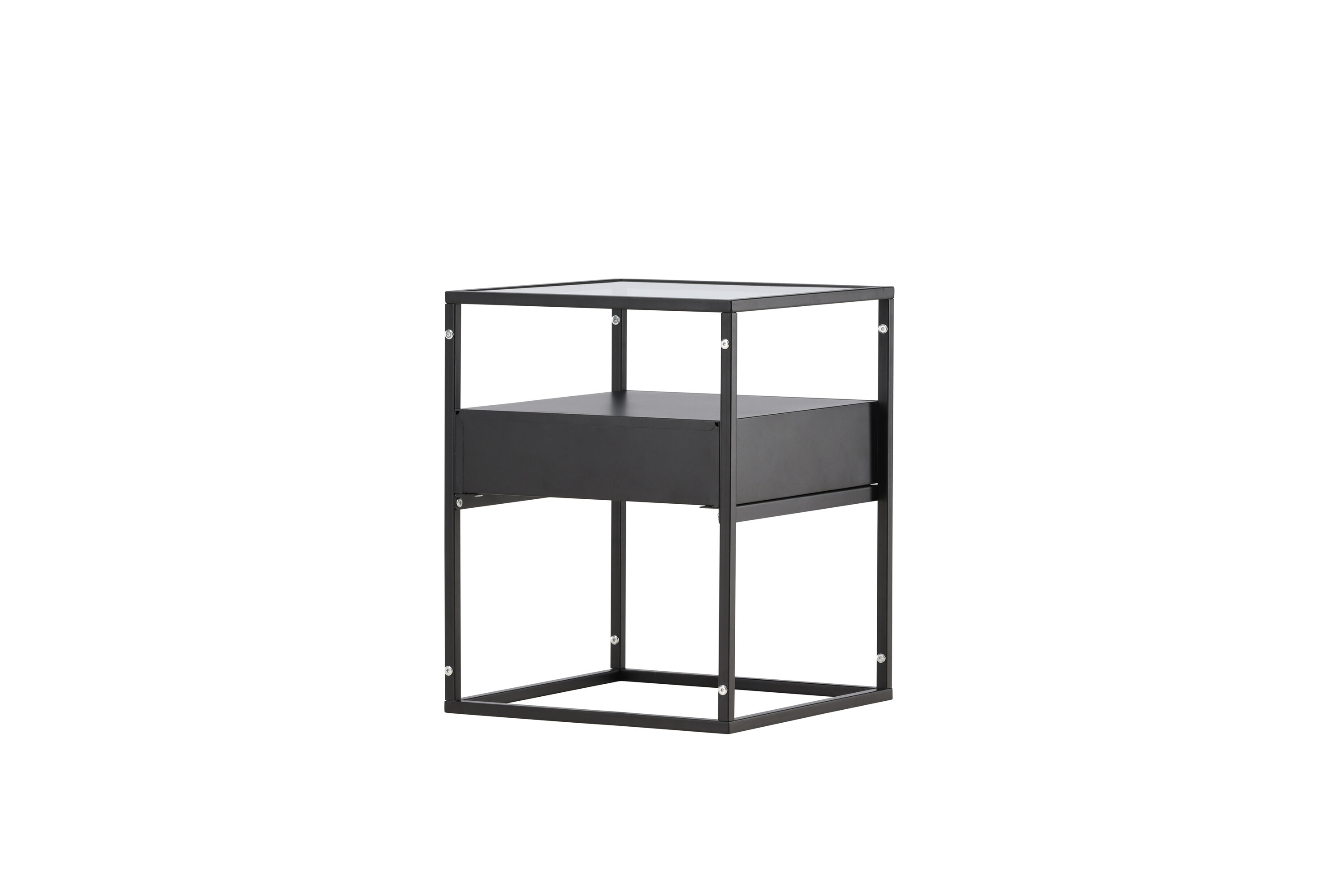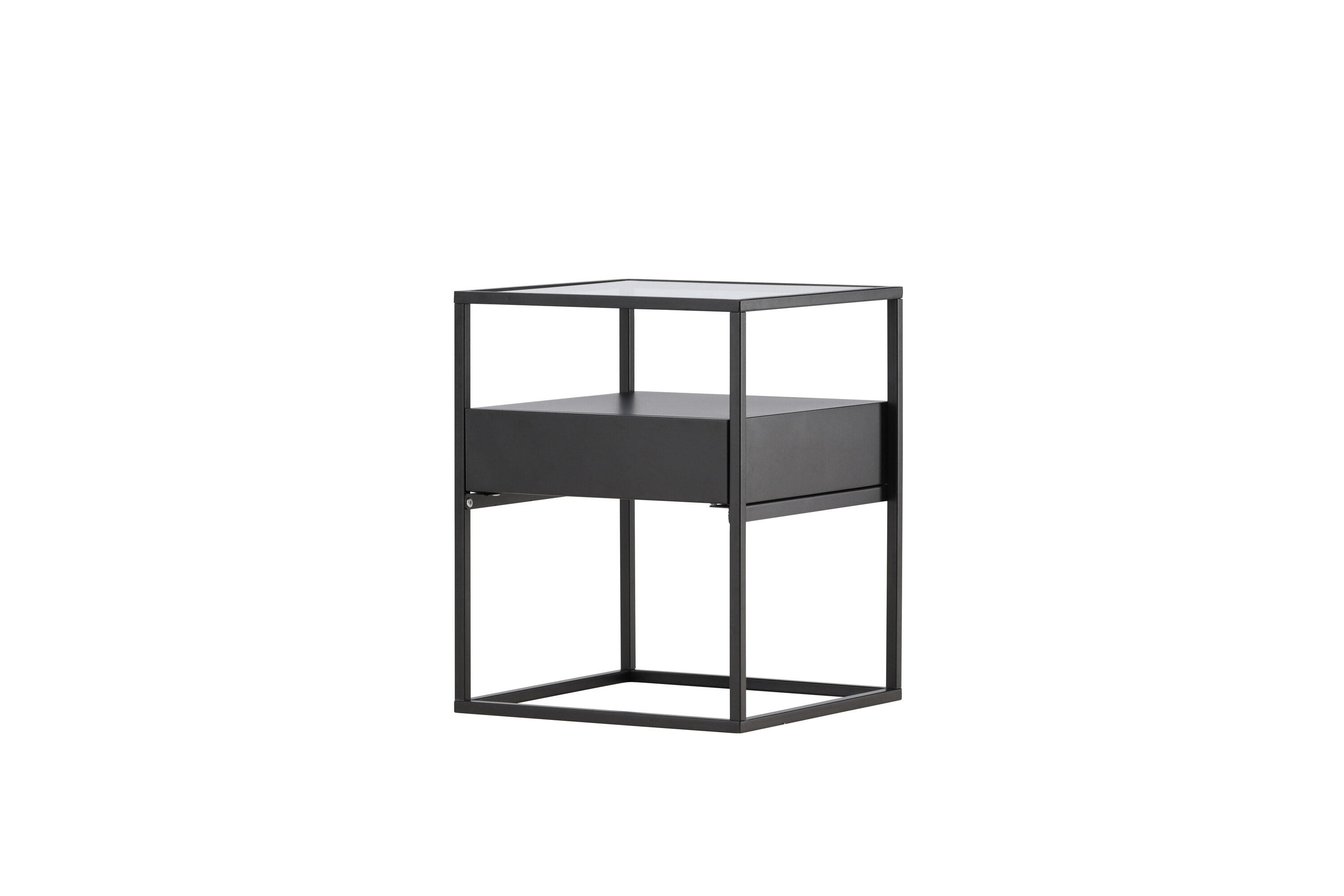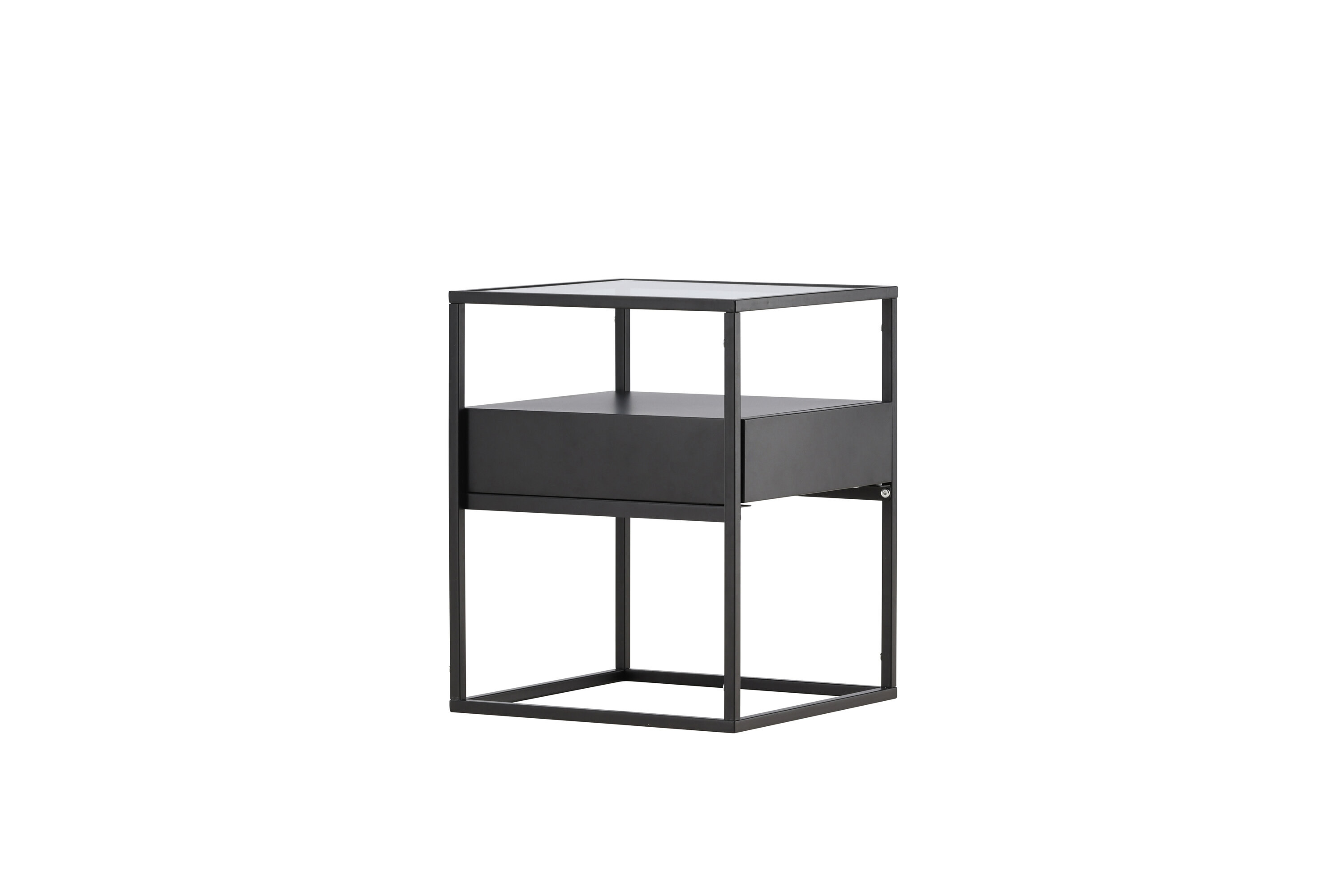 Dieser schwarze Beistelltisch hat eine Glasplatte und einen Rahmen aus schwarzem Stahl. Mit Platz für die bequeme Aufbewahrung ist dieser Beistelltisch auch mit einer diskreten Schublade und Regalen ausgestattet, die sowohl eine versteckte als auch eine sichtbare Aufbewahrung ermöglichen. Nie wieder Unordnung – halten Sie Ihre Sachen organisiert und schmücken Sie sie mit einem schönen Kerzenhalter oder einem Lieblingsbuch für eine persönliche und gemütliche Note.