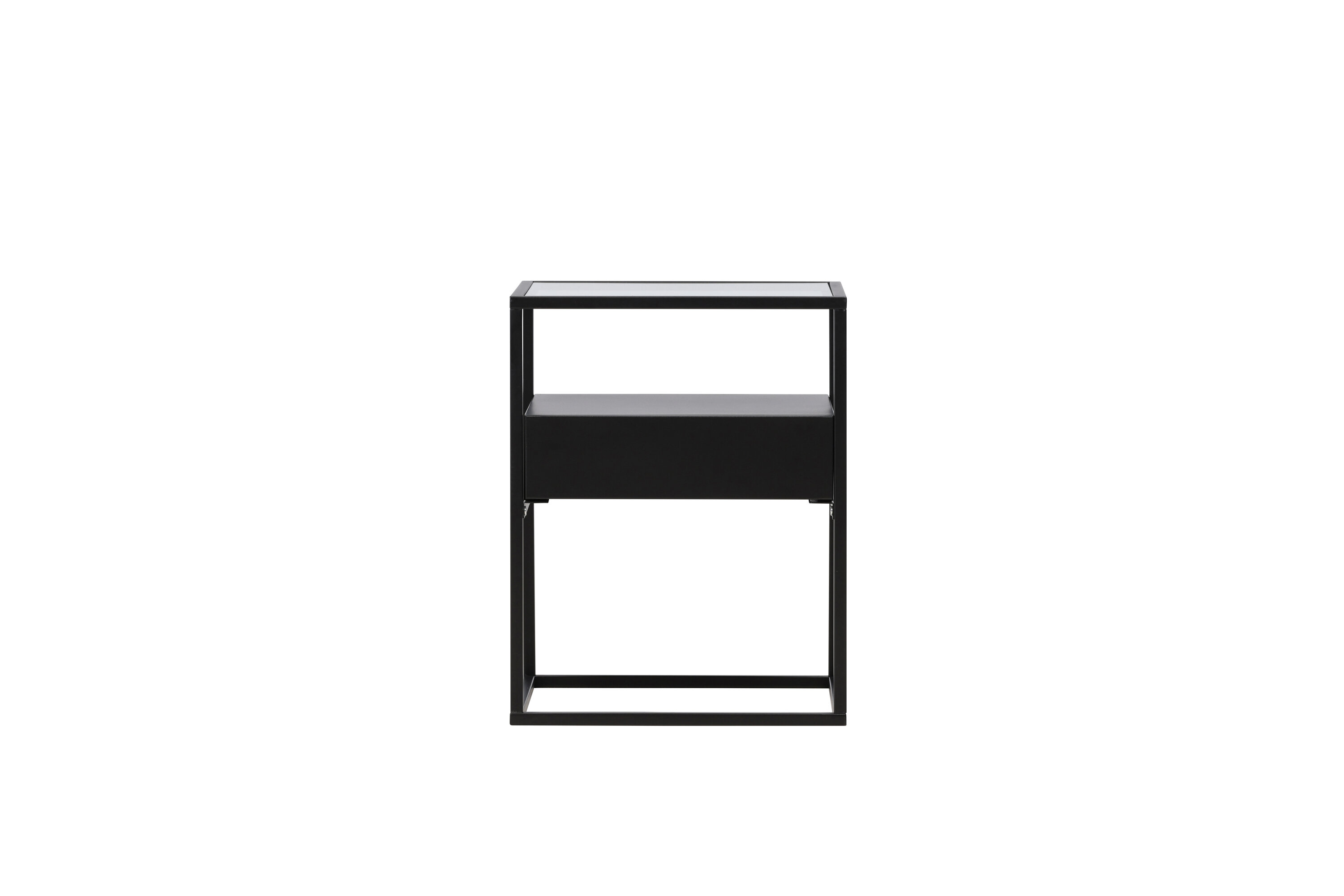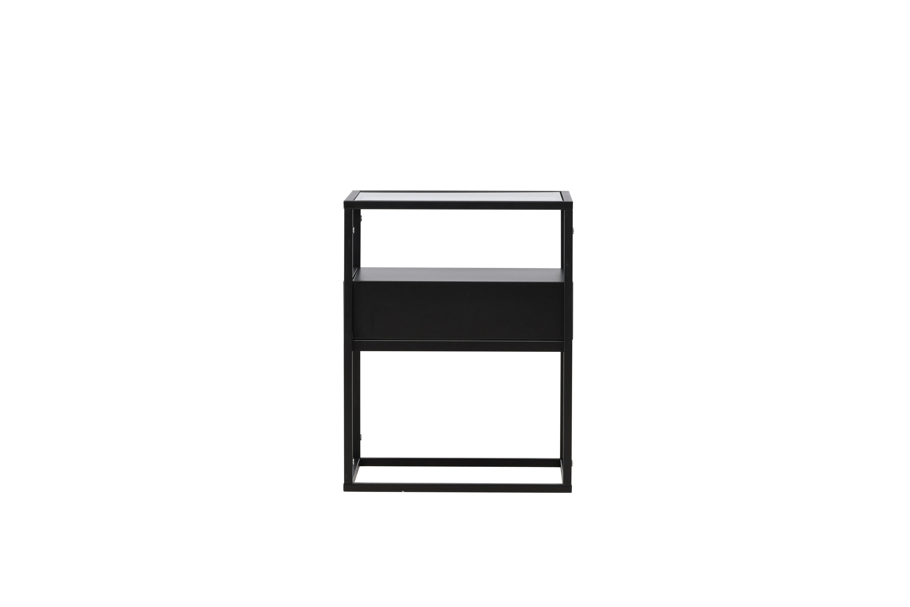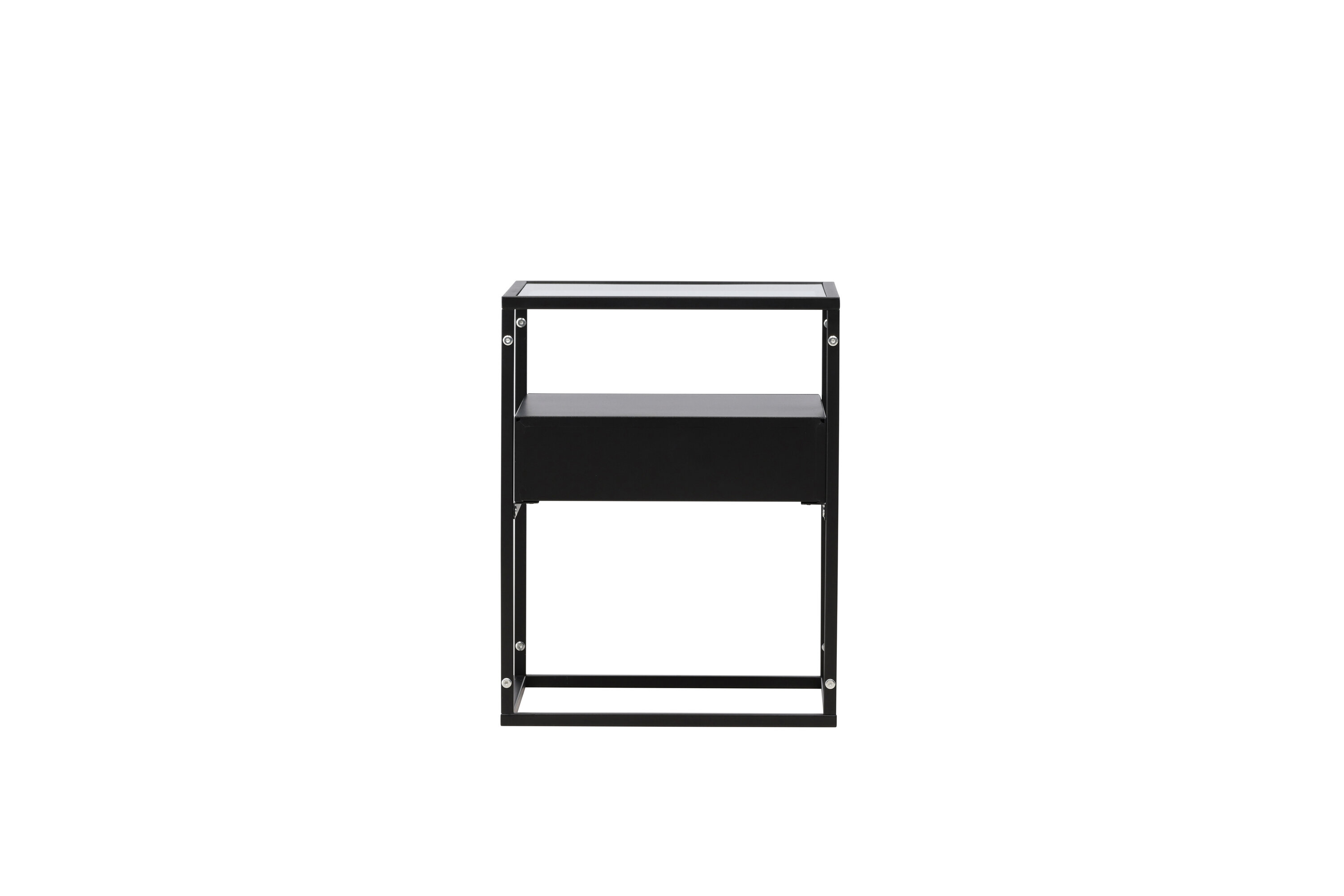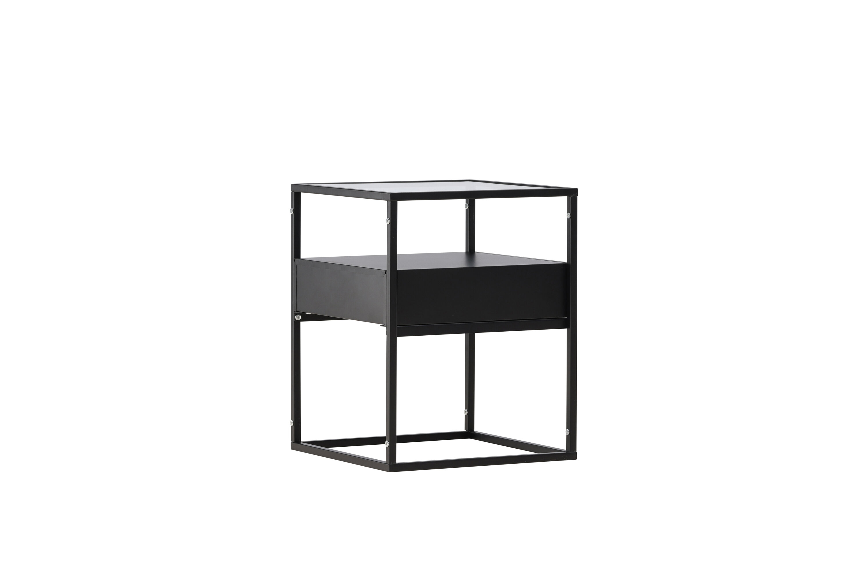 Dieser schwarze Beistelltisch hat eine Glasplatte und einen Rahmen aus schwarzem Stahl. Mit Platz für die bequeme Aufbewahrung ist dieser Beistelltisch auch mit einer diskreten Schublade und Regalen ausgestattet, die sowohl eine versteckte als auch eine sichtbare Aufbewahrung ermöglichen. Nie wieder Unordnung – halten Sie Ihre Sachen organisiert und schmücken Sie sie mit einem schönen Kerzenhalter oder einem Lieblingsbuch für eine persönliche und gemütliche Note.