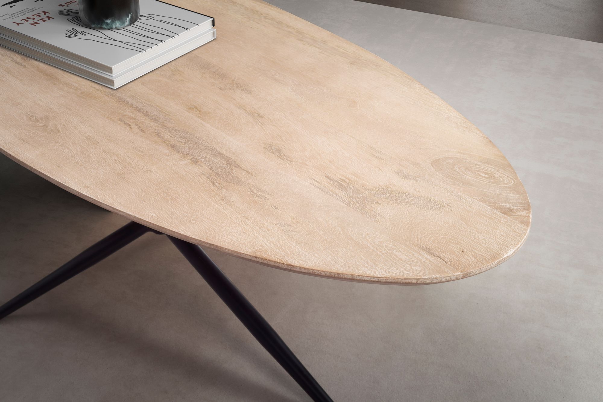Verleihen Sie Ihrem Wohnzimmer mit diesem ovalen Couchtisch aus weiß getöntem Mango-Massivholz einen stilvollen skandinavischen Charakter. Die warme natürliche Oberfläche zeigt eine sichtbare Holzmaserung und garantiert durch Handarbeit Einzigartigkeit und Stabilität.