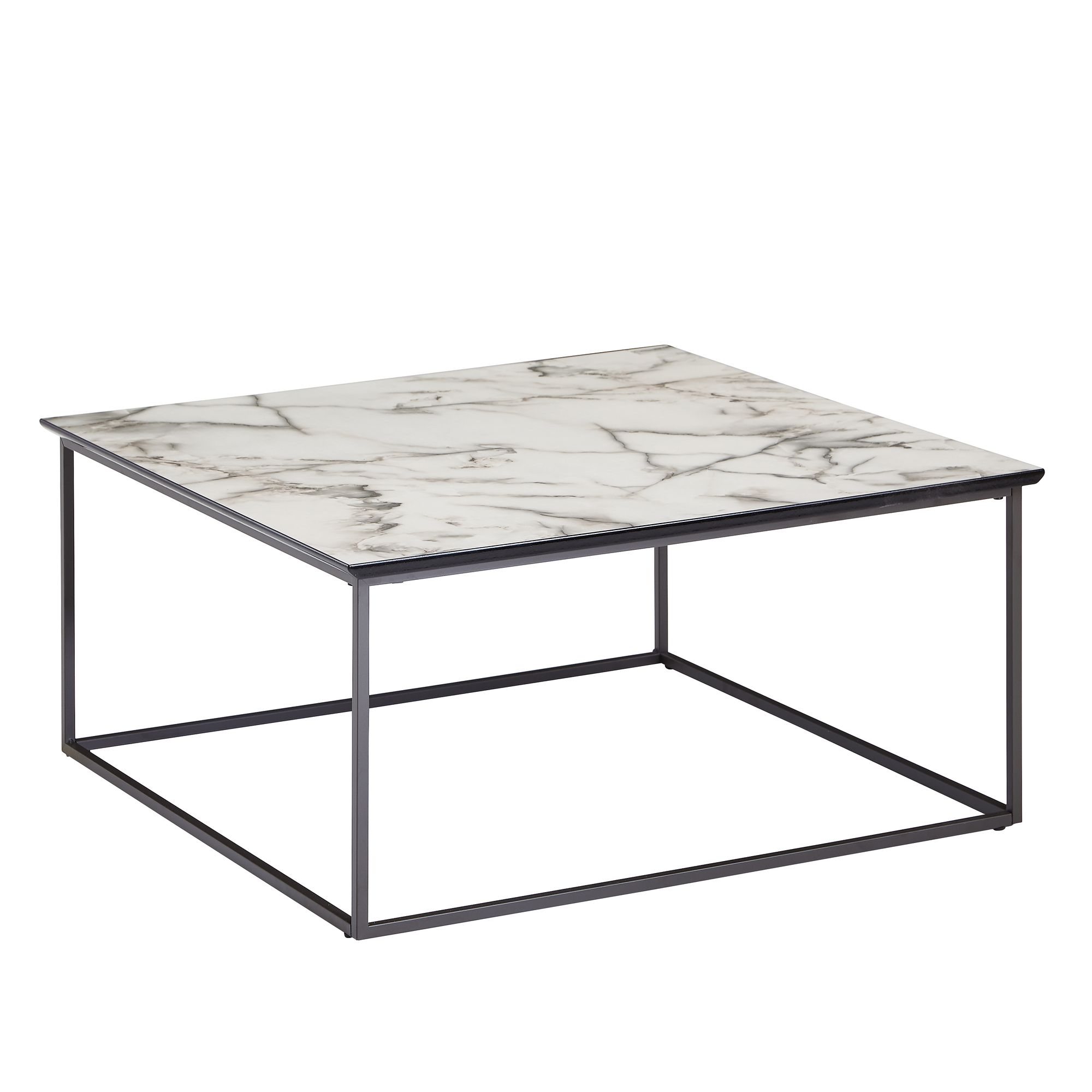 Verleihen Sie Ihrem Wohnzimmer mit diesem quadratischen Couchtisch im modernen Design eine elegante Note. Die Tischplatte in weißer Marmoroptik aus foliertem MDF mit Hochglanz sorgt für einen edlen Look, das schwarze, pulverbeschichtete Metallgestell garantiert Stabilität.