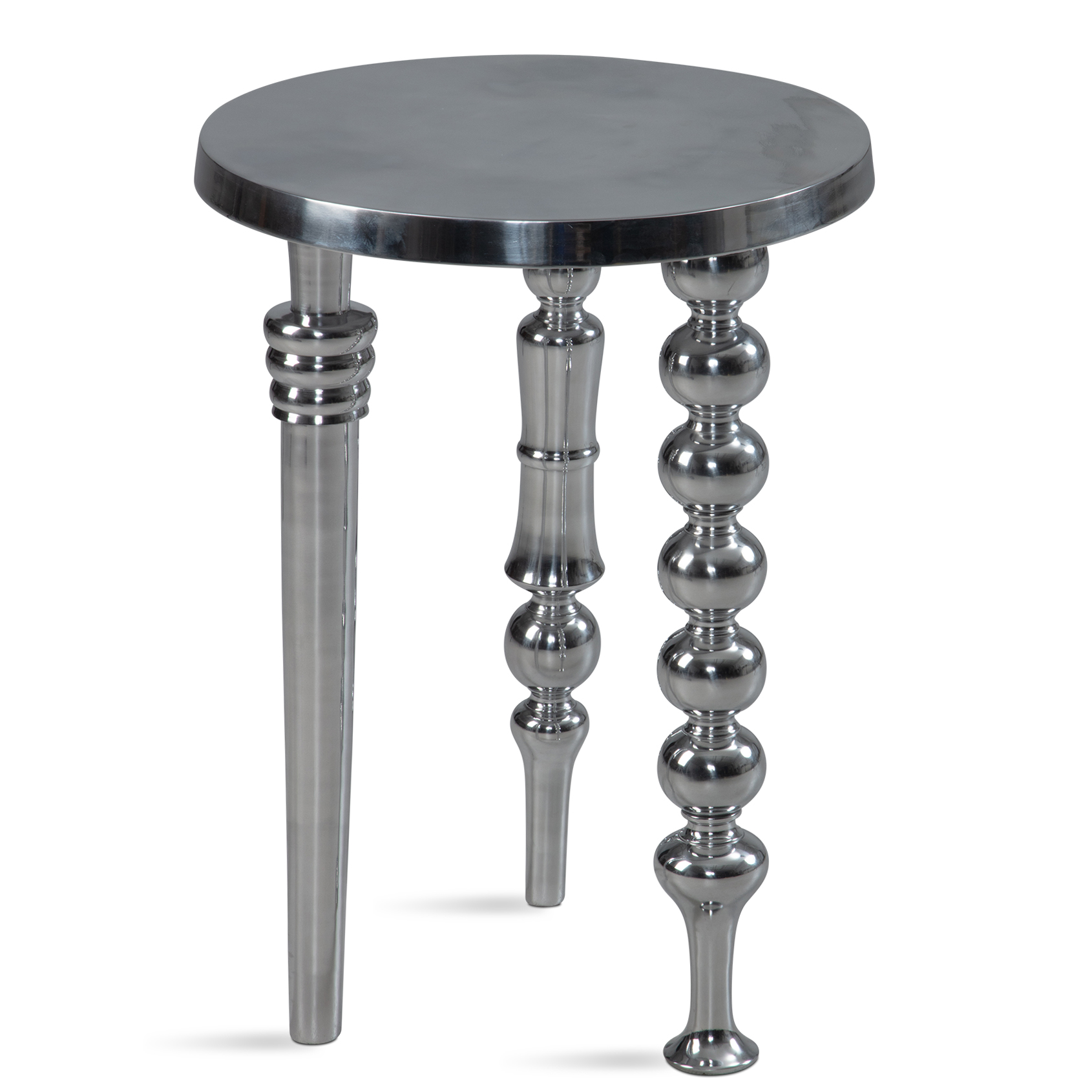 Entdecken Sie diesen runden Beistelltisch aus silbernem Aluminium mit drei unterschiedlichen Tischbeinen, der ein einzigartiges modernes Design und eleganten Charme bietet. Die glänzende Oberfläche verleiht Ihrem Wohnzimmer oder Entspannungsbereich eine edle Note.
