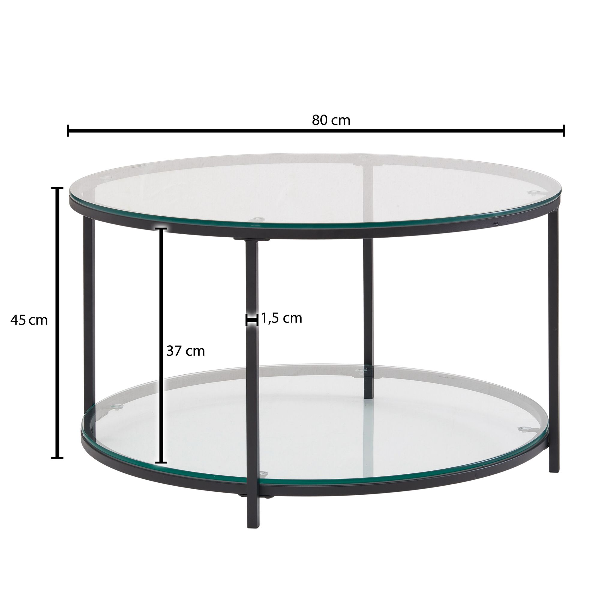 Entdecken Sie diesen eleganten und funktionalen runden Couchtisch mit schwarzem Metallgestell und zwei transparenten Glasplatten. Das moderne Design passt in jedes Wohnzimmer.