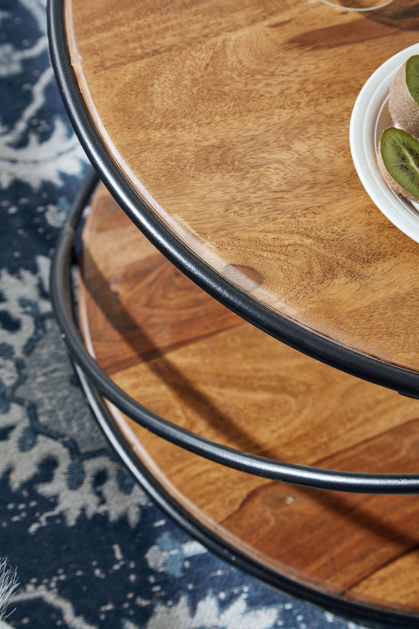 Dieser runde Couchtisch aus massivem Sheesham-Holz und Metall vereint Stabilität und Eleganz für ein modernes Wohnzimmer. Das außergewöhnliche Tischgestell und zwei Ablageflächen mit dunkler Maserung und Klarlack bieten praktischen Stauraum und stilvolles Design.