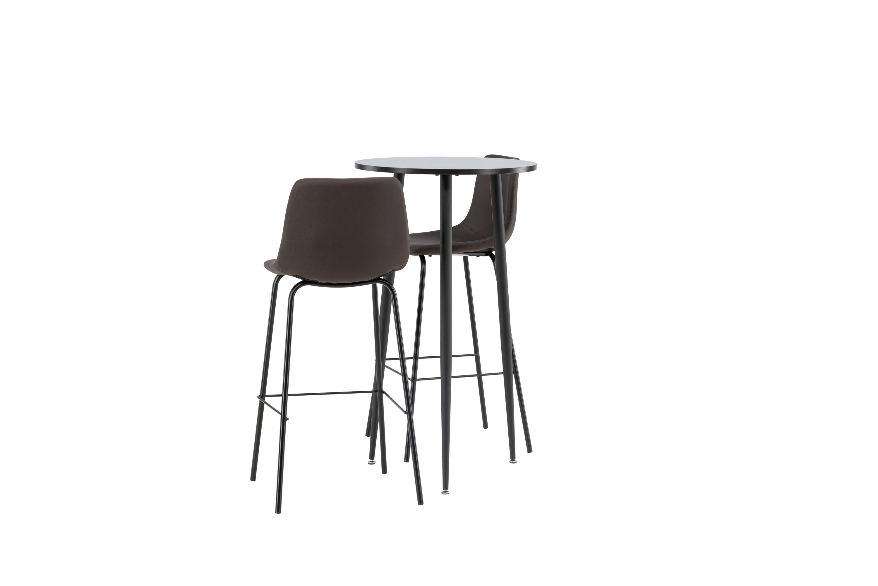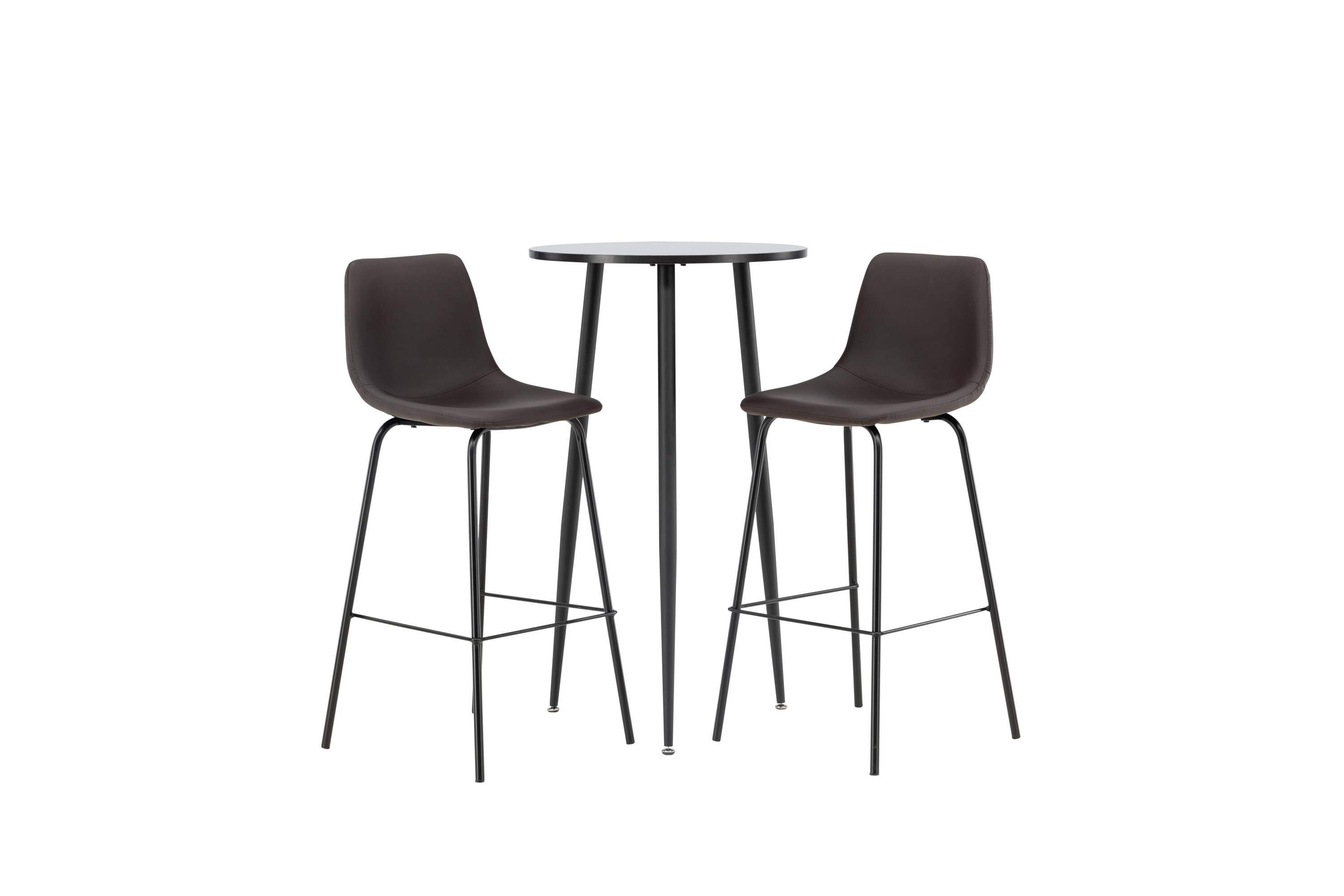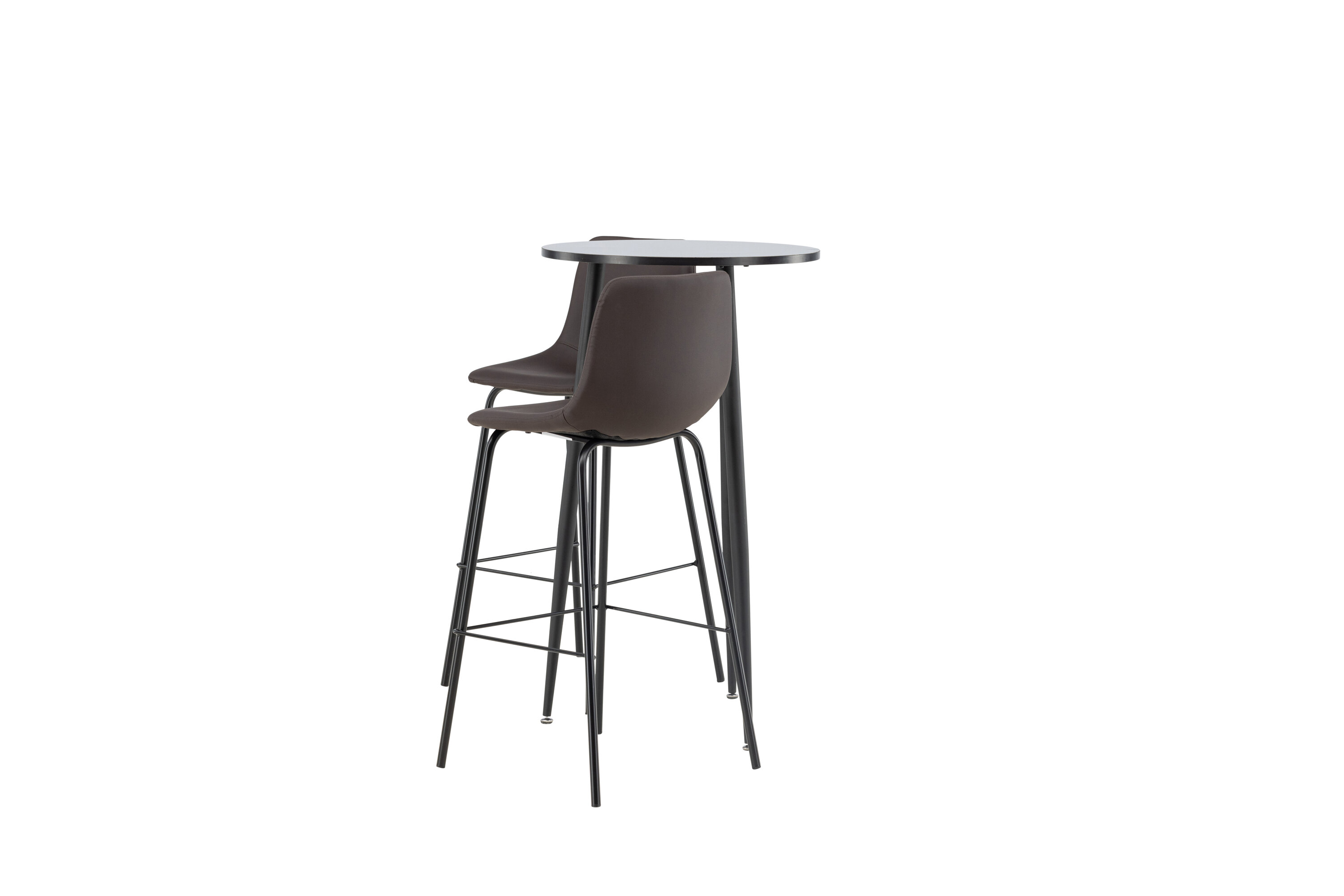 Eine komfortable Bargruppe im stylischen Design! Der wunderbare Stehtisch Plaza hat eine runde Tischplatte aus schwarzem MDF und die Tischbeine sind leicht ausgestellt aus schwarzem Metall. Hier in stilvoller Kombination mit braunen Barhockern aus der Alexi-Serie. Das Design ist gut durchdacht mit einem voll gepolsterten Stuhl aus braunem gepolstertem Polyurethan-Leder und Polyester und schmalen Beinen aus schwarzem pulverbeschichtetem Metall mit integrierter Fußstütze für zusätzlichen Komfort. Dekorieren Sie Ihr Zuhause elegant! Tischmaße: 60cm.