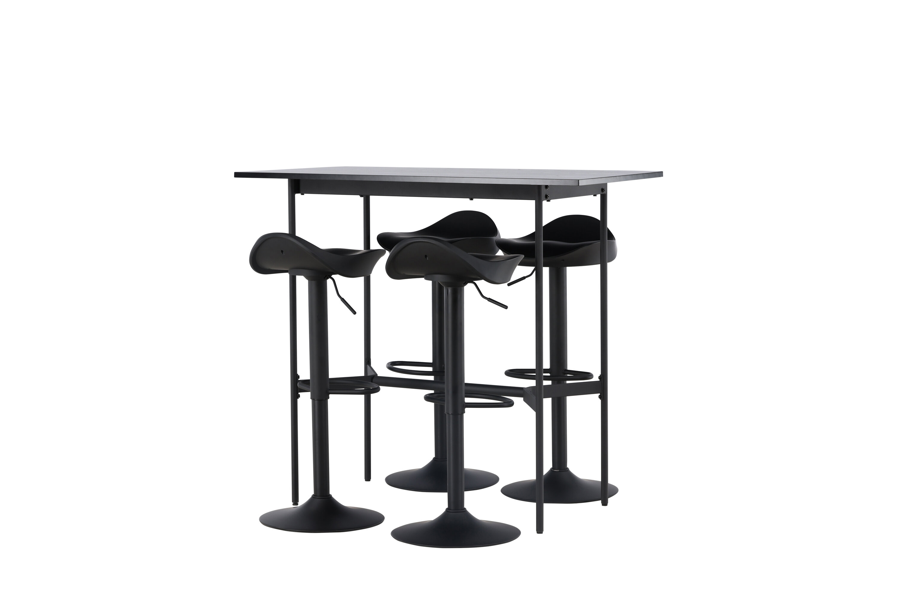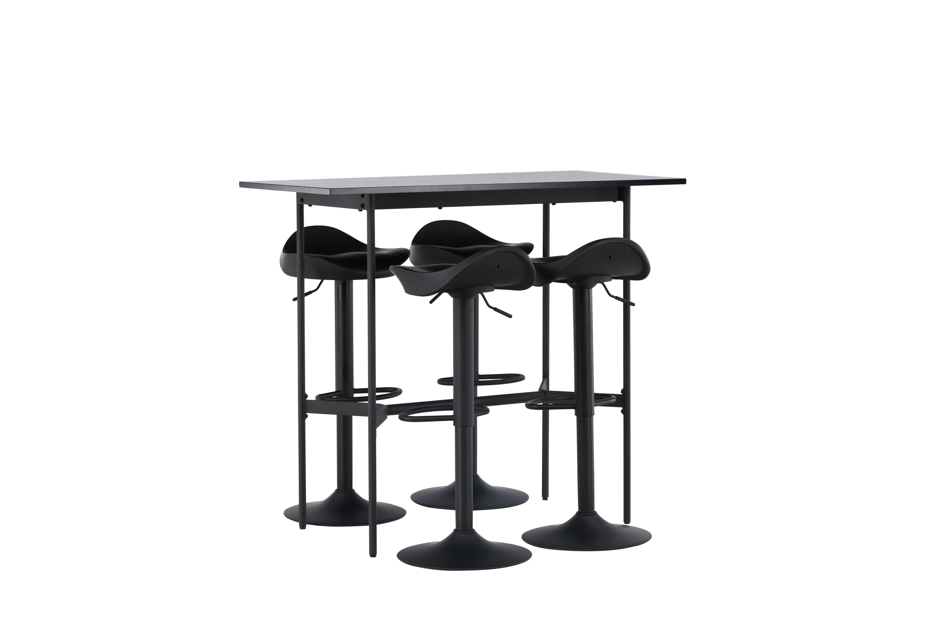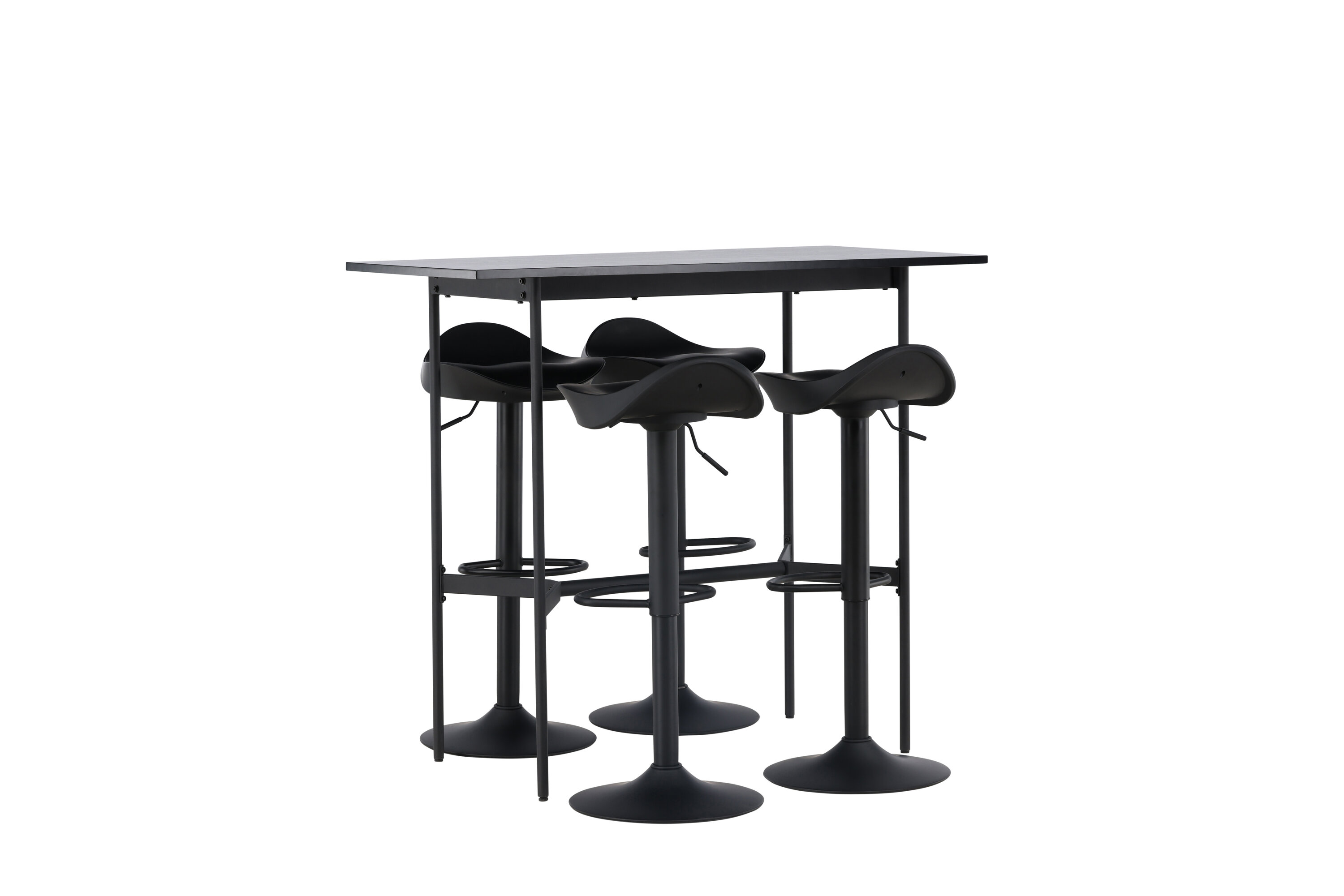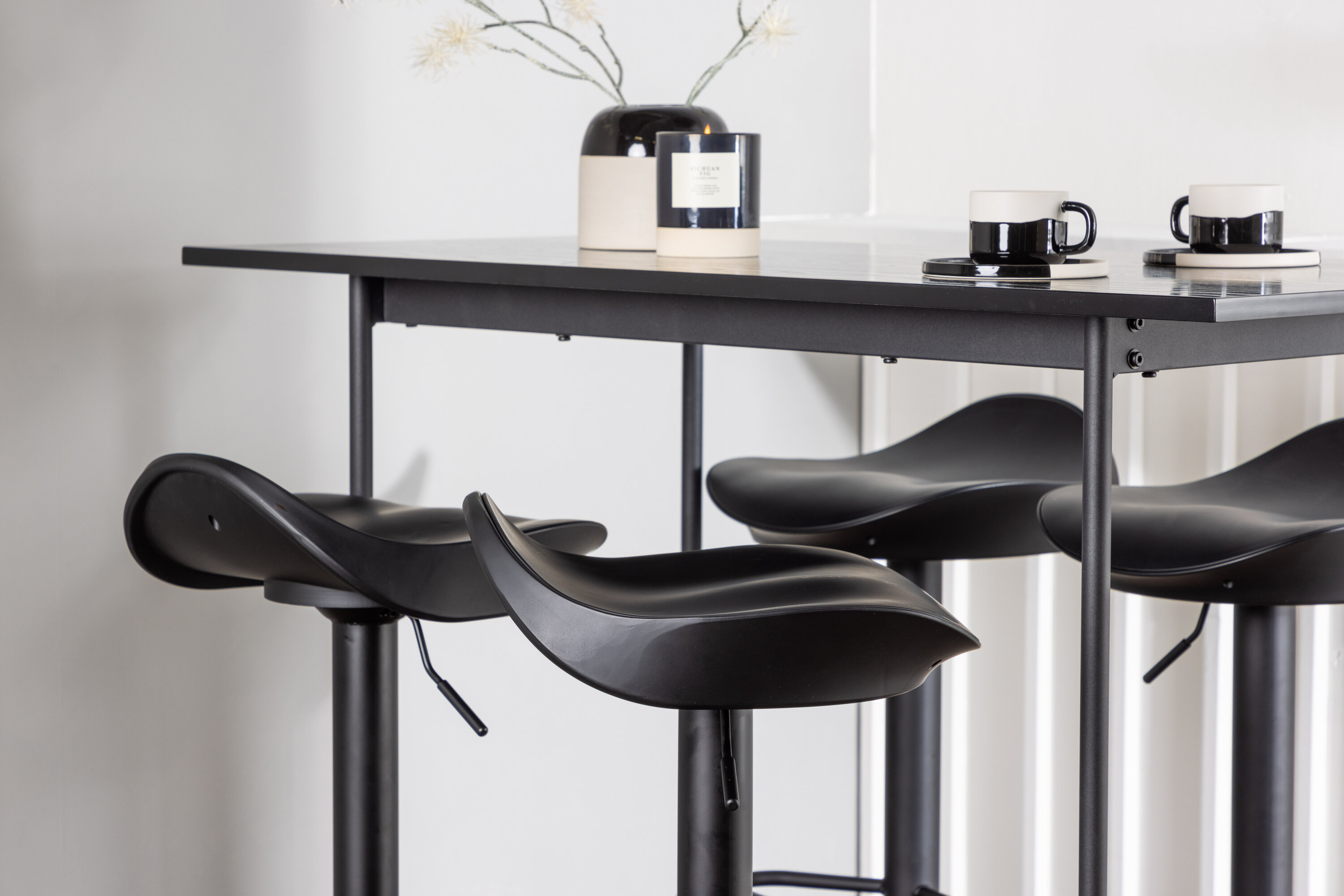 Luftig und stylisch! Der minimalistische Stehtisch Rax hat eine dünne Tischplatte aus schwarzem MDF und schmale Tischbeine mit integrierter Fußstütze aus schwarzem Metall. Hier zusammen mit klassischen, schwarzen Barhockern aus der Adesto-Serie. Der Stuhl hat ein stilvolles Design mit einem Trompetenfuß aus schwarzem Stahl und einem einfachen Sitz aus schwarzem Kunststoff. Minimalismus mit zeitlosem Design verbinden! Tischabmessungen: 120x60cm.
