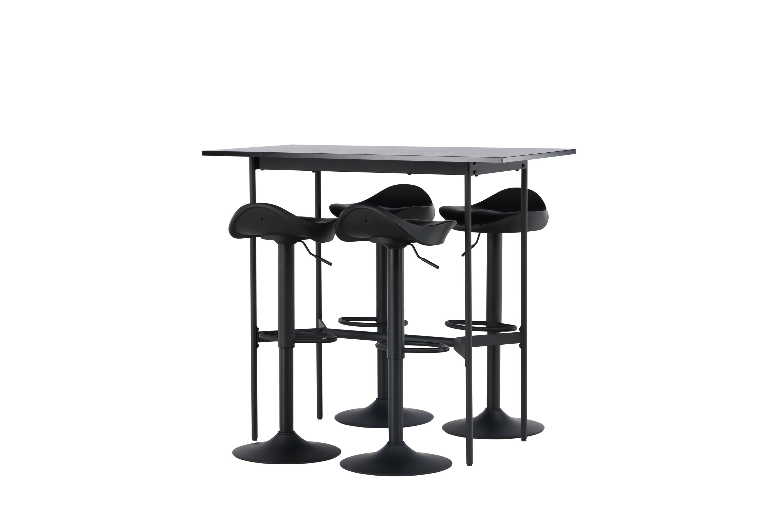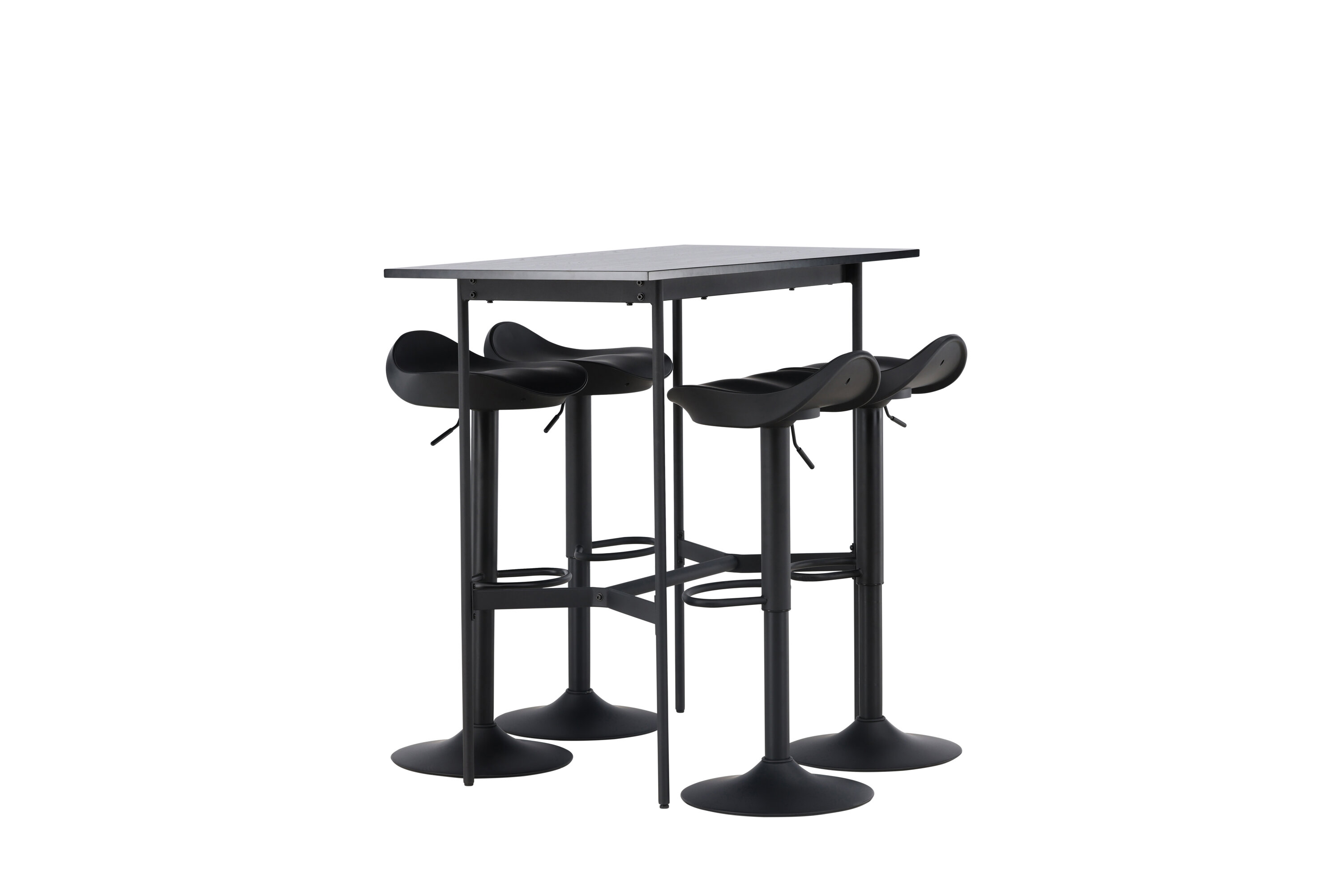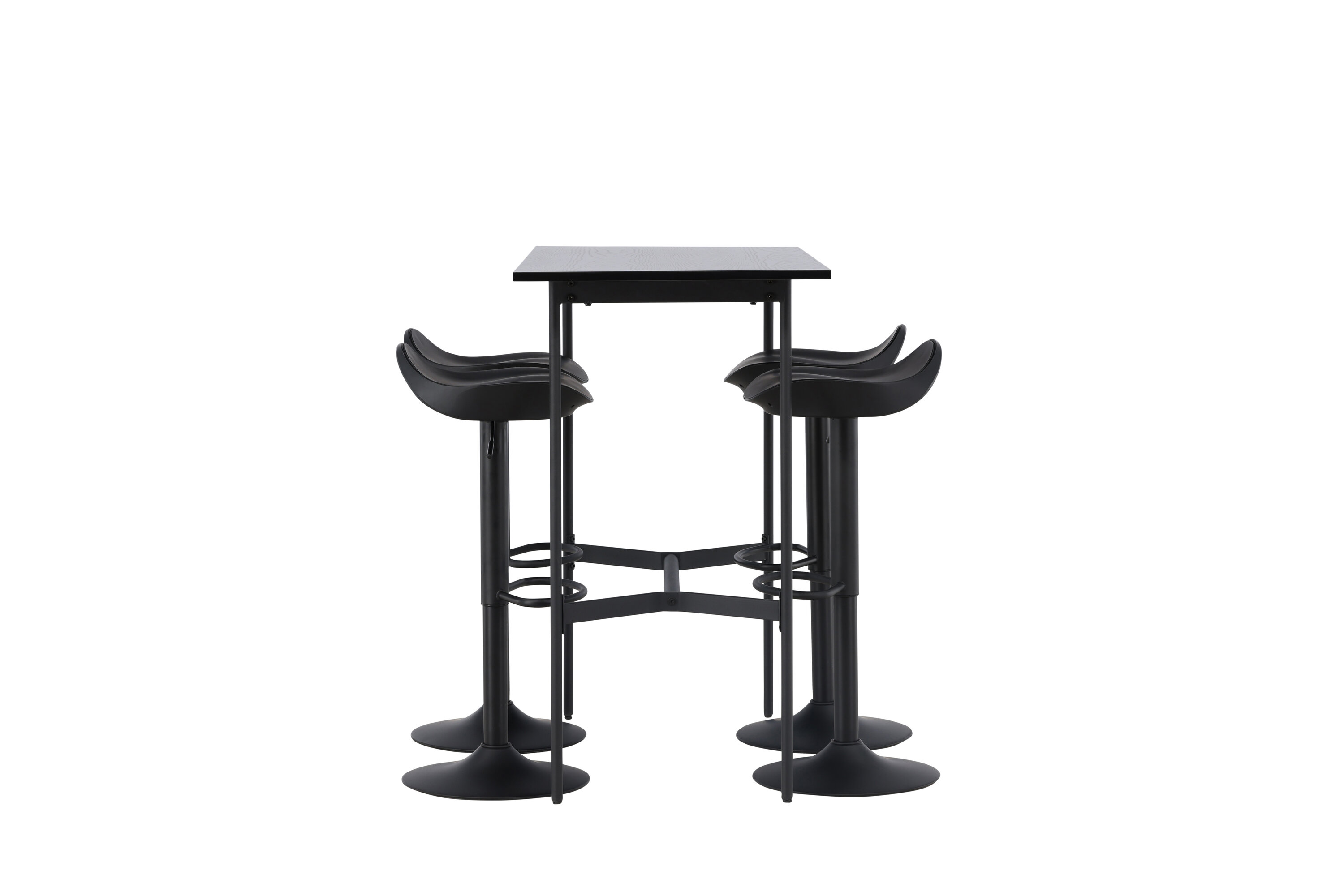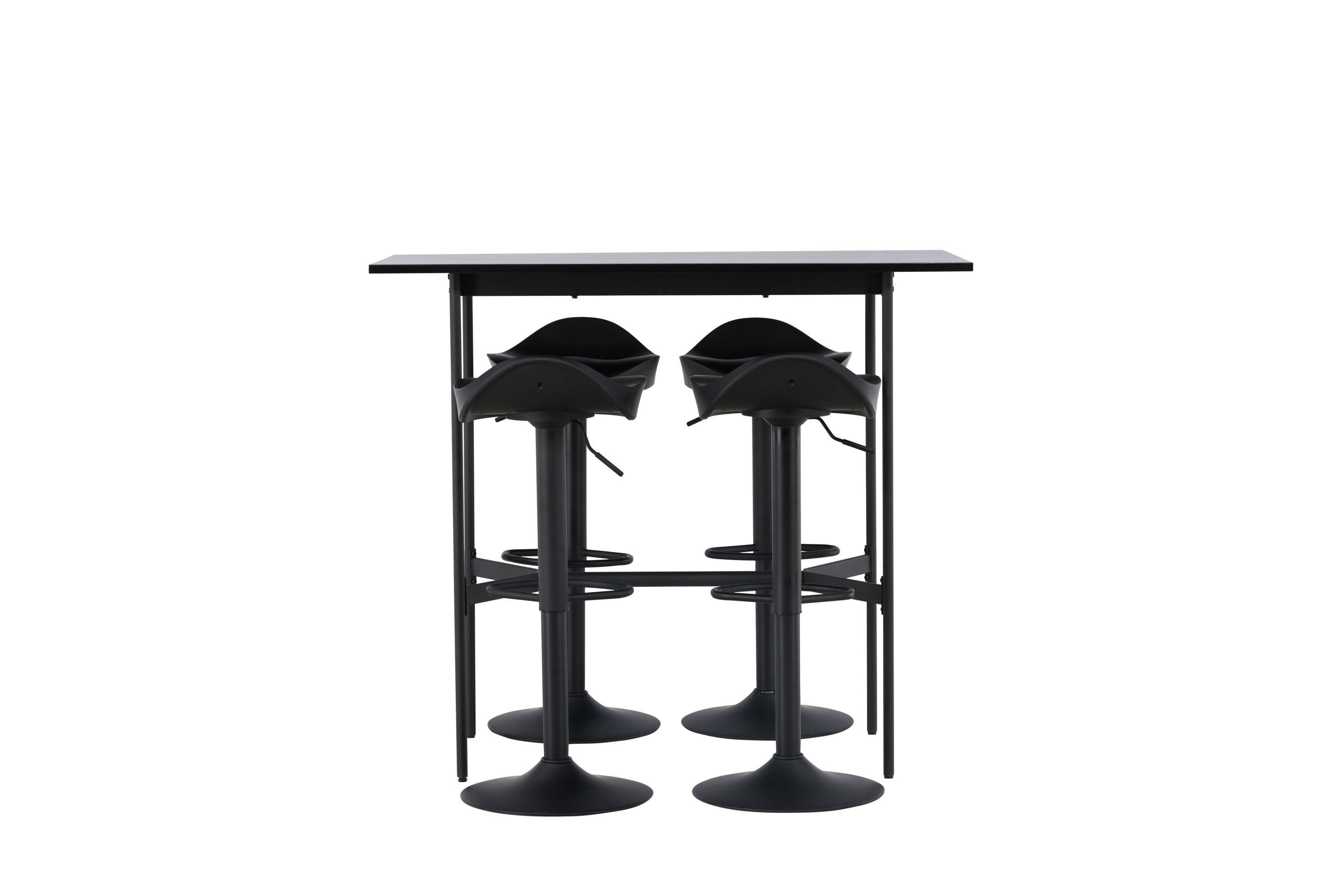 Luftig und stylisch! Der minimalistische Stehtisch Rax hat eine dünne Tischplatte aus schwarzem MDF und schmale Tischbeine mit integrierter Fußstütze aus schwarzem Metall. Hier zusammen mit klassischen, schwarzen Barhockern aus der Adesto-Serie. Der Stuhl hat ein stilvolles Design mit einem Trompetenfuß aus schwarzem Stahl und einem einfachen Sitz aus schwarzem Kunststoff. Minimalismus mit zeitlosem Design verbinden! Tischabmessungen: 120x60cm.