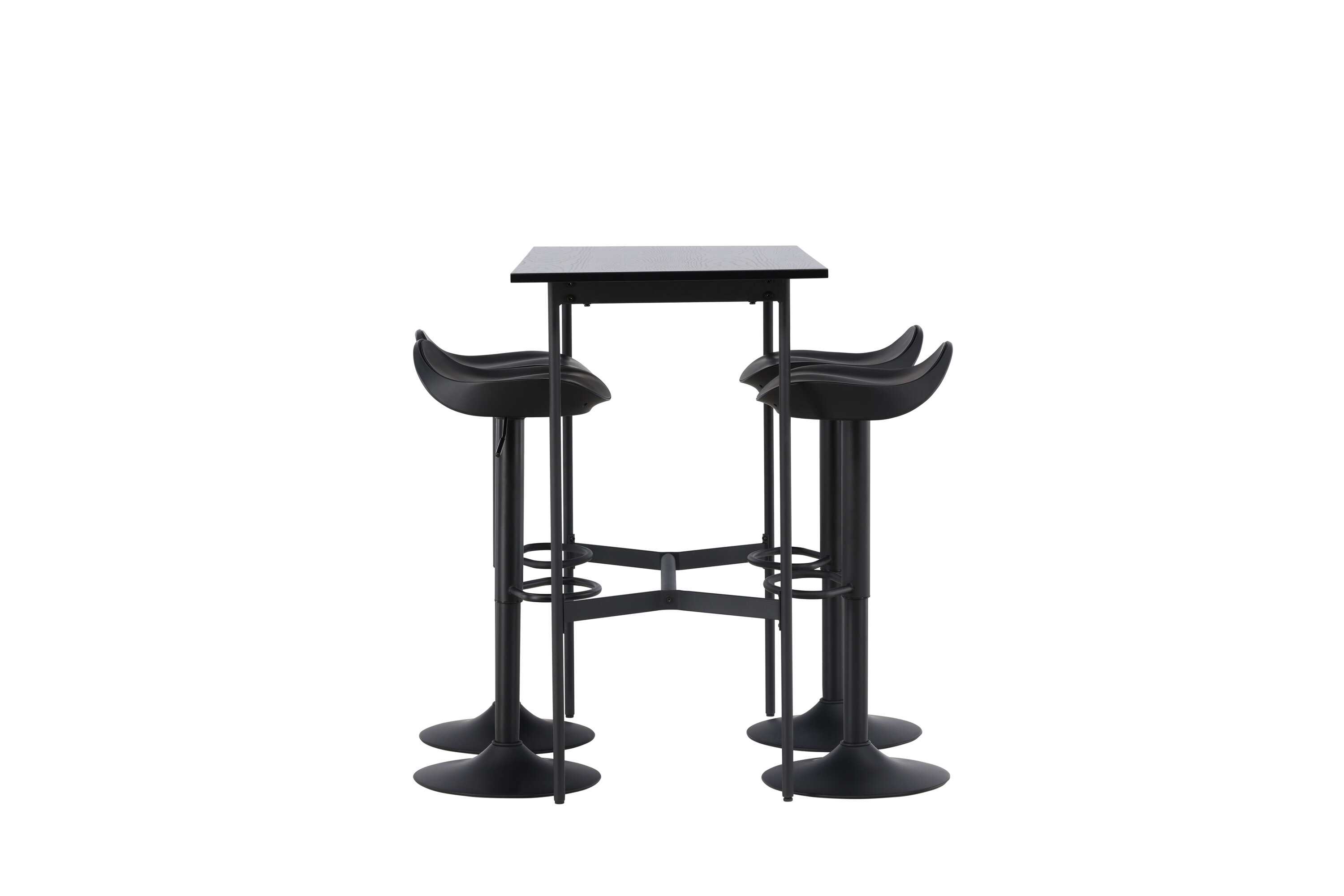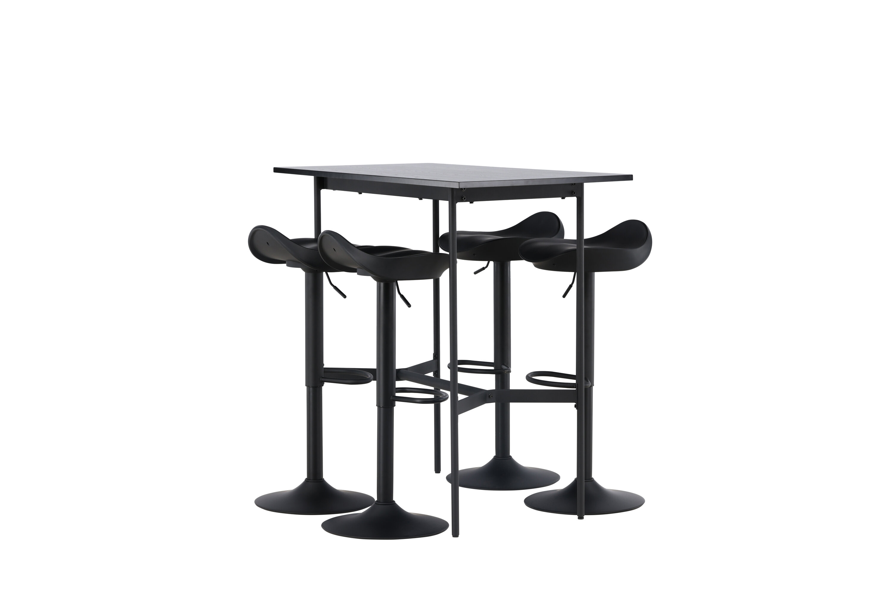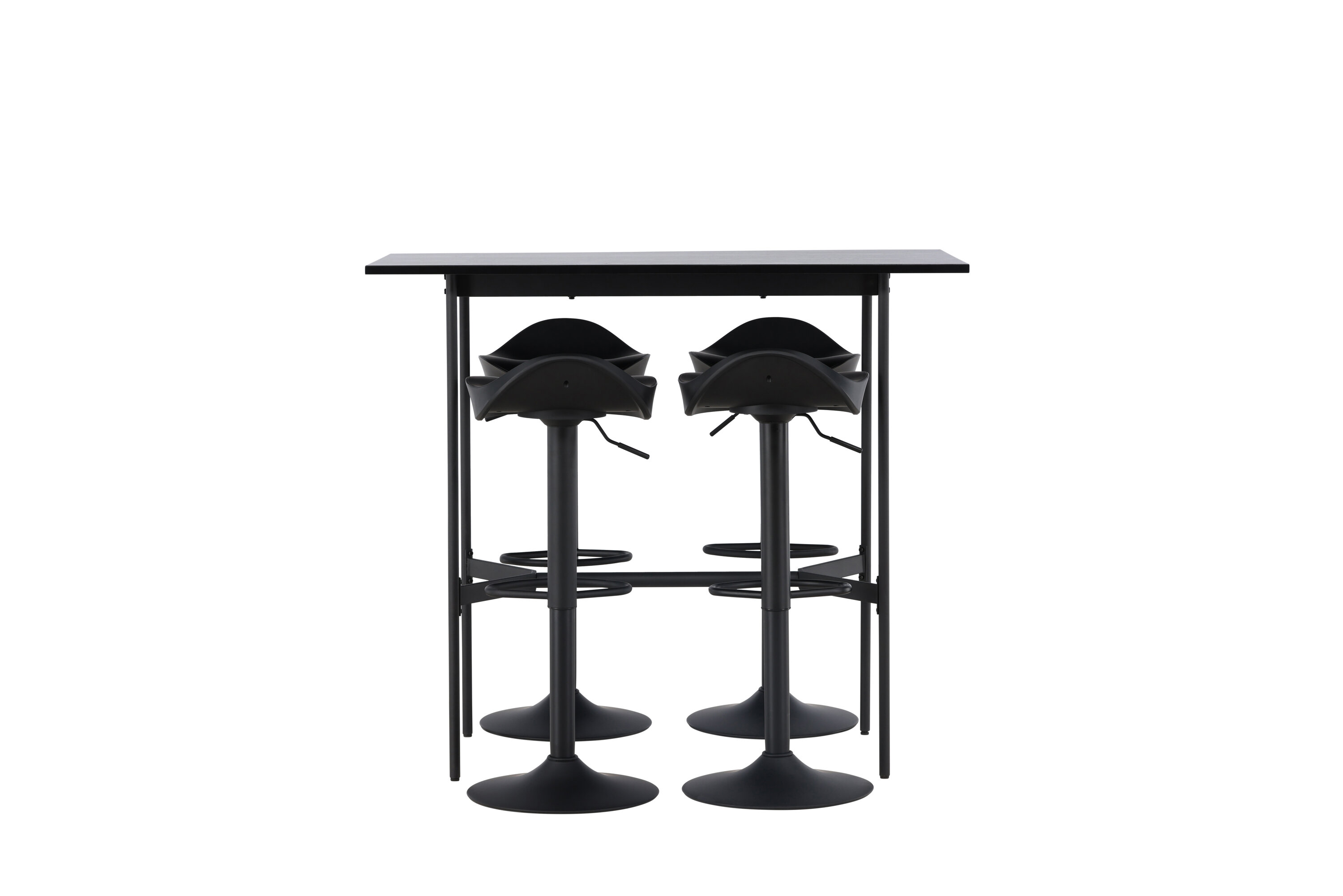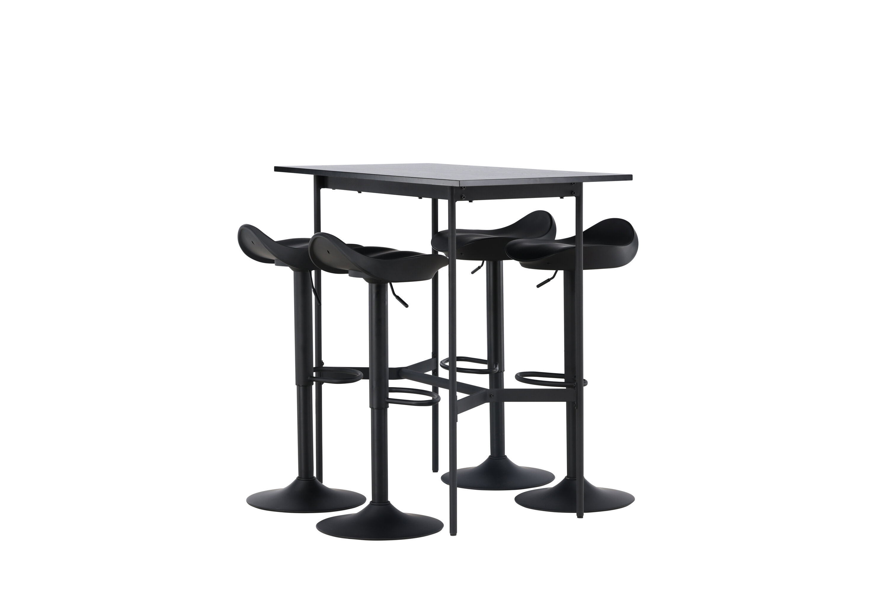 Luftig und stylisch! Der minimalistische Stehtisch Rax hat eine dünne Tischplatte aus schwarzem MDF und schmale Tischbeine mit integrierter Fußstütze aus schwarzem Metall. Hier zusammen mit klassischen, schwarzen Barhockern aus der Adesto-Serie. Der Stuhl hat ein stilvolles Design mit einem Trompetenfuß aus schwarzem Stahl und einem einfachen Sitz aus schwarzem Kunststoff. Minimalismus mit zeitlosem Design verbinden! Tischabmessungen: 120x60cm.