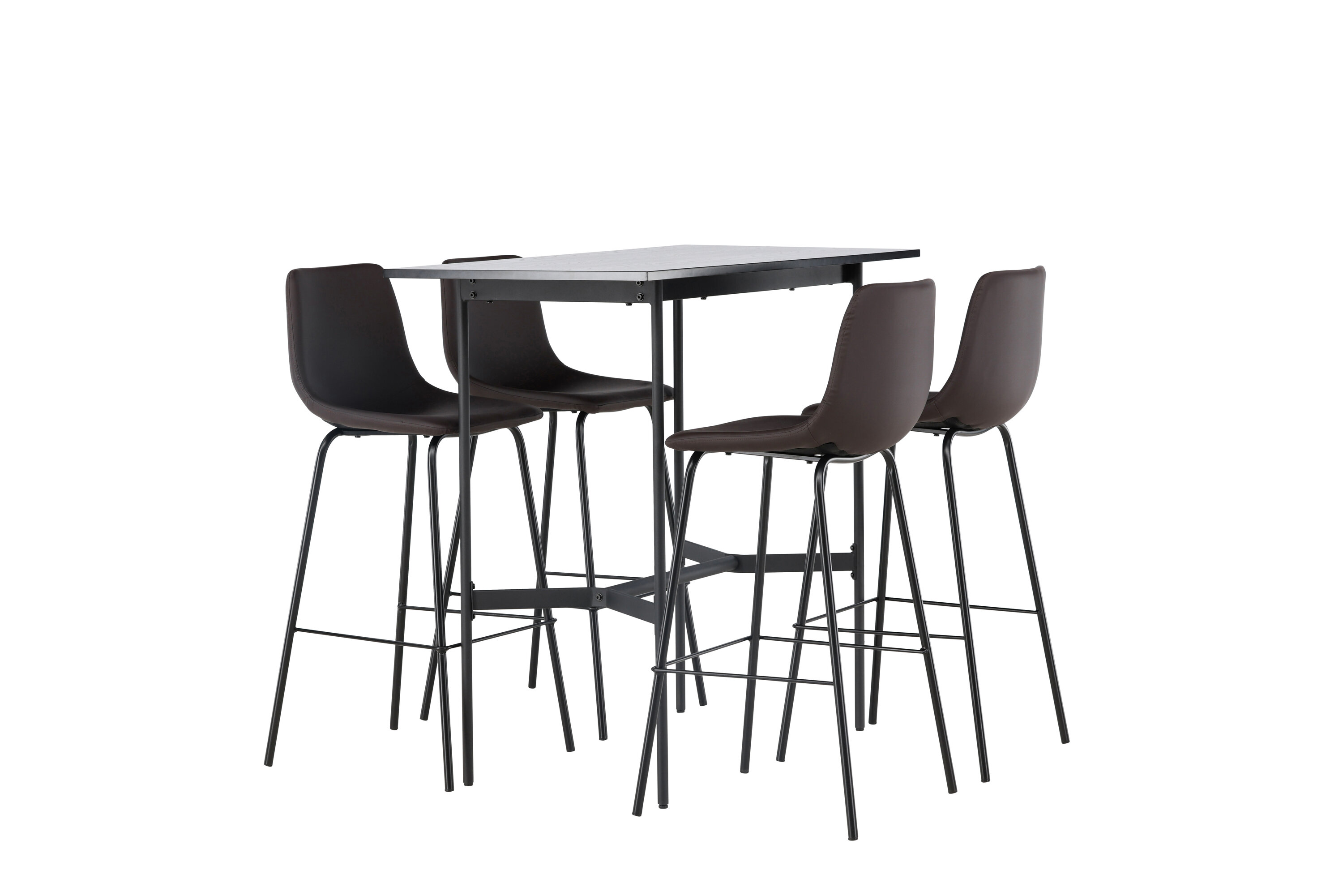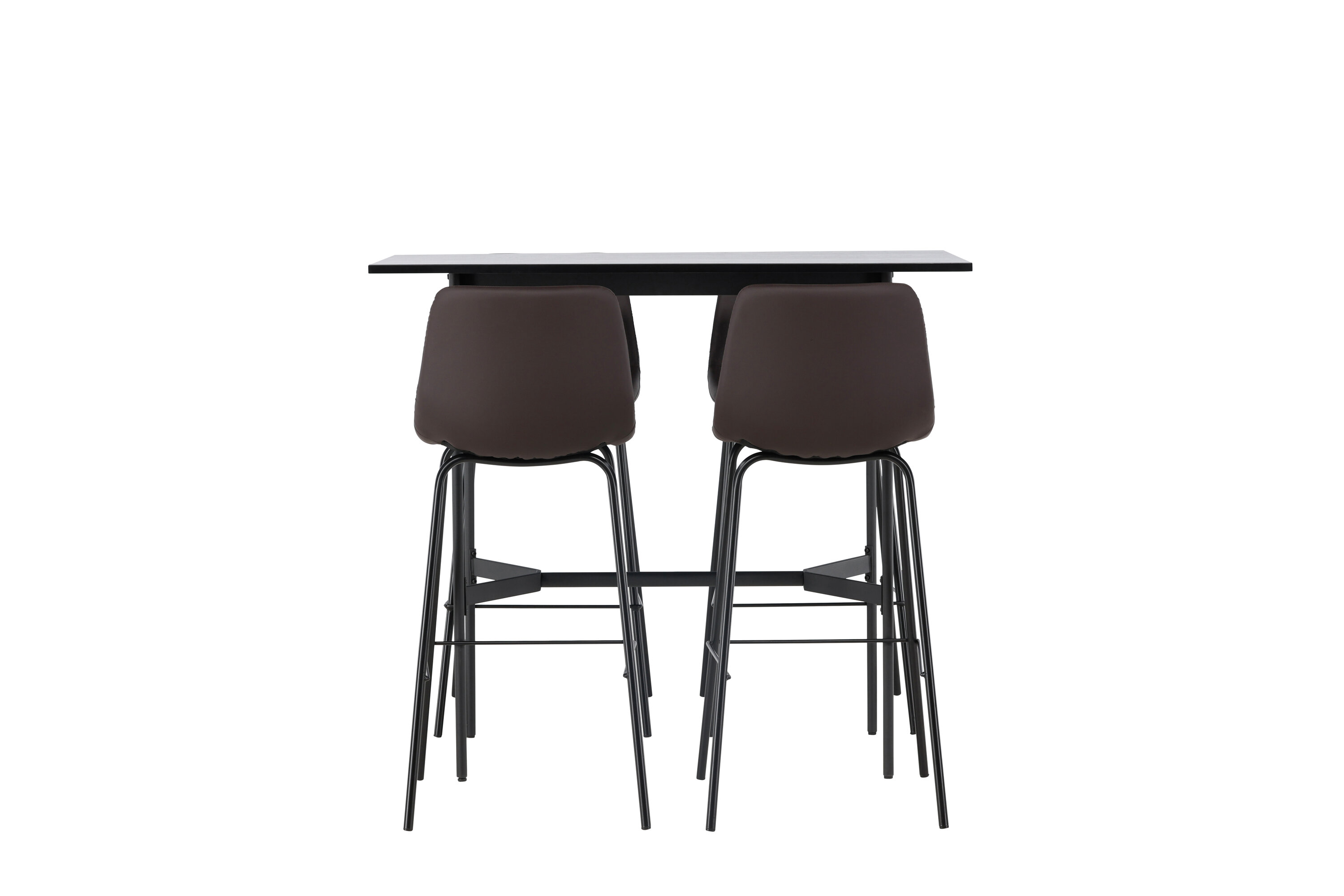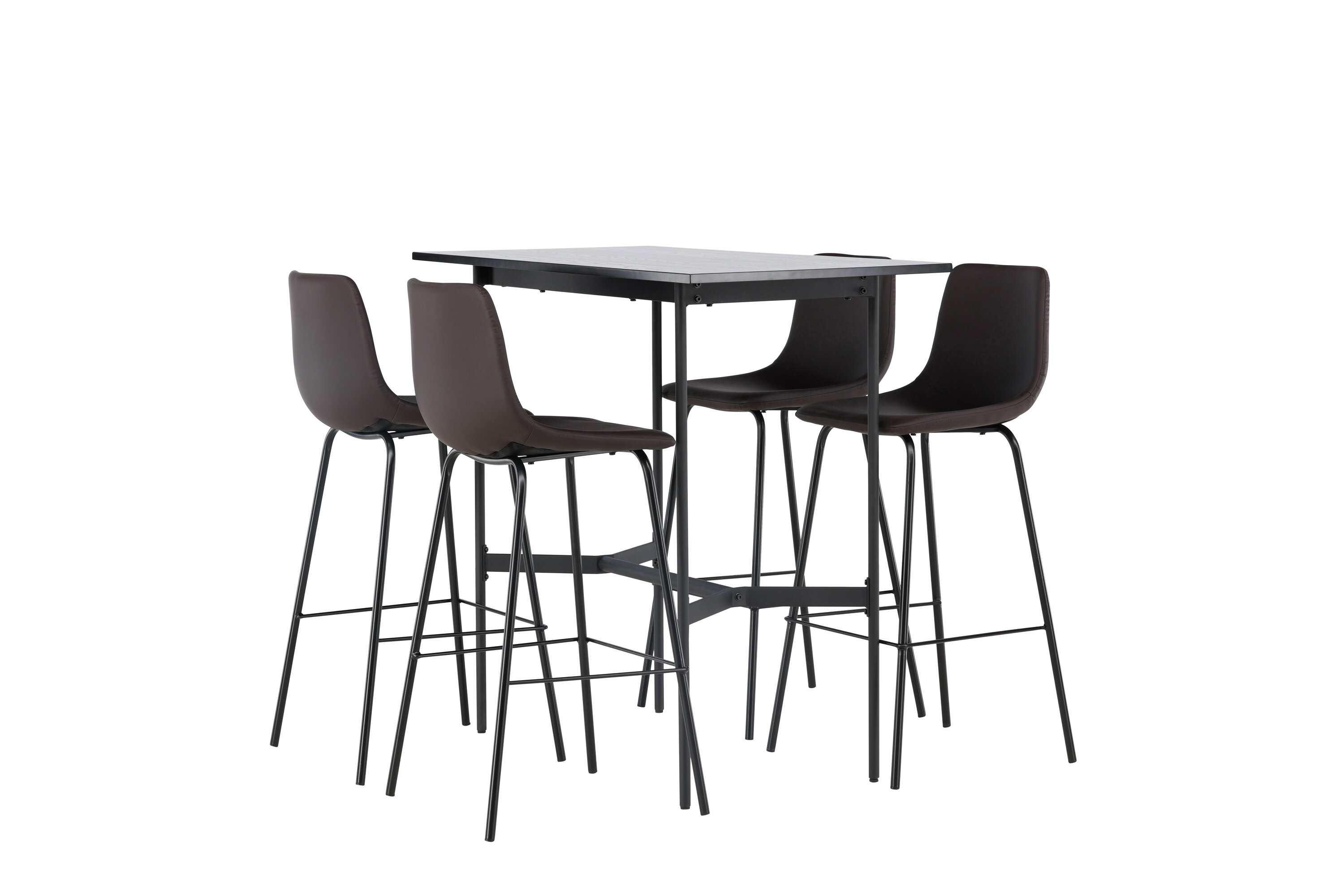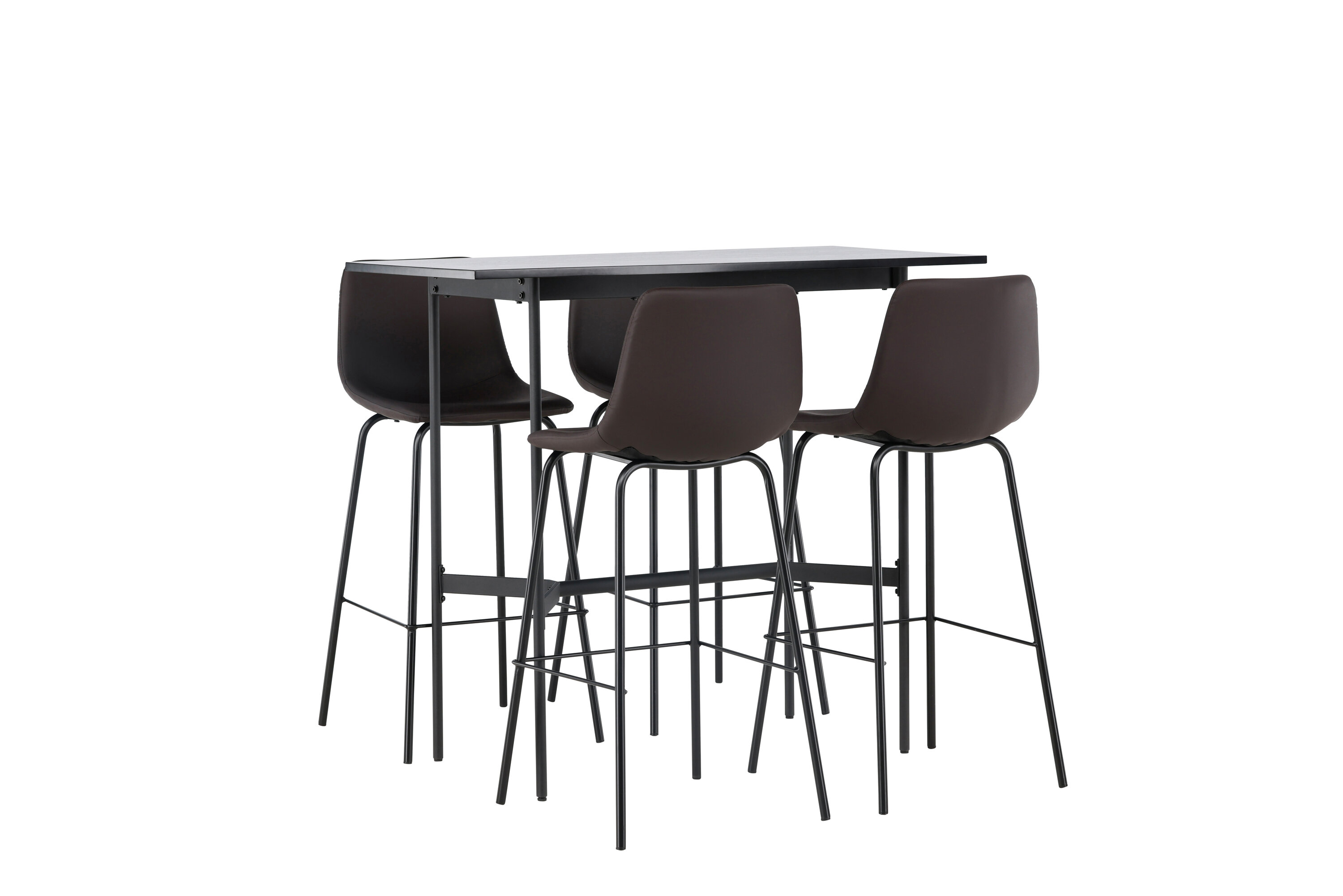 Verleihen Sie Ihrem Dekor mit einer stilvollen Bargruppe einen Schub! Der minimalistische Stehtisch Rax hat eine dünne Tischplatte aus schwarzem MDF und schmale Tischbeine mit integrierter Fußstütze aus schwarzem Metall. Hier in stilvoller Kombination mit braunen Barhockern aus der Alexi-Serie. Das Design ist gut durchdacht mit einem voll gepolsterten Stuhl aus braunem gepolstertem Polyurethan-Leder und Polyester und einer schmalen Beinposition aus schwarzem pulverbeschichtetem Metall mit integrierter Fußstütze für zusätzlichen Komfort. Tischabmessungen: 120x60cm.