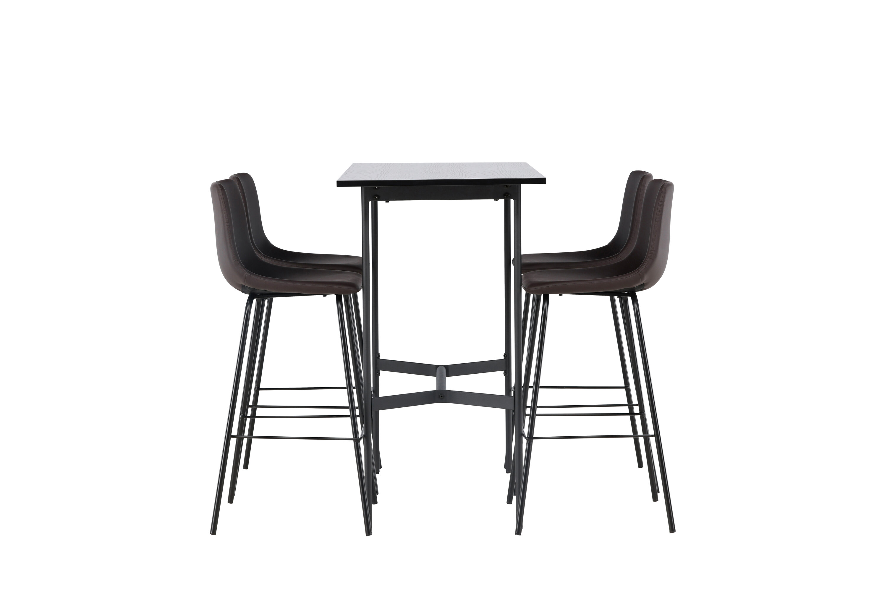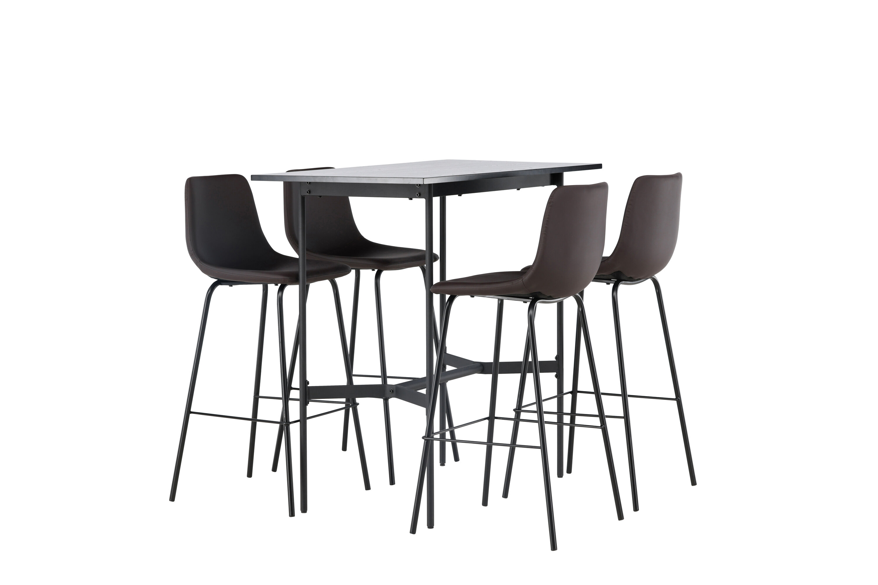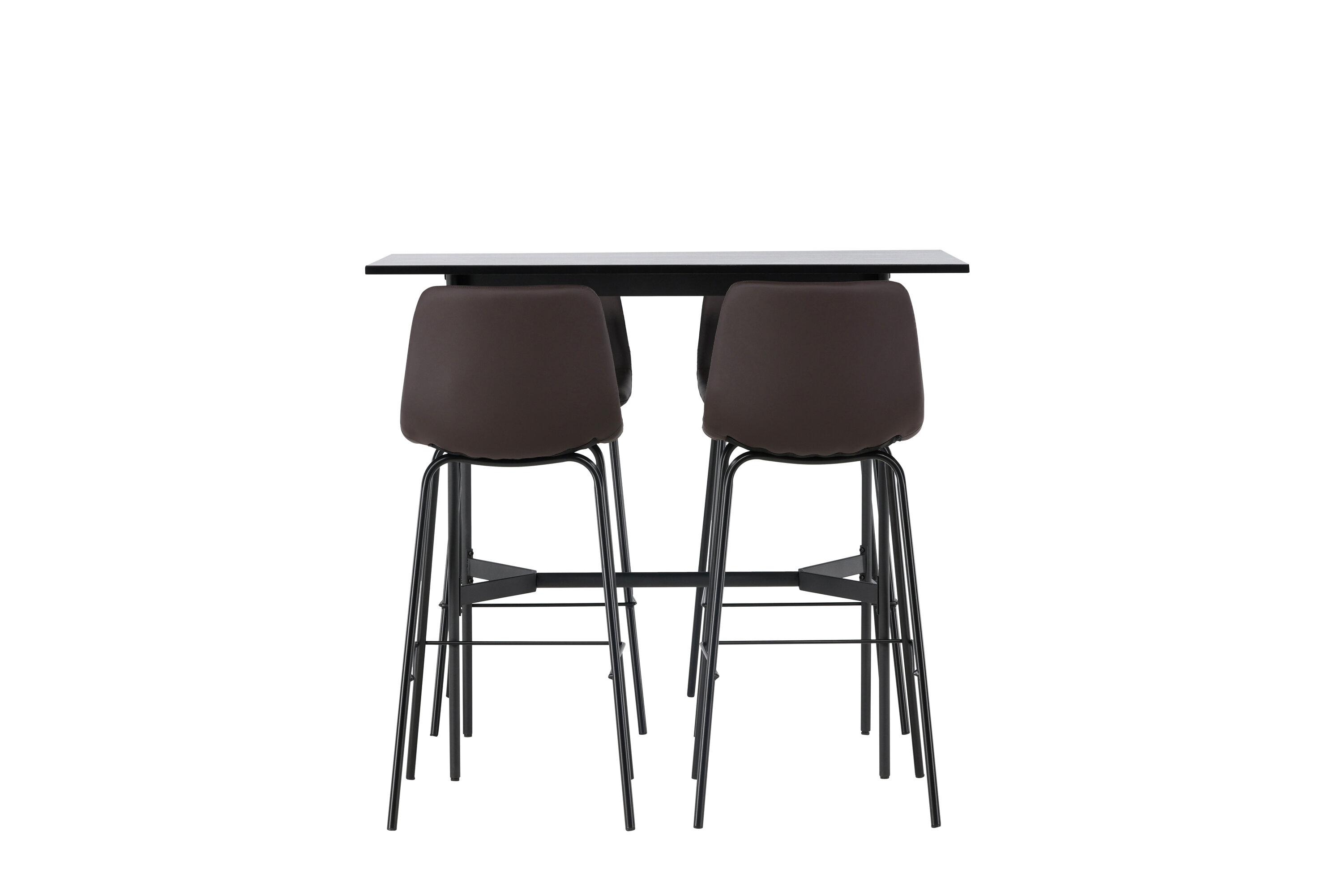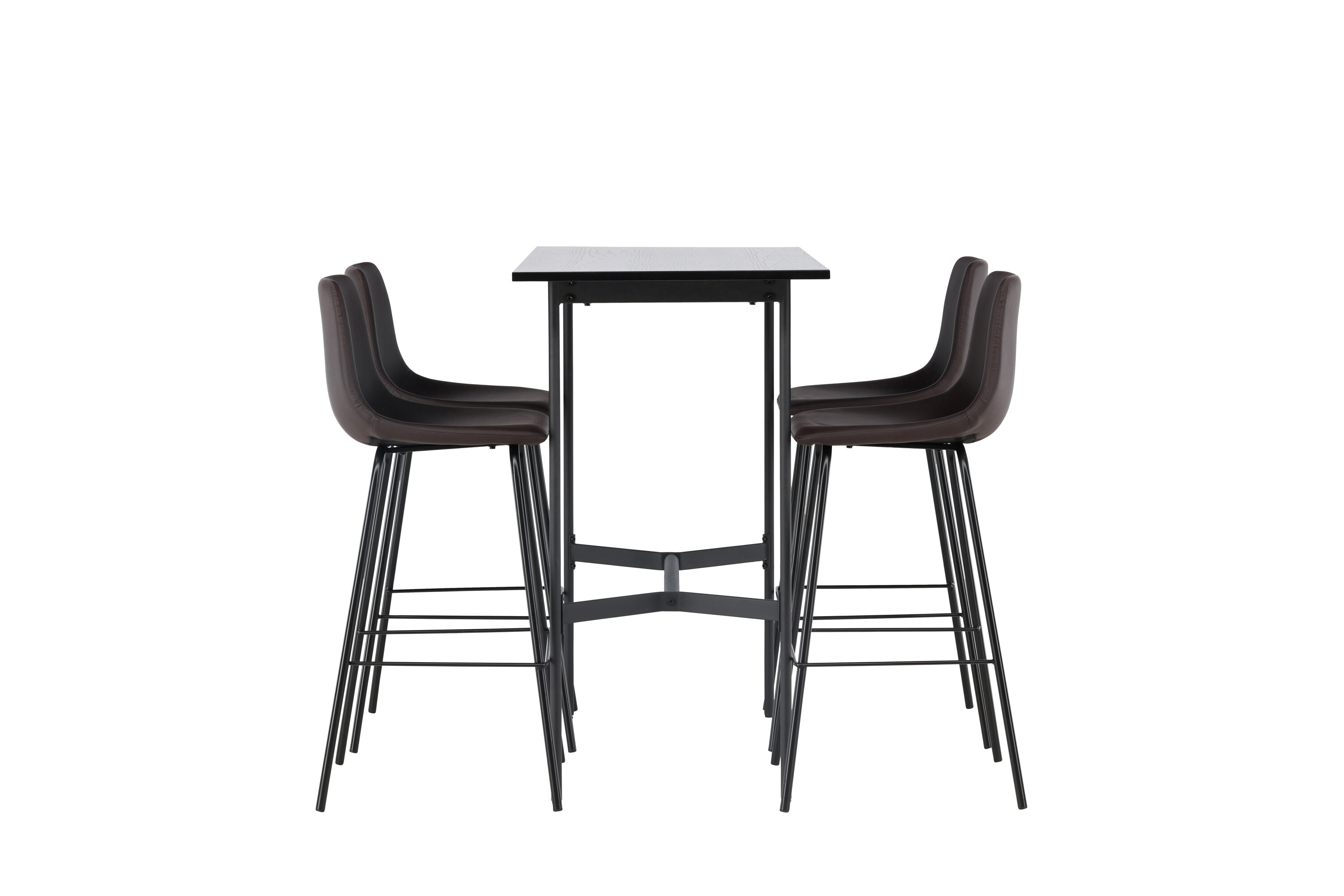 Verleihen Sie Ihrem Dekor mit einer stilvollen Bargruppe einen Schub! Der minimalistische Stehtisch Rax hat eine dünne Tischplatte aus schwarzem MDF und schmale Tischbeine mit integrierter Fußstütze aus schwarzem Metall. Hier in stilvoller Kombination mit braunen Barhockern aus der Alexi-Serie. Das Design ist gut durchdacht mit einem voll gepolsterten Stuhl aus braunem gepolstertem Polyurethan-Leder und Polyester und einer schmalen Beinposition aus schwarzem pulverbeschichtetem Metall mit integrierter Fußstütze für zusätzlichen Komfort. Tischabmessungen: 120x60cm.