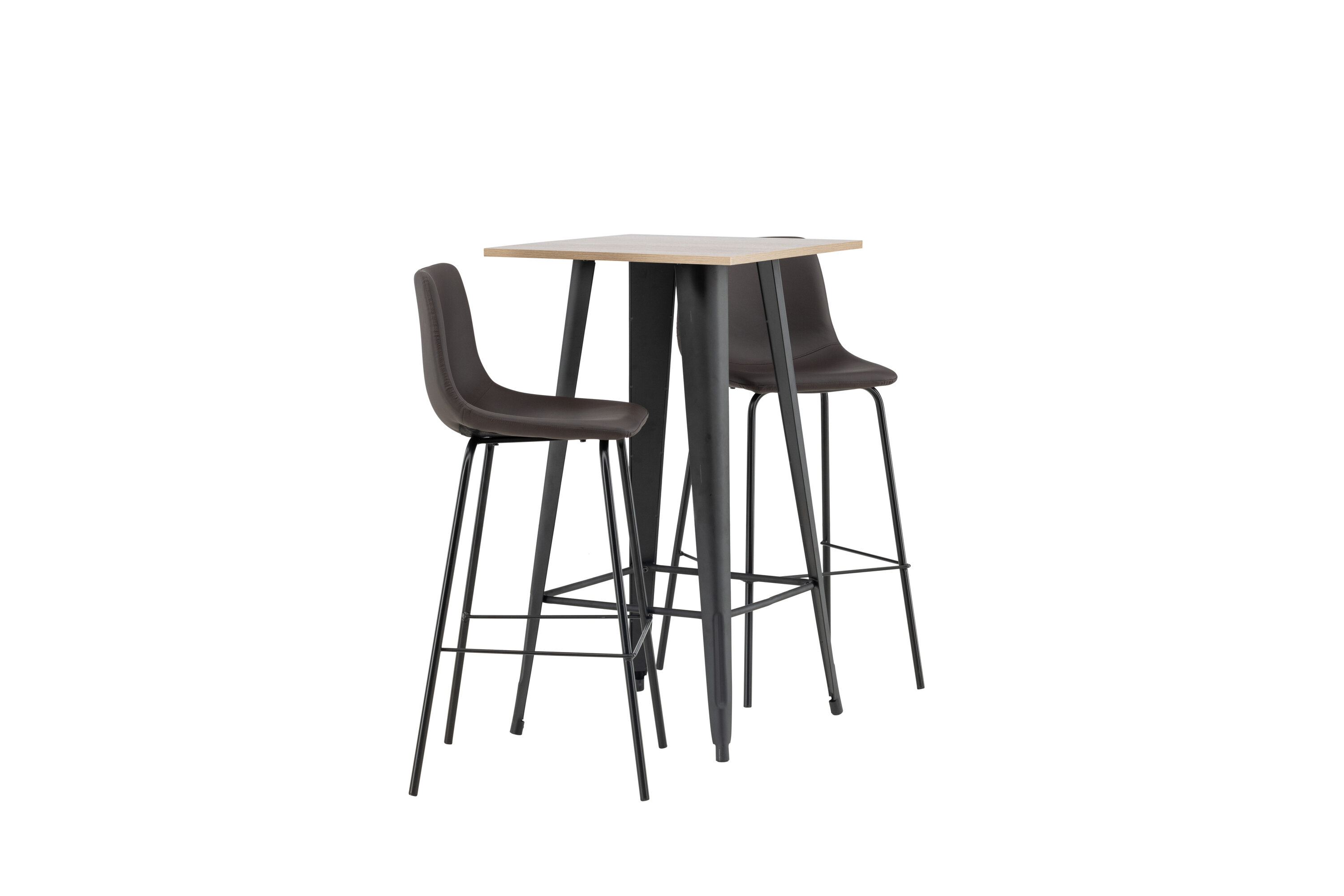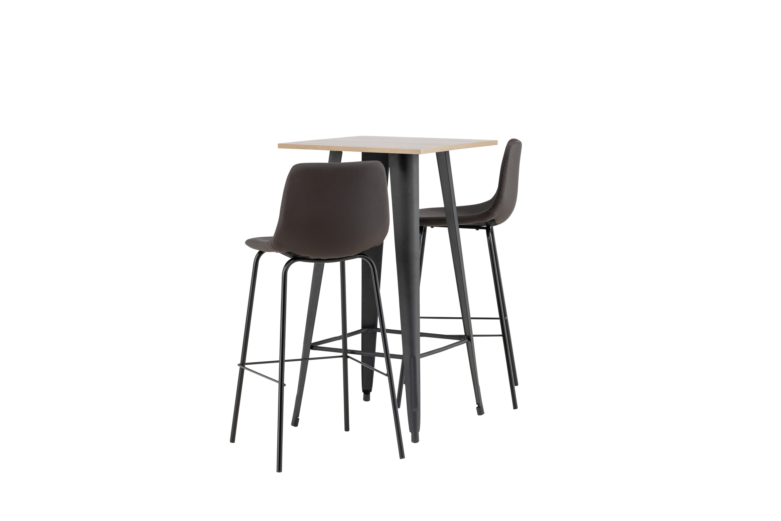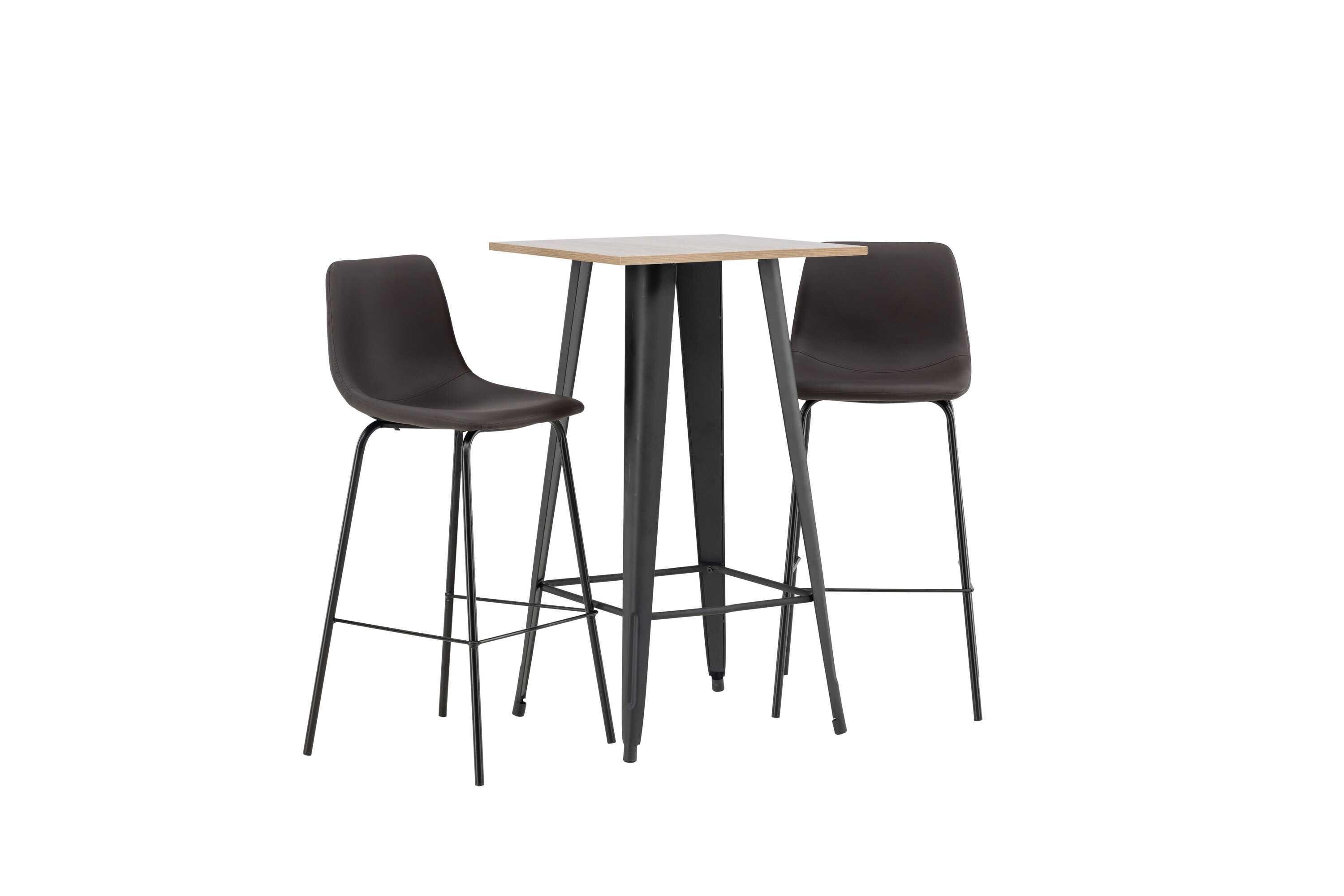 Kombinieren Sie Minimalismus und nachhaltige Materialien! Der Tempe Stehtisch verfügt über eine quadratische Tischplatte aus walnussfarbenem MDF und leicht ausgestellte Tischbeine aus schwarzem Metall mit einem Rahmen für die Fußstütze für zusätzlichen Komfort. Hier in stilvoller Kombination mit braunen Barhockern aus der Alexi-Serie. Das Design ist gut durchdacht mit einem voll gepolsterten Stuhl aus braunem gepolstertem Polyurethan-Leder und Polyester und schmalen Beinen aus schwarzem pulverbeschichtetem Metall mit integrierter Fußstütze für zusätzlichen Komfort. Es soll sich auf allen Ebenen wohlfühlen! Tischabmessungen: 60x60cm.
