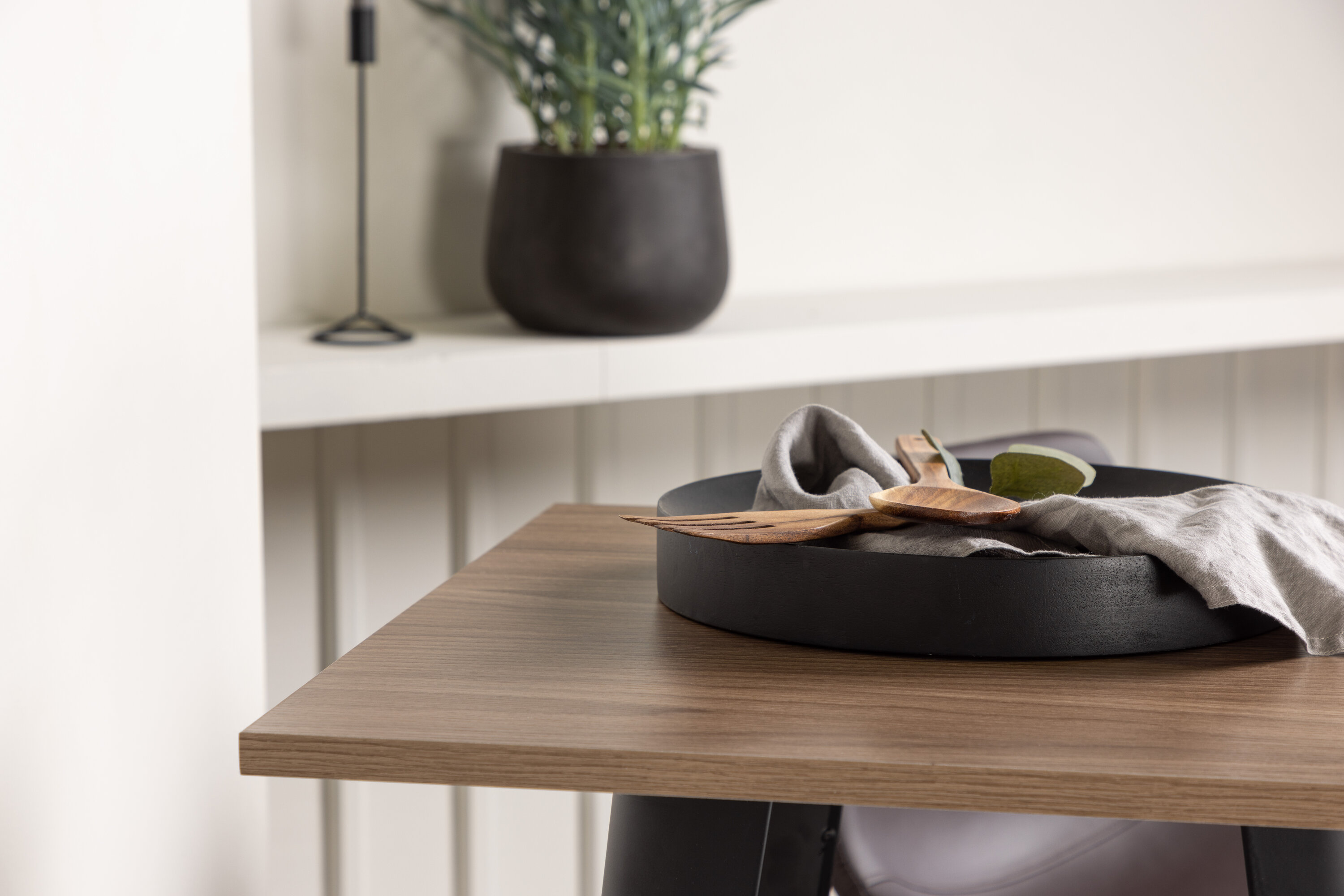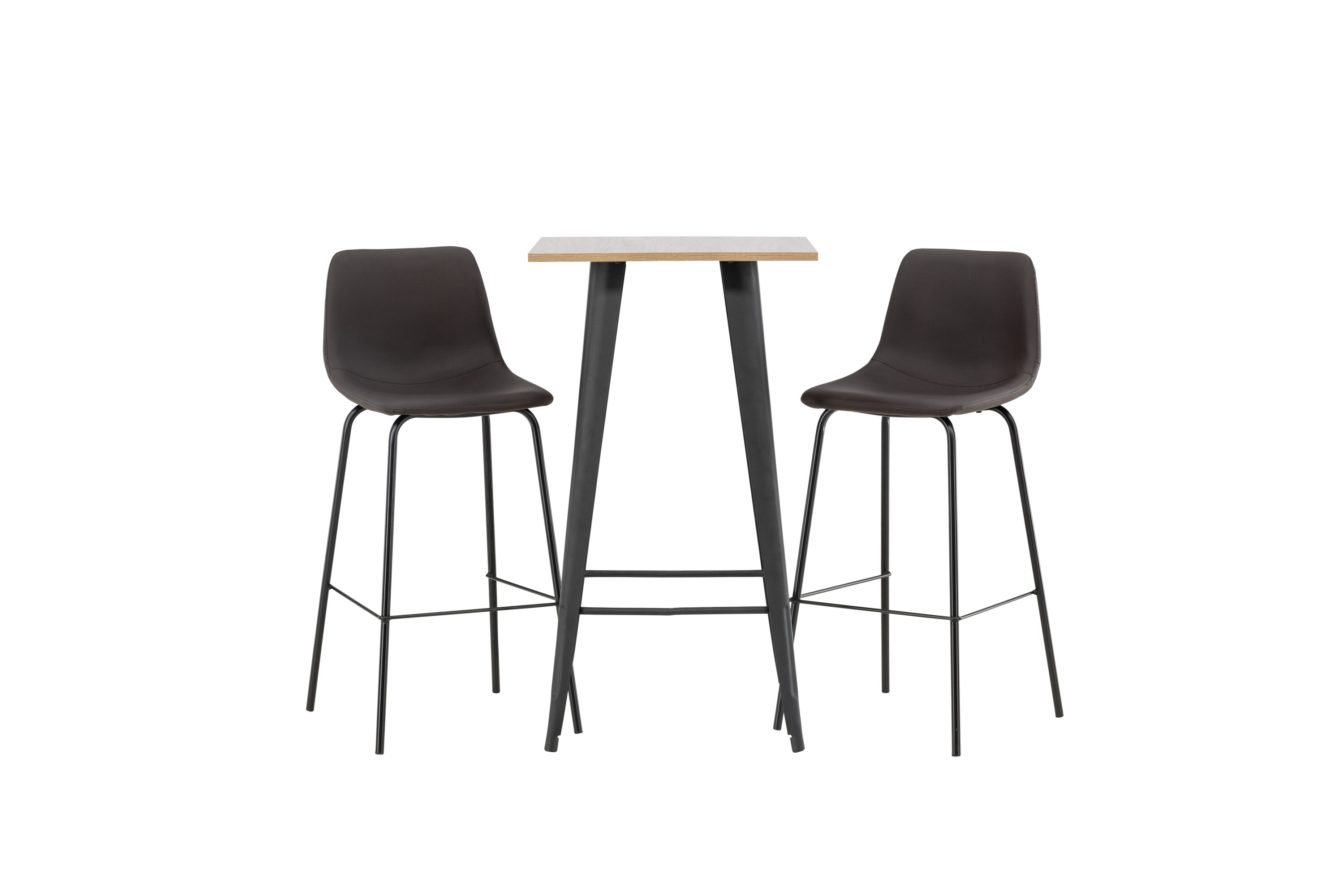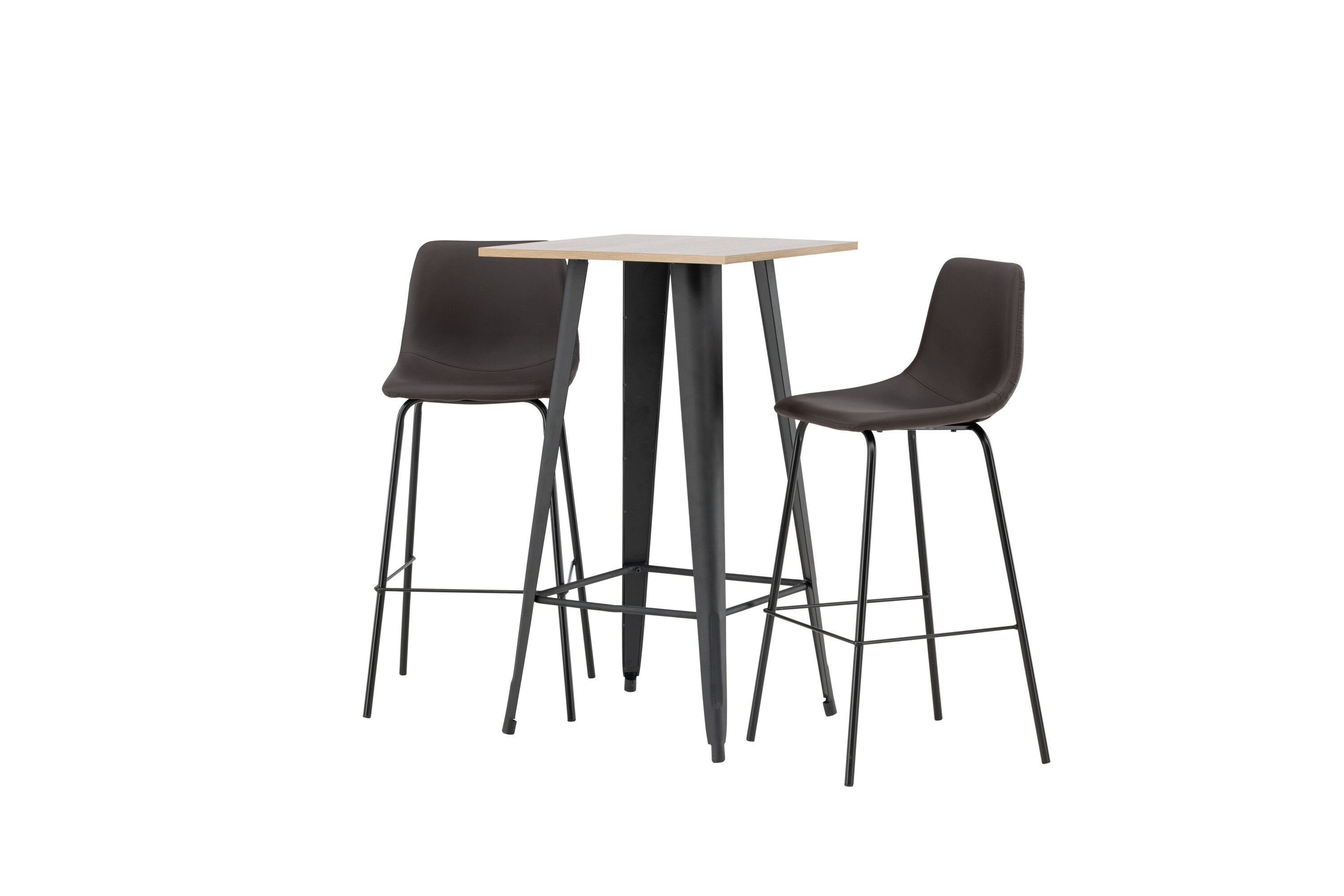 Kombinieren Sie Minimalismus und nachhaltige Materialien! Der Tempe Stehtisch verfügt über eine quadratische Tischplatte aus walnussfarbenem MDF und leicht ausgestellte Tischbeine aus schwarzem Metall mit einem Rahmen für die Fußstütze für zusätzlichen Komfort. Hier in stilvoller Kombination mit braunen Barhockern aus der Alexi-Serie. Das Design ist gut durchdacht mit einem voll gepolsterten Stuhl aus braunem gepolstertem Polyurethan-Leder und Polyester und schmalen Beinen aus schwarzem pulverbeschichtetem Metall mit integrierter Fußstütze für zusätzlichen Komfort. Es soll sich auf allen Ebenen wohlfühlen! Tischabmessungen: 60x60cm.