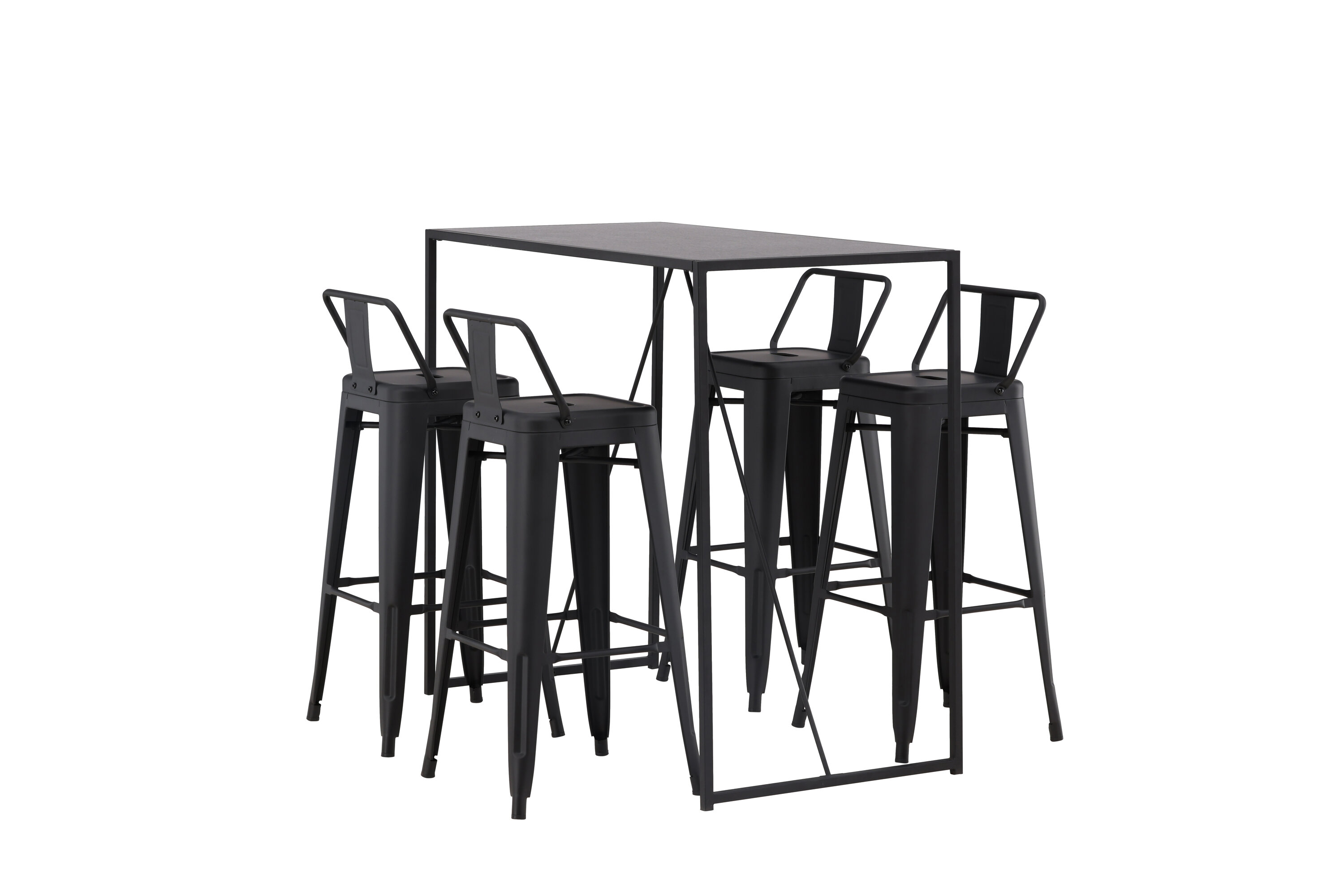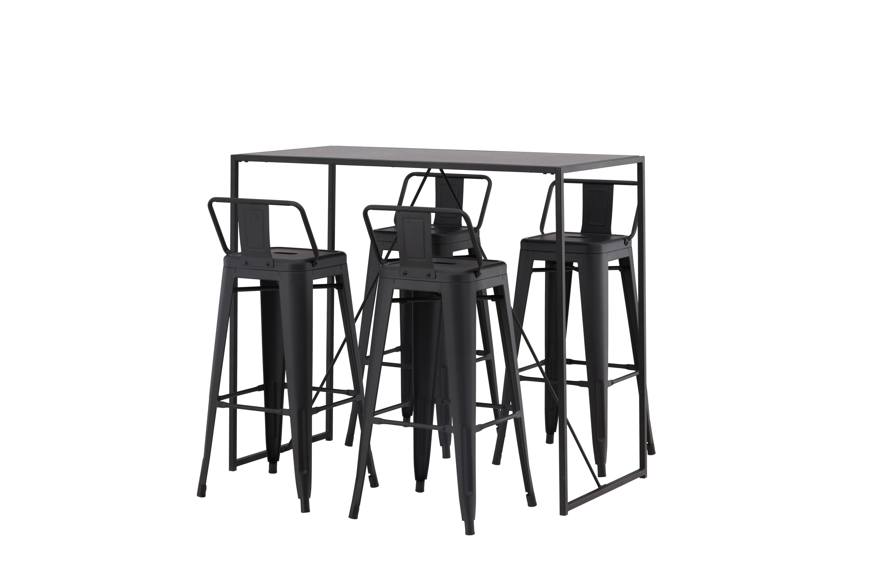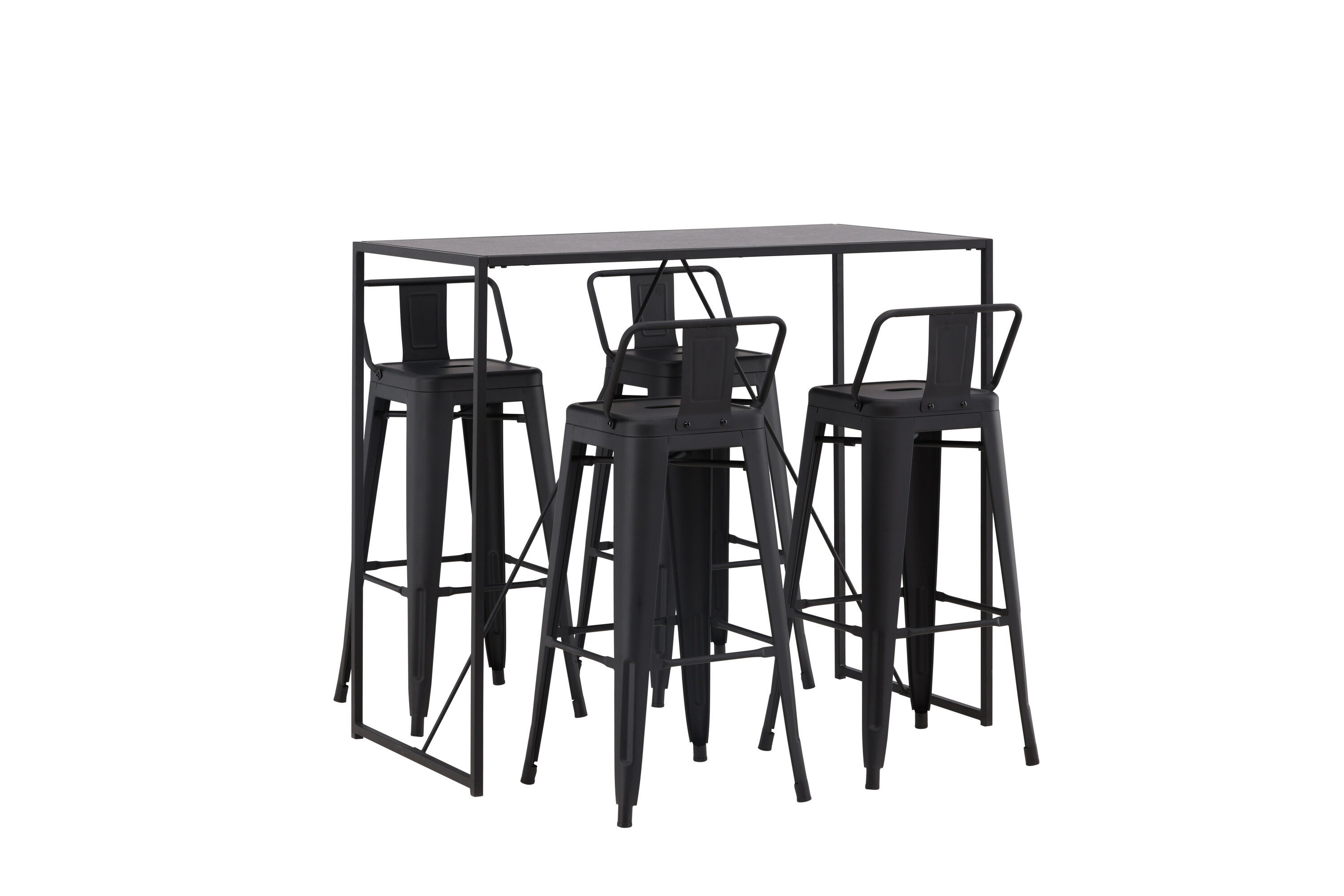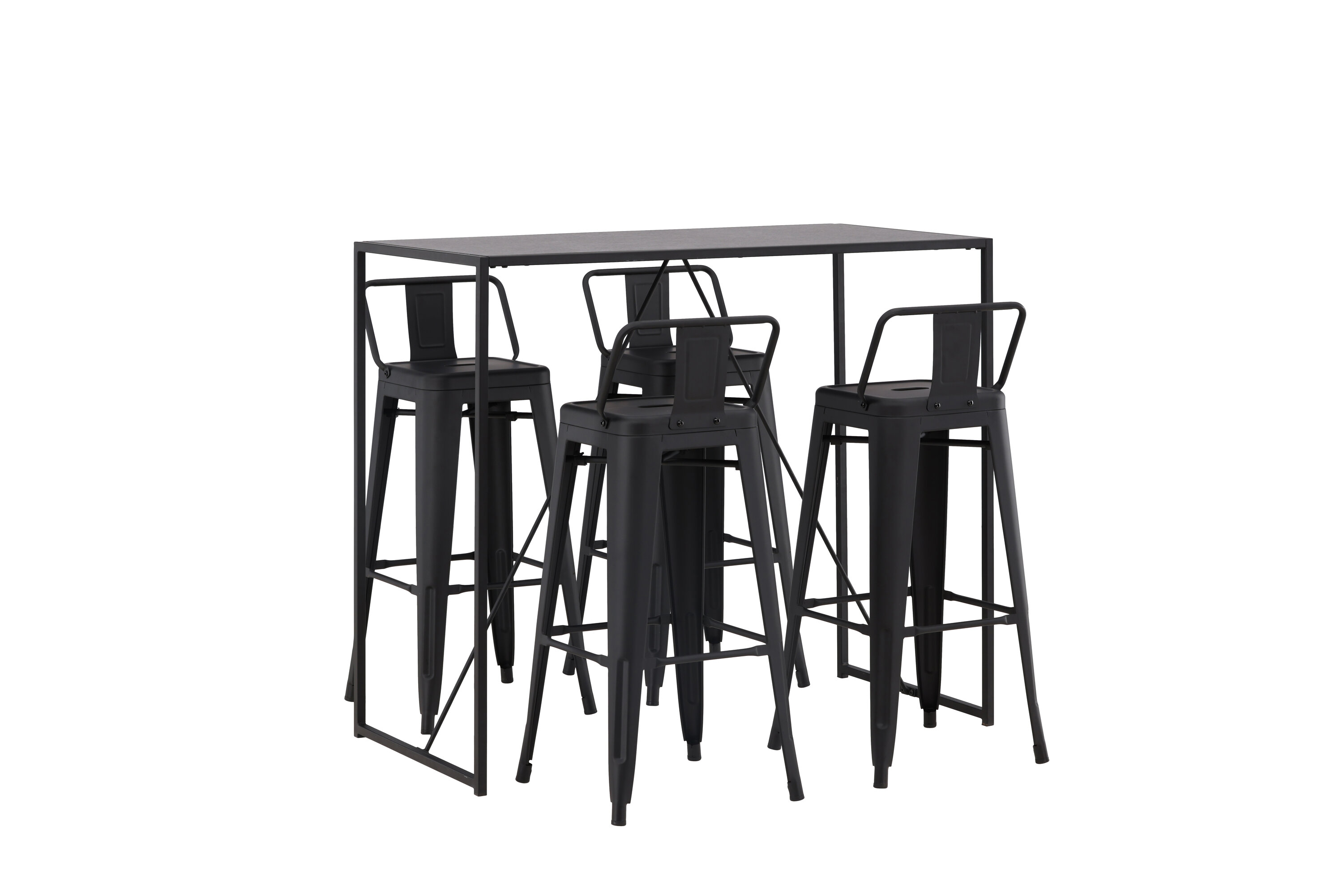 Eine stilvolle und trendige Bargruppe für vier Personen! Hier werden die Barhocker Tempe mit dem Stehtisch Brea kombiniert, der einen modernen und industriellen Ausdruck verleiht. Der Barhocker hat ein klassisches Design eines höheren Hockers mit leicht ausgestellten Beinen, einem Sitz mit einer unteren schwarzen Stahlrückenlehne und einem Rahmen für Fußstützen. Der Stehtisch hat ein skandinavisches und minimalistisches Design mit einer Tischplatte aus dünnem schwarzem MDF mit einer schmalen Rahmenstruktur aus schwarzem Stahl. Diese Bargruppe ist perfekt für diejenigen, die höhere Sitzplätze in der Küche bevorzugen oder für diejenigen mit einem offenen Grundriss, die beim Kochen Gesellschaft suchen.