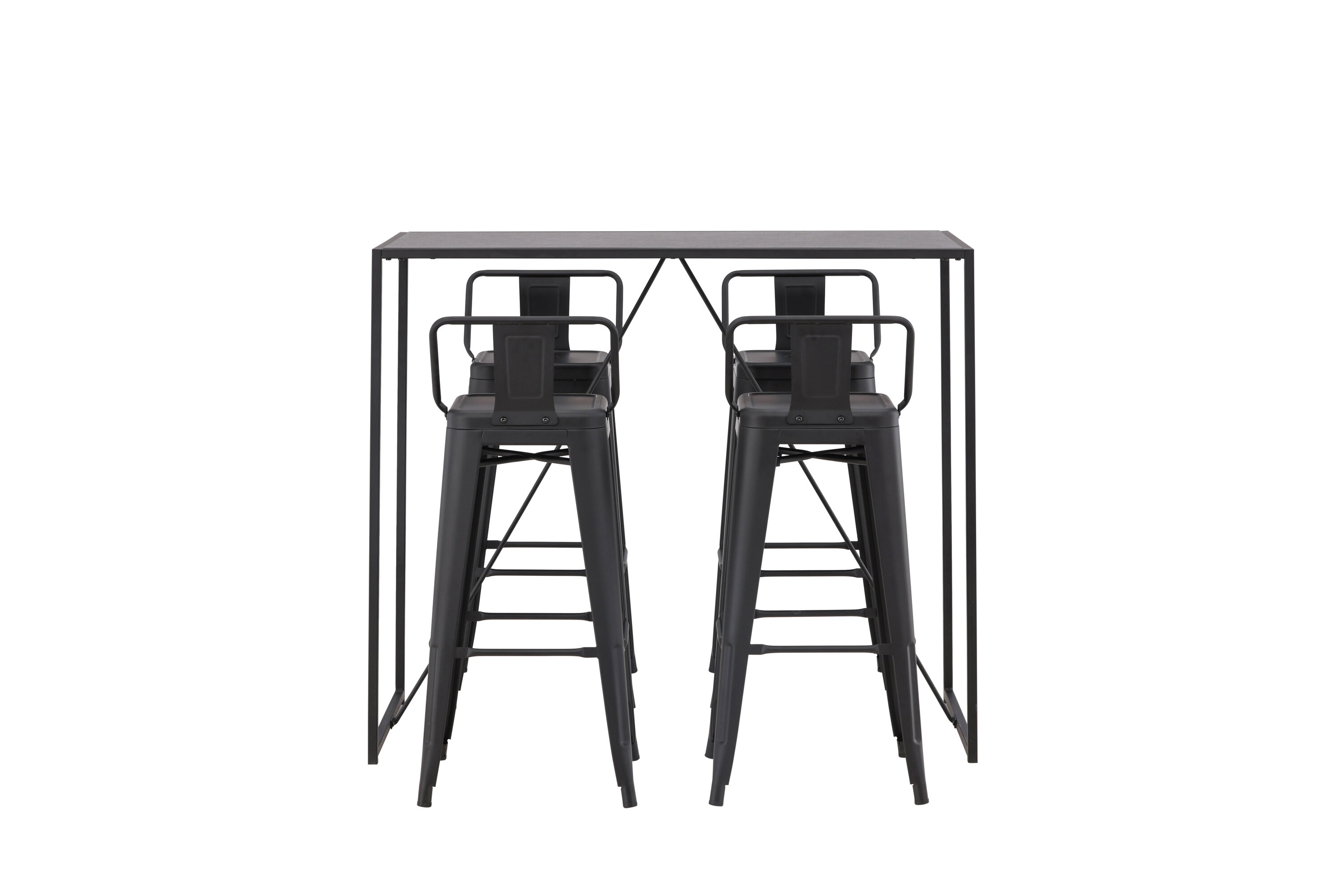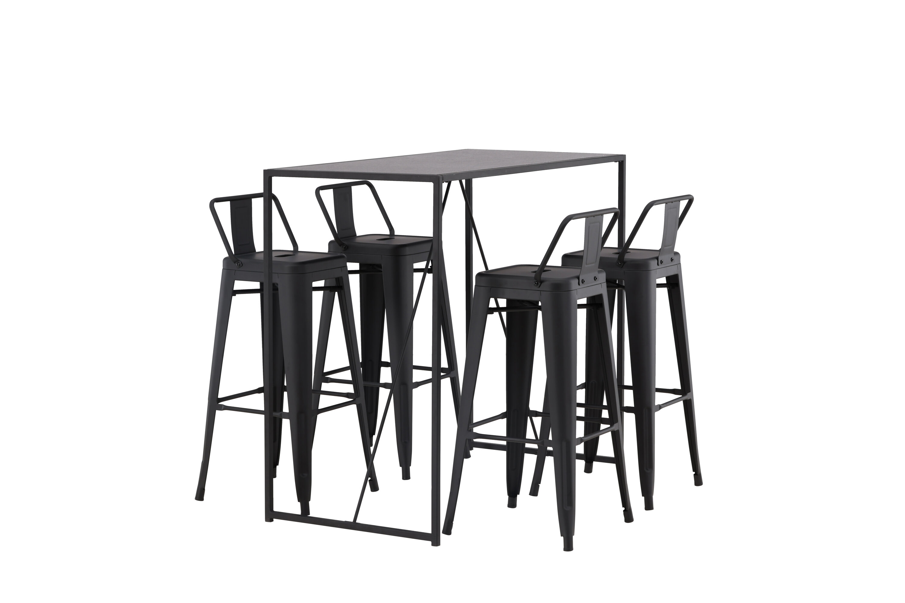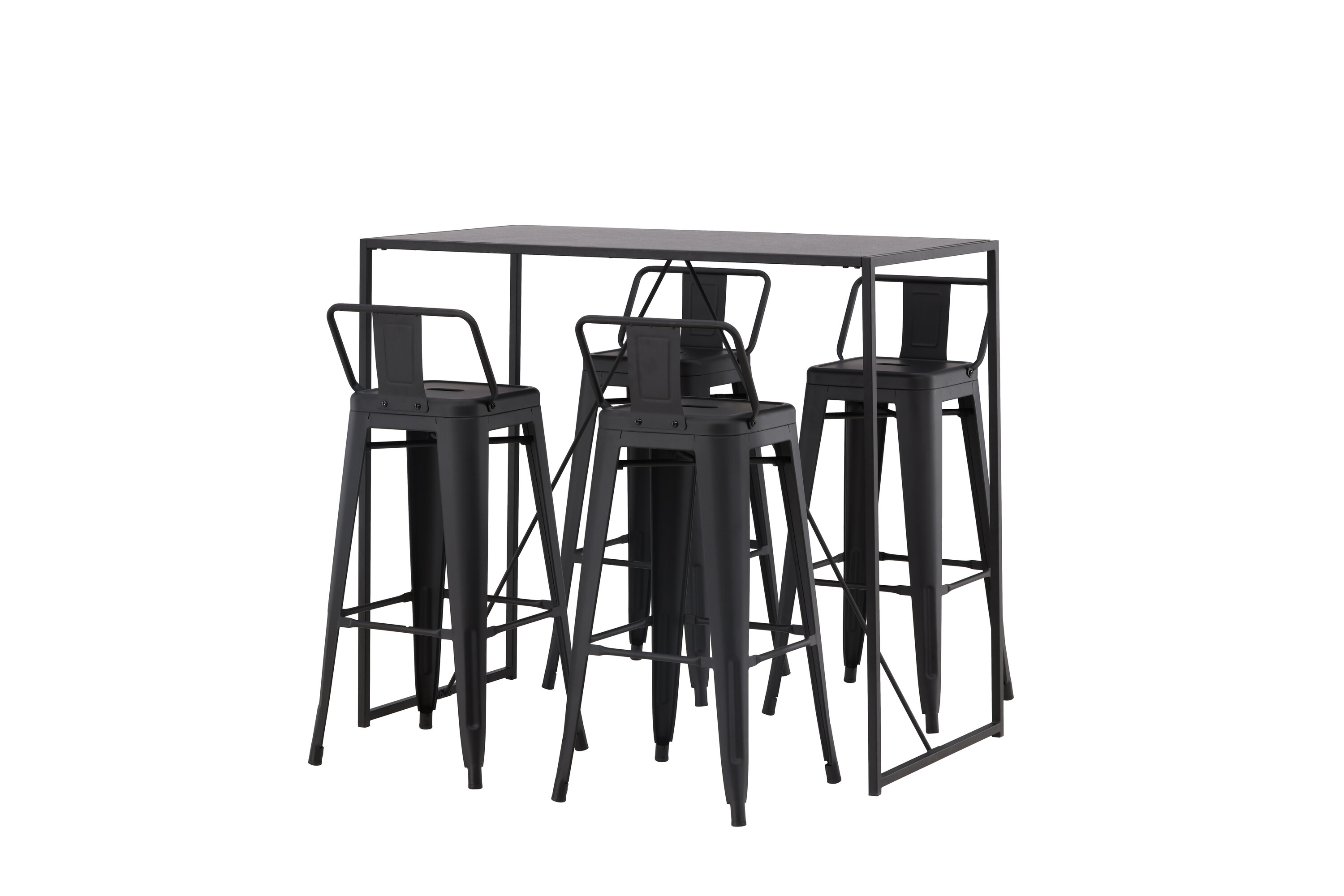 Eine stilvolle und trendige Bargruppe für vier Personen! Hier werden die Barhocker Tempe mit dem Stehtisch Brea kombiniert, der einen modernen und industriellen Ausdruck verleiht. Der Barhocker hat ein klassisches Design eines höheren Hockers mit leicht ausgestellten Beinen, einem Sitz mit einer unteren schwarzen Stahlrückenlehne und einem Rahmen für Fußstützen. Der Stehtisch hat ein skandinavisches und minimalistisches Design mit einer Tischplatte aus dünnem schwarzem MDF mit einer schmalen Rahmenstruktur aus schwarzem Stahl. Diese Bargruppe ist perfekt für diejenigen, die höhere Sitzplätze in der Küche bevorzugen oder für diejenigen mit einem offenen Grundriss, die beim Kochen Gesellschaft suchen.