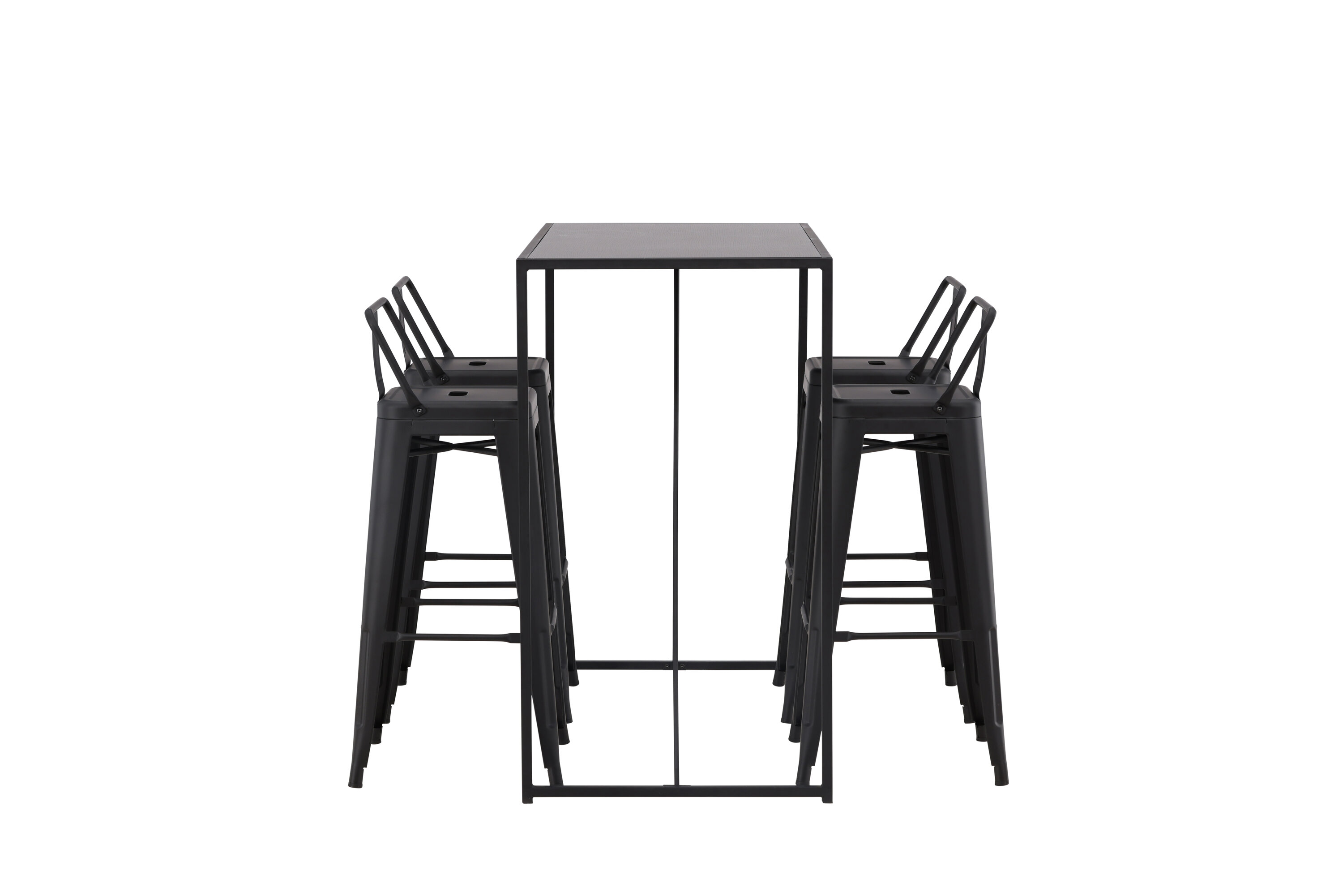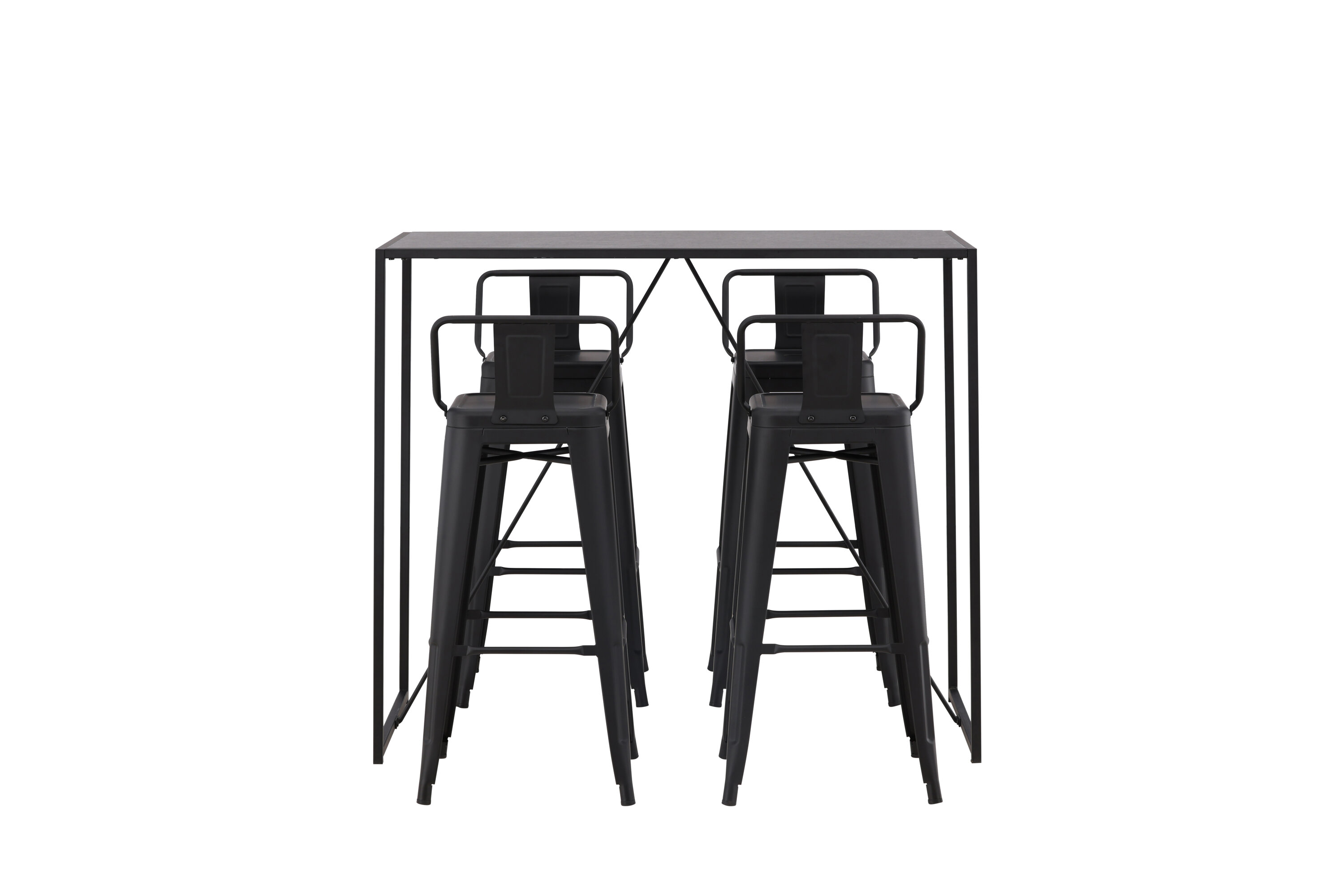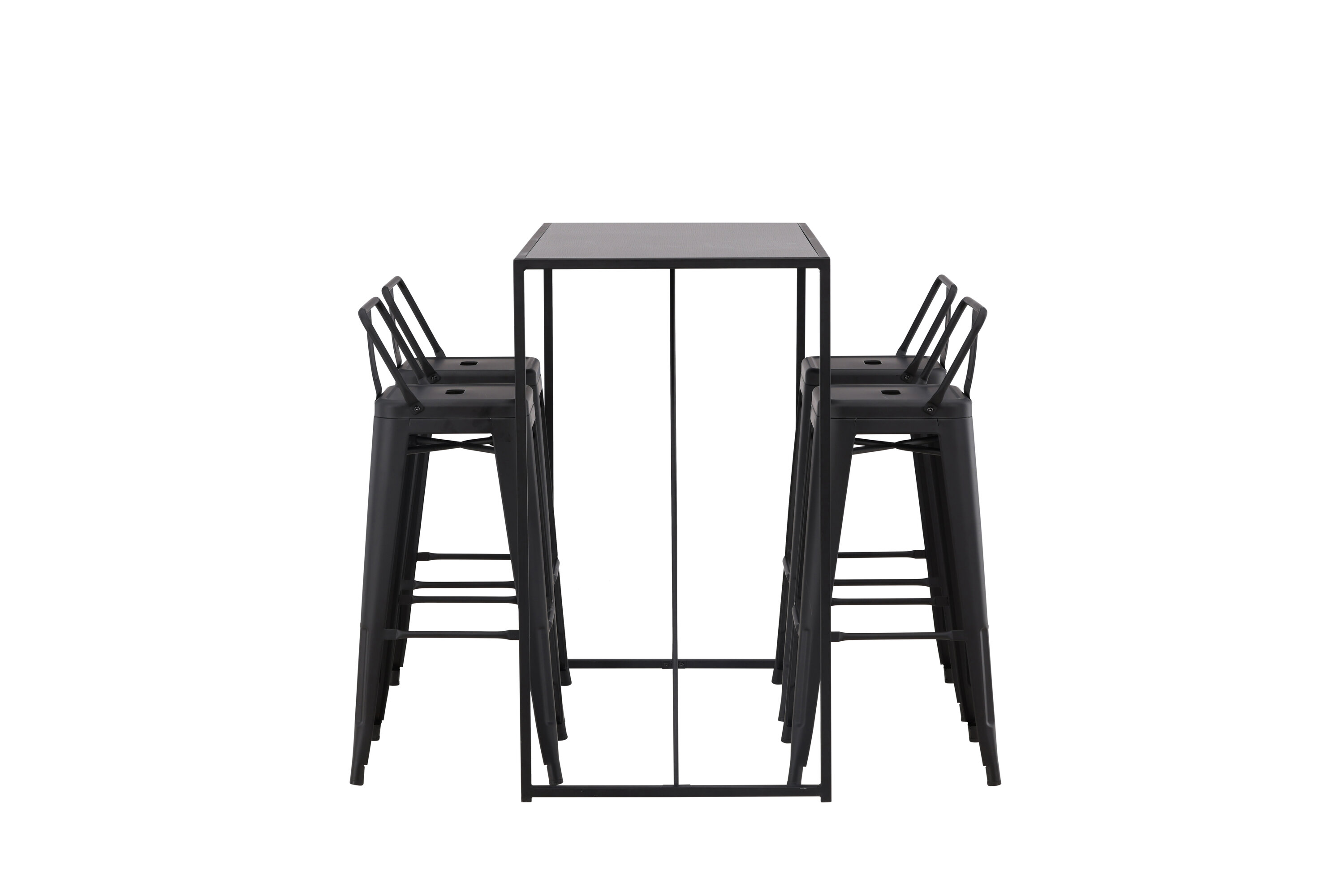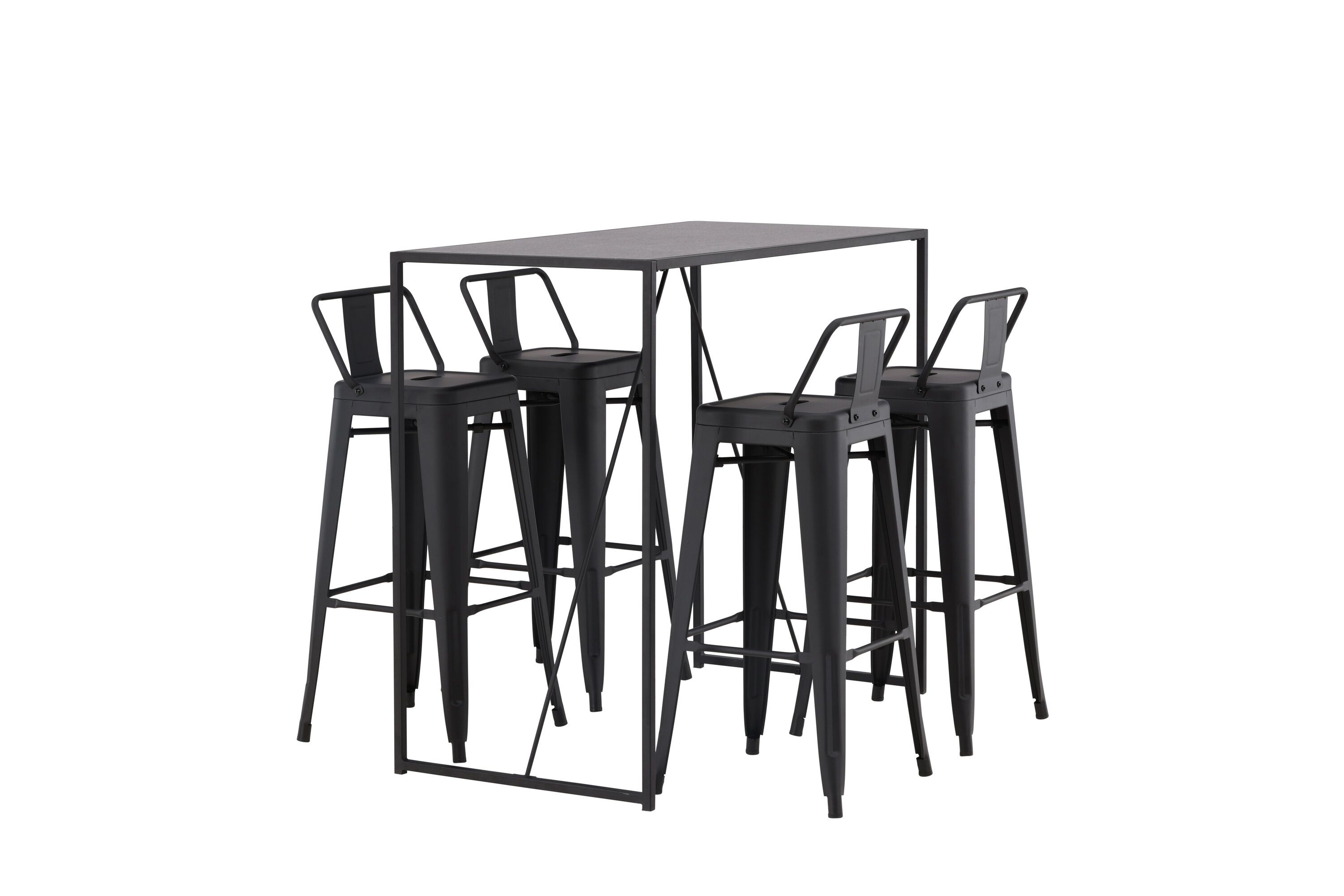 Eine stilvolle und trendige Bargruppe für vier Personen! Hier werden die Barhocker Tempe mit dem Stehtisch Brea kombiniert, der einen modernen und industriellen Ausdruck verleiht. Der Barhocker hat ein klassisches Design eines höheren Hockers mit leicht ausgestellten Beinen, einem Sitz mit einer unteren schwarzen Stahlrückenlehne und einem Rahmen für Fußstützen. Der Stehtisch hat ein skandinavisches und minimalistisches Design mit einer Tischplatte aus dünnem schwarzem MDF mit einer schmalen Rahmenstruktur aus schwarzem Stahl. Diese Bargruppe ist perfekt für diejenigen, die höhere Sitzplätze in der Küche bevorzugen oder für diejenigen mit einem offenen Grundriss, die beim Kochen Gesellschaft suchen.