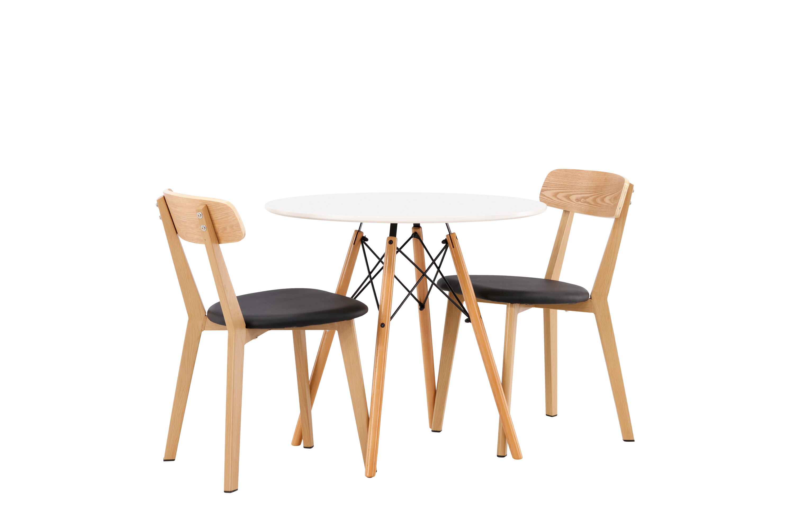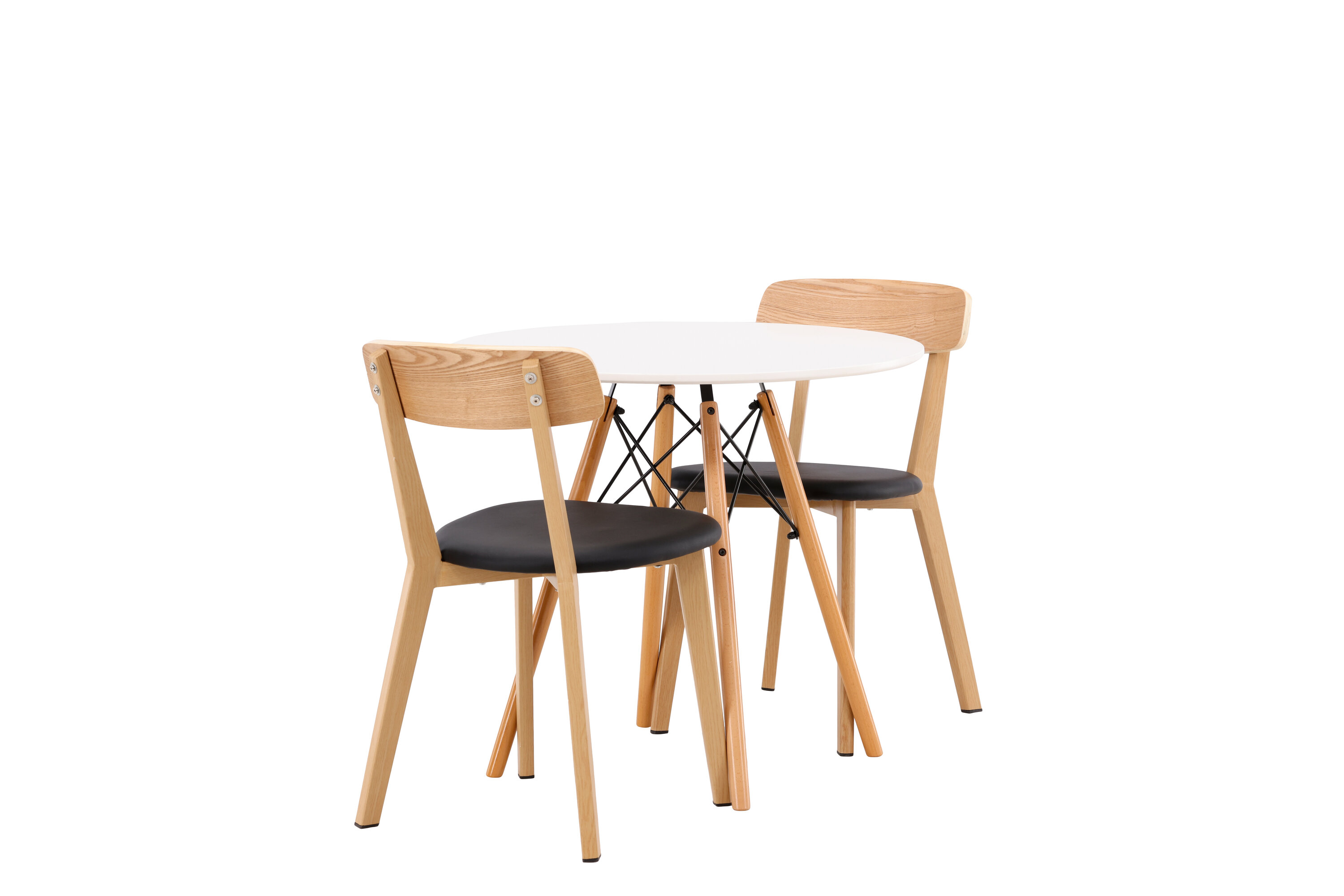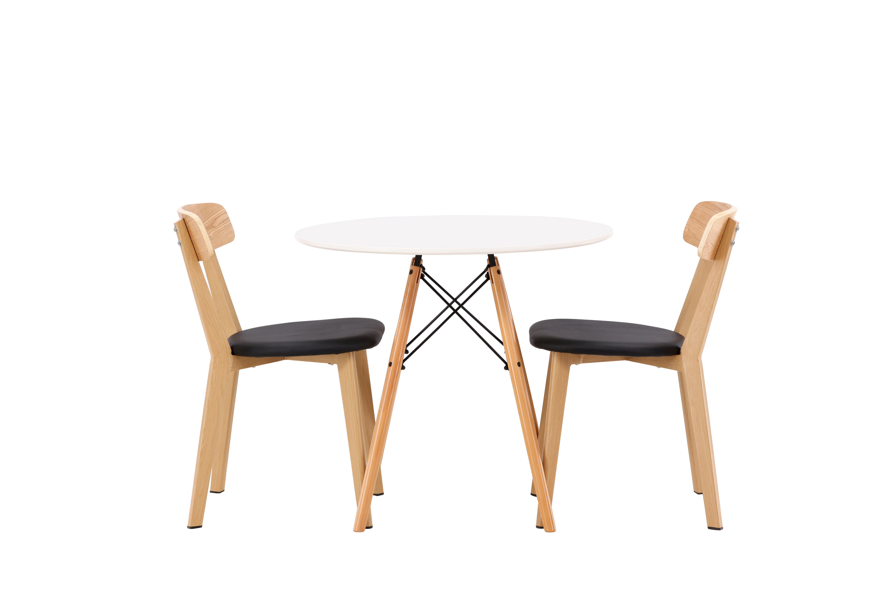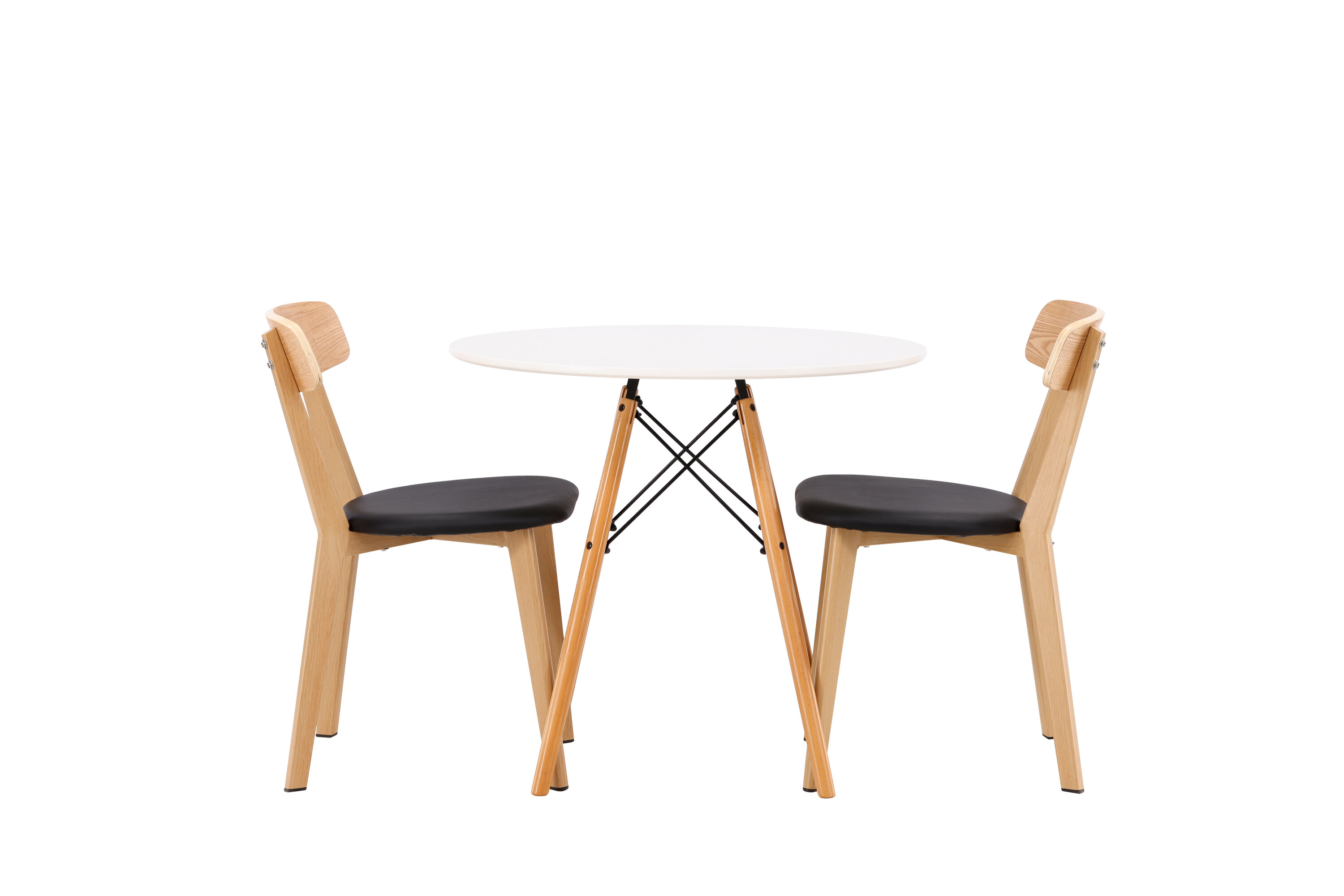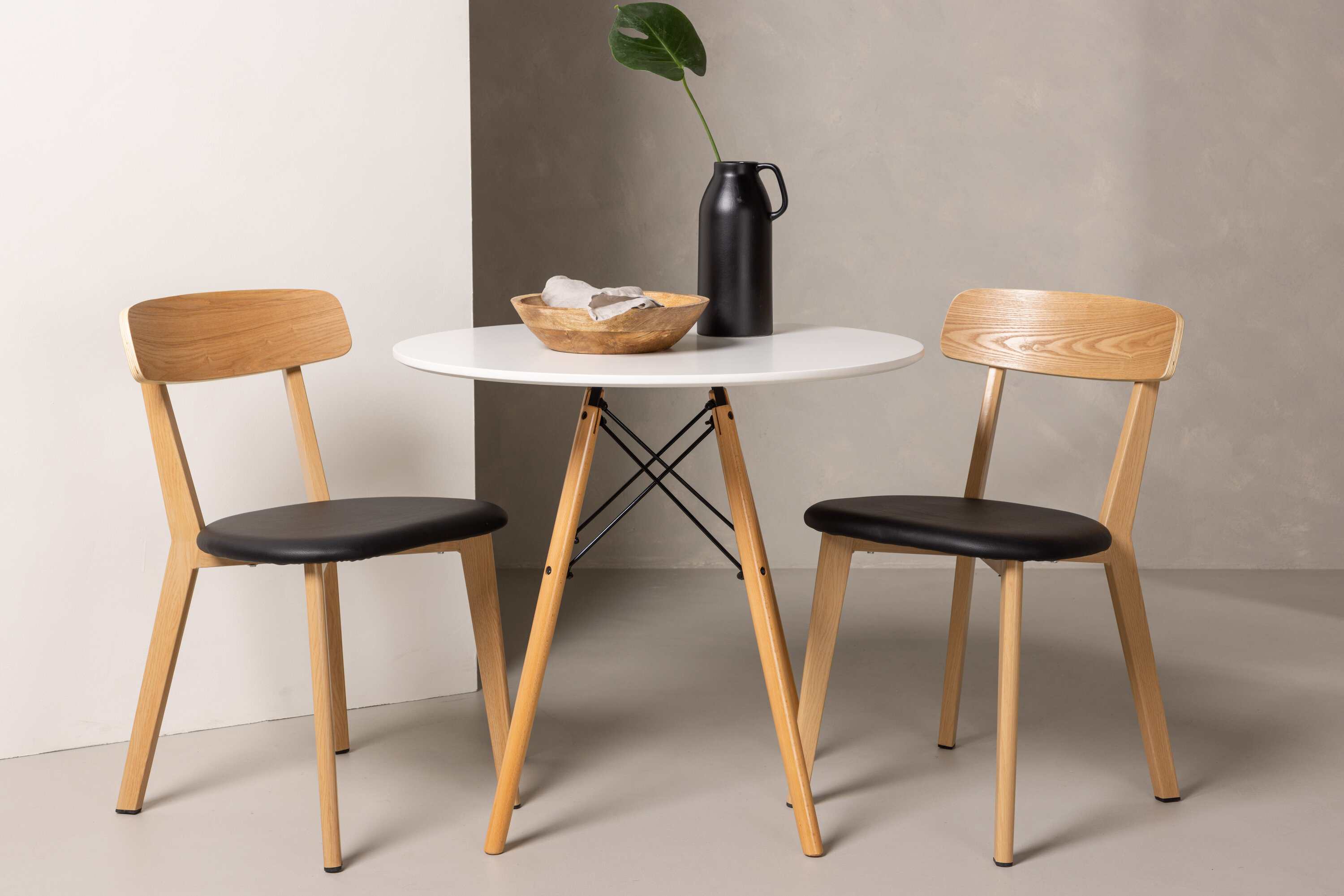 Eine fantastische Farbkombination! Der runde Esstisch Danburi hat ein klassisches Design mit einer runden Tischplatte aus weißem MDF und leicht ausgestellten Beinen aus Buchenholz mit dekorativen Details aus schwarzem Stahl. Hier in schöner Kombination mit unseren wunderbaren Stühlen Sanjos. Der Stuhl hat ein geschmackvolles Design in den Farben Schwarz und Naturholz. Der weiche Sitz ist für zusätzlichen Komfort mit Schaumstoff gepolstert und hat eine schöne PU-Polsterung in Schwarz. Rücken und Beine sind aus hellem Holz und vermitteln den Eindruck eines klassischen Designs. Hier bekommen Sie alles, was Sie für ein angenehmes Abendessen in der kleineren Küche brauchen! Tischdurchmesser: 60cm.