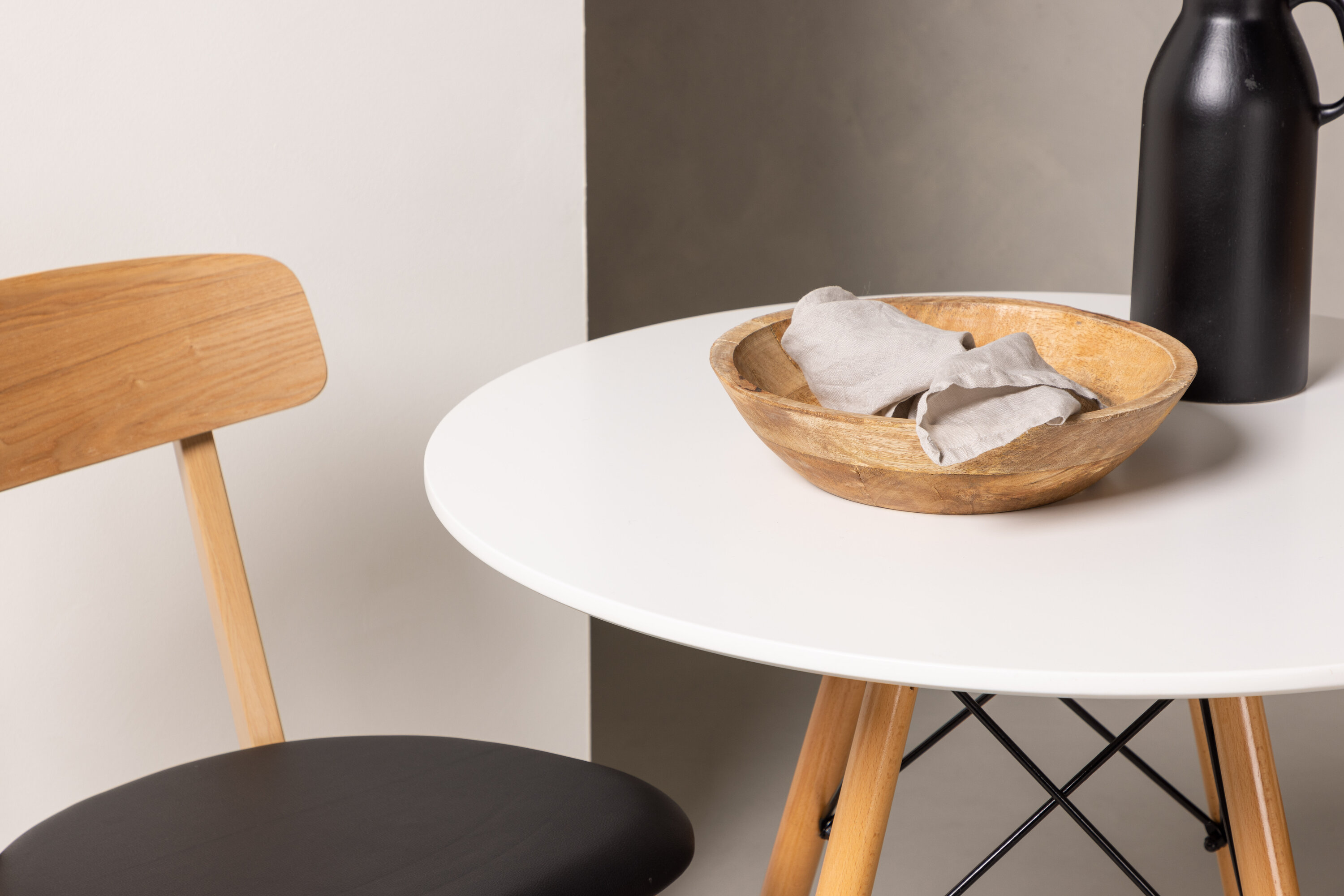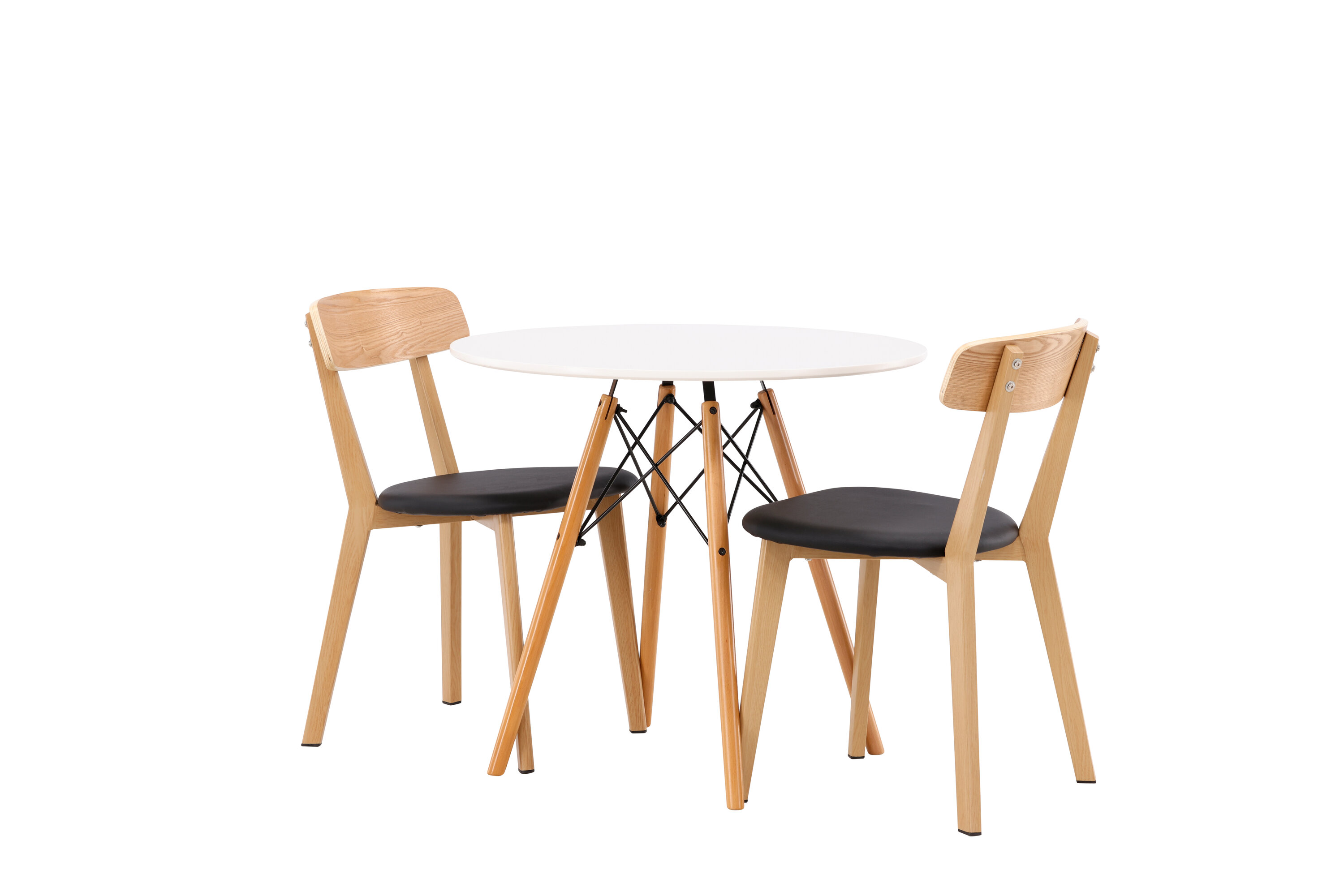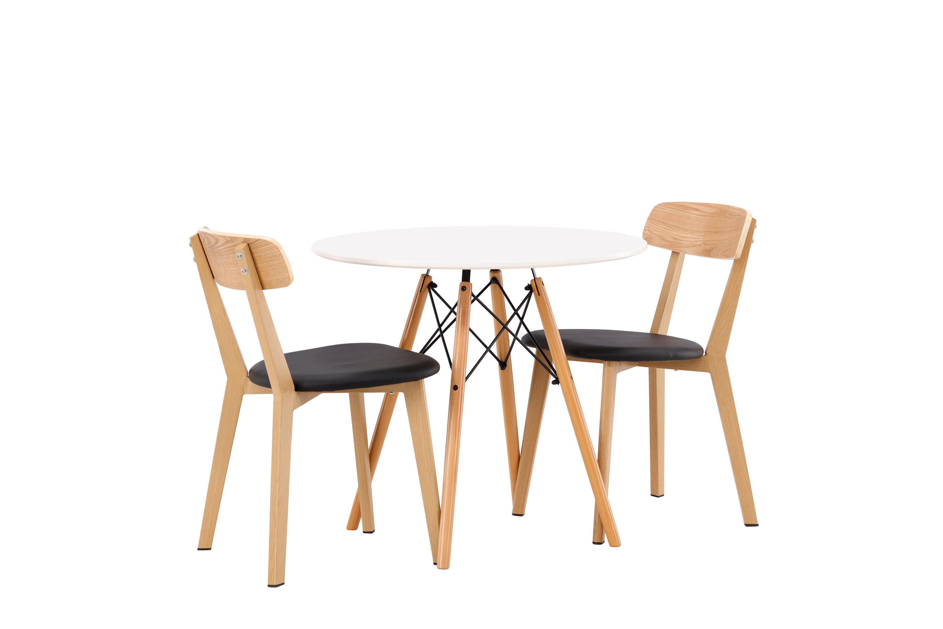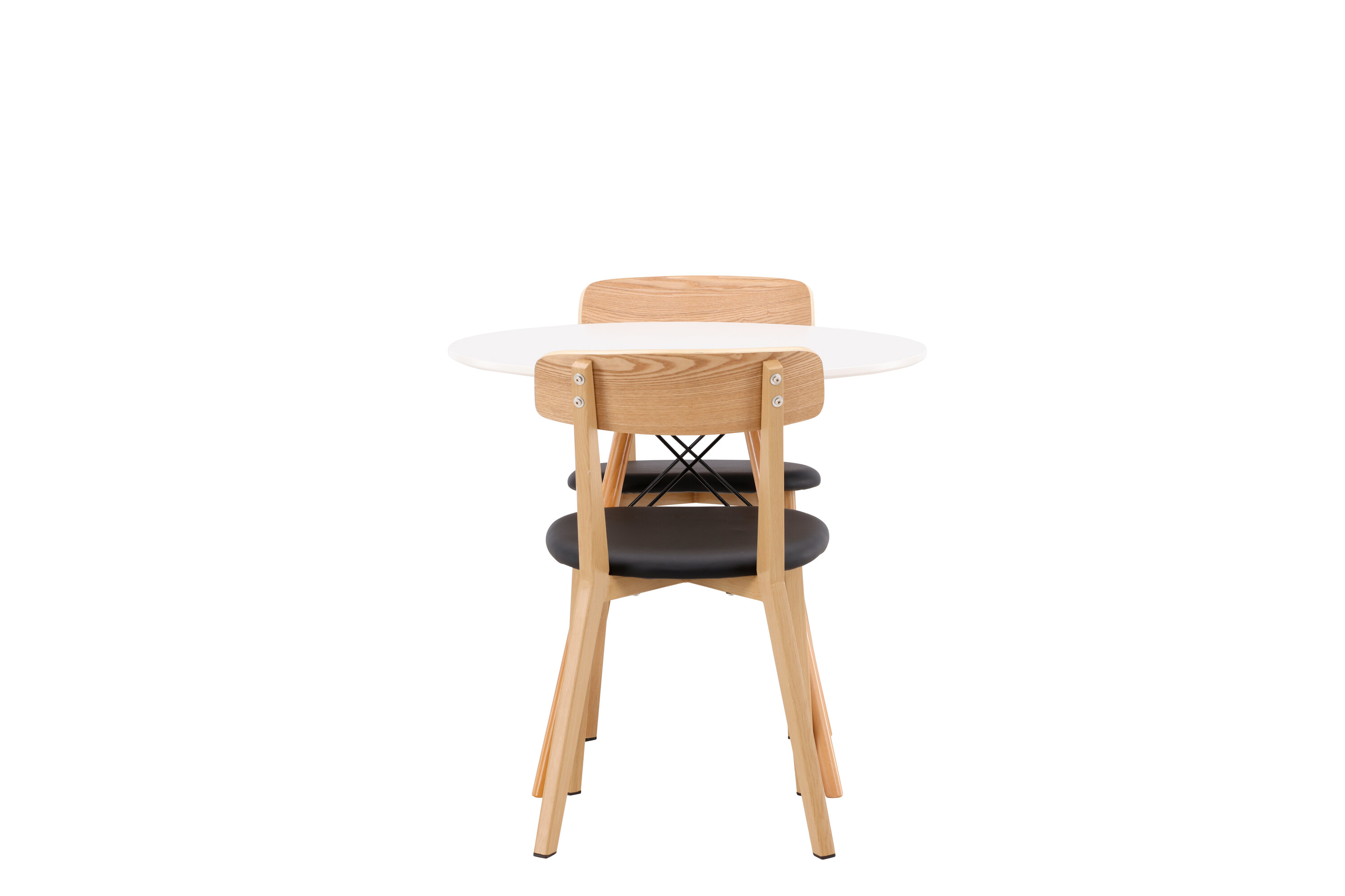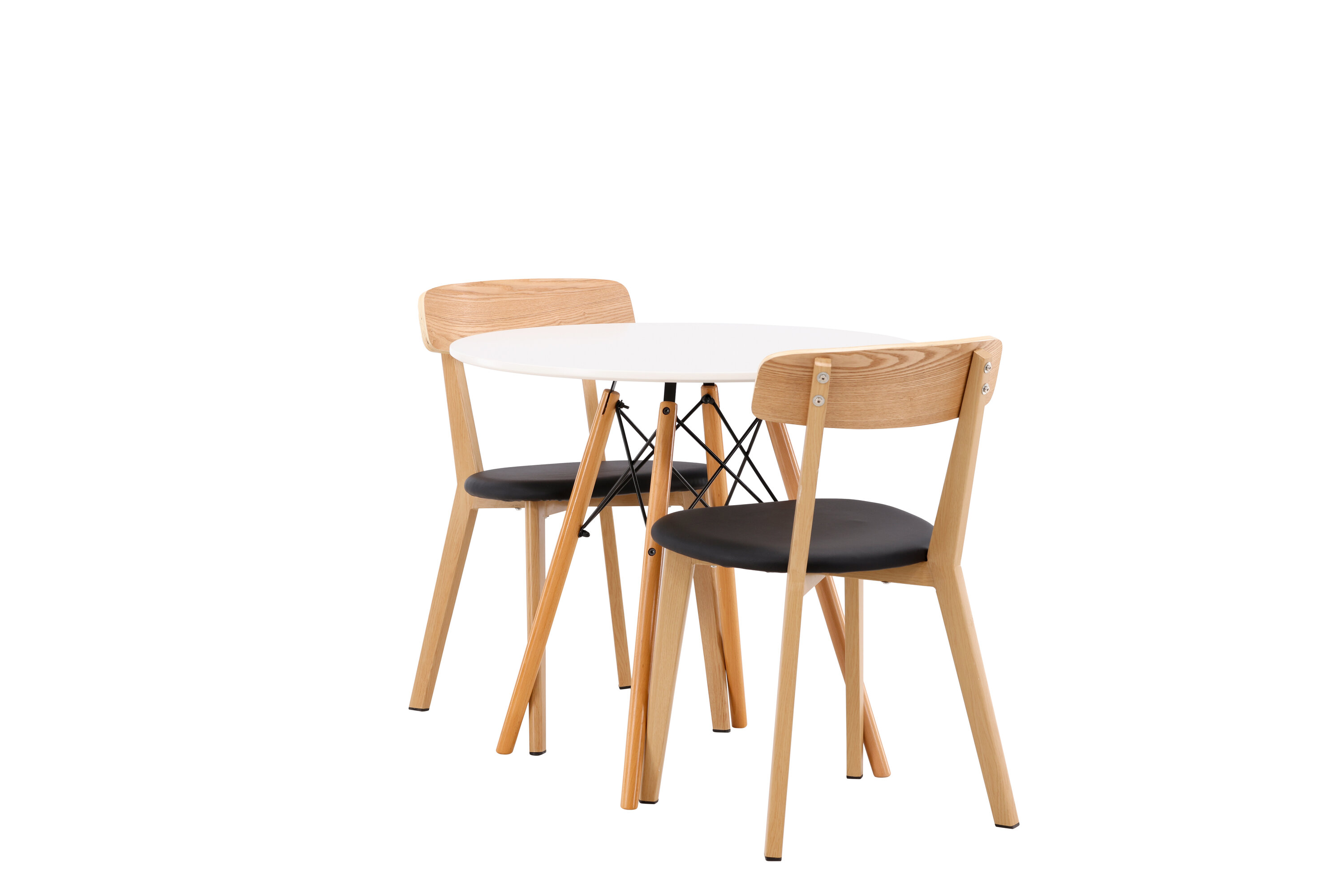 Eine fantastische Farbkombination! Der runde Esstisch Danburi hat ein klassisches Design mit einer runden Tischplatte aus weißem MDF und leicht ausgestellten Beinen aus Buchenholz mit dekorativen Details aus schwarzem Stahl. Hier in schöner Kombination mit unseren wunderbaren Stühlen Sanjos. Der Stuhl hat ein geschmackvolles Design in den Farben Schwarz und Naturholz. Der weiche Sitz ist für zusätzlichen Komfort mit Schaumstoff gepolstert und hat eine schöne PU-Polsterung in Schwarz. Rücken und Beine sind aus hellem Holz und vermitteln den Eindruck eines klassischen Designs. Hier bekommen Sie alles, was Sie für ein angenehmes Abendessen in der kleineren Küche brauchen! Tischdurchmesser: 60cm.