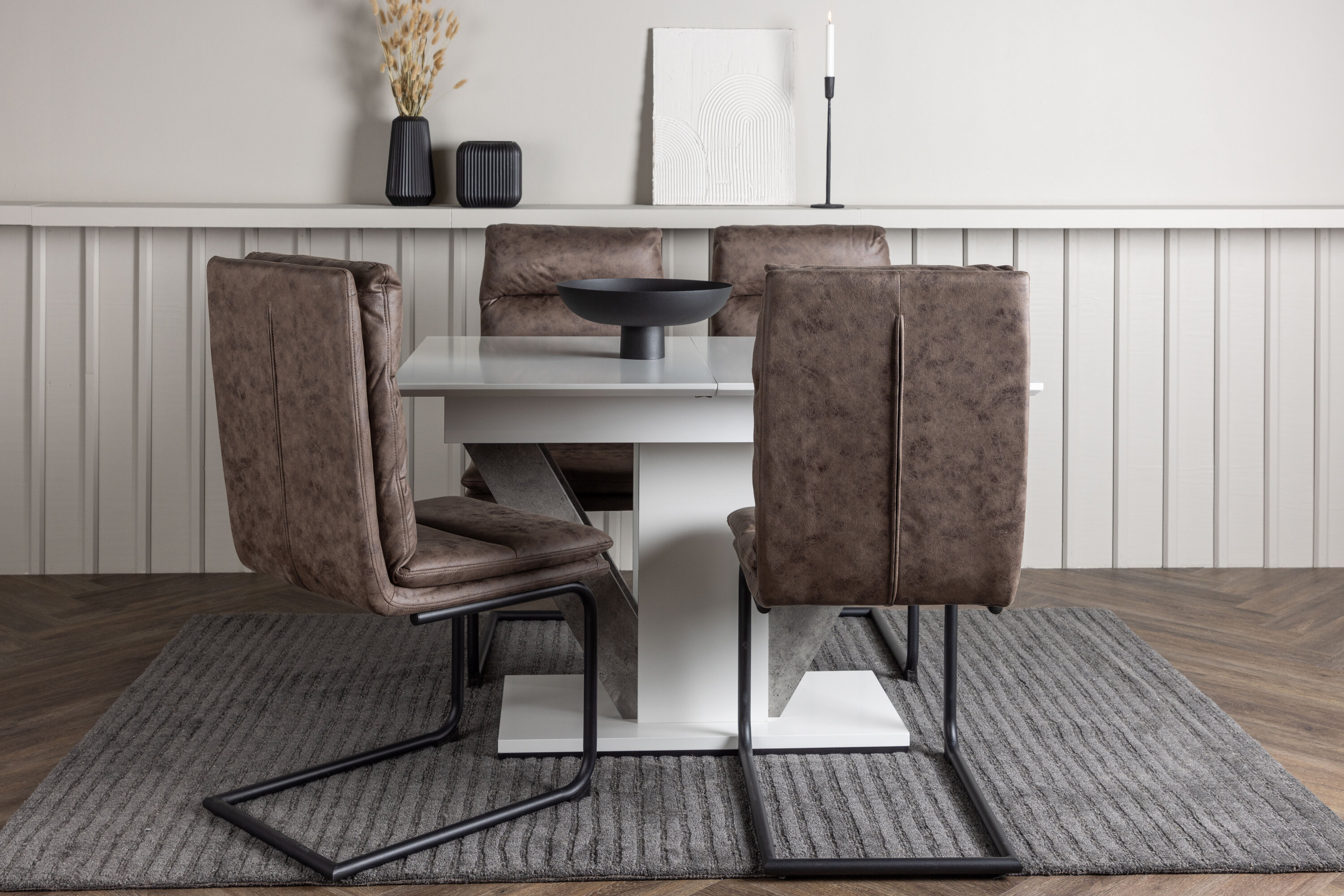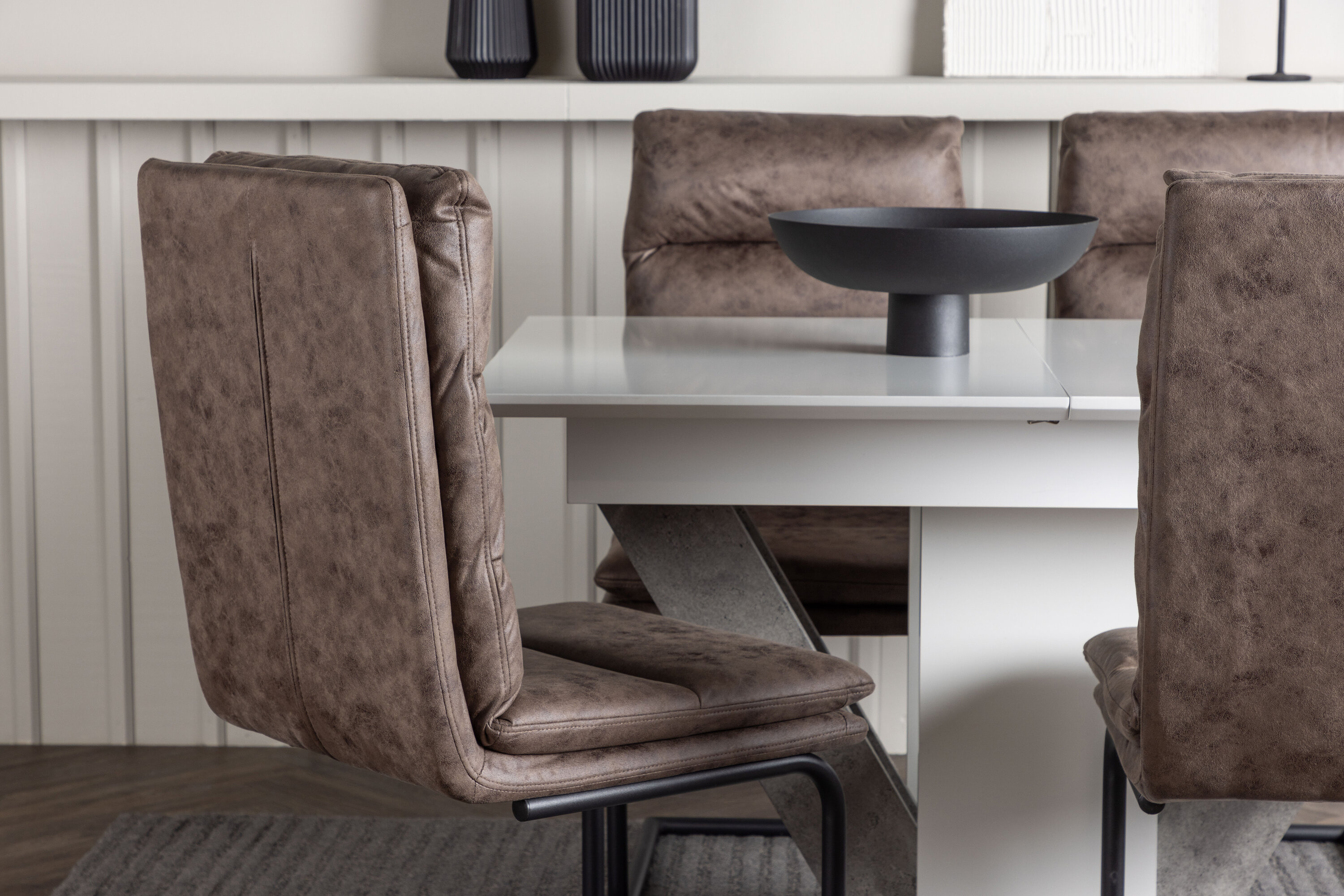 Hier, zusammen mit unseren modernen Zizo Esszimmerstühlen. Das nordische Design des Stuhls mit einem rustikalen Touch in der dunkelbraunen Farbe verleiht Ihrem Esszimmer eine raffinierte und modebewusste Atmosphäre. Hergestellt aus strapazierfähiger Mikrofaser und mit eisernen Stuhlbeinen, bieten diese Stühle Haltbarkeit und Qualität, die dem Test der Zeit standhält.
