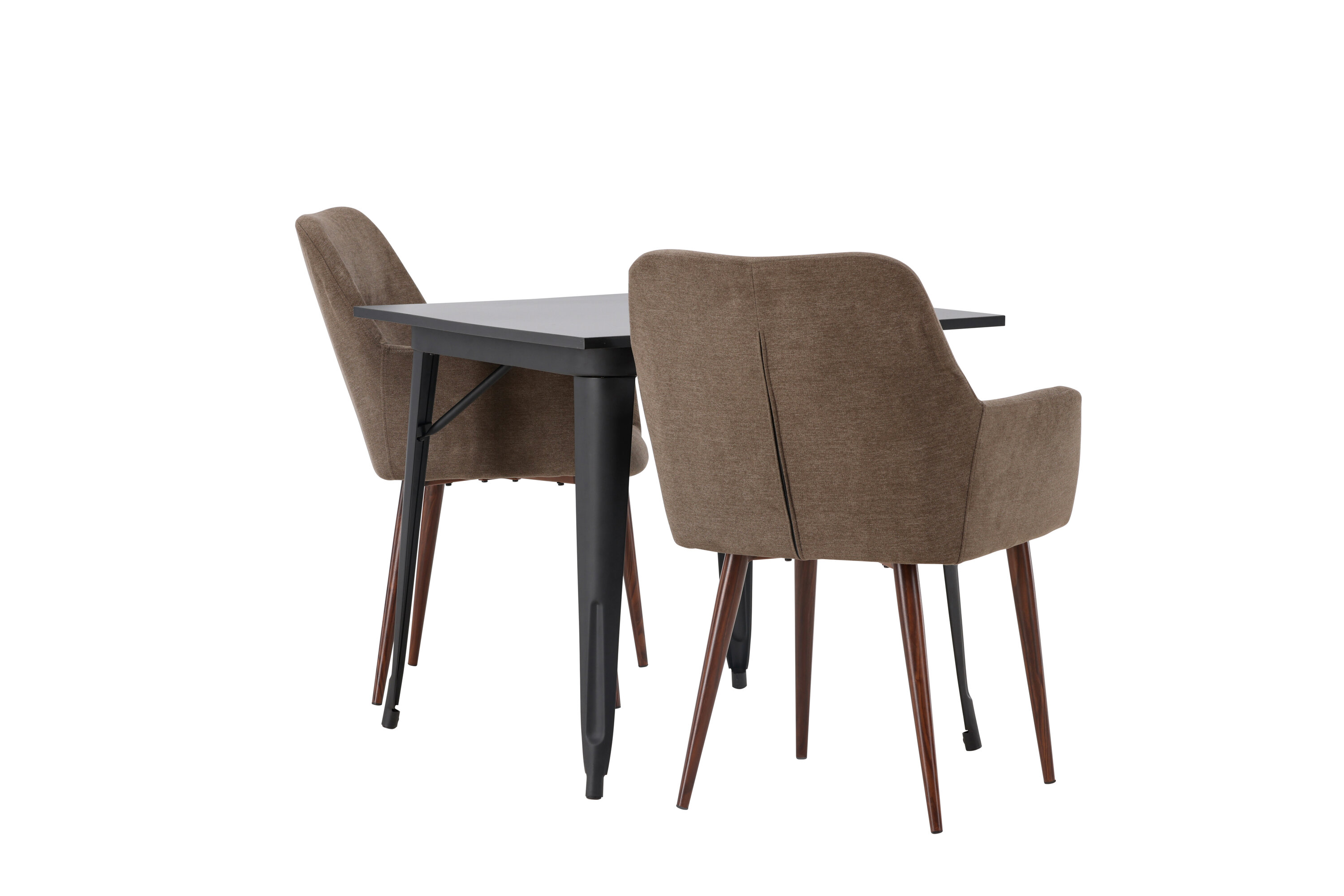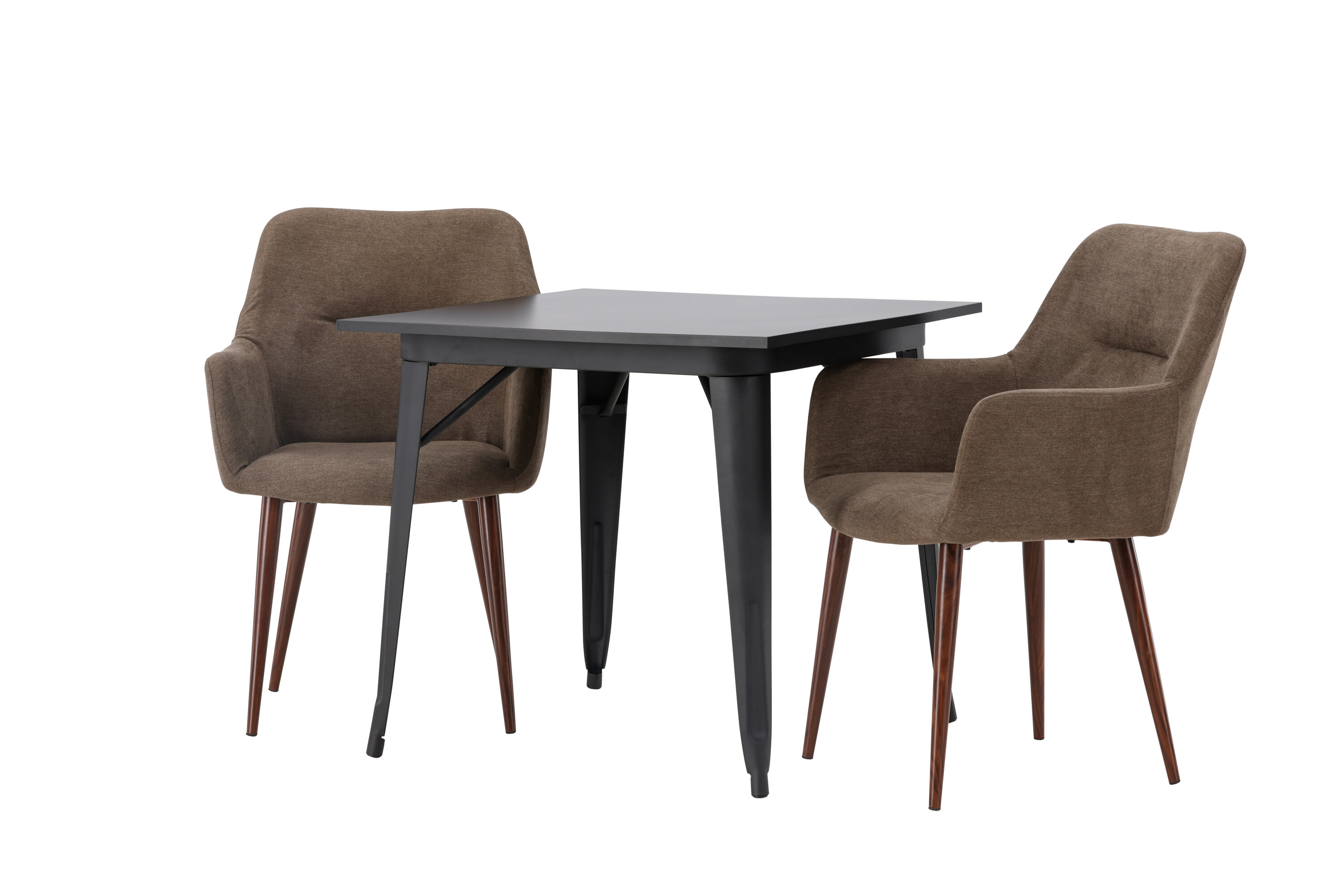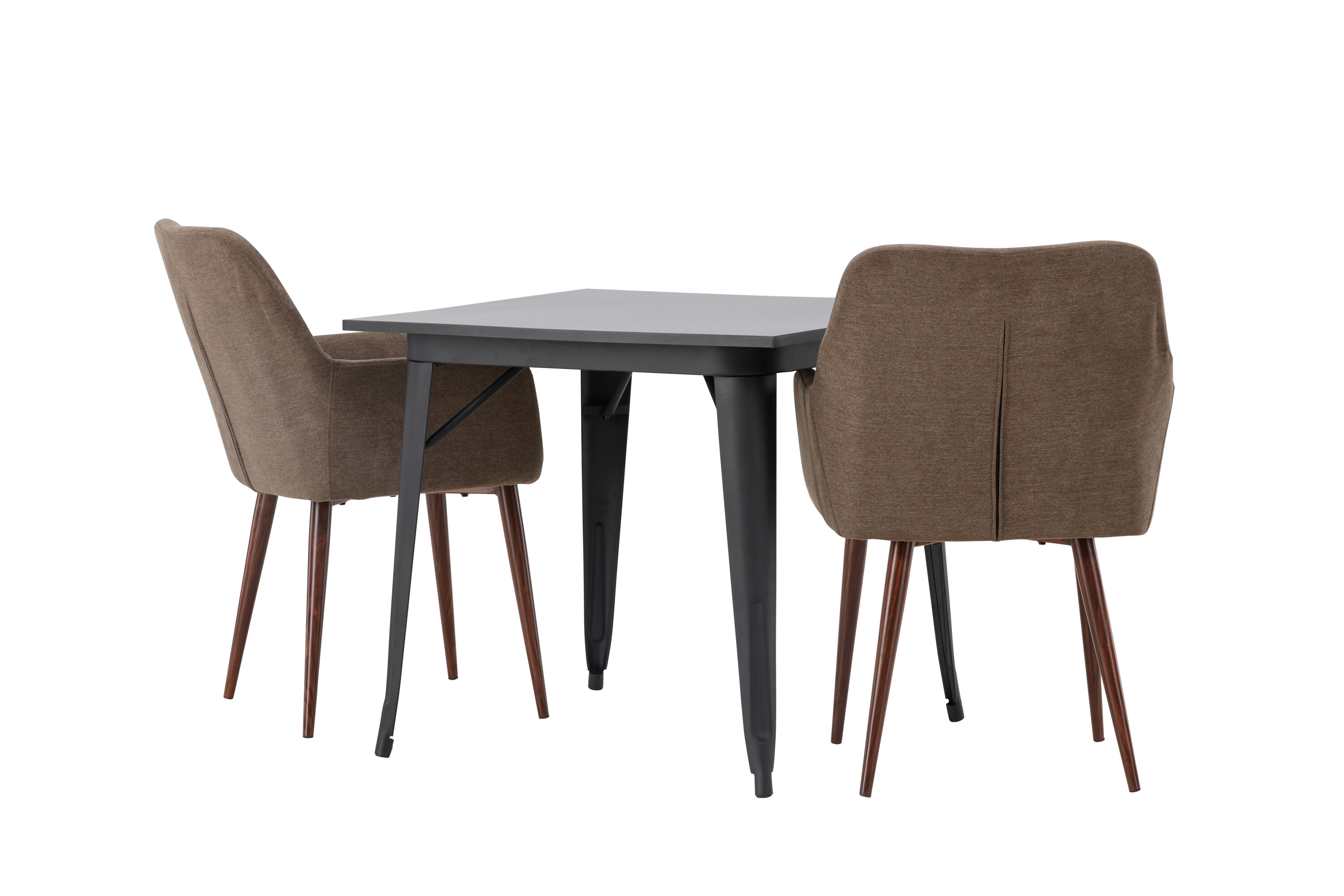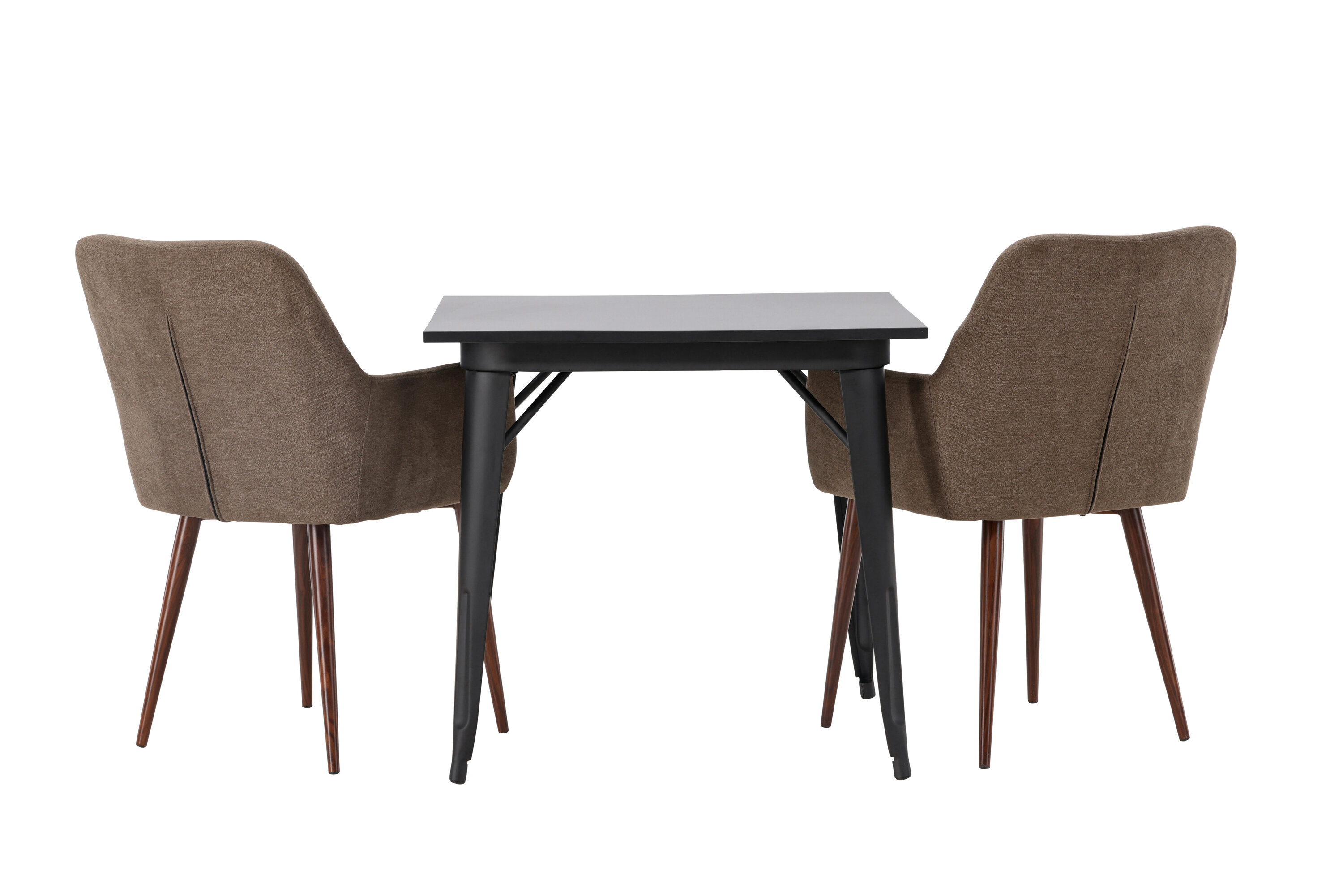 Tauchen Sie ein in unsere gemütliche Essgruppe! Unser quadratischer Esstisch Tempe hat eine gepflegte Größe und ein trendiges, skandinavisches Design. Hergestellt mit einer Tischplatte aus schwarzem MDF und Tischbeinen aus schwarzem Metall. Hier zusammen mit wunderbaren, braunen Stühlen aus der Serie Tomorrow. Der voll gepolsterte Sitz mit integrierten Armlehnen ist aus braunem Polyestergewebe und die Stuhlbeine sind in einem modernen Walnussbraun leicht ausgestellt. Ganz einfach, ein fantastisches Spiel! Tischabmessungen: 80x80cm.
