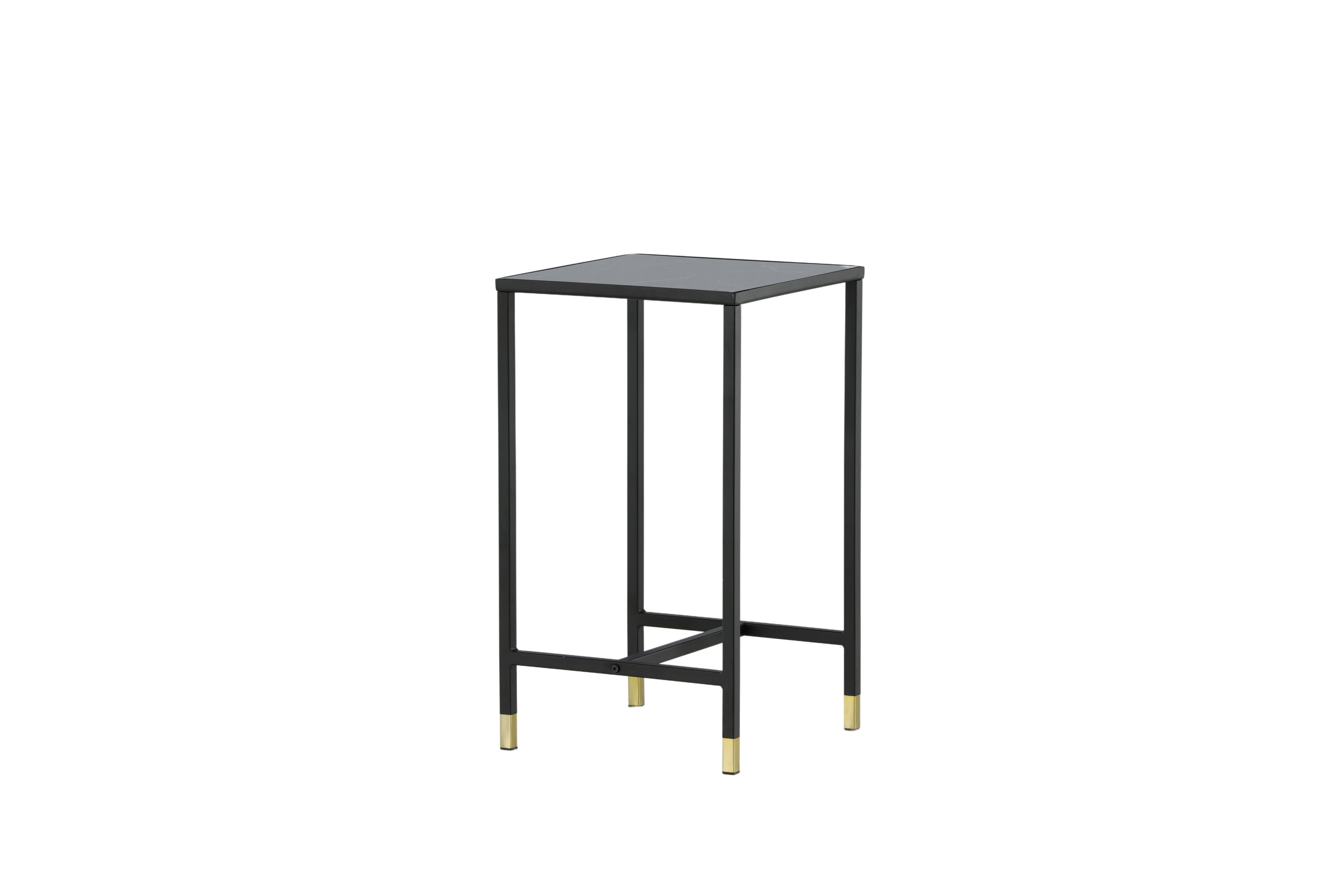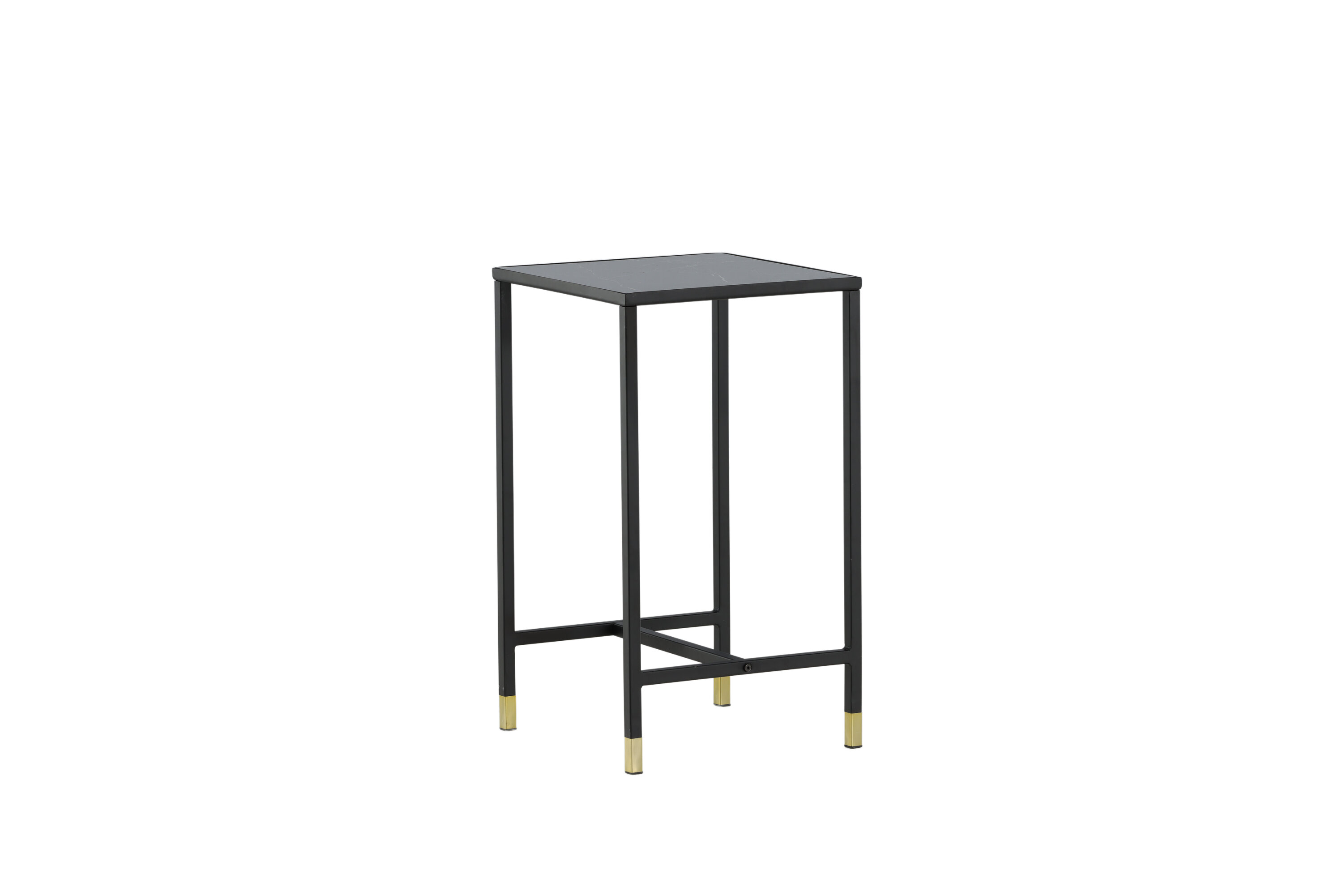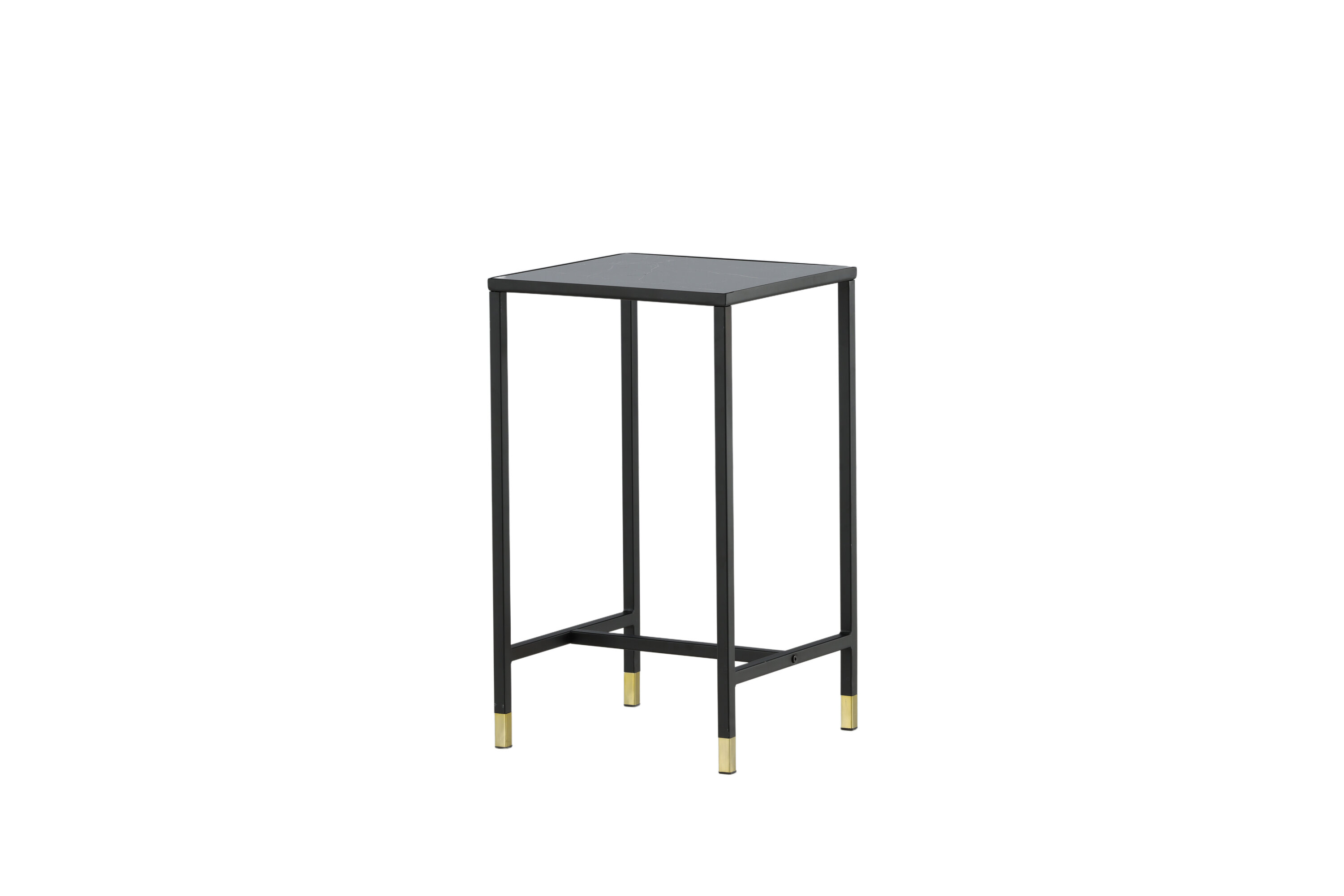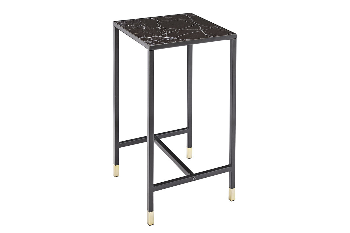 Der schwarze, hohe Stahlrahmen sorgt nicht nur für Stabilität, sondern schafft auch einen markanten Kontrast zur gesprenkelten schwarzen Marmoroptik auf der quadratischen Tischplatte. Zusätzlich wird dem Tisch durch die vergoldeten Metallenden ein Hauch von Exklusivität verliehen.