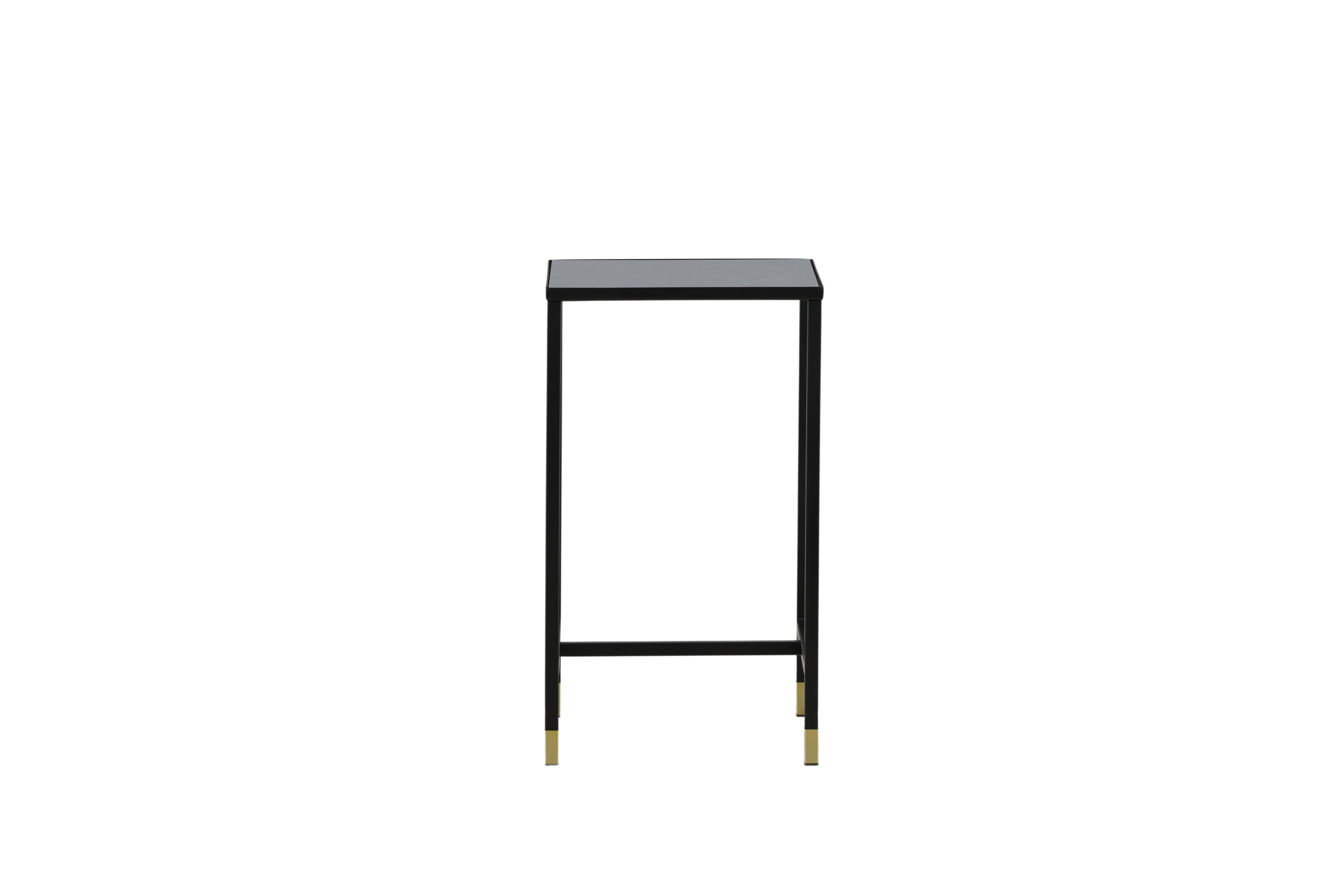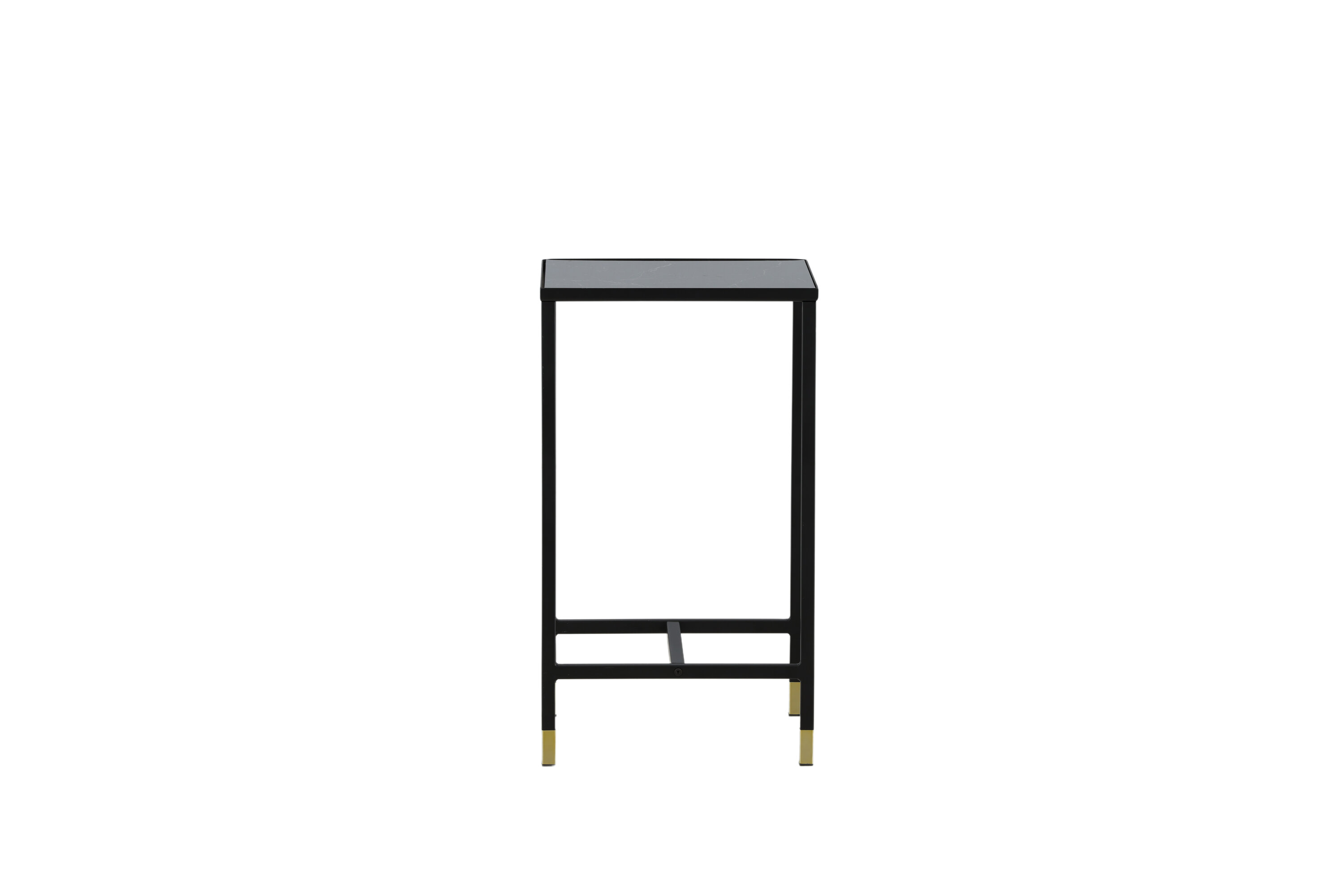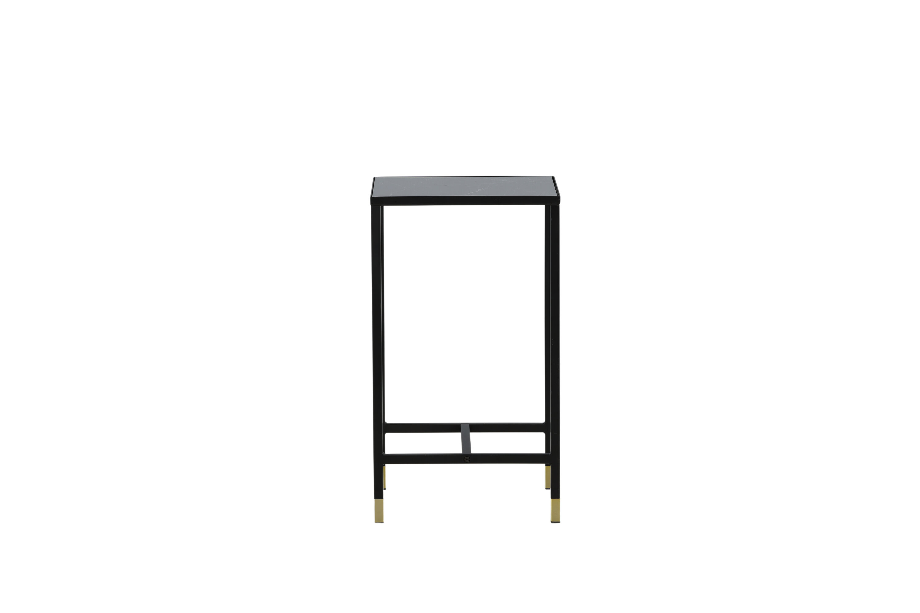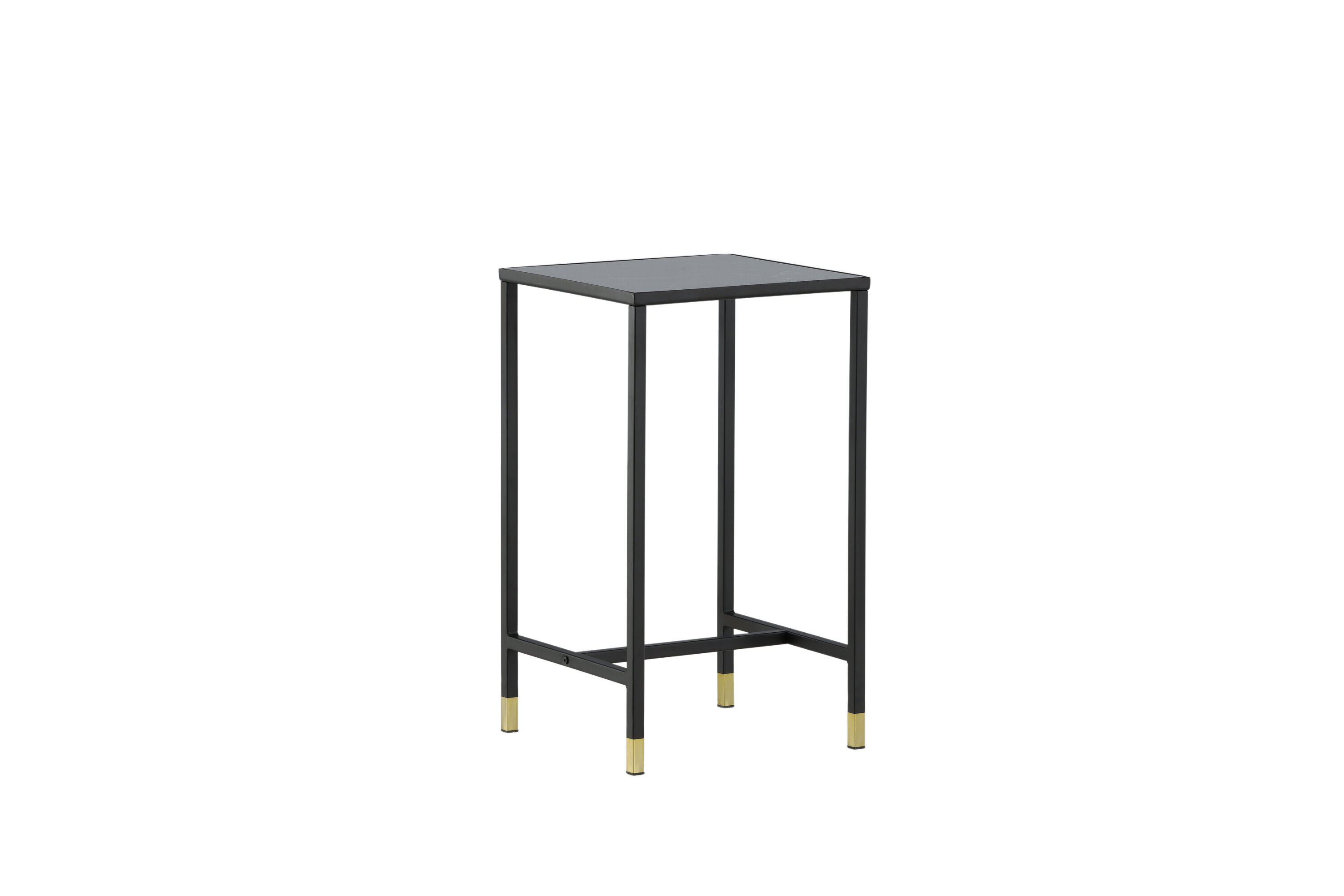 Der schwarze, hohe Stahlrahmen sorgt nicht nur für Stabilität, sondern schafft auch einen markanten Kontrast zur gesprenkelten schwarzen Marmoroptik auf der quadratischen Tischplatte. Zusätzlich wird dem Tisch durch die vergoldeten Metallenden ein Hauch von Exklusivität verliehen.