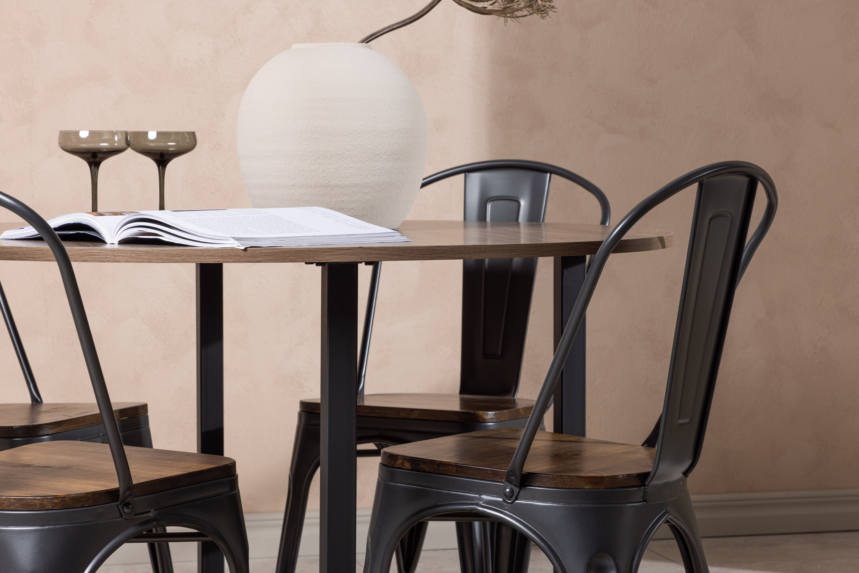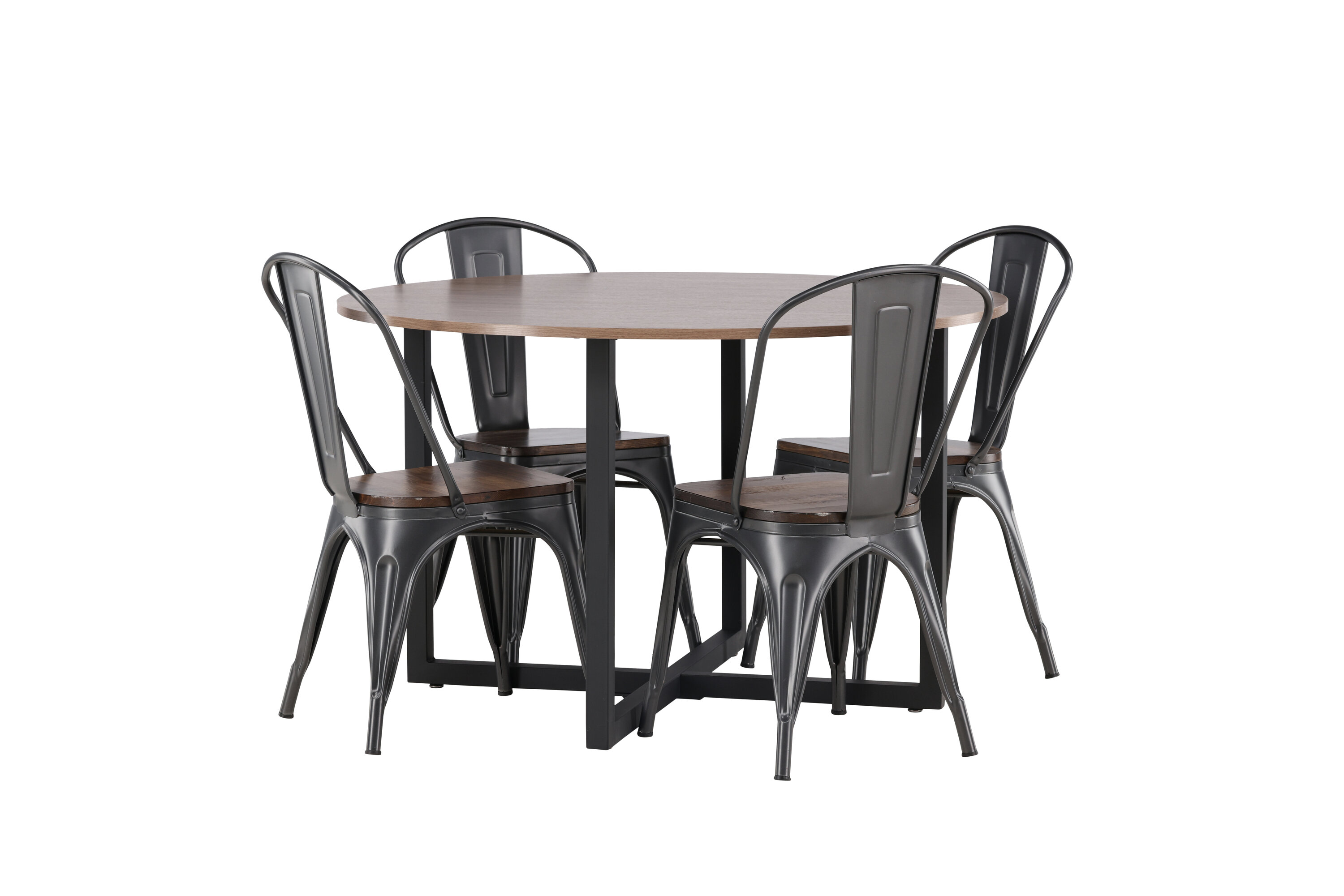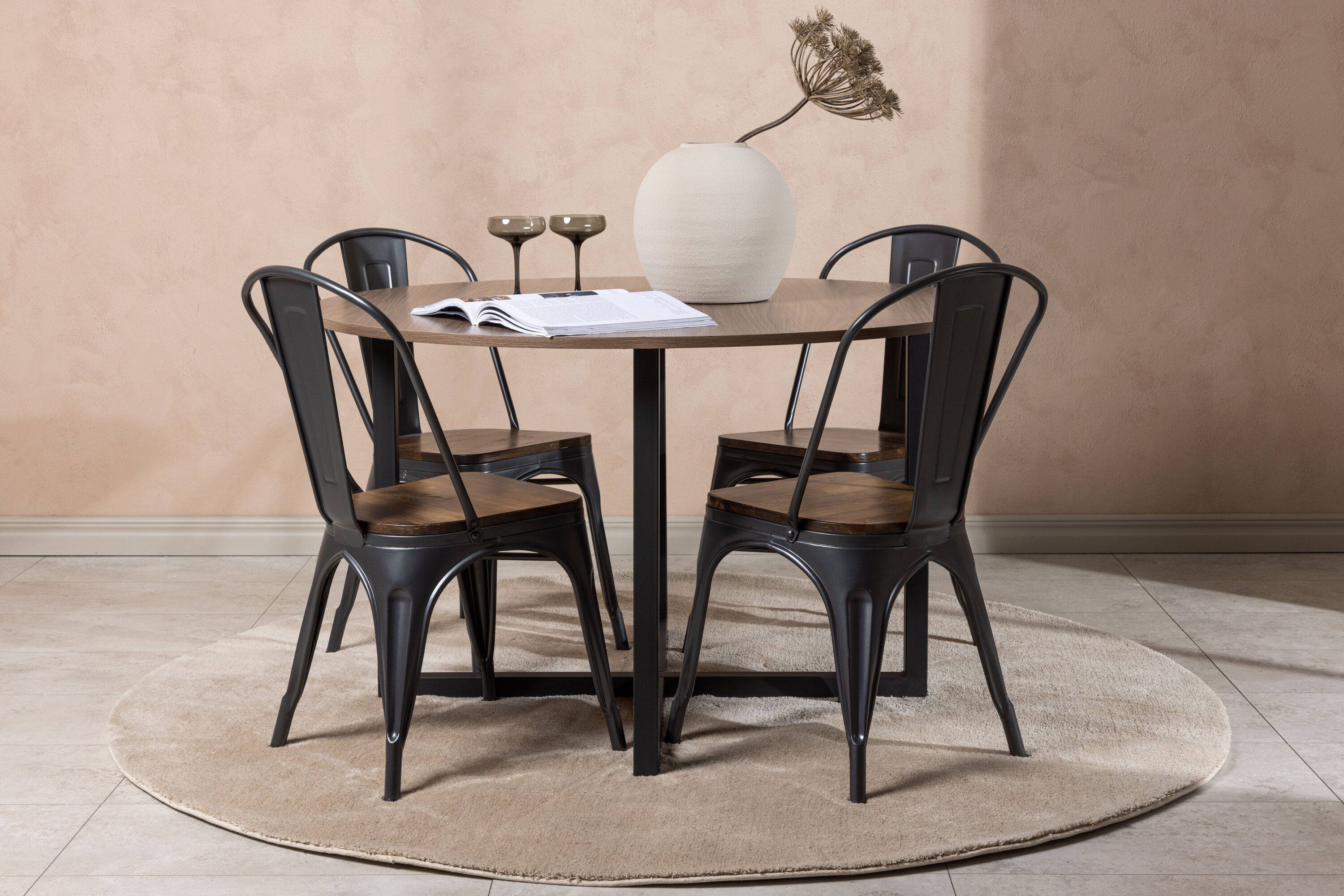 Eine trendfeste Essgruppe mit weichen Formen. Unser runder Durango Esstisch hat eine walnussfarbene Tischplatte aus MDF und gerade Tischbeine aus schwarzem Stahl, die sich zu einem Kreuz auf dem Boden sammeln. Hier im stylischen Match mit trendigen Stühlen aus der Tempe-Serie. Der Stuhl hat ein klassisches Design eines rustikalen Stuhls mit leicht ausgestellten Beinen aus dunkelgrauem Stahl und einem Sitz aus dunklem Holz. Es ist stilvoll und luxuriös! Tischmaße: 120cm.