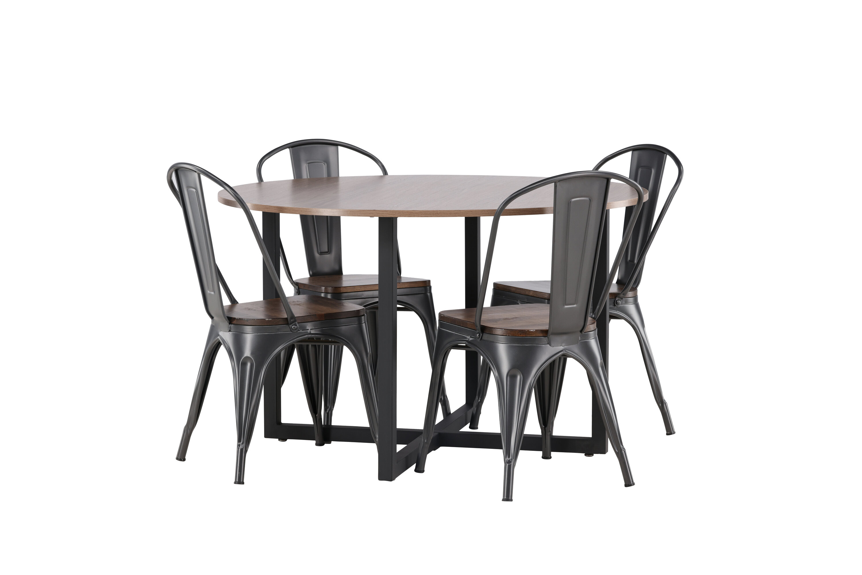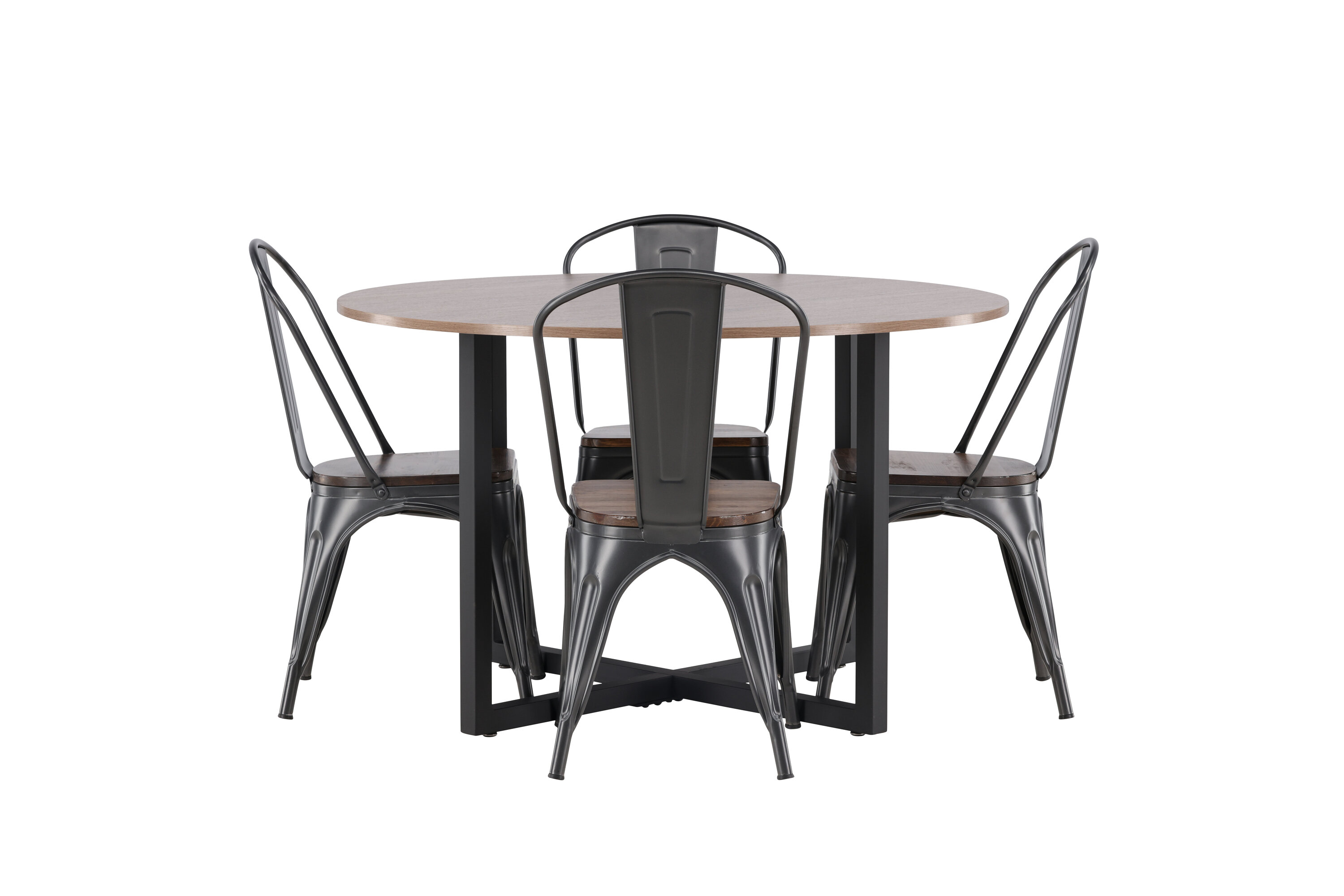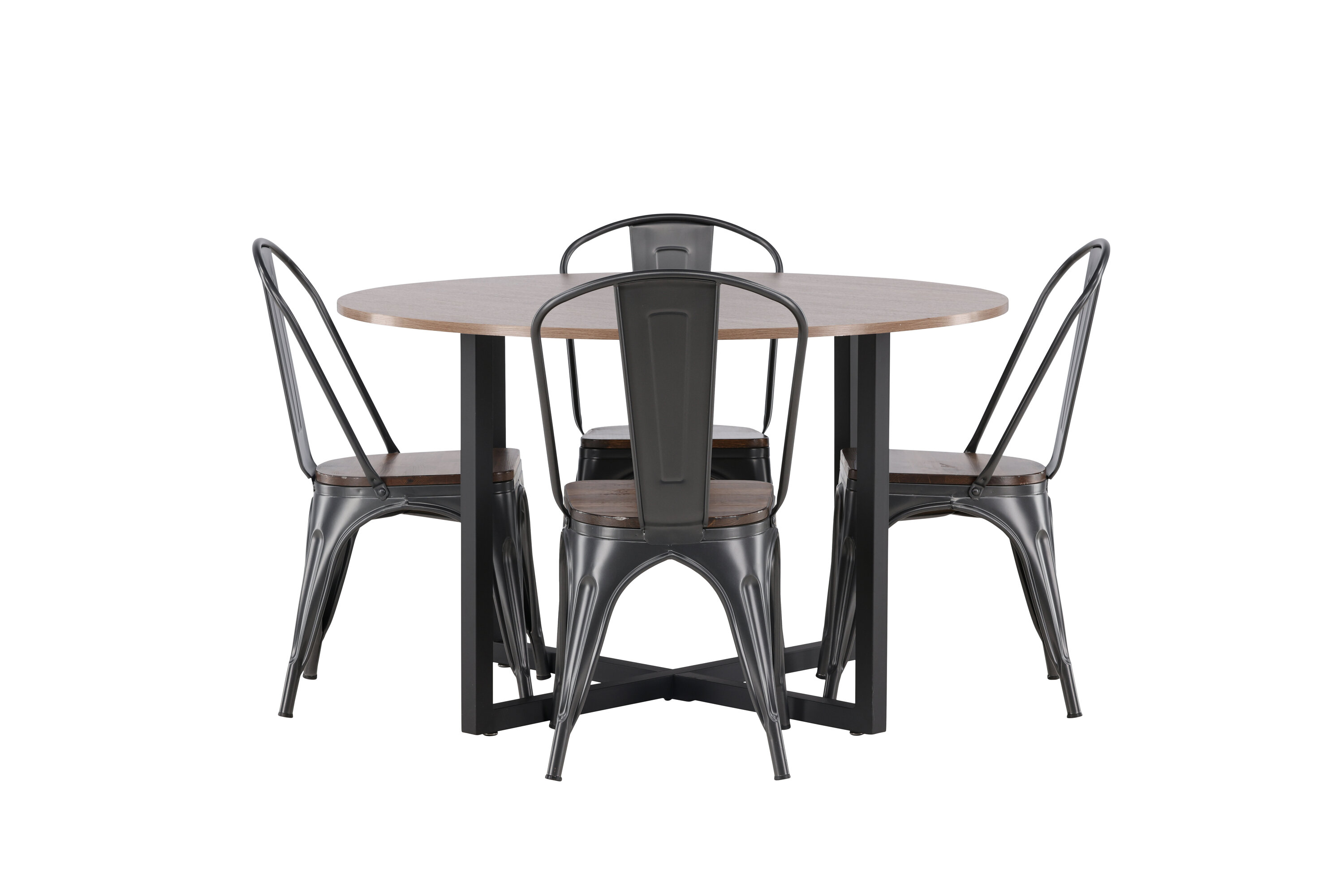 Eine trendfeste Essgruppe mit weichen Formen. Unser runder Durango Esstisch hat eine walnussfarbene Tischplatte aus MDF und gerade Tischbeine aus schwarzem Stahl, die sich zu einem Kreuz auf dem Boden sammeln. Hier im stylischen Match mit trendigen Stühlen aus der Tempe-Serie. Der Stuhl hat ein klassisches Design eines rustikalen Stuhls mit leicht ausgestellten Beinen aus dunkelgrauem Stahl und einem Sitz aus dunklem Holz. Es ist stilvoll und luxuriös! Tischmaße: 120cm.
