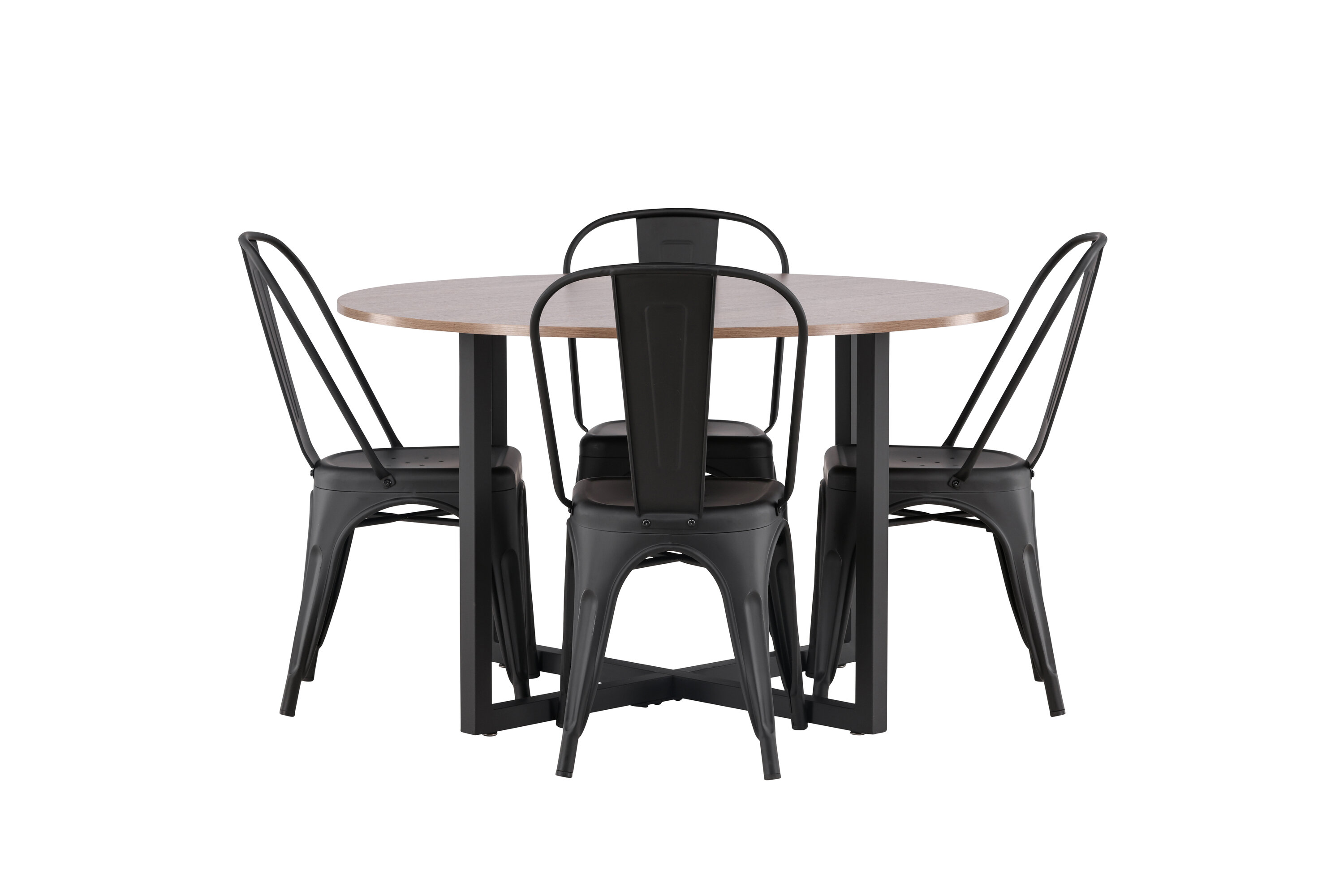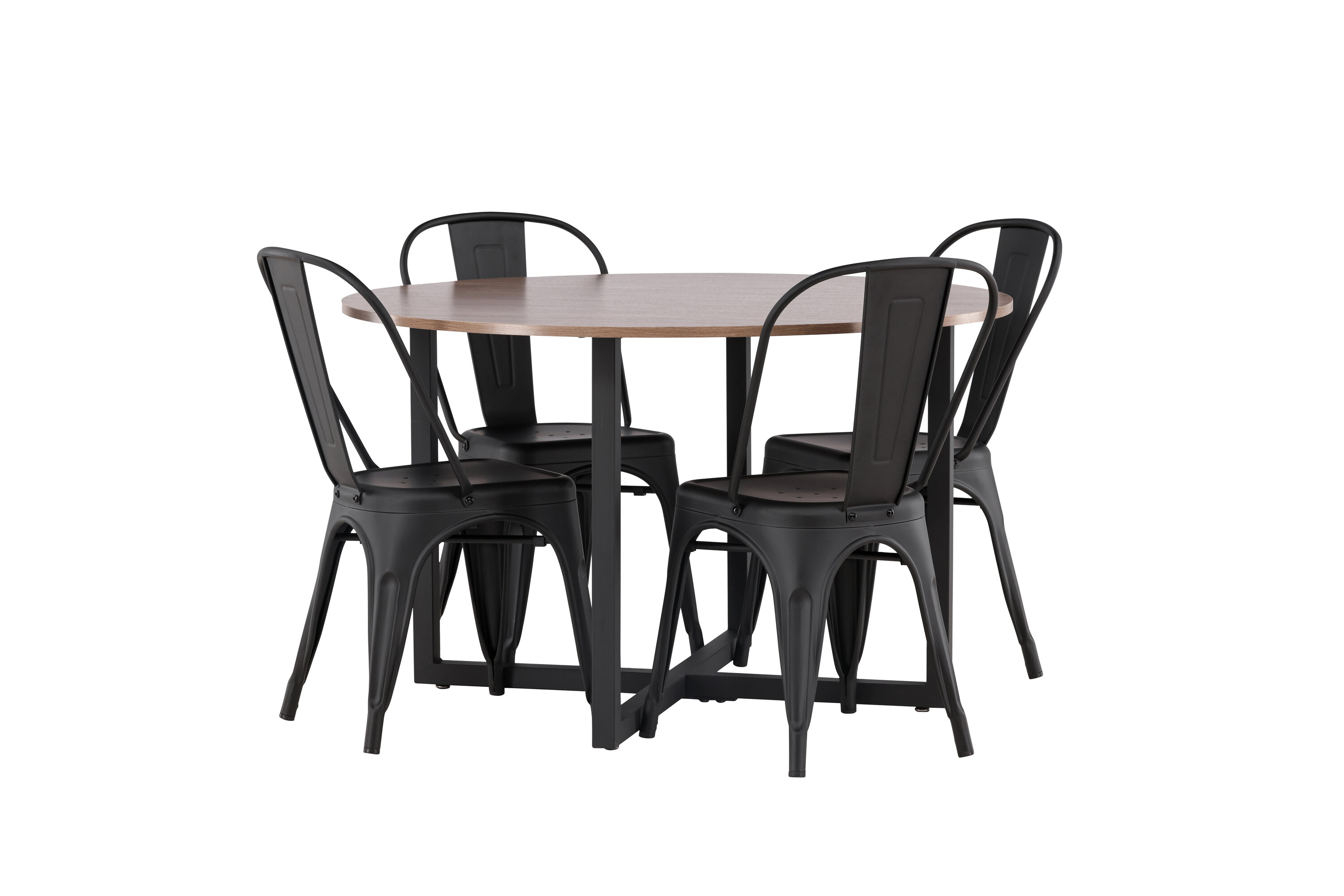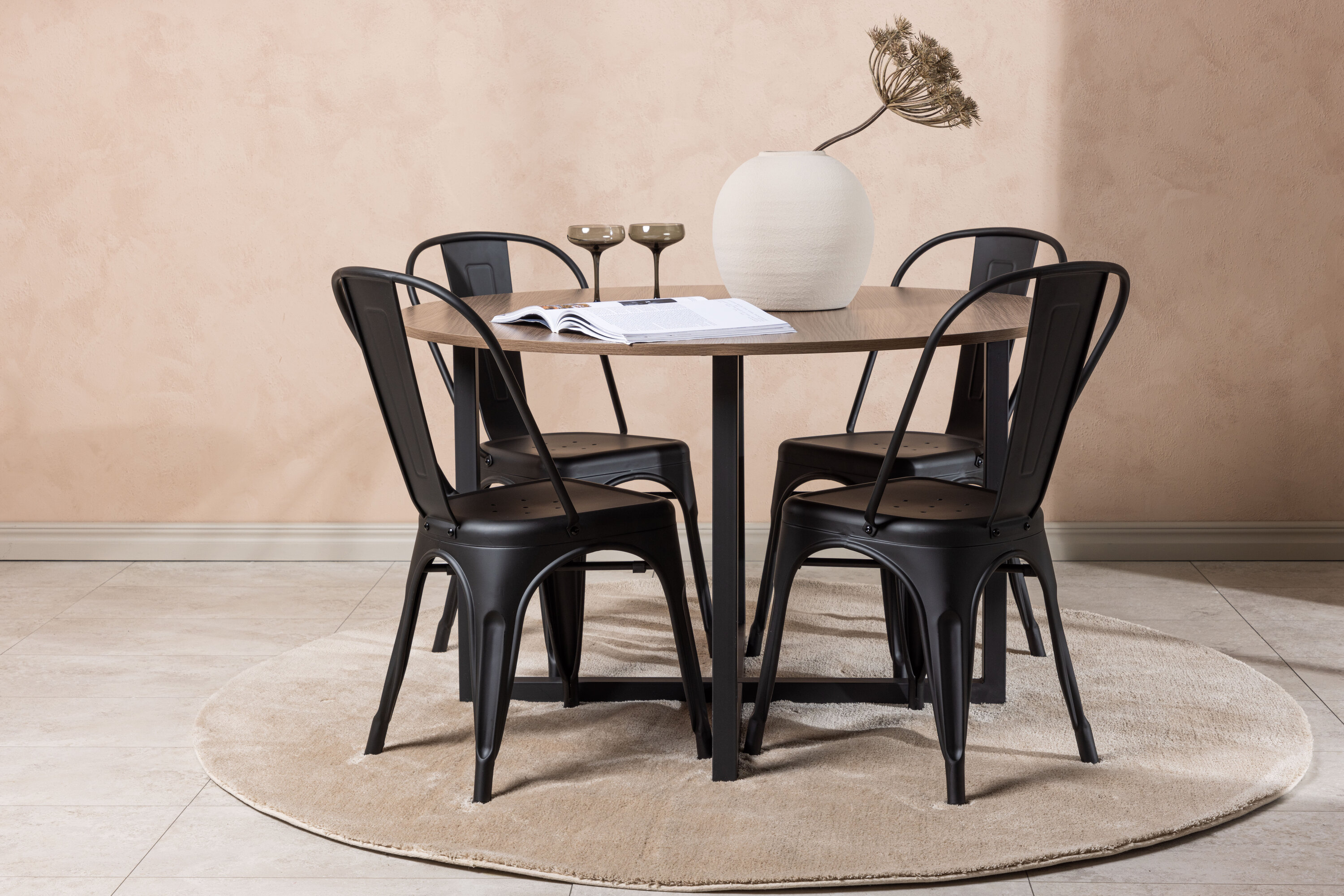 Kombinieren Sie erdige Farben mit trendigen Formen! Unser runder Durango Esstisch hat eine walnussfarbene Tischplatte aus MDF und gerade Tischbeine aus schwarzem Stahl, die sich zu einem Kreuz auf dem Boden sammeln. Hier zusammen mit unseren schwarzen Esszimmerstühlen aus der Serie Tempe. Der Stuhl mit leicht ausgestellten Beinen, die sanft auf Sitz und Rückenlehne treffen, in einem stilvollen Design, das durchweg aus schwarzem Metall gefertigt ist. Das Herz des Hauses einladend einrichten! Tischmaße: 120cm.