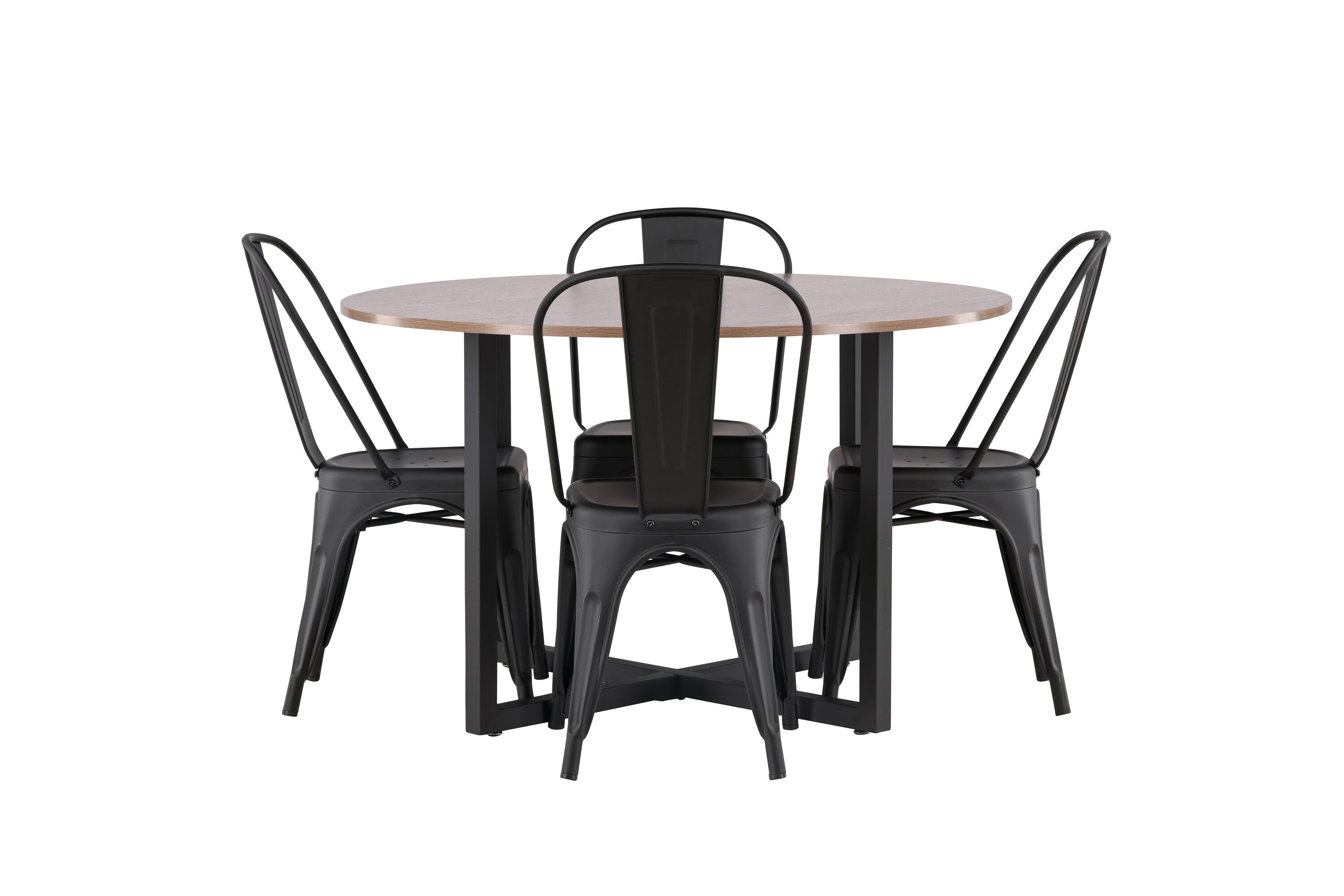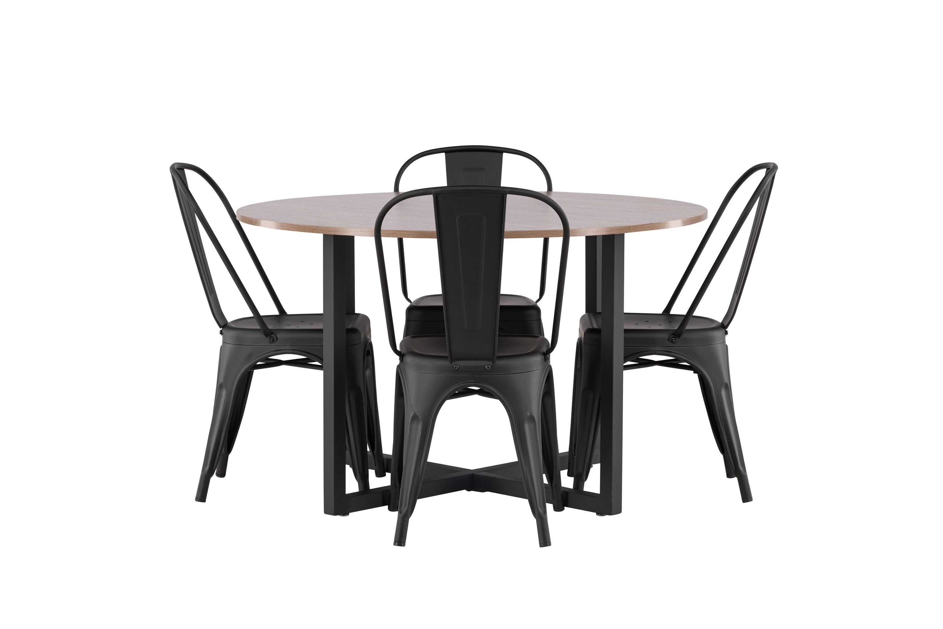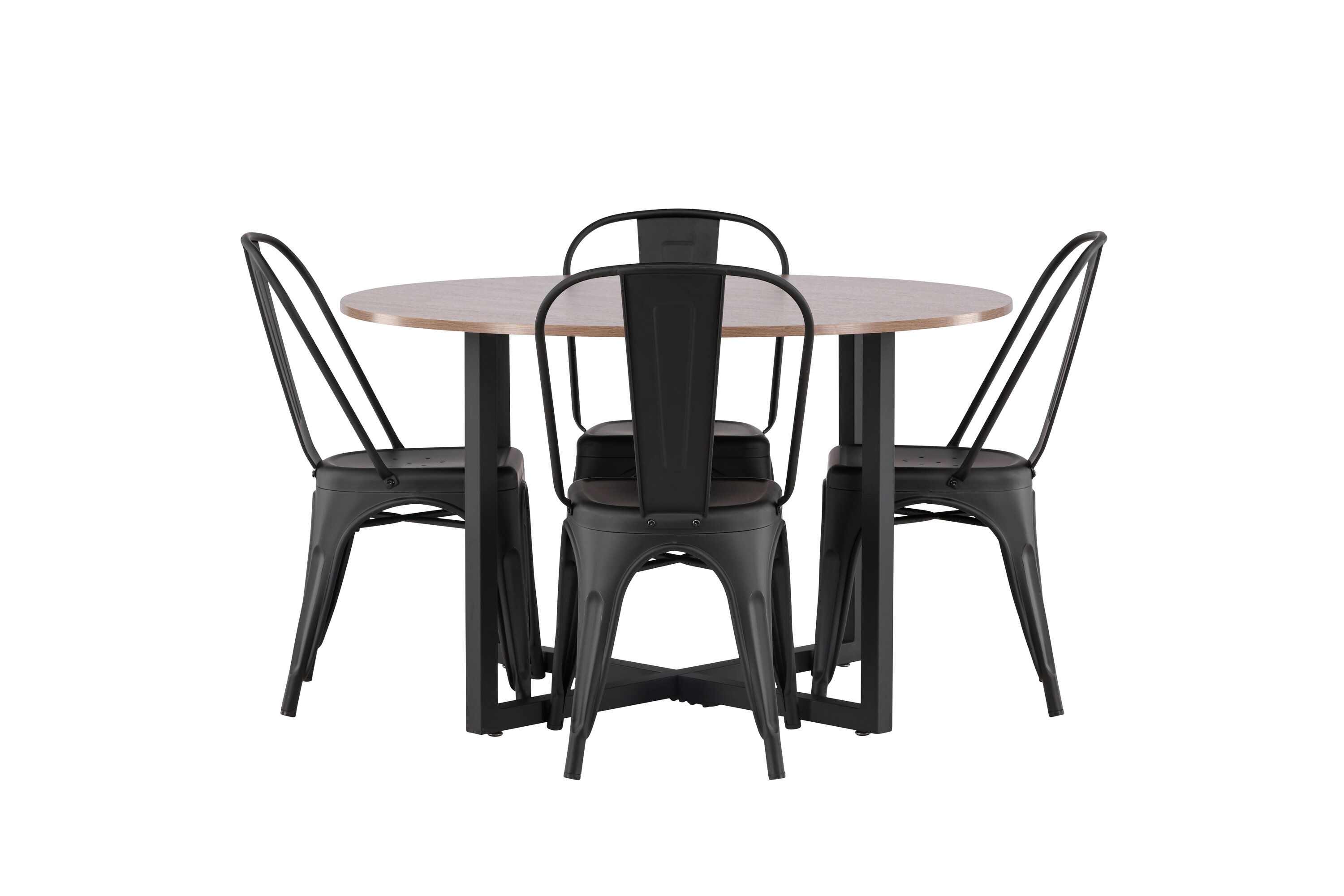 Kombinieren Sie erdige Farben mit trendigen Formen! Unser runder Durango Esstisch hat eine walnussfarbene Tischplatte aus MDF und gerade Tischbeine aus schwarzem Stahl, die sich zu einem Kreuz auf dem Boden sammeln. Hier zusammen mit unseren schwarzen Esszimmerstühlen aus der Serie Tempe. Der Stuhl mit leicht ausgestellten Beinen, die sanft auf Sitz und Rückenlehne treffen, in einem stilvollen Design, das durchweg aus schwarzem Metall gefertigt ist. Das Herz des Hauses einladend einrichten! Tischmaße: 120cm.