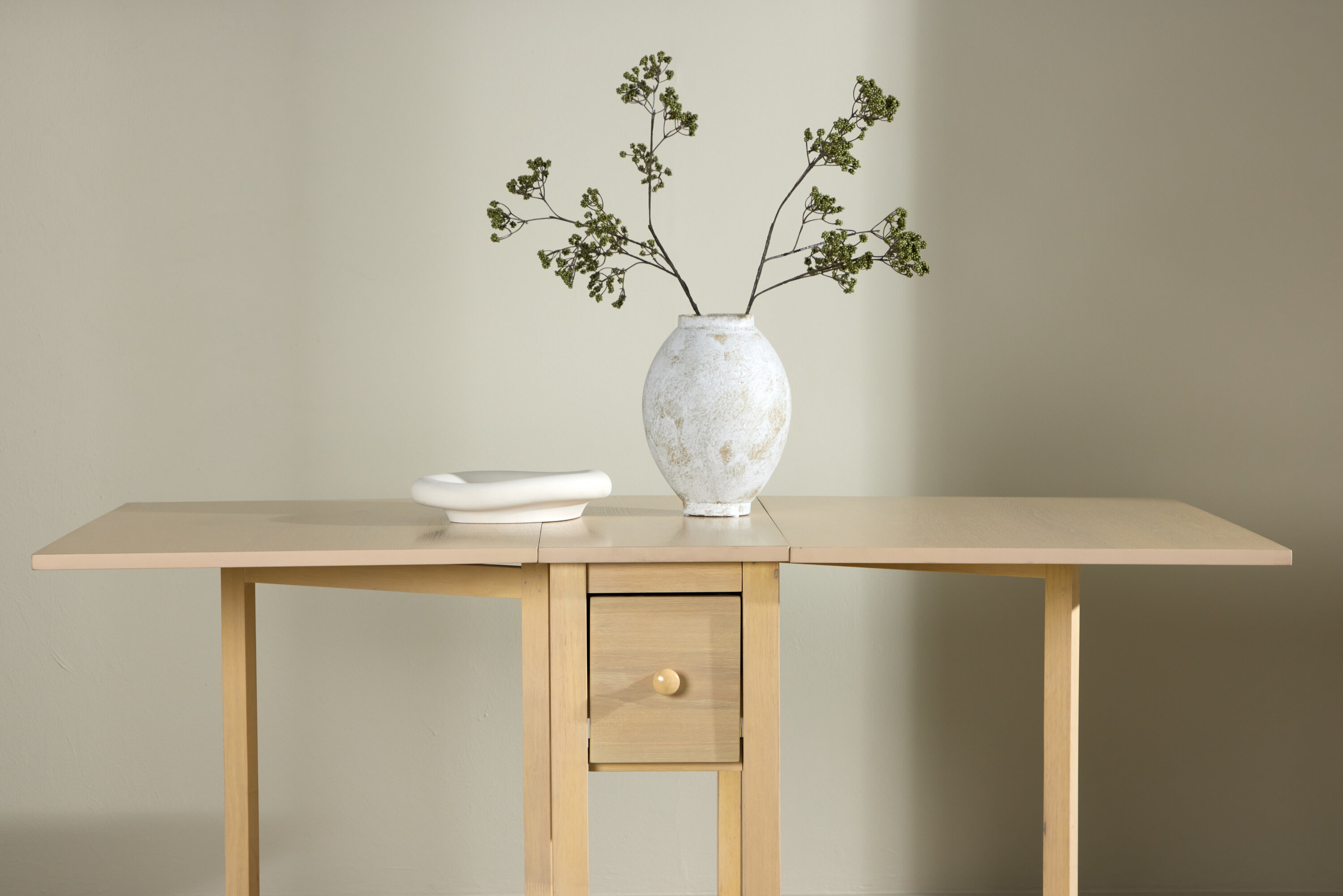 Der Edward Esstisch ist die perfekte Kombination aus Stil und Funktionalität, die sowohl für kleine als auch für große Räume geeignet ist. Mit einem eleganten weiß getünchten Finish und den Maßen von 80x110 cm bietet Edward eine kompakte und stilvolle Lösung für Ihr Esszimmer oder Ihre Küche, und wenn Sie zusätzlichen Platz benötigen, kann der Tisch leicht um 40 cm verlängert werden.