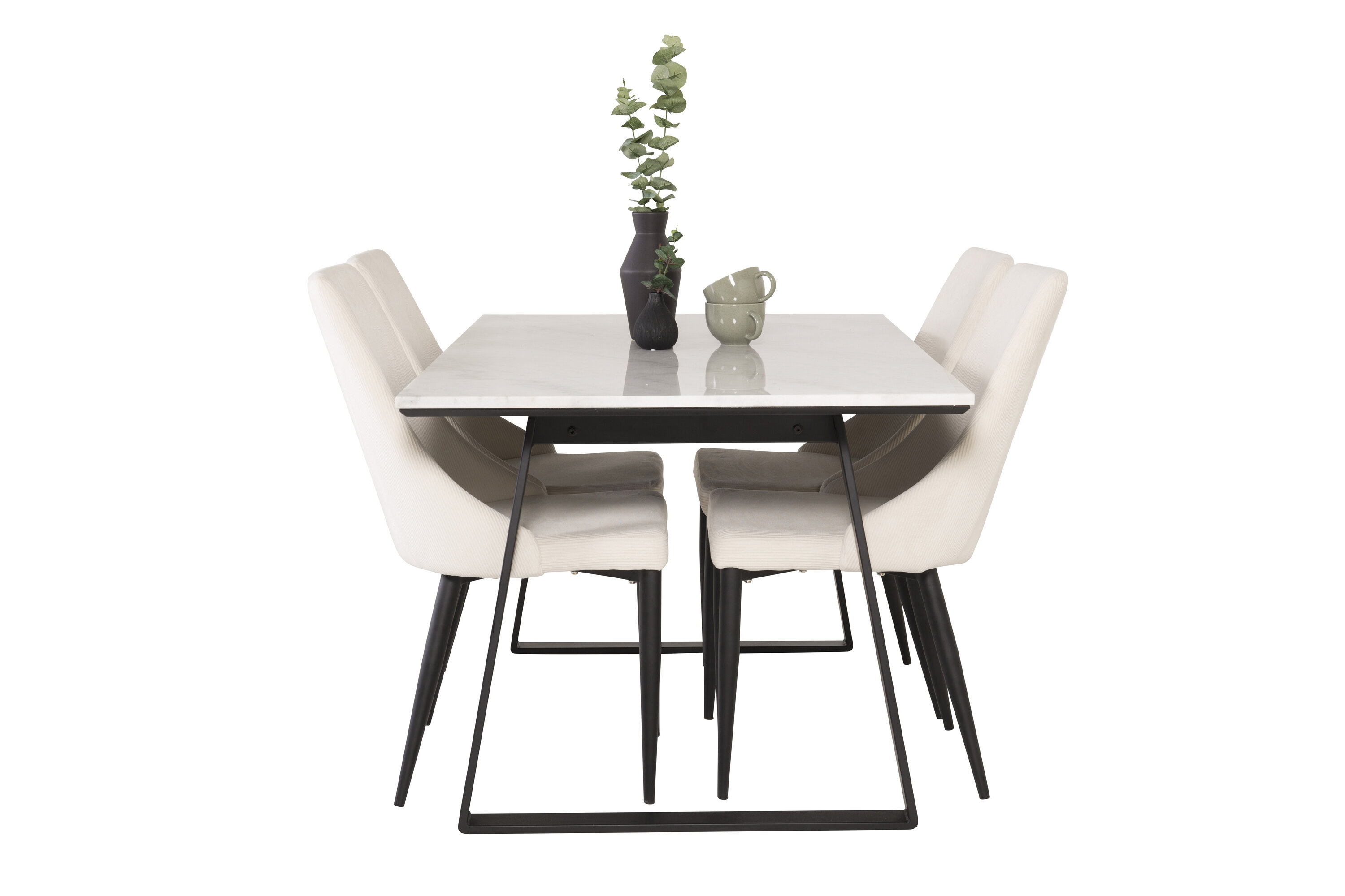 Eine Lebensmittelgruppe in modernem und stilvollem Design. Esstisch Estelle und Esszimmerstühle Leone sind eine perfekte Kombination für das Herz des Hauses, die wahrscheinlich genauso gut zu Ihren Bedürfnissen passt wie zu Ihrem anderen Interieur.