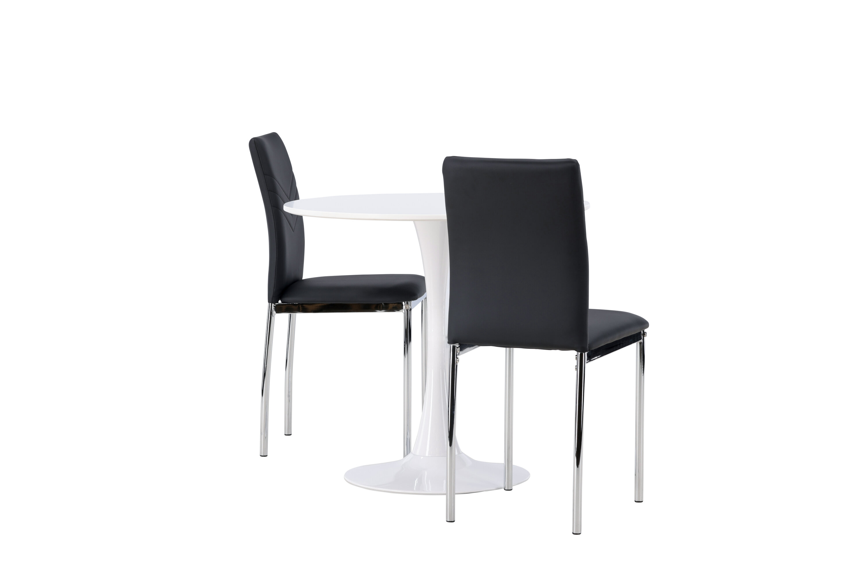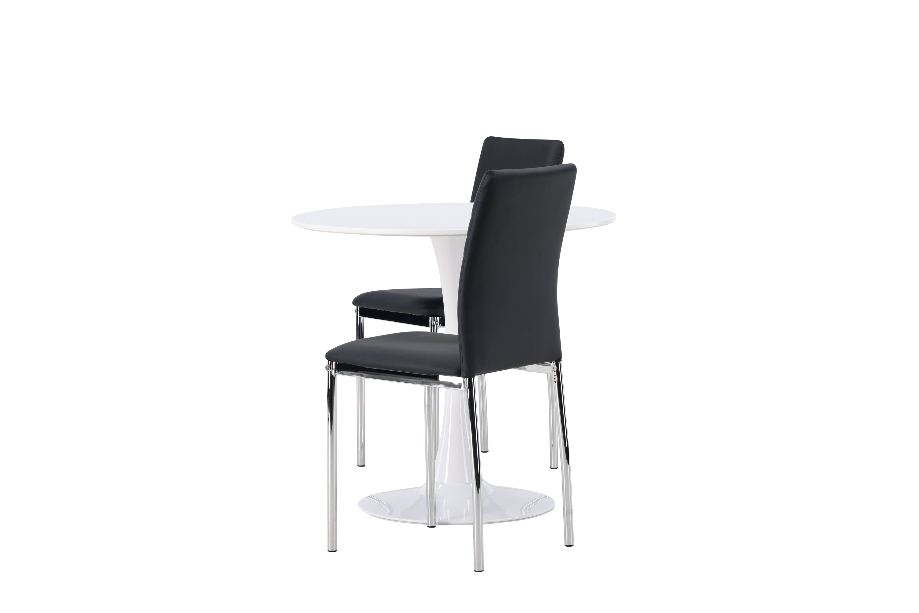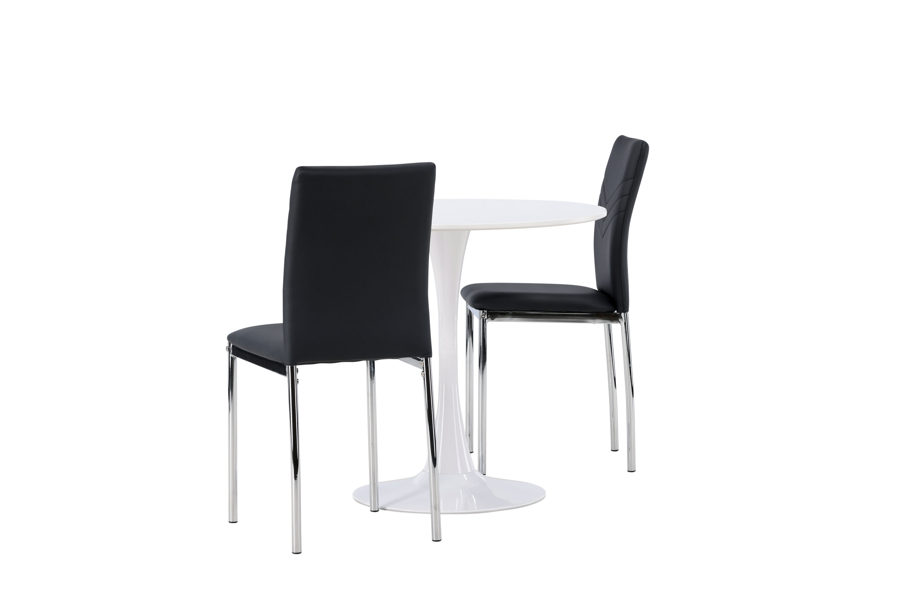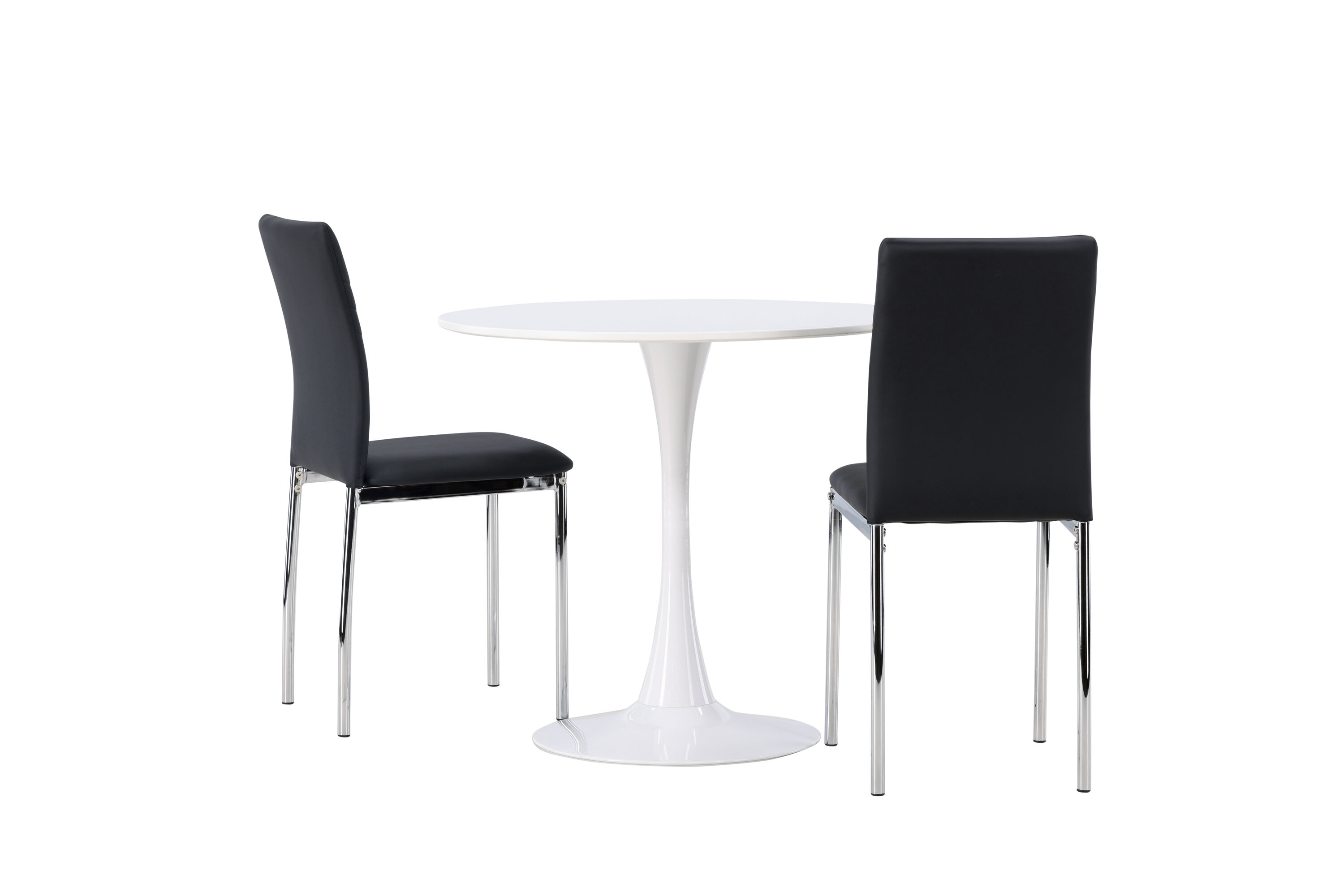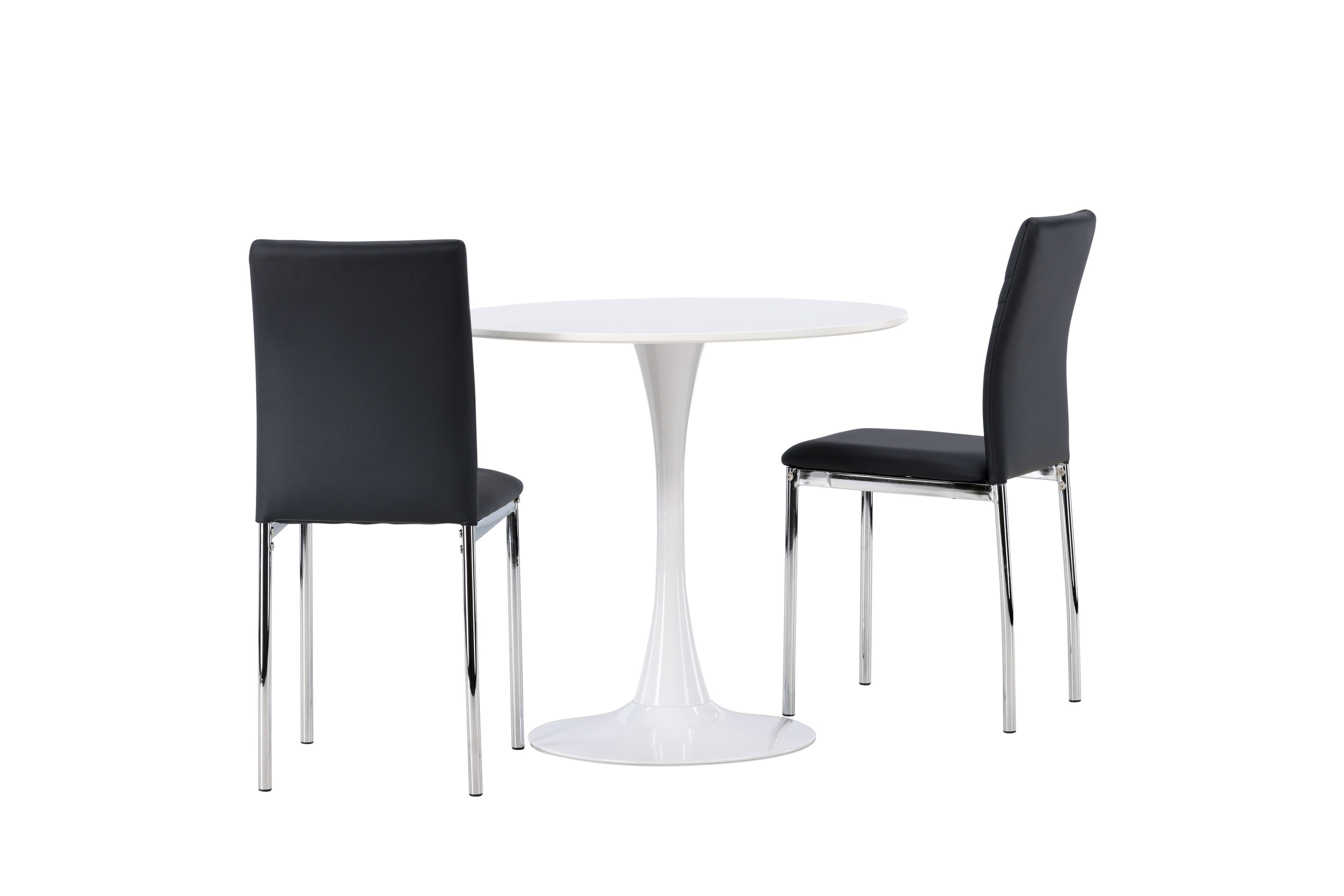 Diese Gruppe passt perfekt in die kleine Küche! Der runde Esstisch Hamden hat eine dünne Tischplatte aus weißem MDF und einen stilvollen Trompetenfuß aus weißem Stahl. Hier zusammen mit dekorativen, schwarzen Esszimmerstühlen aus der Lily-Serie. Der Stuhl ist komplett mit schwarzem Kunstleder bezogen und die Rückseite ist mit dekorativen Nähten versehen, die zu einem stilvollen Detail werden. Die Stuhlbeine sind aus verchromtem Stahl und verleihen dem Hingucker einen stilvollen Industrie-Look. Erstelle ein charmantes Herzstück in deinem Zuhause! Tischdurchmesser: 60cm.