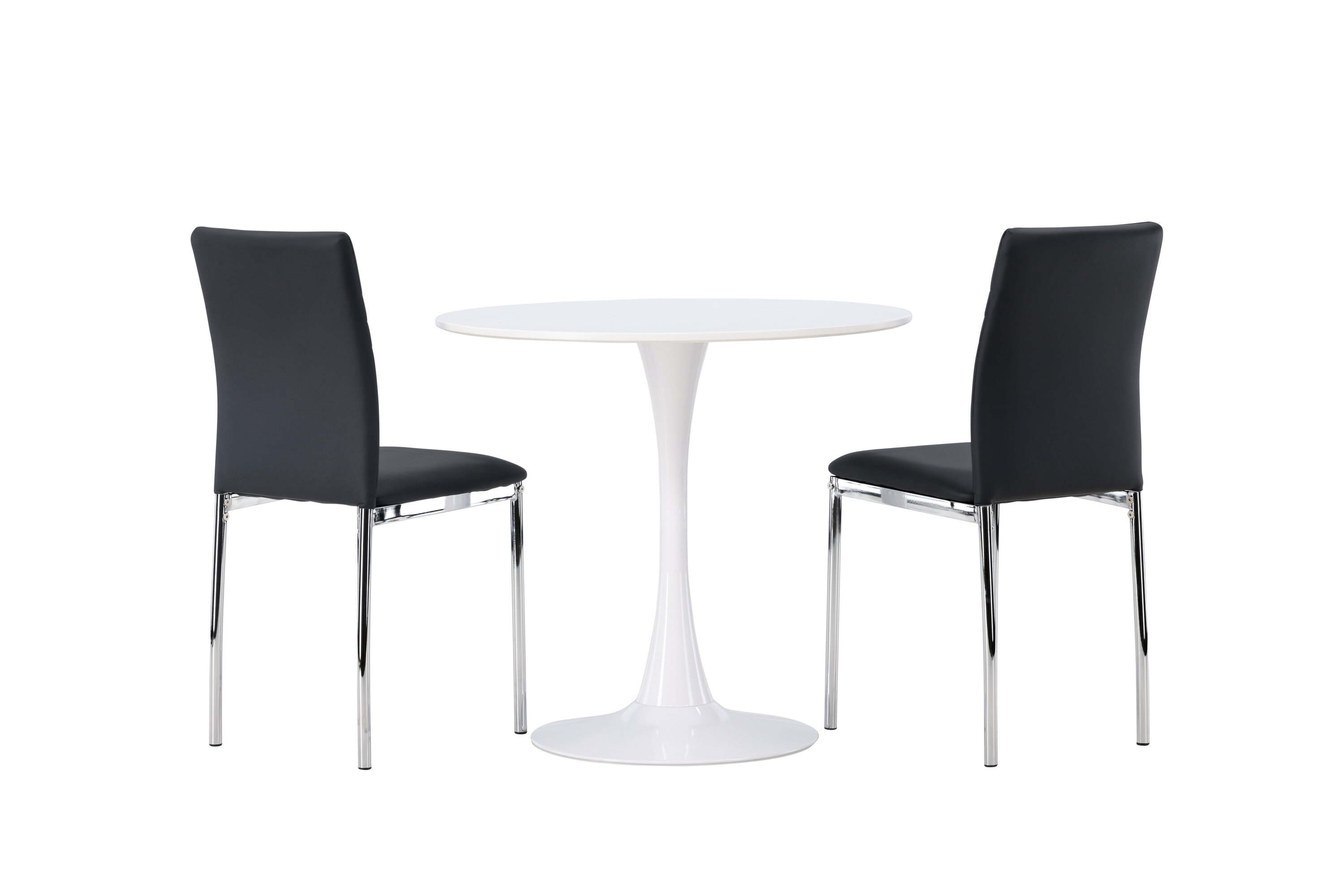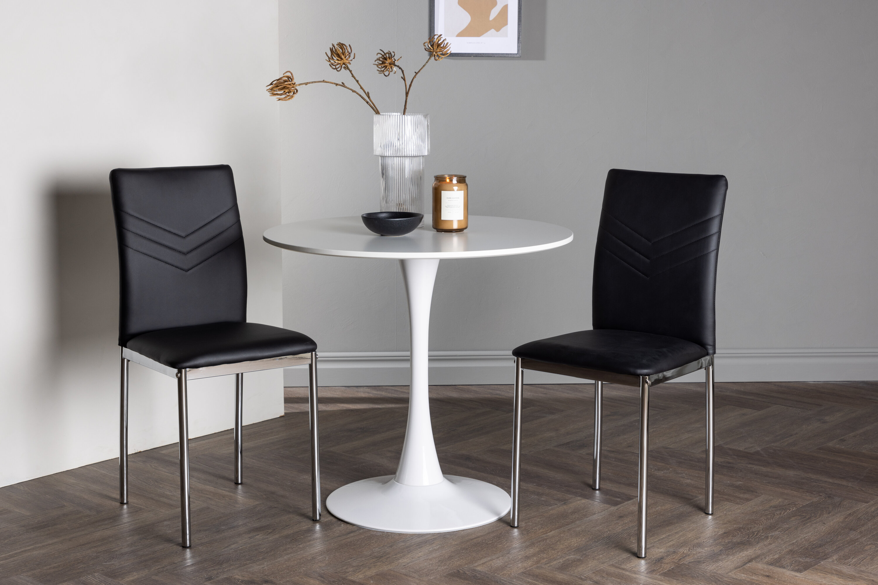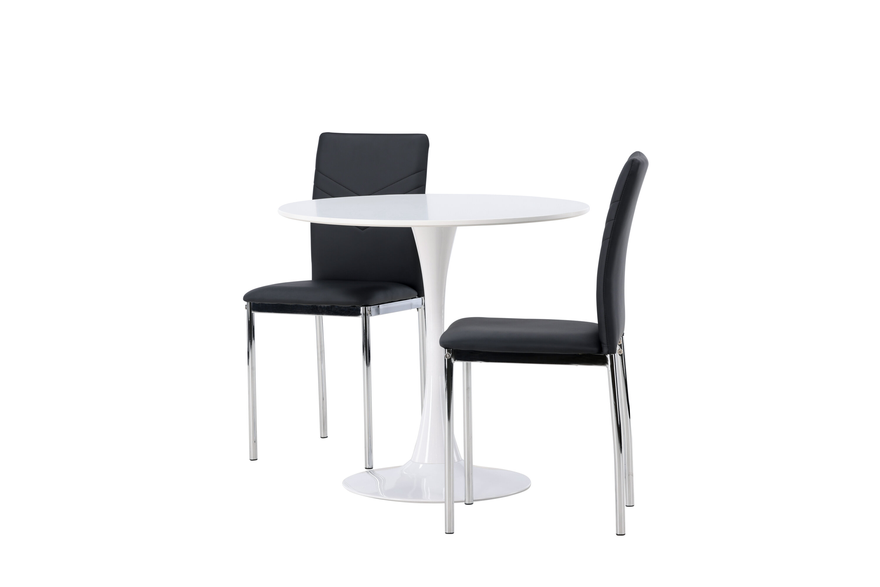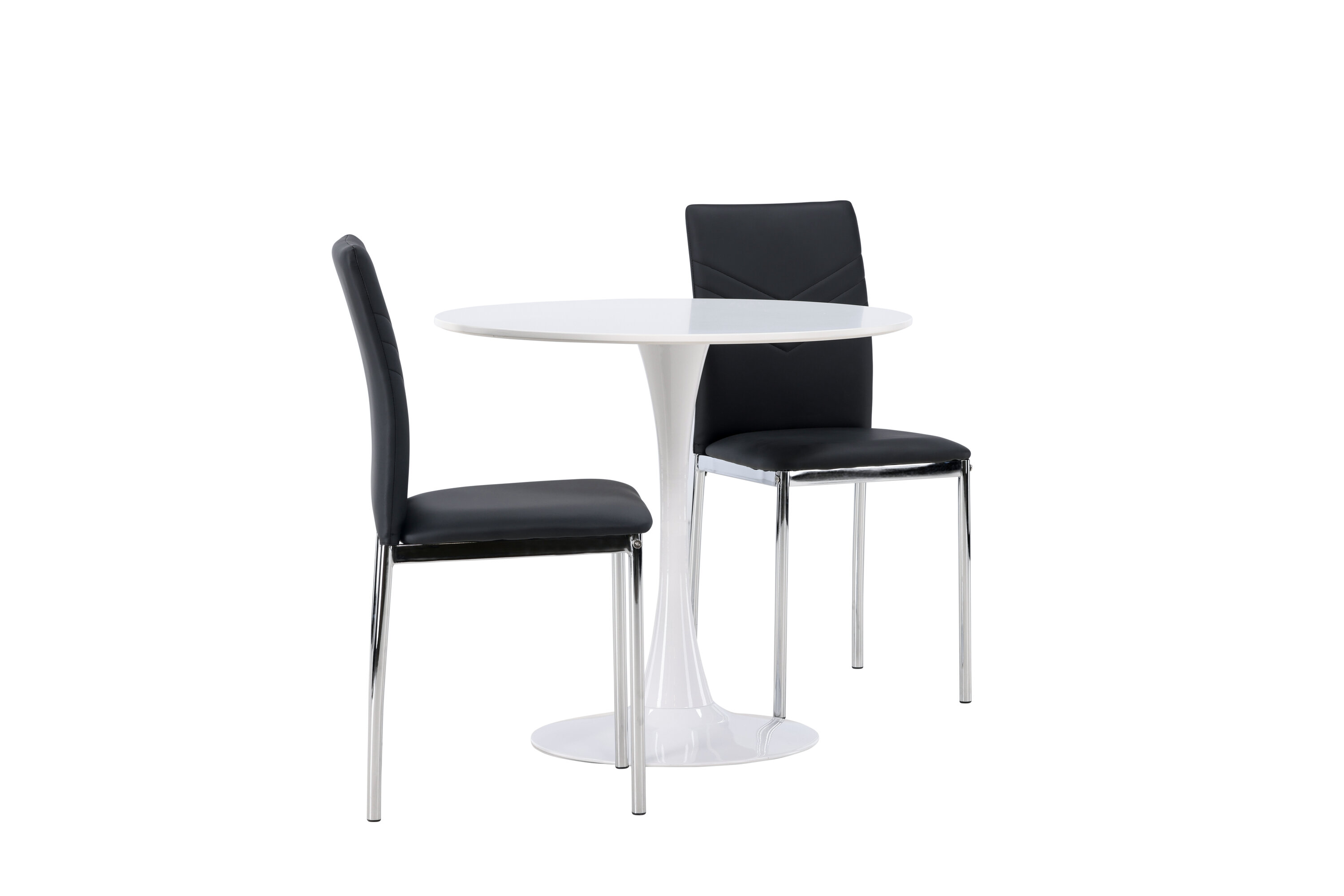 Diese Gruppe passt perfekt in die kleine Küche! Der runde Esstisch Hamden hat eine dünne Tischplatte aus weißem MDF und einen stilvollen Trompetenfuß aus weißem Stahl. Hier zusammen mit dekorativen, schwarzen Esszimmerstühlen aus der Lily-Serie. Der Stuhl ist komplett mit schwarzem Kunstleder bezogen und die Rückseite ist mit dekorativen Nähten versehen, die zu einem stilvollen Detail werden. Die Stuhlbeine sind aus verchromtem Stahl und verleihen dem Hingucker einen stilvollen Industrie-Look. Erstelle ein charmantes Herzstück in deinem Zuhause! Tischdurchmesser: 60cm.