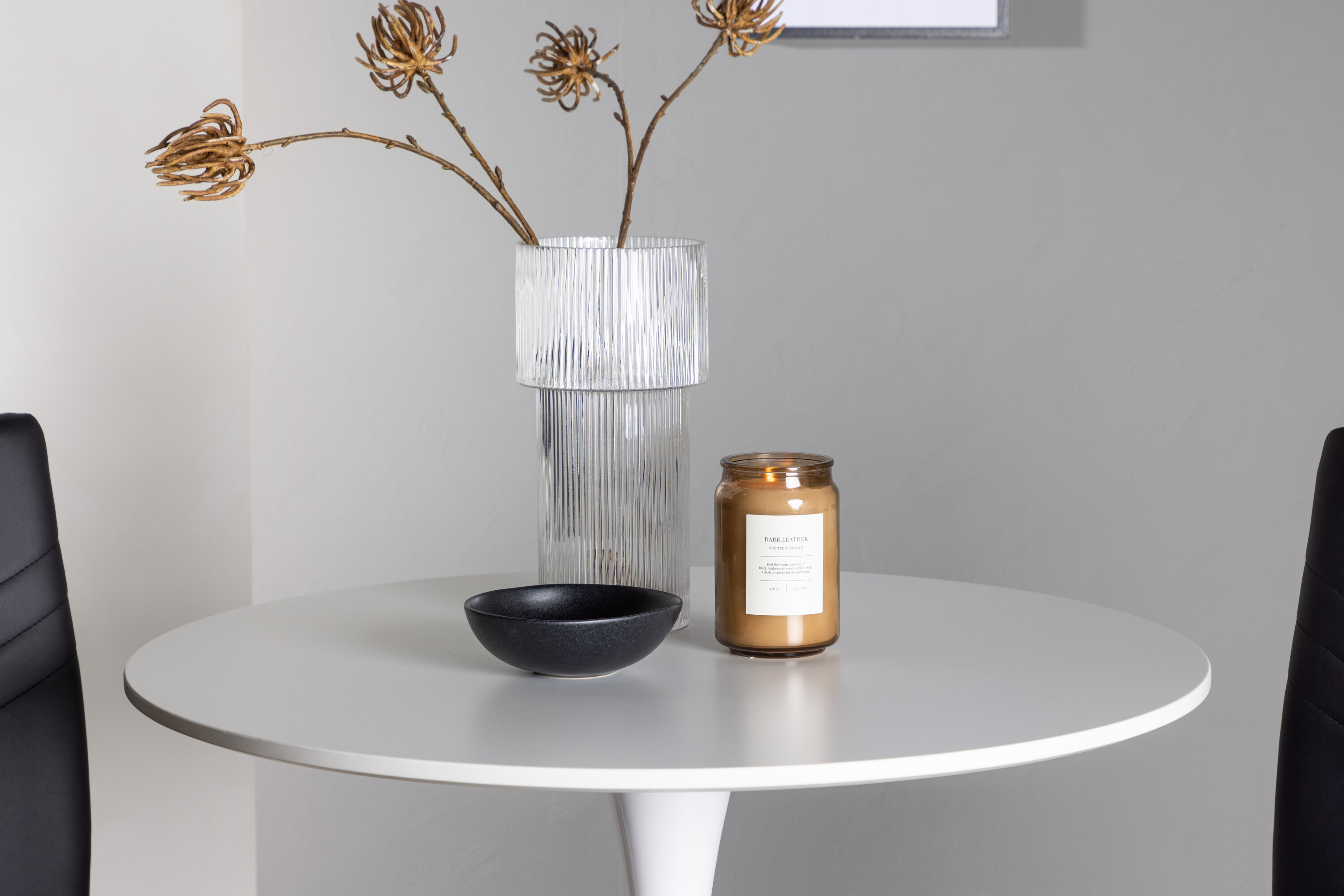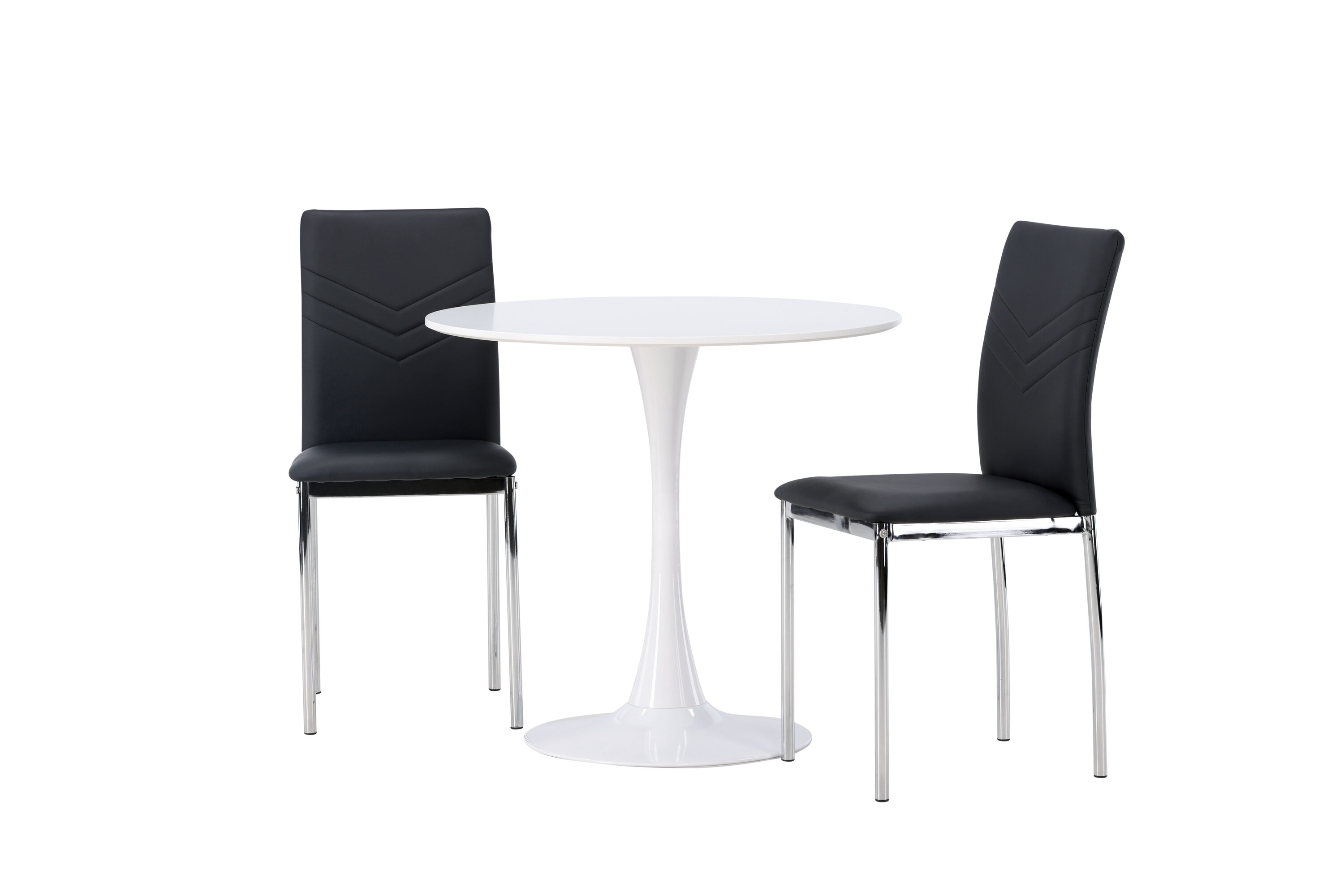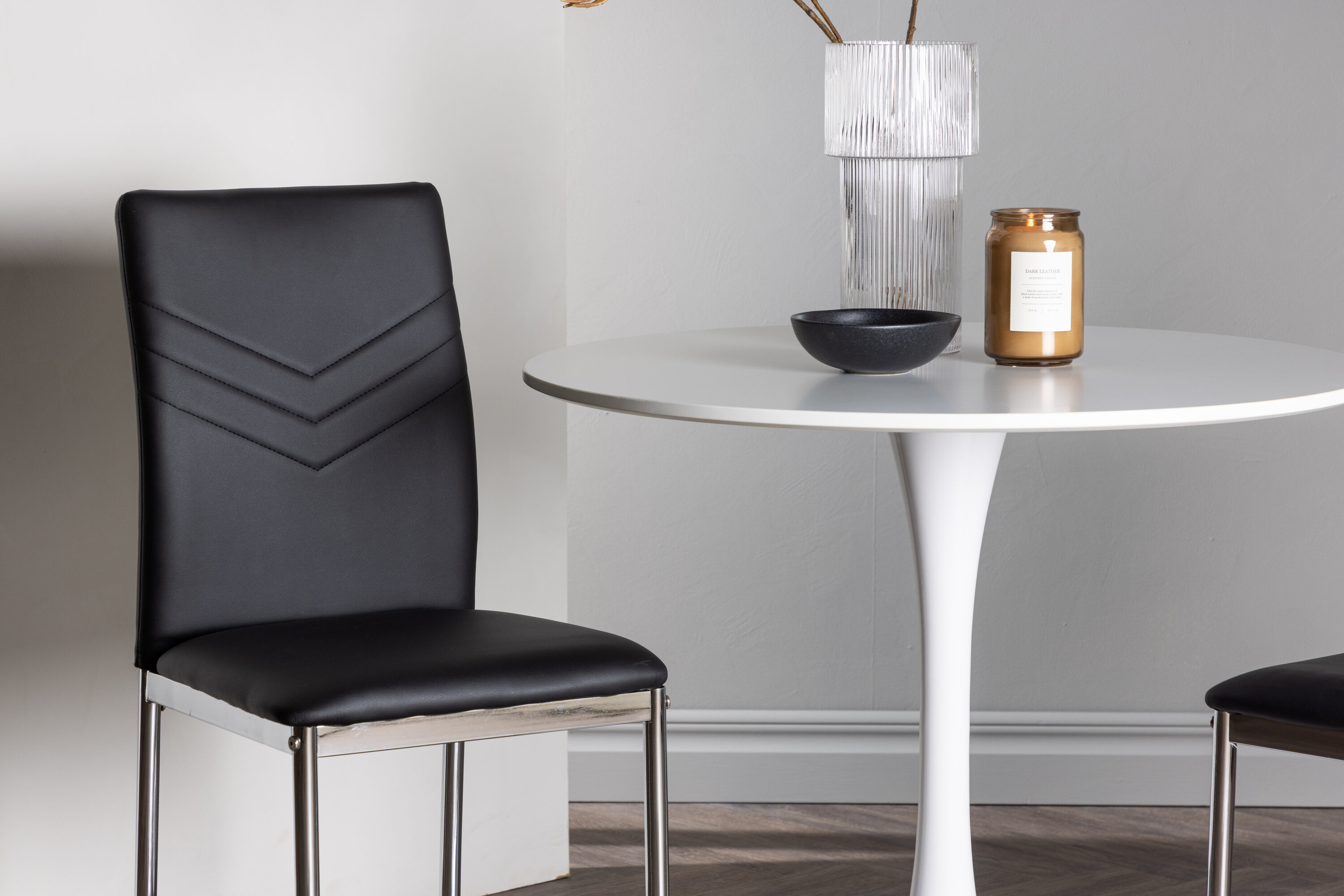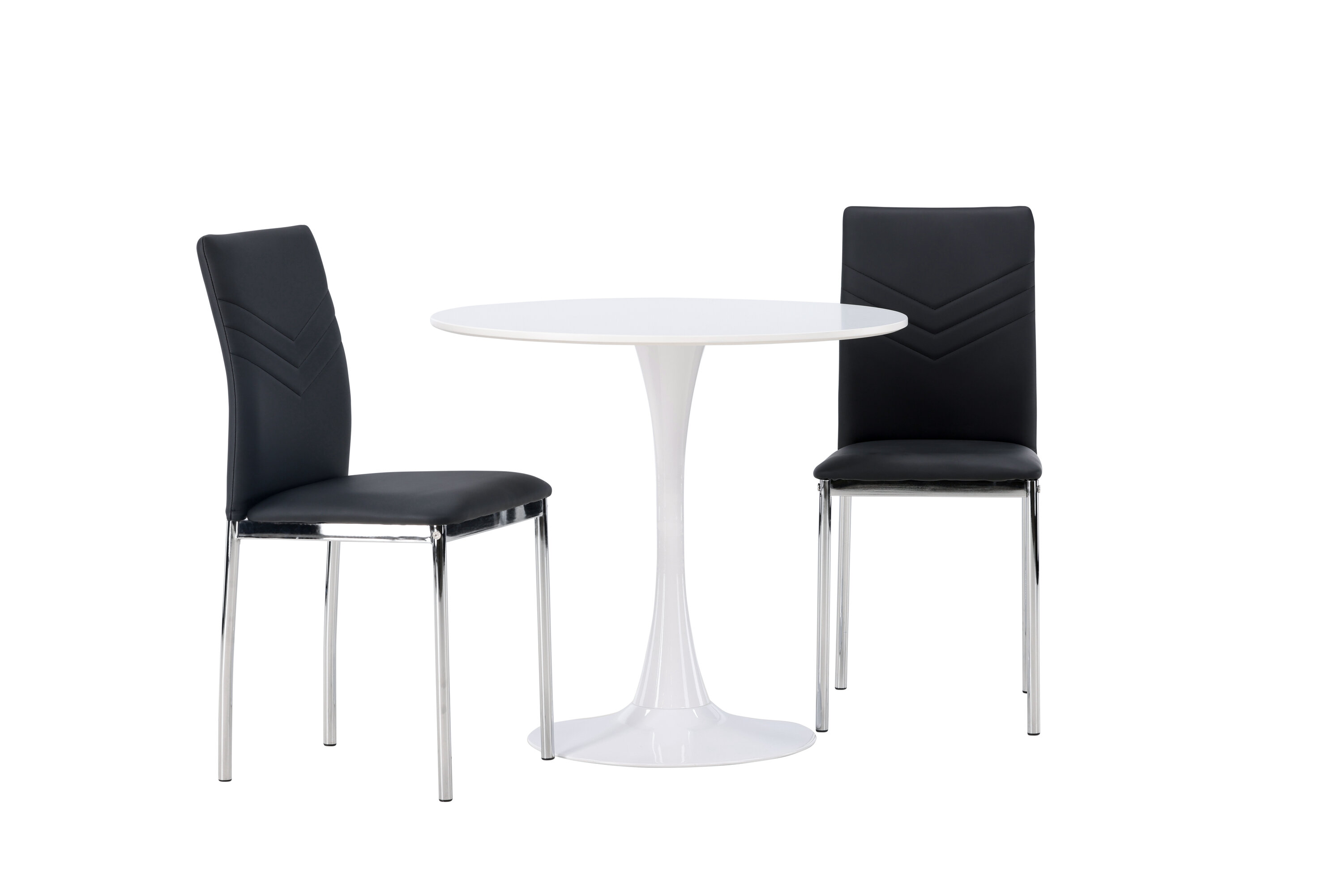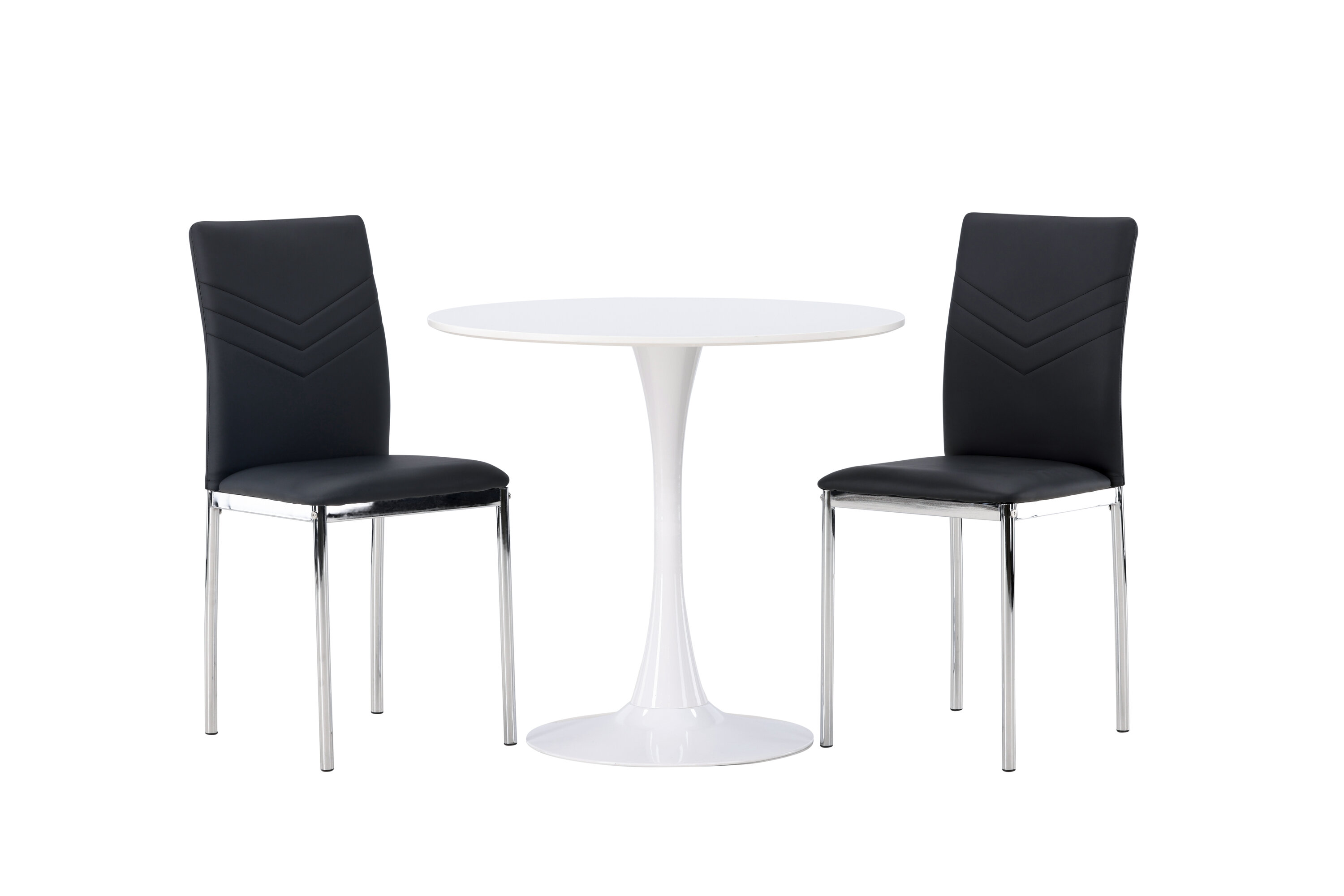 Diese Gruppe passt perfekt in die kleine Küche! Der runde Esstisch Hamden hat eine dünne Tischplatte aus weißem MDF und einen stilvollen Trompetenfuß aus weißem Stahl. Hier zusammen mit dekorativen, schwarzen Esszimmerstühlen aus der Lily-Serie. Der Stuhl ist komplett mit schwarzem Kunstleder bezogen und die Rückseite ist mit dekorativen Nähten versehen, die zu einem stilvollen Detail werden. Die Stuhlbeine sind aus verchromtem Stahl und verleihen dem Hingucker einen stilvollen Industrie-Look. Erstelle ein charmantes Herzstück in deinem Zuhause! Tischdurchmesser: 60cm.