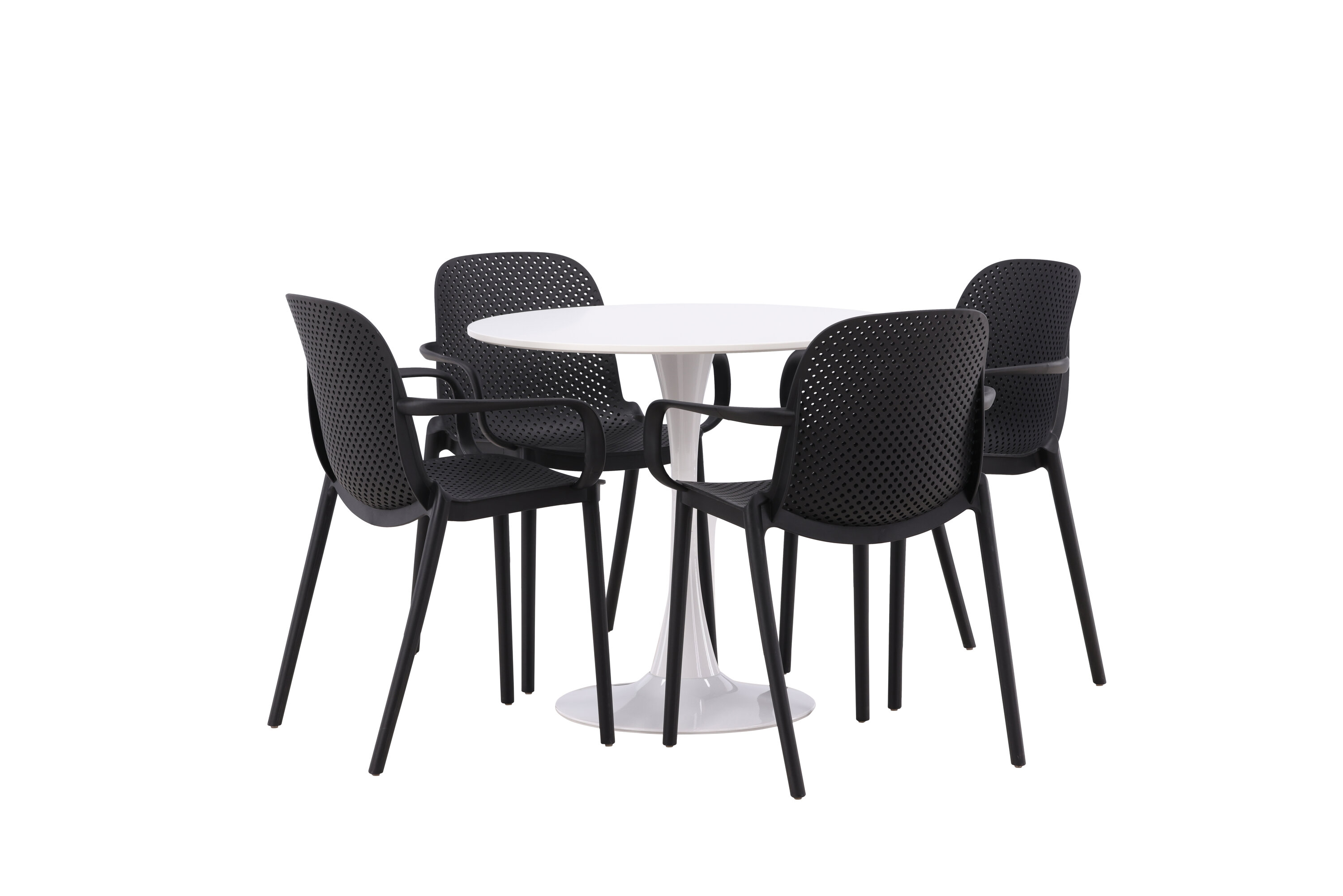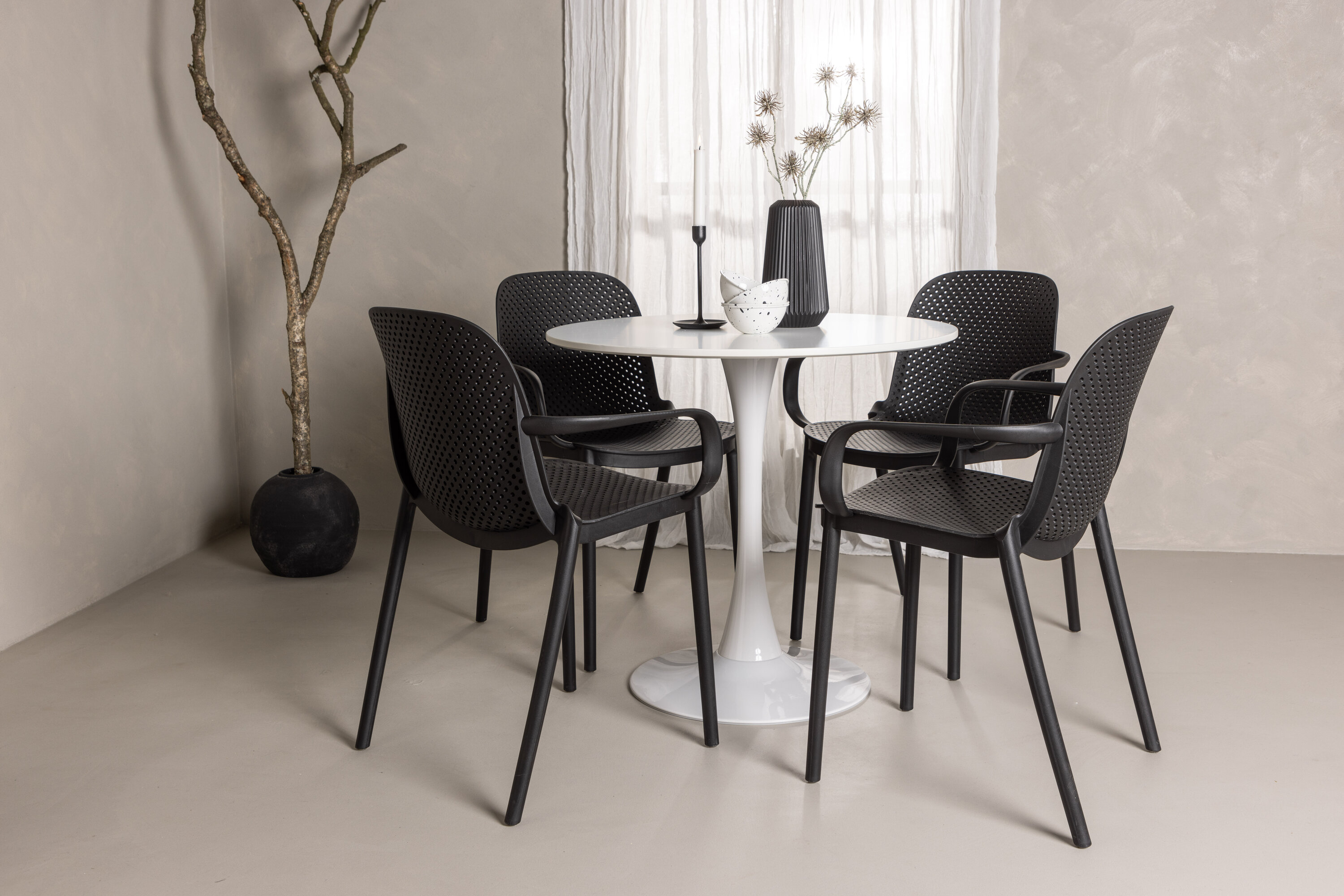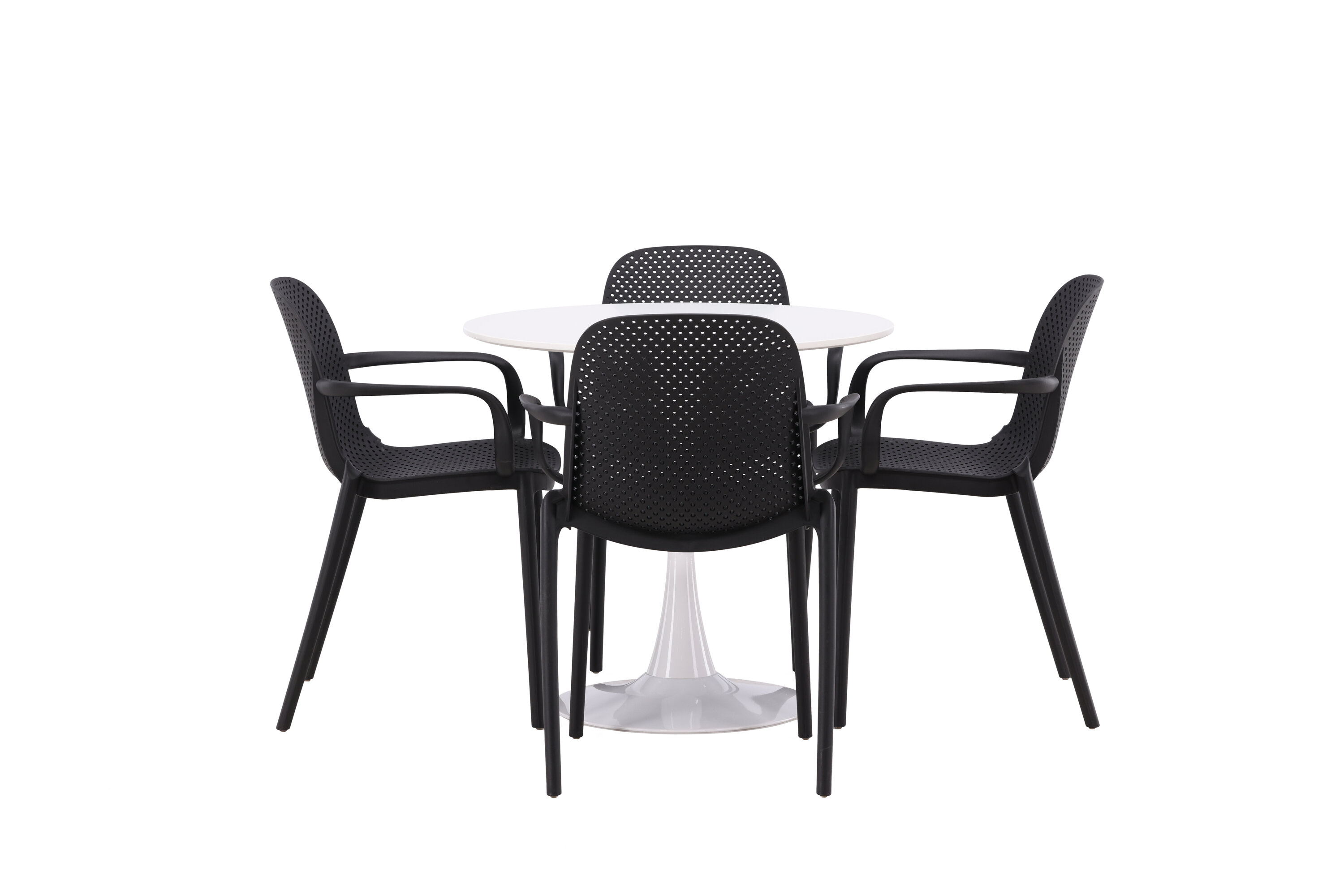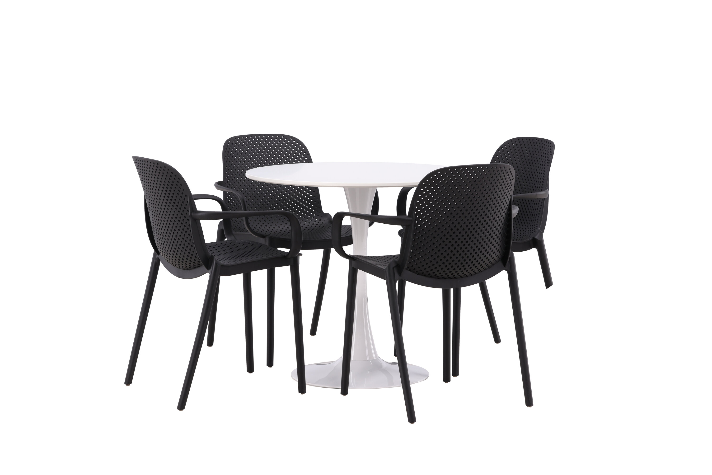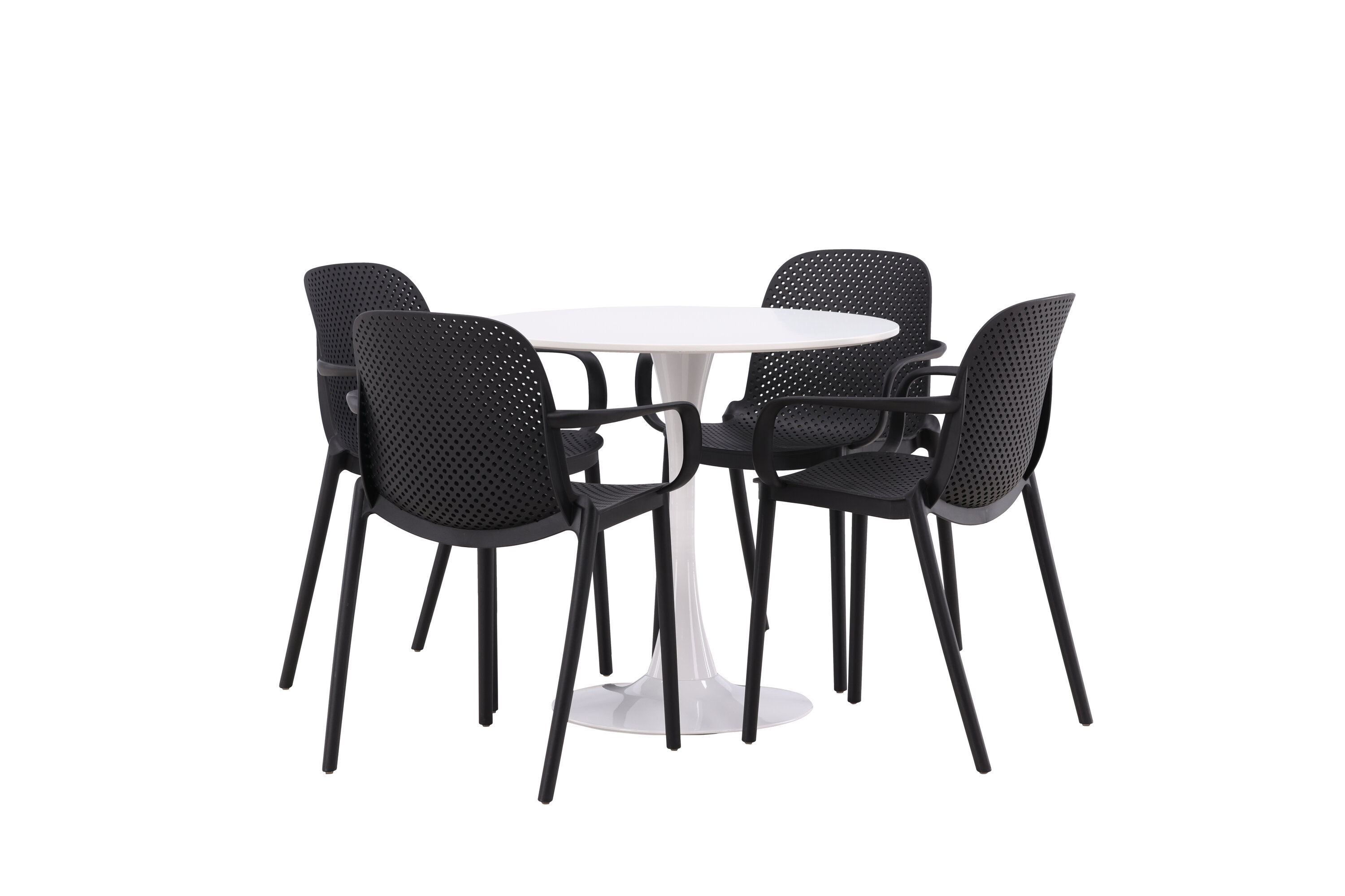 Der Hamden-Tisch hat eine Höhe von 75 cm und einen Durchmesser von 80 cm, was ihn kompakt und vielseitig macht. Die weiße Tischplatte sorgt für ein helles und frisches Gefühl, während die schwarzen Baltimore-Stühle einen starken Kontrast schaffen und dem Interieur einen modernen Touch verleihen.