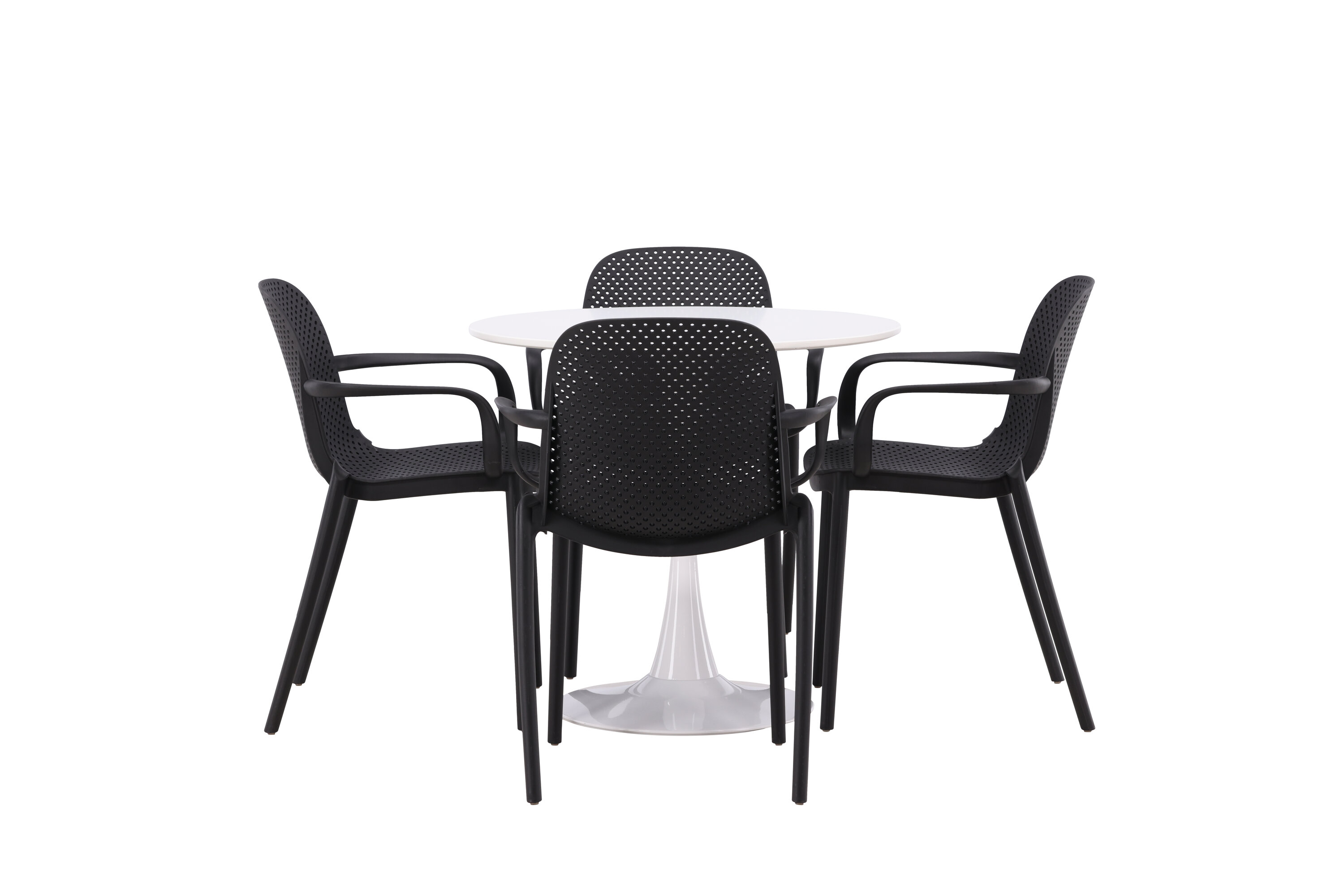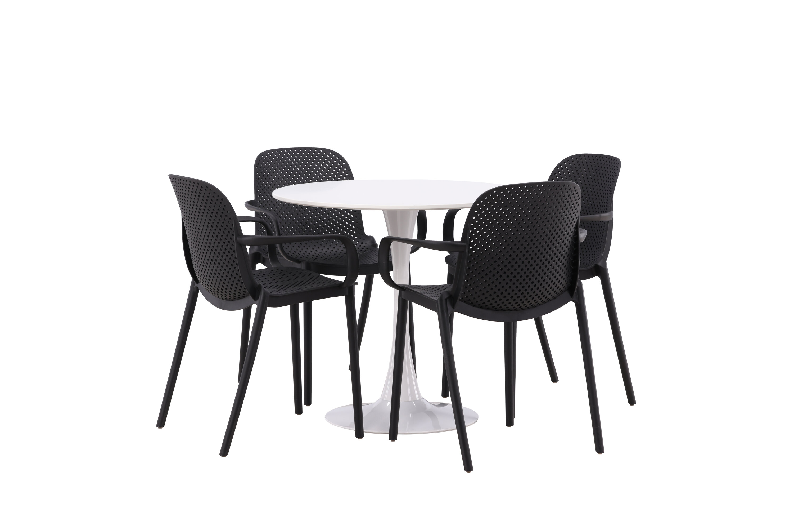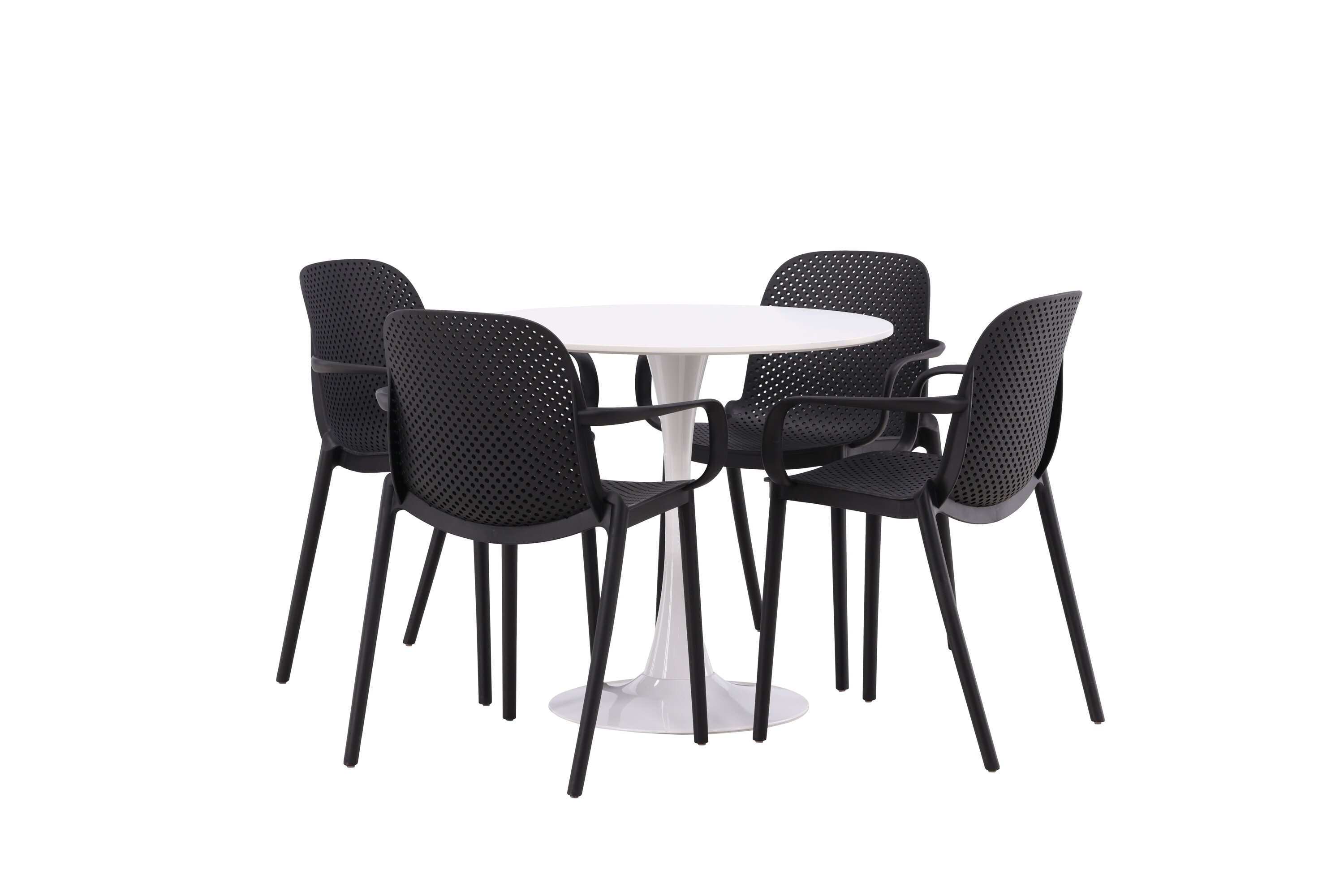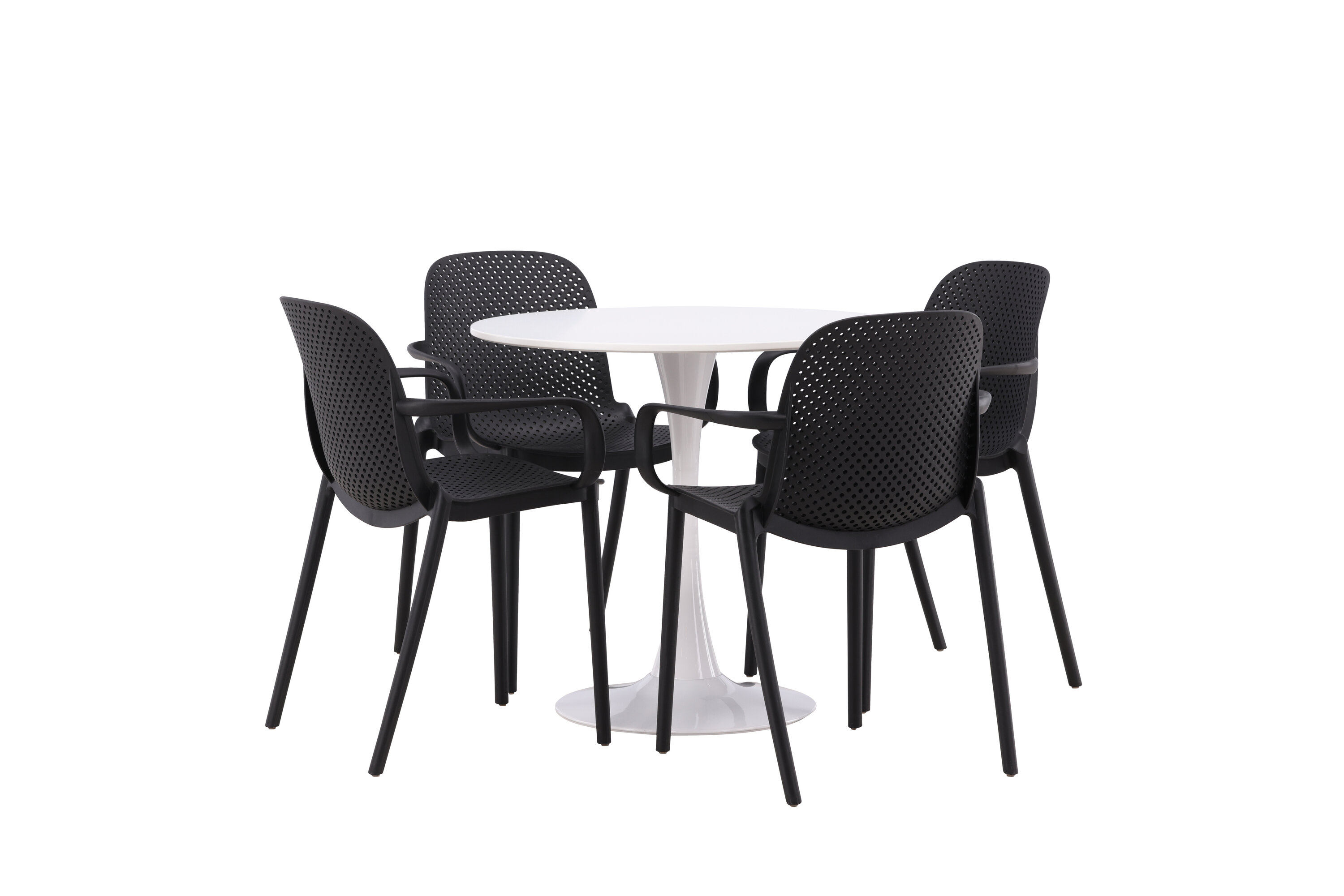 Der Hamden-Tisch hat eine Höhe von 75 cm und einen Durchmesser von 80 cm, was ihn kompakt und vielseitig macht. Die weiße Tischplatte sorgt für ein helles und frisches Gefühl, während die schwarzen Baltimore-Stühle einen starken Kontrast schaffen und dem Interieur einen modernen Touch verleihen.