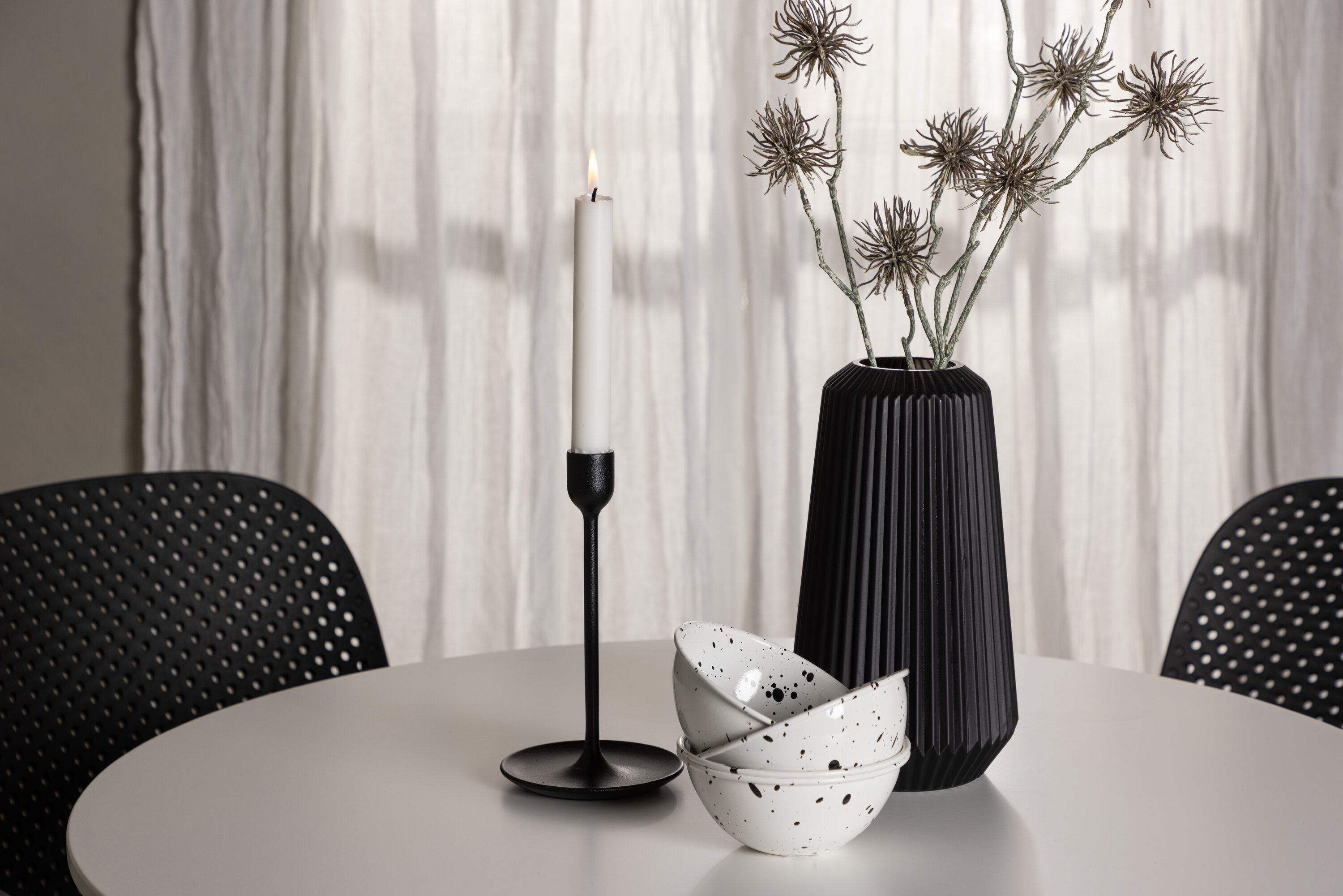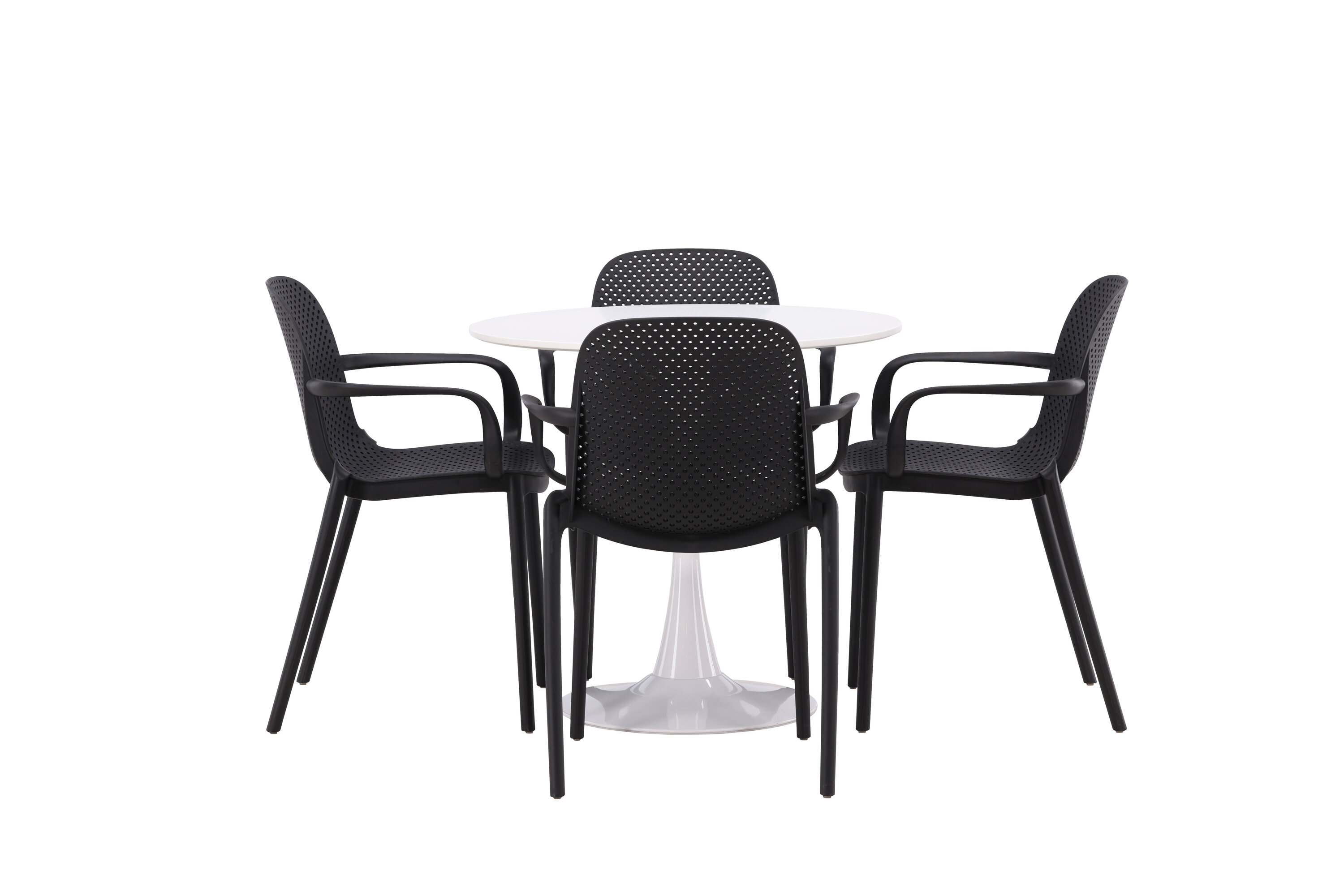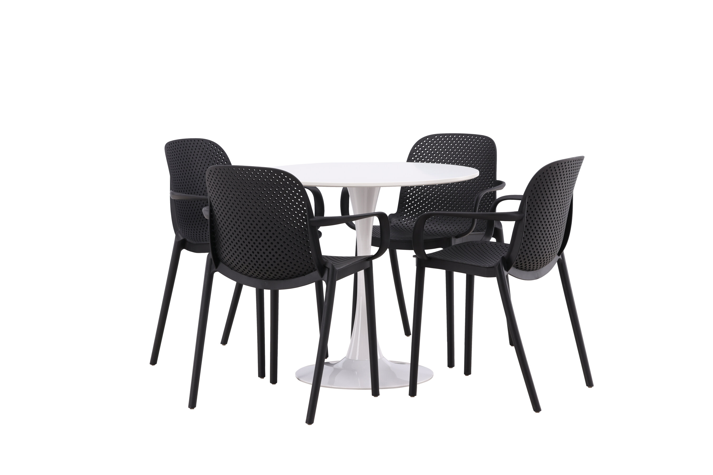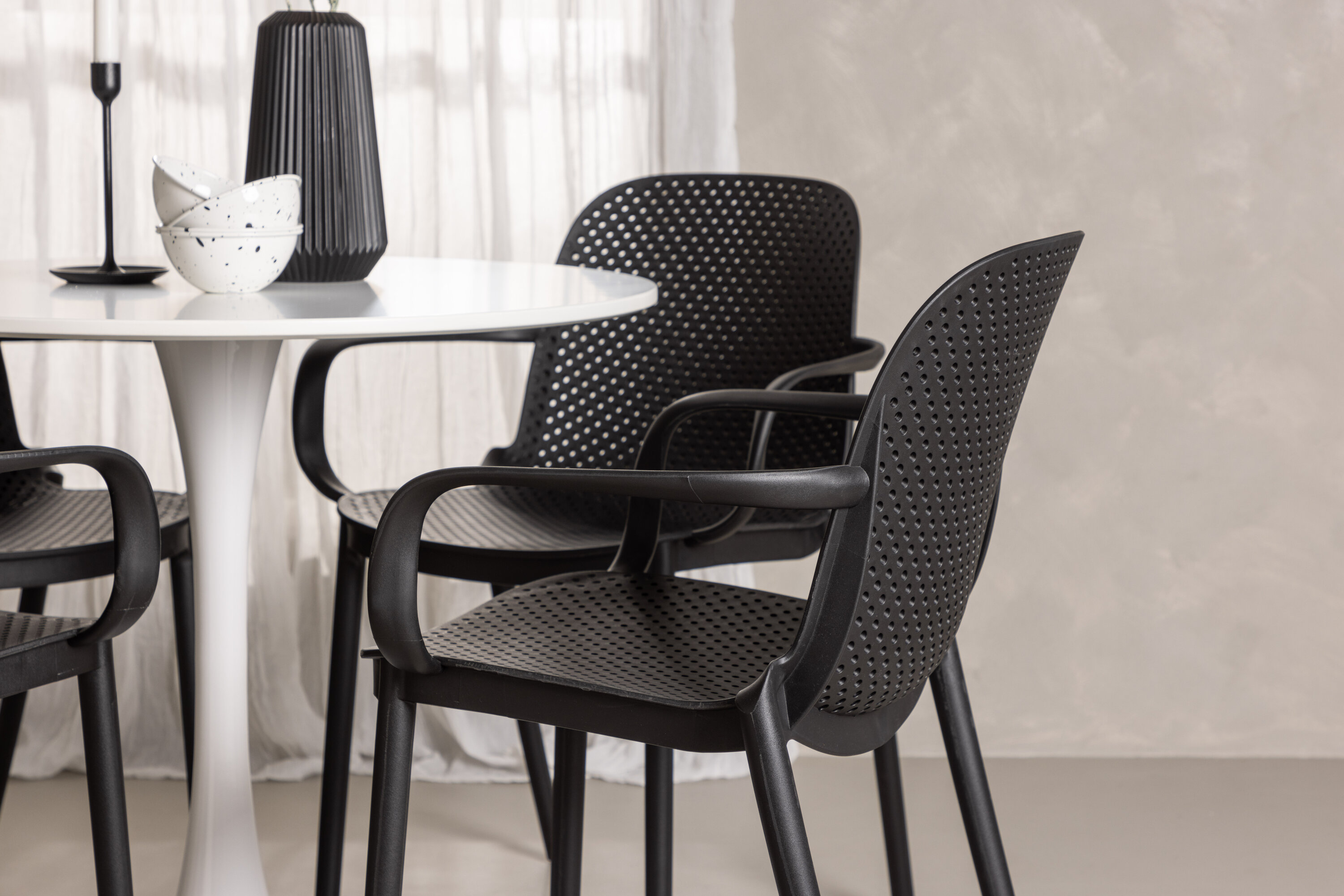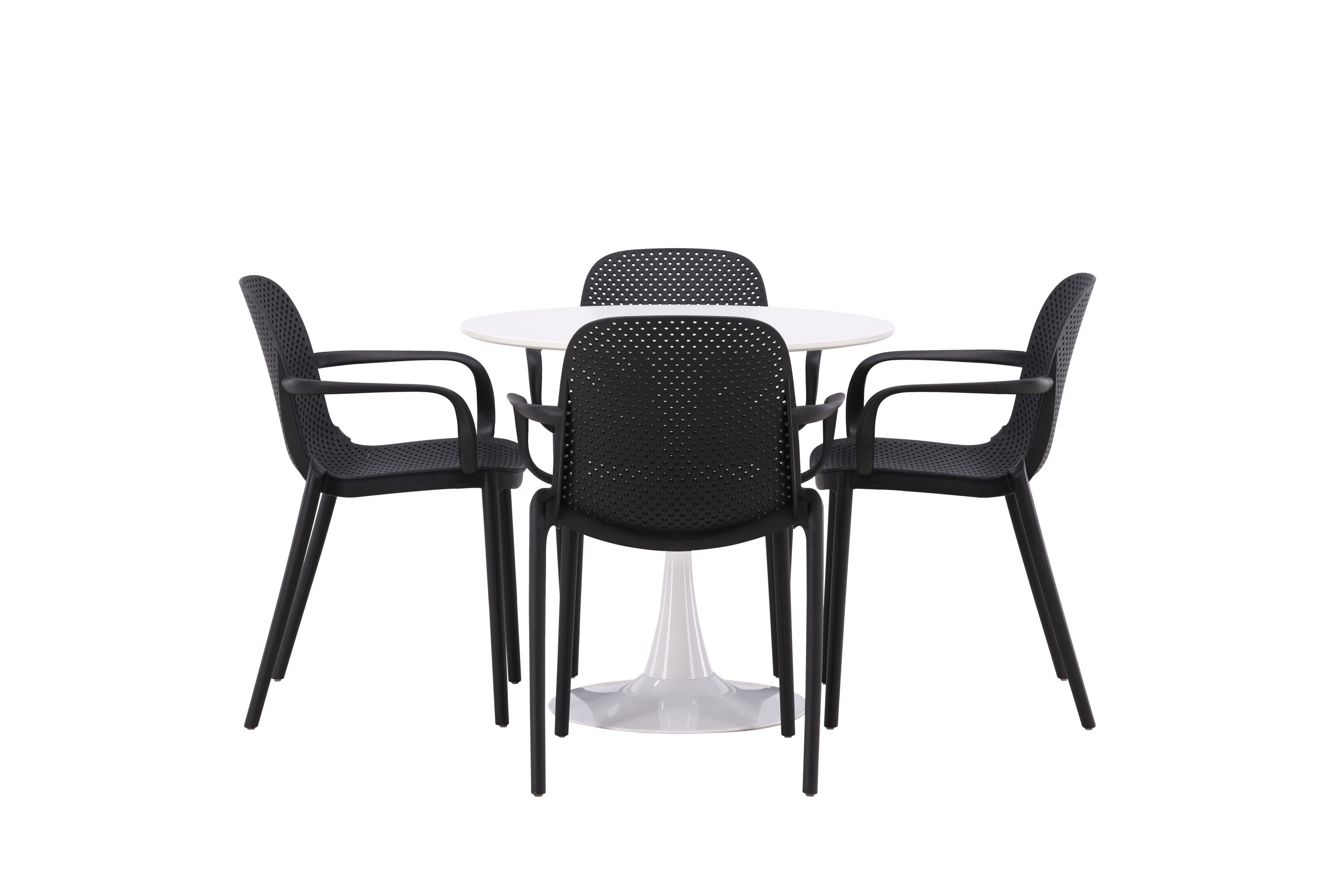 Der Hamden-Tisch hat eine Höhe von 75 cm und einen Durchmesser von 80 cm, was ihn kompakt und vielseitig macht. Die weiße Tischplatte sorgt für ein helles und frisches Gefühl, während die schwarzen Baltimore-Stühle einen starken Kontrast schaffen und dem Interieur einen modernen Touch verleihen.