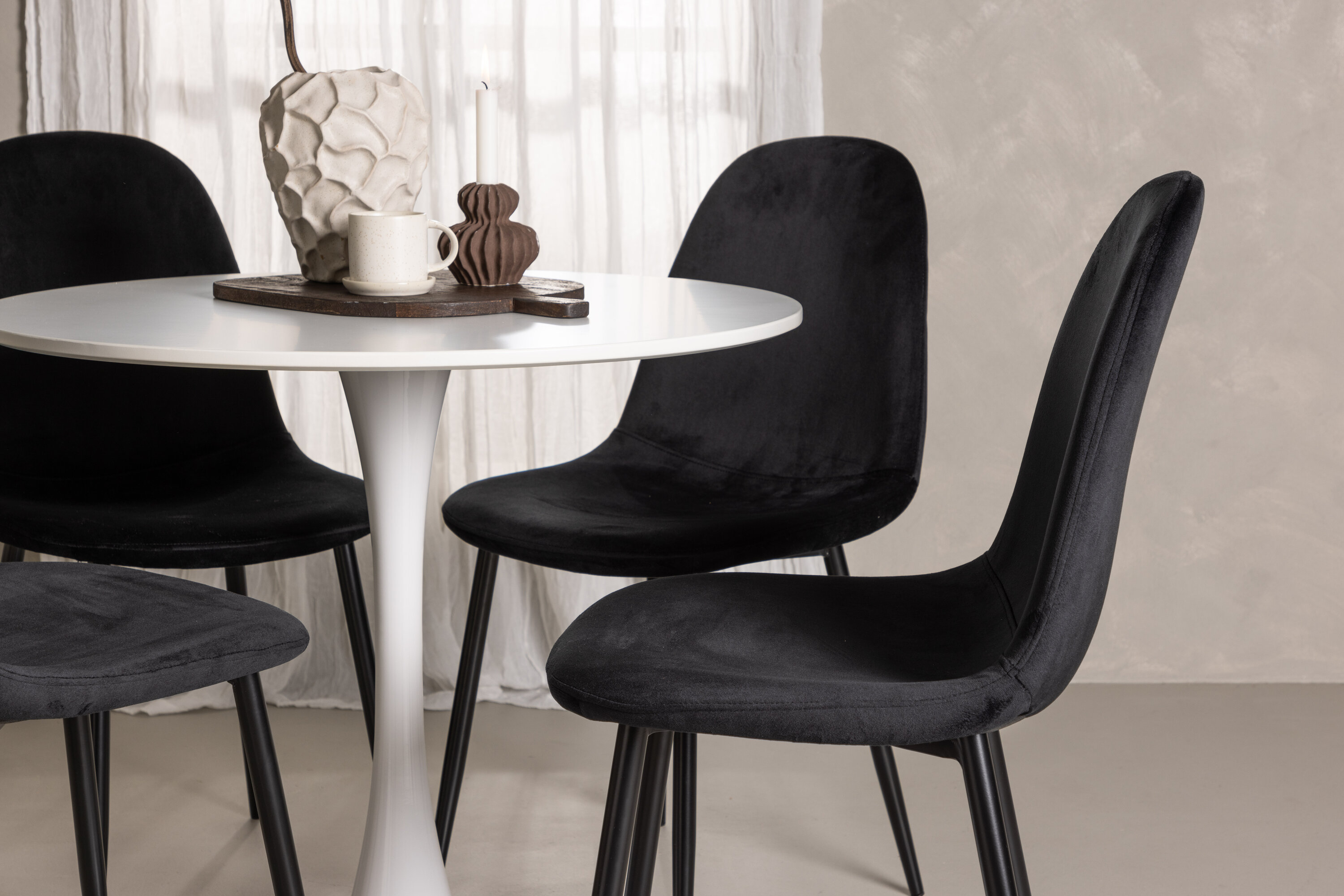 Das Ess-Set besteht aus vier Polarsesseln, die mit luxuriösem Samt bezogen sind. Diese sorgfältig ausgewählte Polsterung verleiht den Stühlen einen Hauch von Luxus und ein Gefühl von Opulenz. Der Sitzkomfort ist beispiellos- Sie werden lange nach dem Essen verweilen wollen. Das stilvolle Design und die exquisiten Details der Stühle vermitteln nicht nur ein Gefühl von Raffinesse, sondern bringen auch zeitlose Eleganz in Ihren Raum.