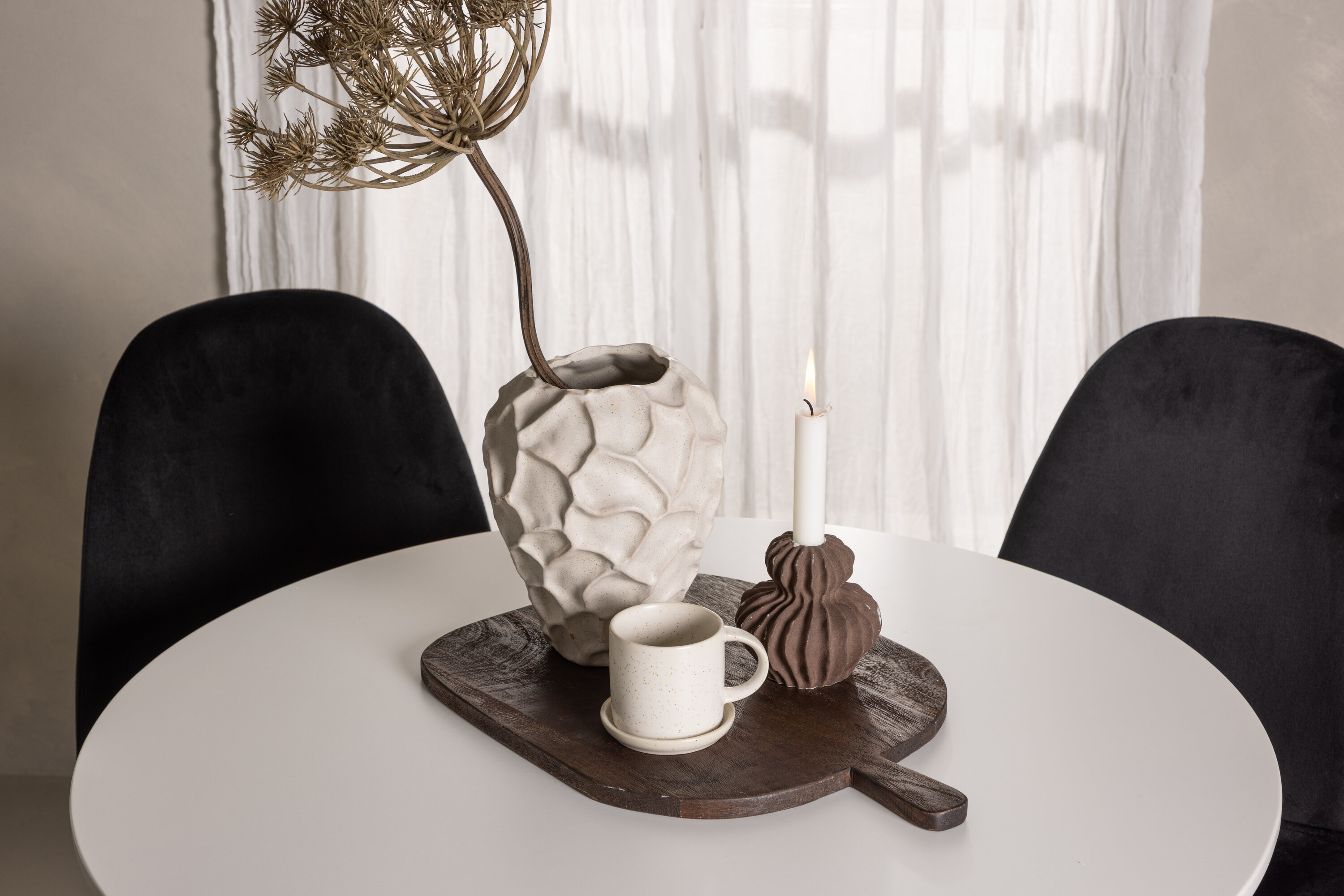Der Hamden-Tisch ist nicht nur ein funktionales Möbelstück, sondern ein Kunstwerk. Die weiße MDF-Tischplatte mit einem Durchmesser von 80 cm strahlt Reinheit aus und schafft ein frisches und offenes Gefühl im Raum. Der robuste Stahlrahmen sorgt nicht nur für Stabilität, sondern bietet auch einen dezenten Kontrast zur weichen Oberfläche der Tischplatte.