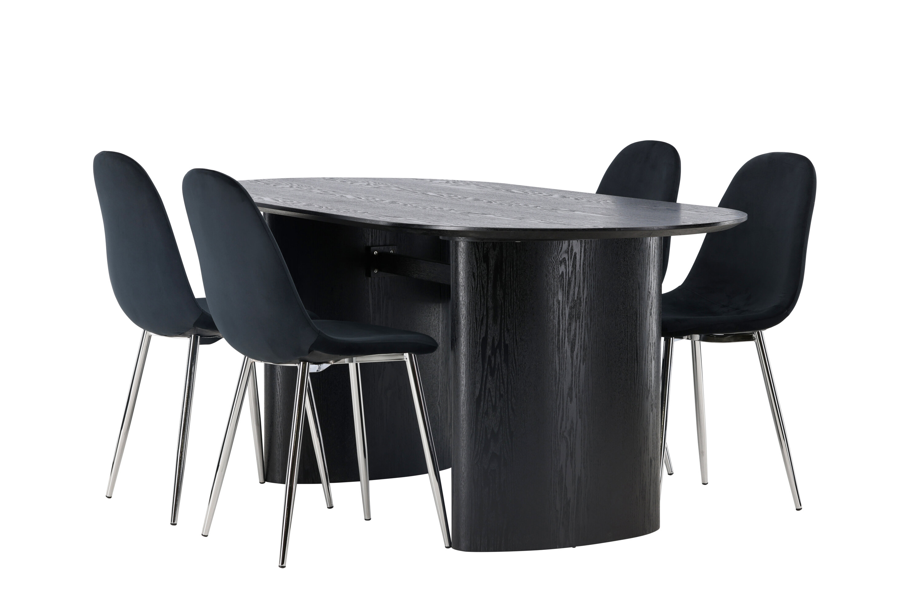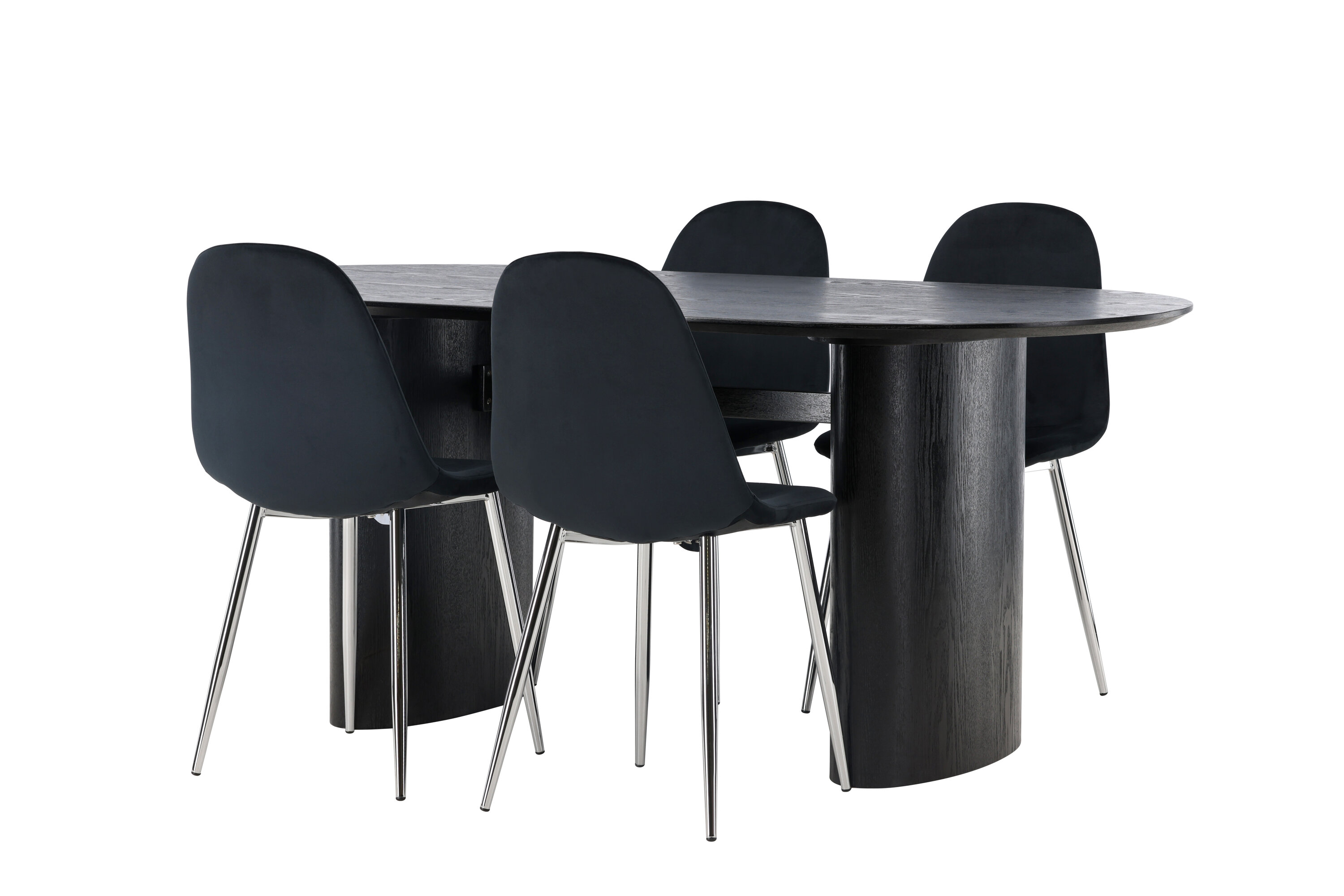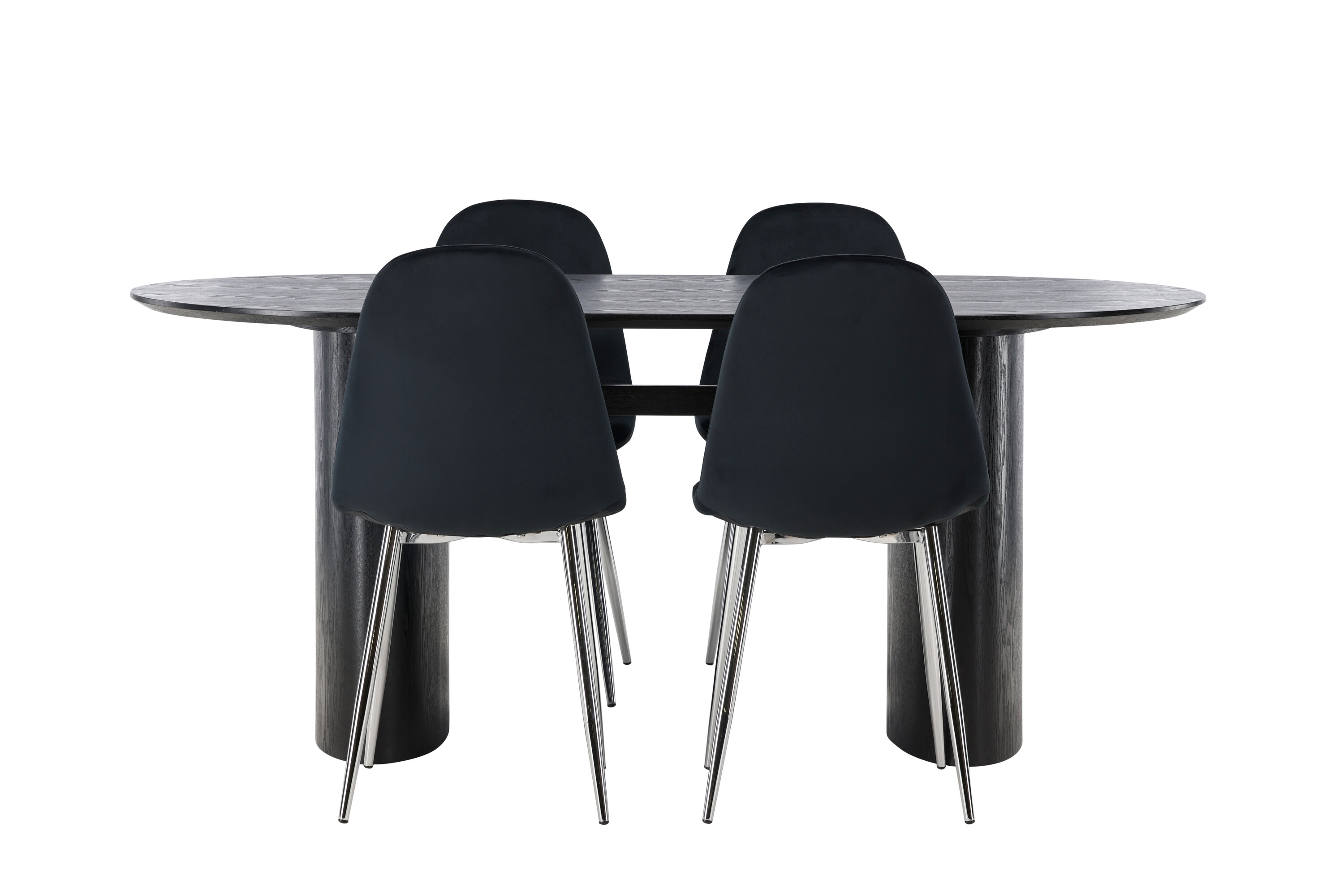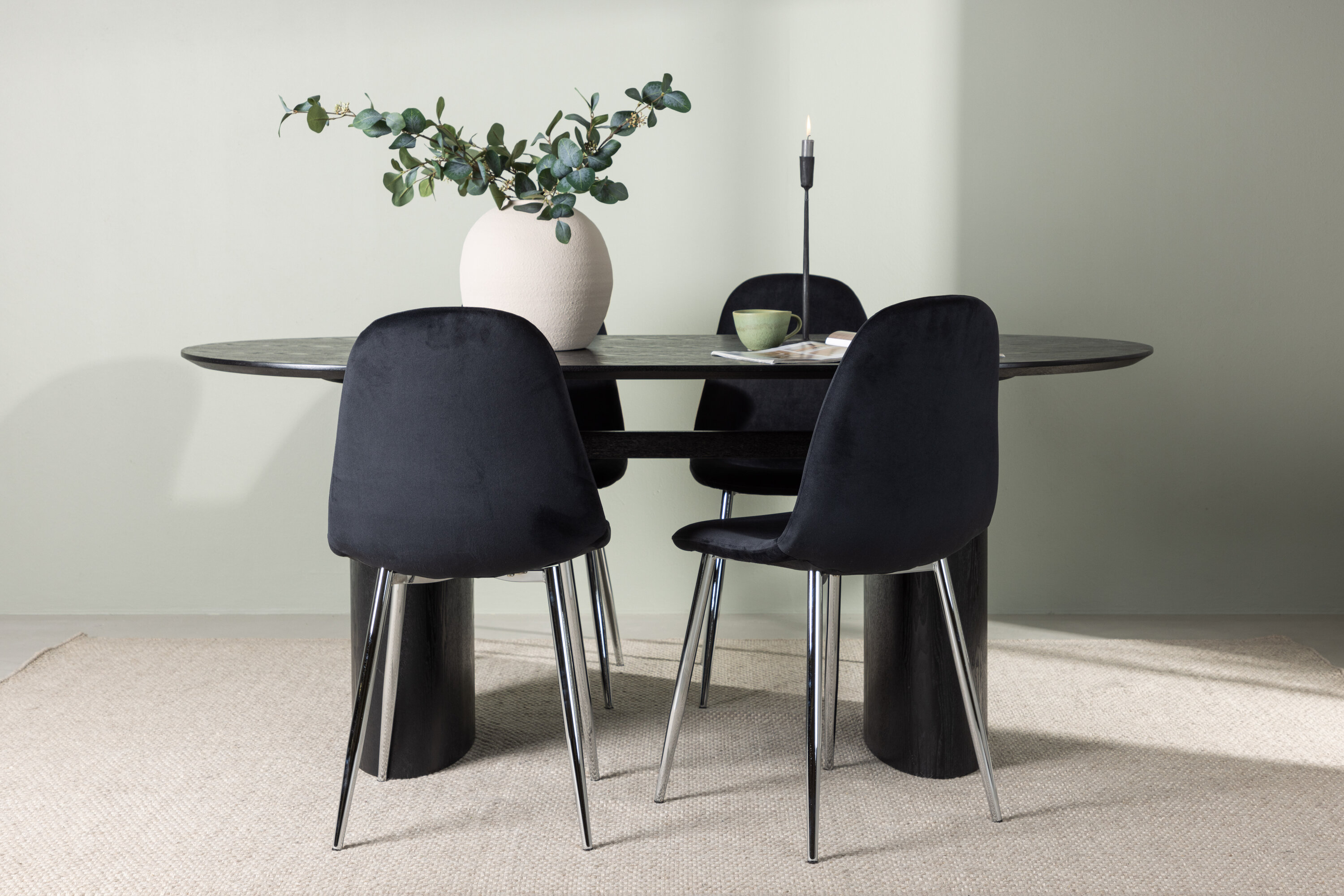 Schaffen Sie einen beeindruckenden Look im Wohnzimmer! Der ovale Esstisch Isolde in schwarzer Farbe hat ein modernes Design mit einer ovalen Tischplatte aus MDF und einem robusten Rahmen, der einen stetigen Eindruck vermittelt. Das lebendige Material verleiht dem Hingucker eine schöne Bewegung. Hier in moderner Kombination mit schwarzen Esszimmerstühlen aus der Serie Polar. Der Stuhl hat ein vollständig gepolstertes Design mit Beinen aus verchromtem Metall, einer leicht abgerundeten Rückenlehne und einem Sitz aus elegantem schwarzem Samtstoff mit weicher Polsterung für zusätzlichen Komfort. Kann es noch besser werden? Tischabmessungen: 180x75cm.