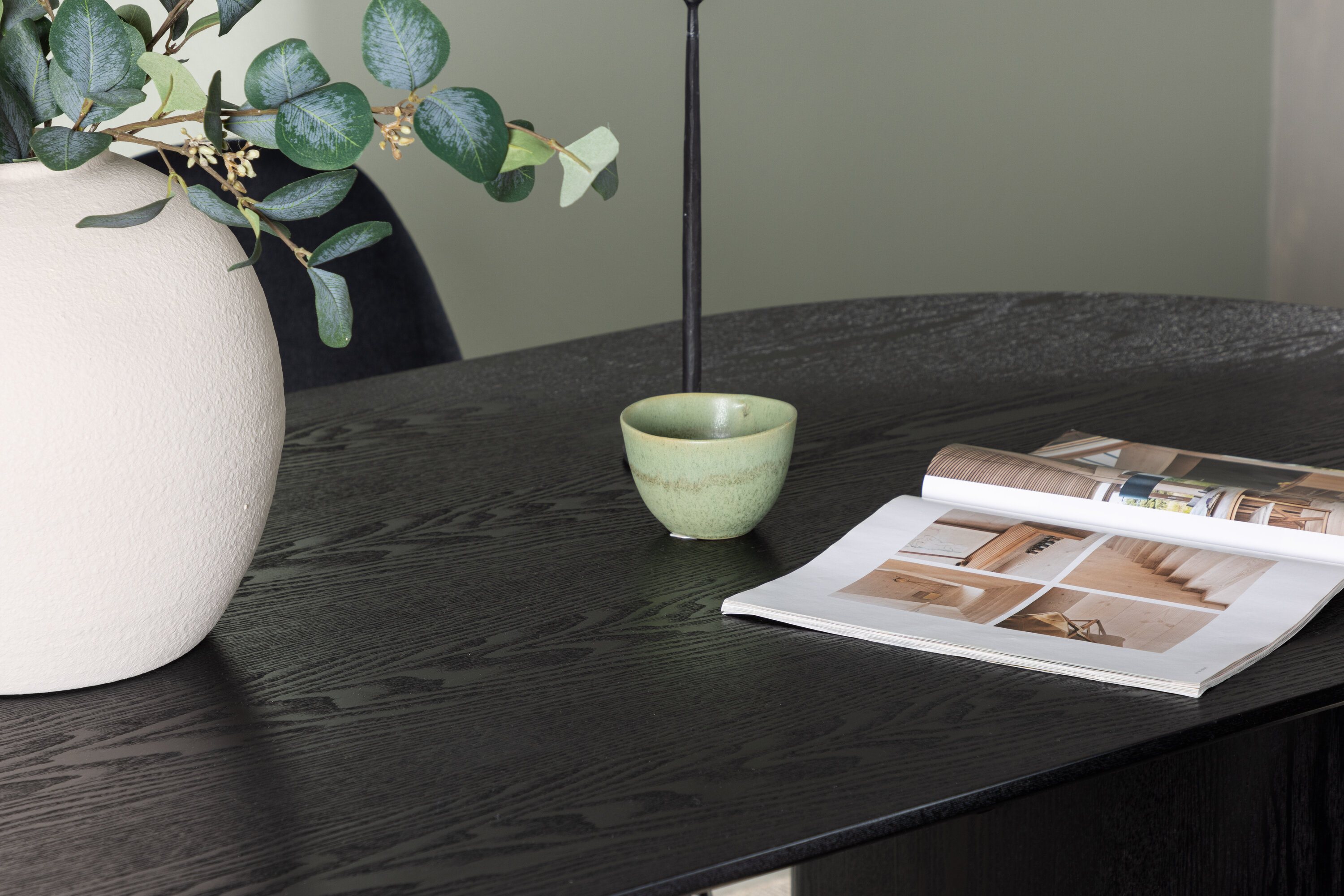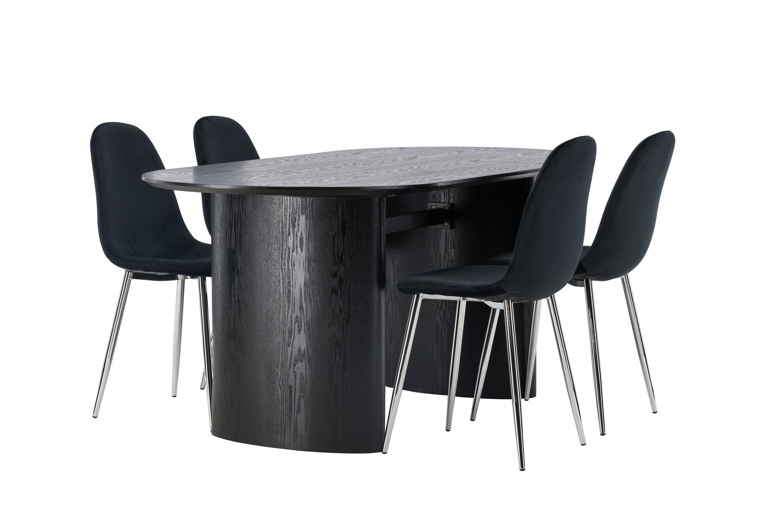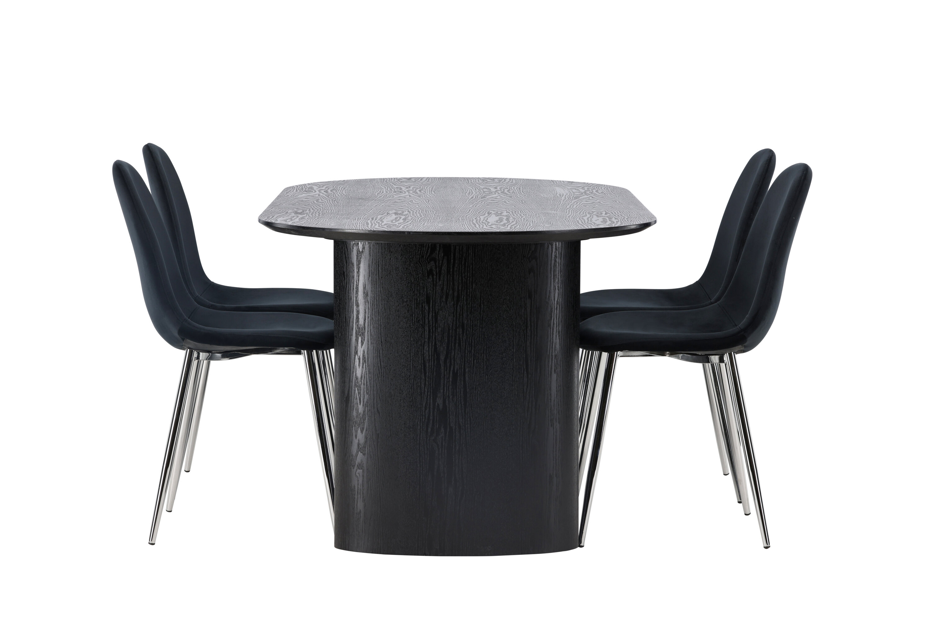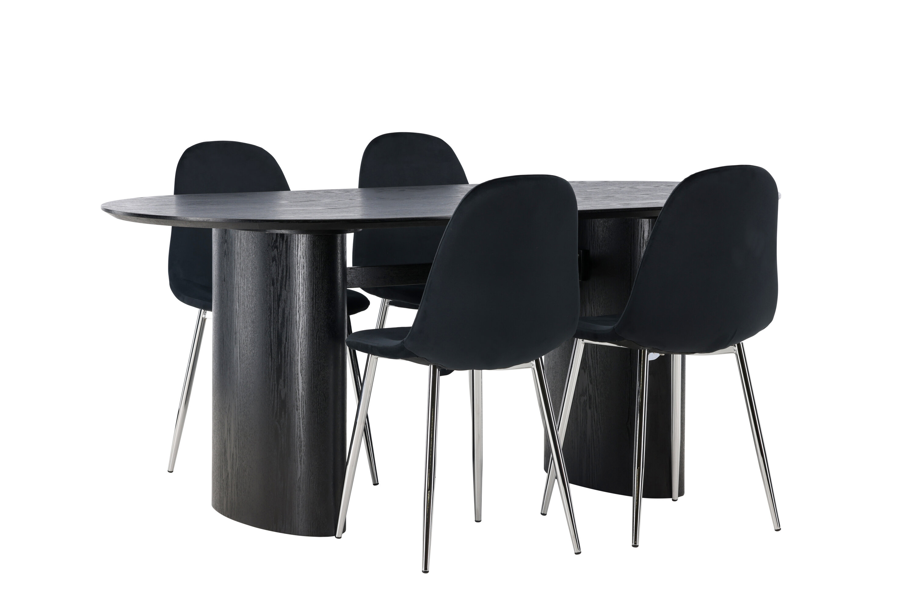 Schaffen Sie einen beeindruckenden Look im Wohnzimmer! Der ovale Esstisch Isolde in schwarzer Farbe hat ein modernes Design mit einer ovalen Tischplatte aus MDF und einem robusten Rahmen, der einen stetigen Eindruck vermittelt. Das lebendige Material verleiht dem Hingucker eine schöne Bewegung. Hier in moderner Kombination mit schwarzen Esszimmerstühlen aus der Serie Polar. Der Stuhl hat ein vollständig gepolstertes Design mit Beinen aus verchromtem Metall, einer leicht abgerundeten Rückenlehne und einem Sitz aus elegantem schwarzem Samtstoff mit weicher Polsterung für zusätzlichen Komfort. Kann es noch besser werden? Tischabmessungen: 180x75cm.