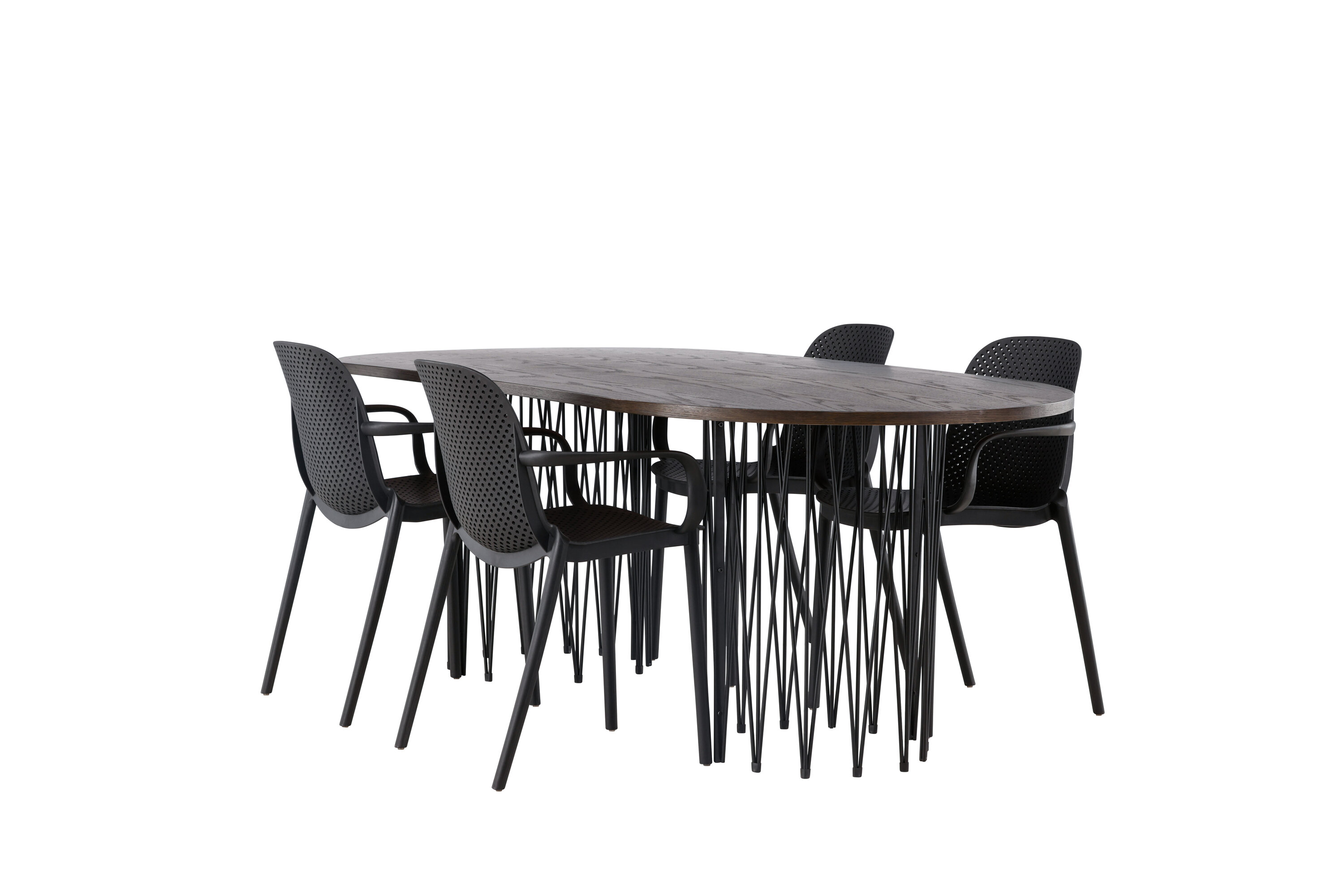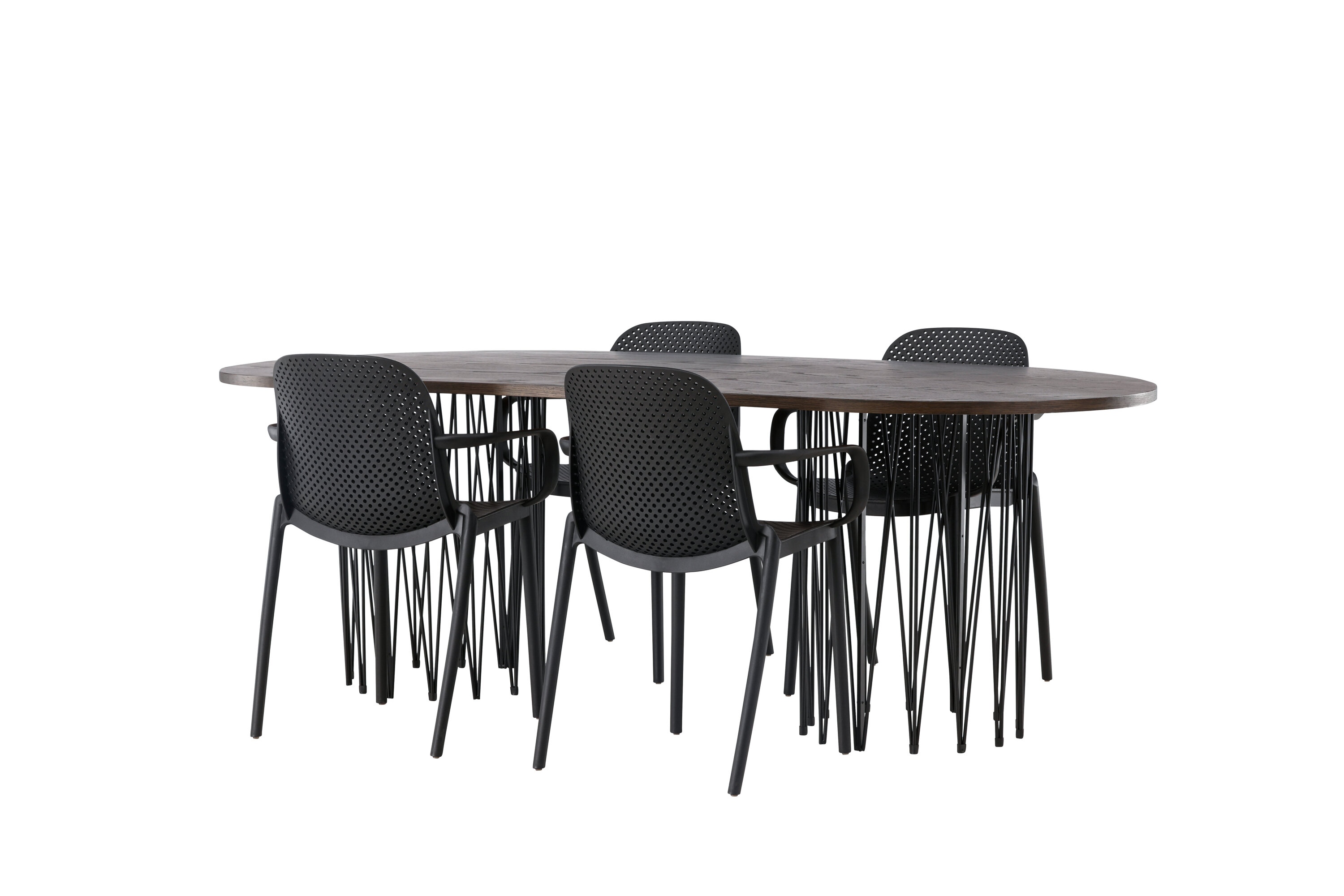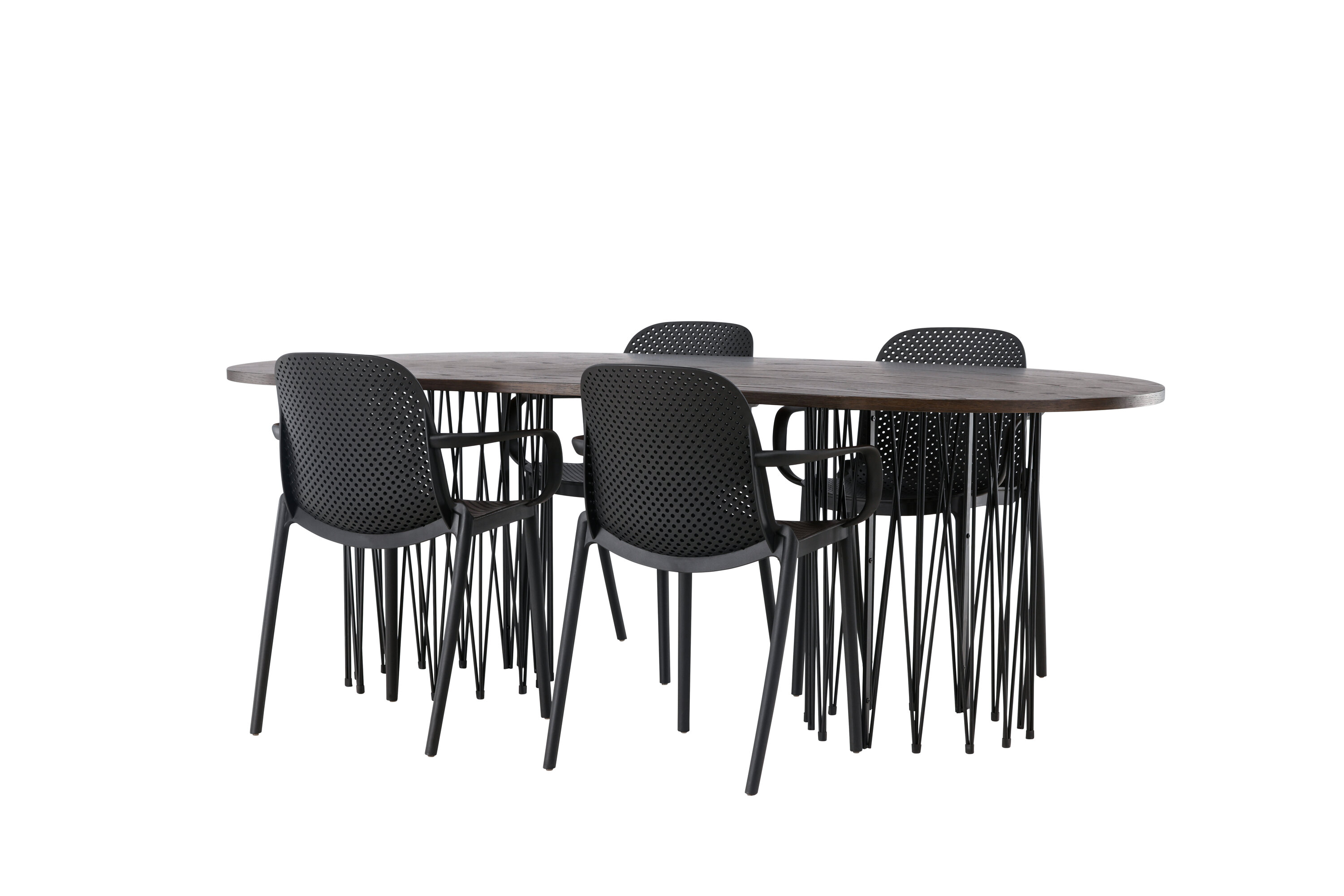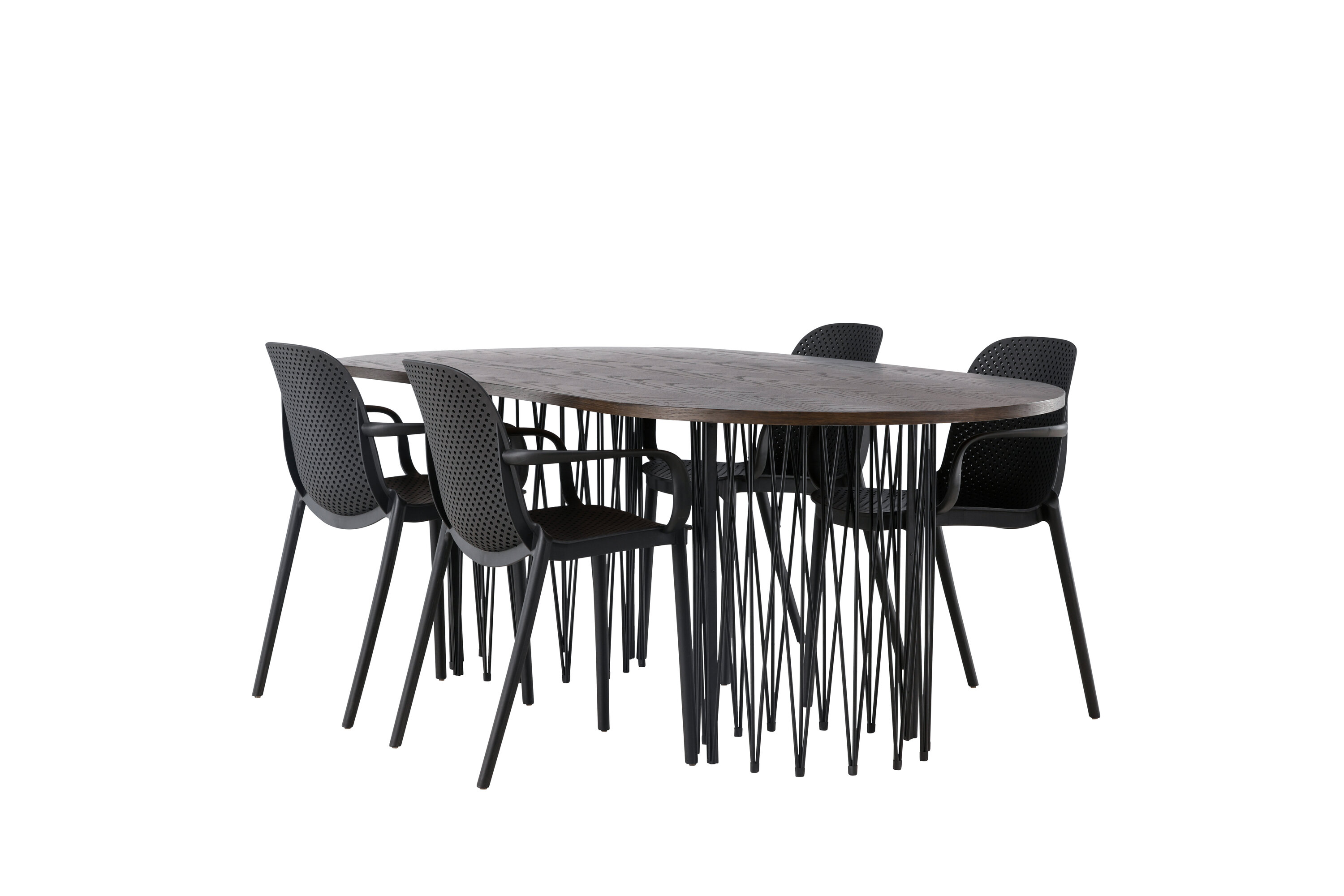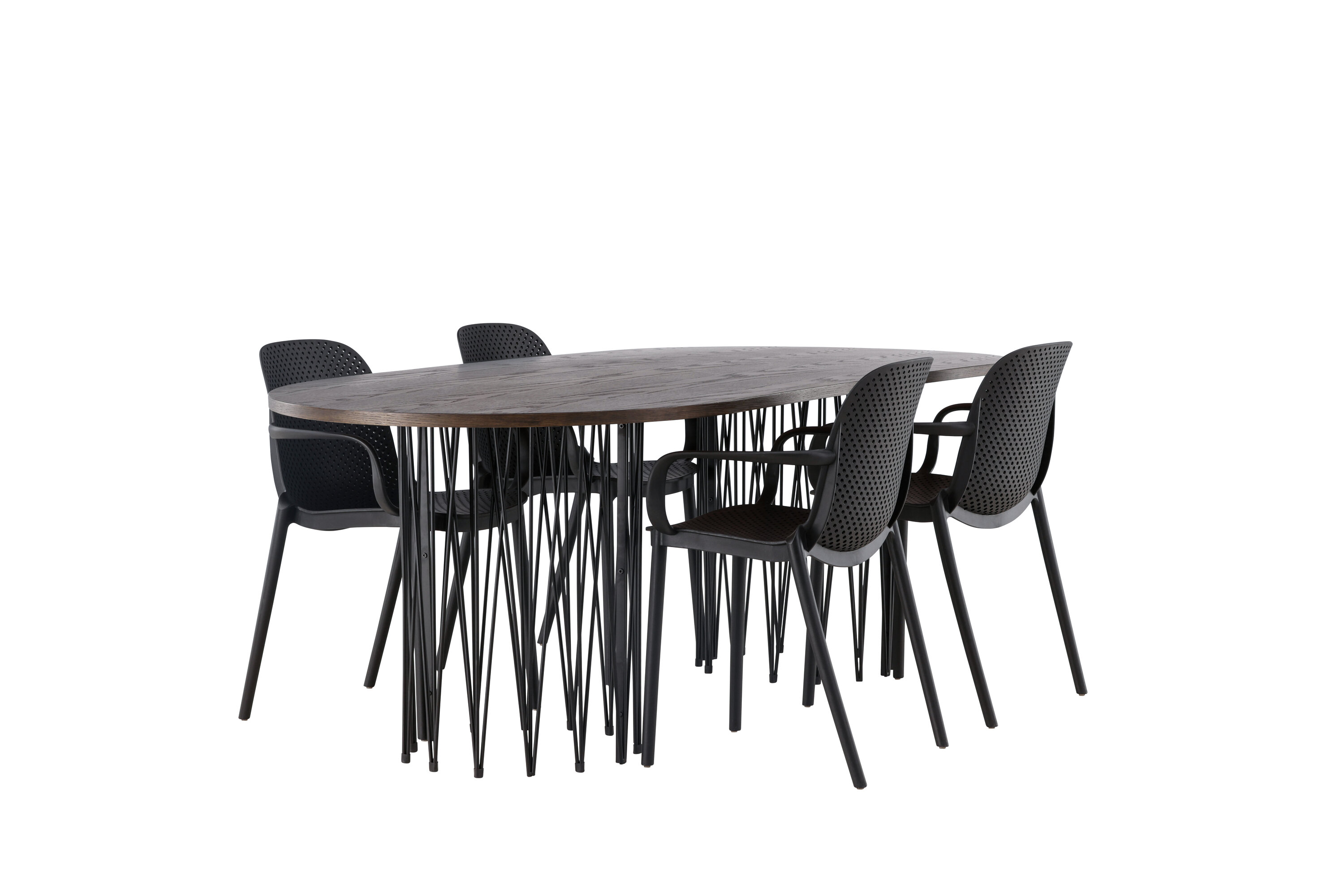 Eine Essgruppe im Industrial-Look! Unser ovaler Esstisch Stone besticht durch sein modebewusstes Design. Der Tisch hat eine schöne braune Tischplatte aus MDF mit Furnier und zwei dekorative zylindrische Rahmen aus schwarzem Metall. Hier zusammen mit unseren smarten Esszimmerstühlen aus der Serie Baltimore. Der Stuhl ist aus schwarzem Kunststoff gefertigt und das Design ist trendy mit geraden nordischen Formen und integrierten Armlehnen für zusätzlichen Komfort. Eine langlebige Essgruppe, die den Test der Zeit besteht! Tischabmessungen: 220x100cm.