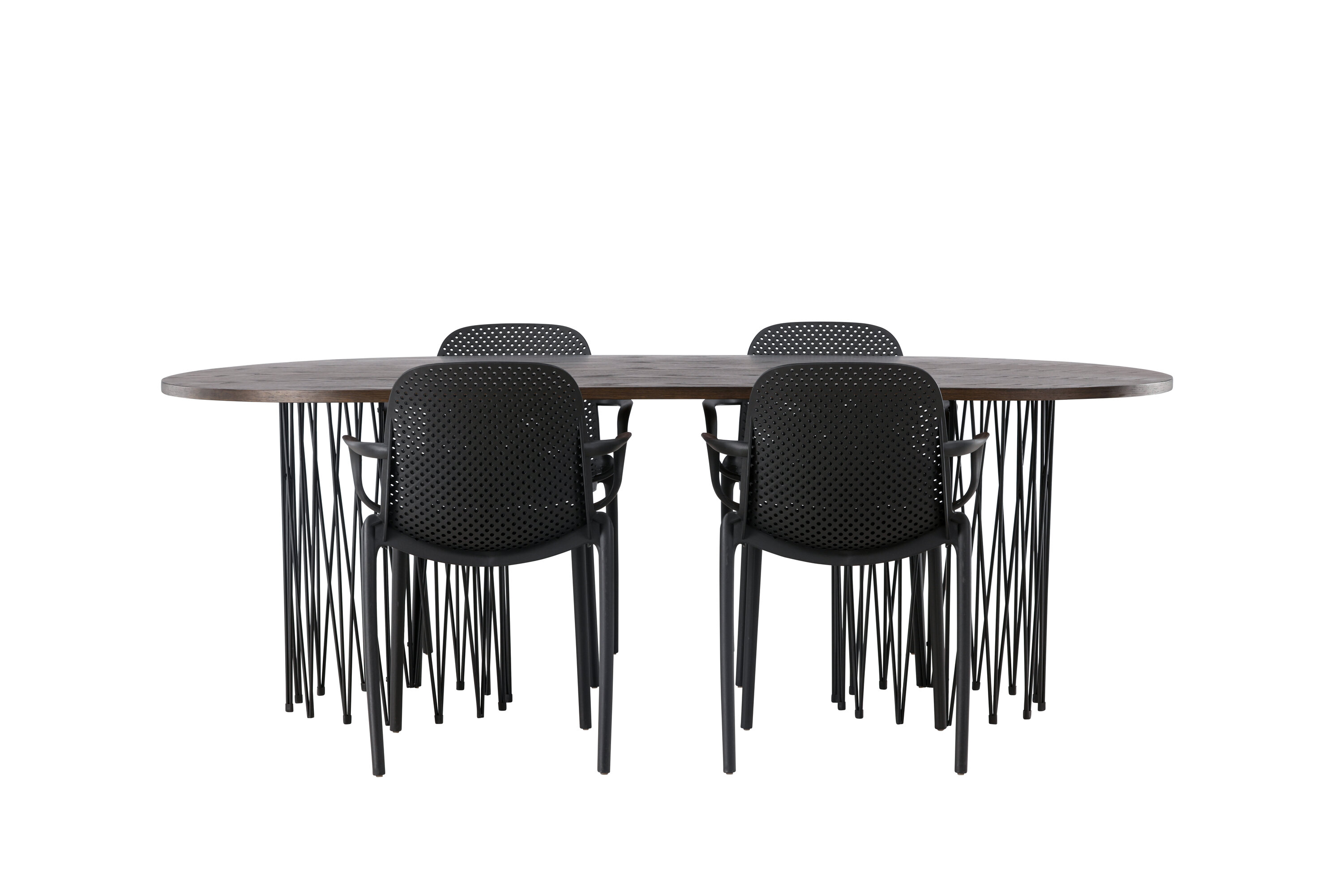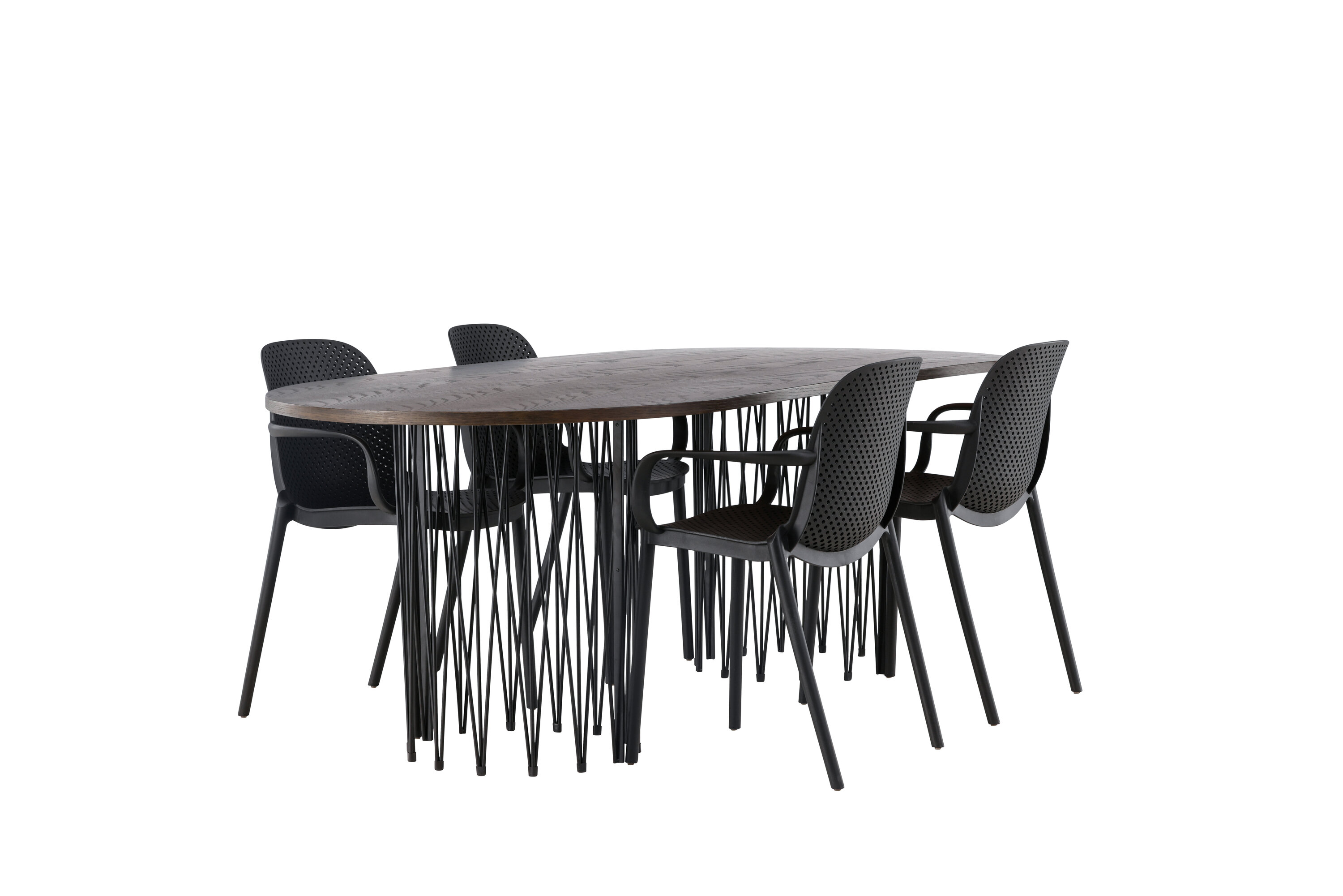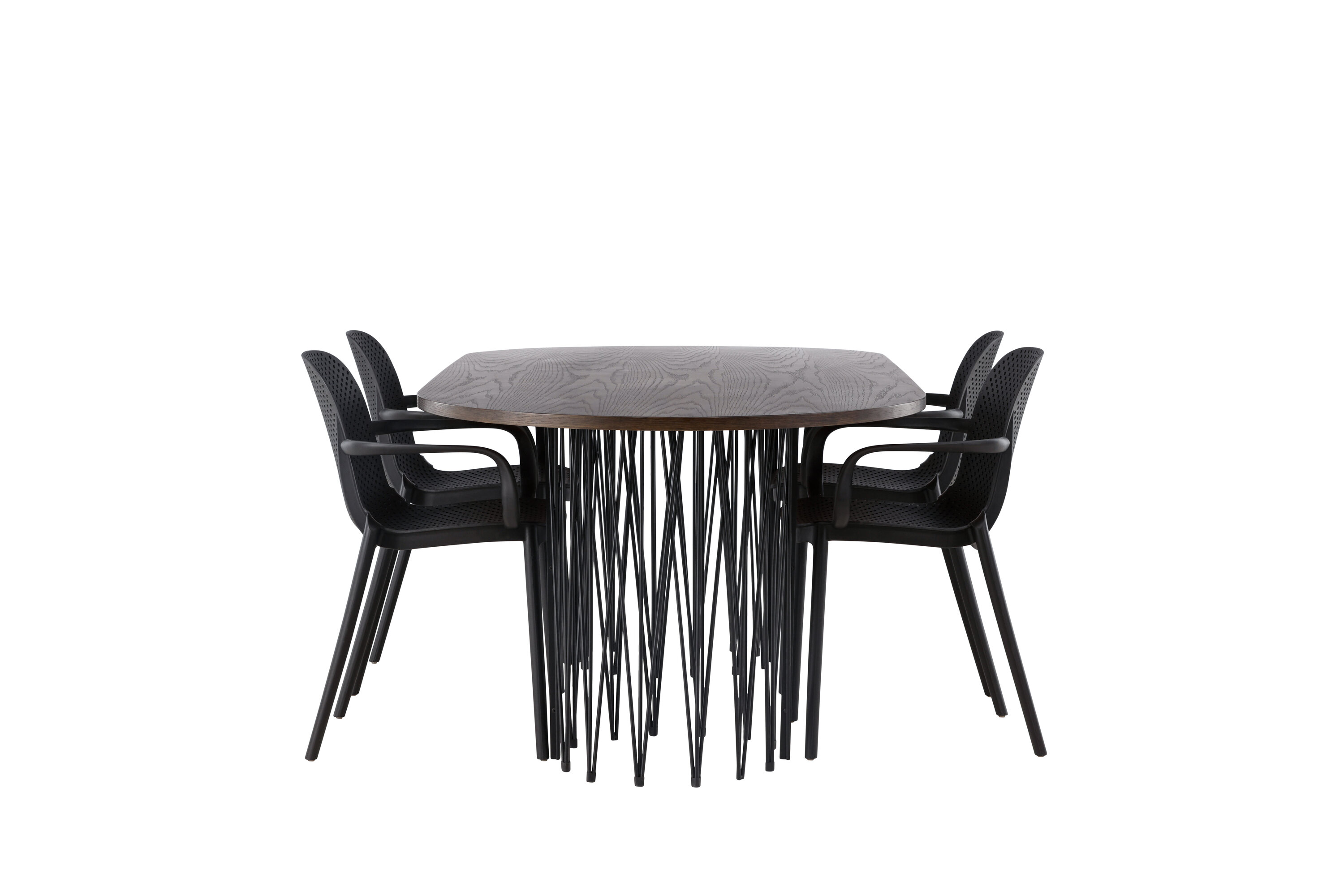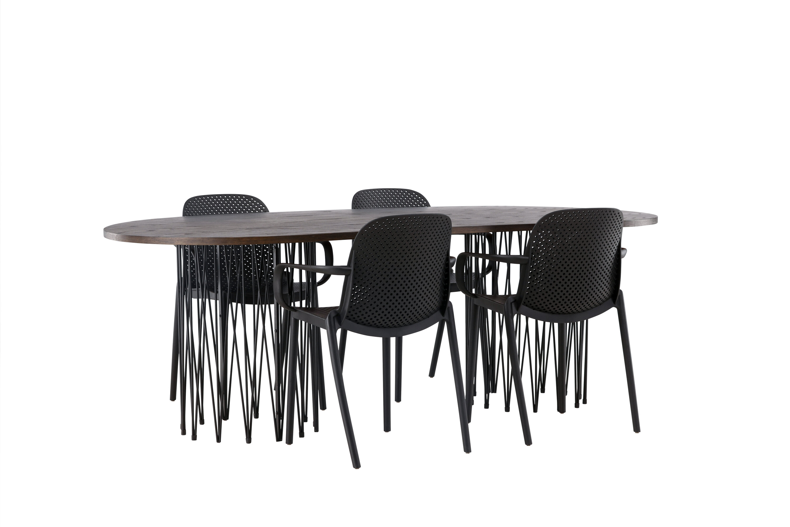 Eine Essgruppe im Industrial-Look! Unser ovaler Esstisch Stone besticht durch sein modebewusstes Design. Der Tisch hat eine schöne braune Tischplatte aus MDF mit Furnier und zwei dekorative zylindrische Rahmen aus schwarzem Metall. Hier zusammen mit unseren smarten Esszimmerstühlen aus der Serie Baltimore. Der Stuhl ist aus schwarzem Kunststoff gefertigt und das Design ist trendy mit geraden nordischen Formen und integrierten Armlehnen für zusätzlichen Komfort. Eine langlebige Essgruppe, die den Test der Zeit besteht! Tischabmessungen: 220x100cm.
