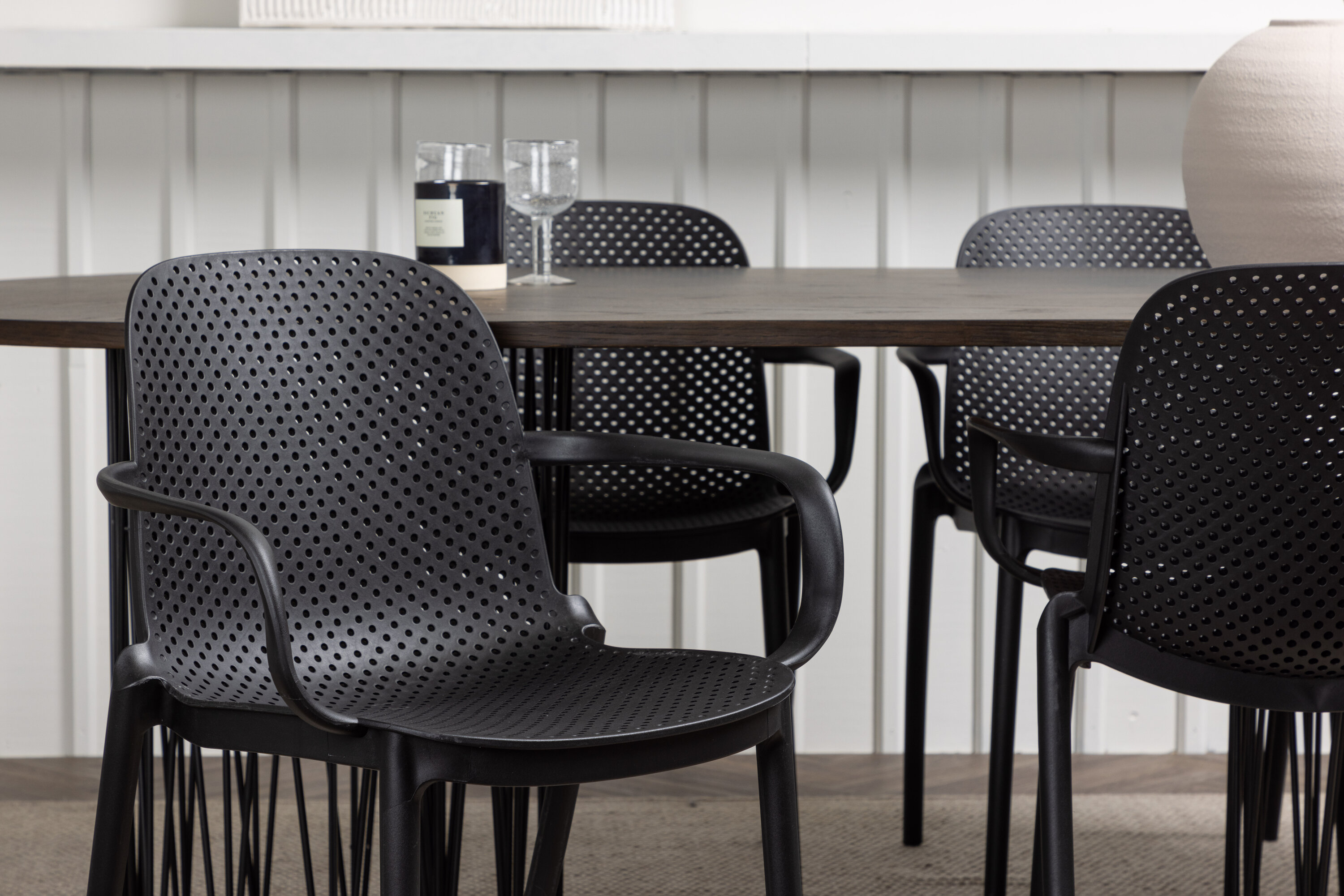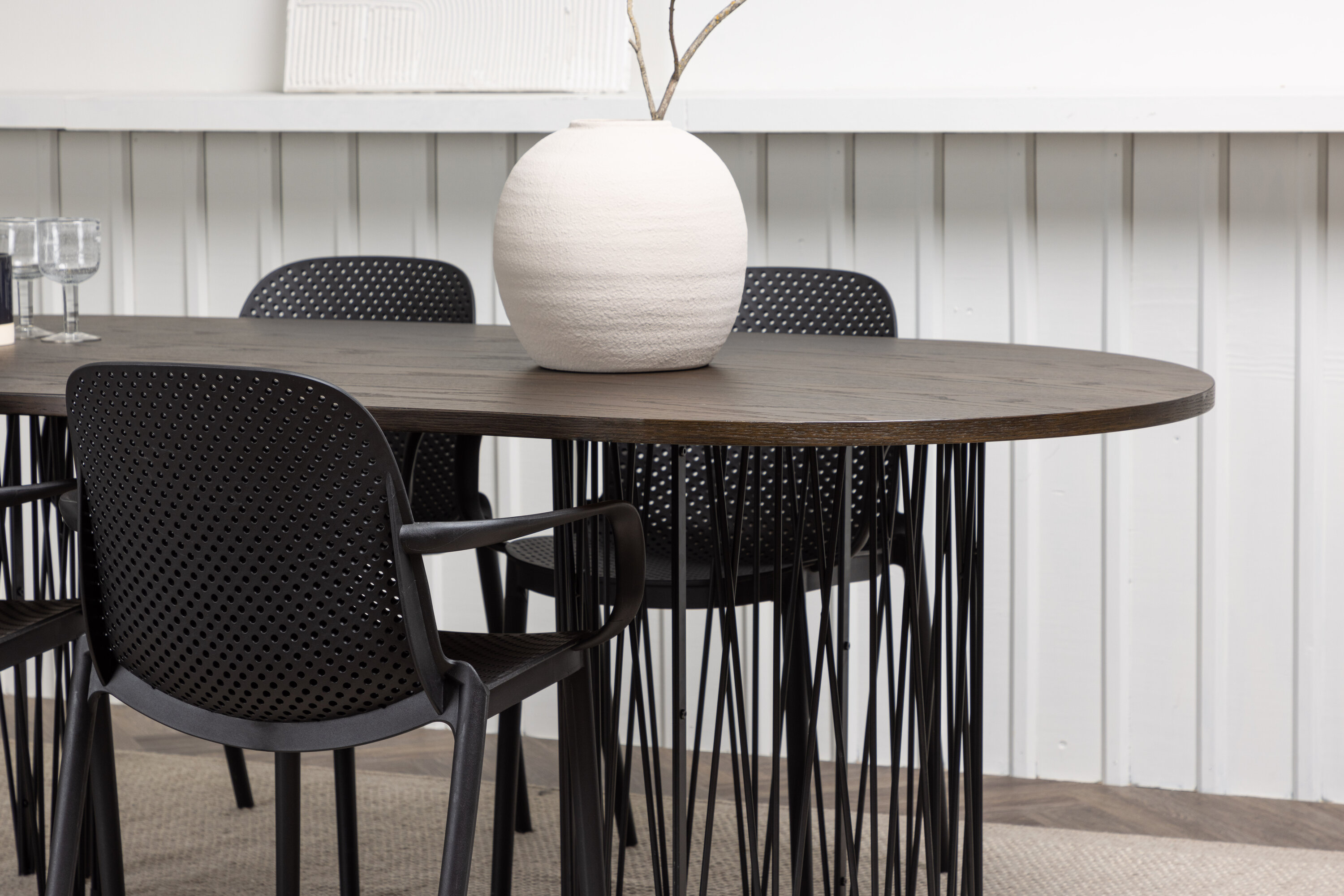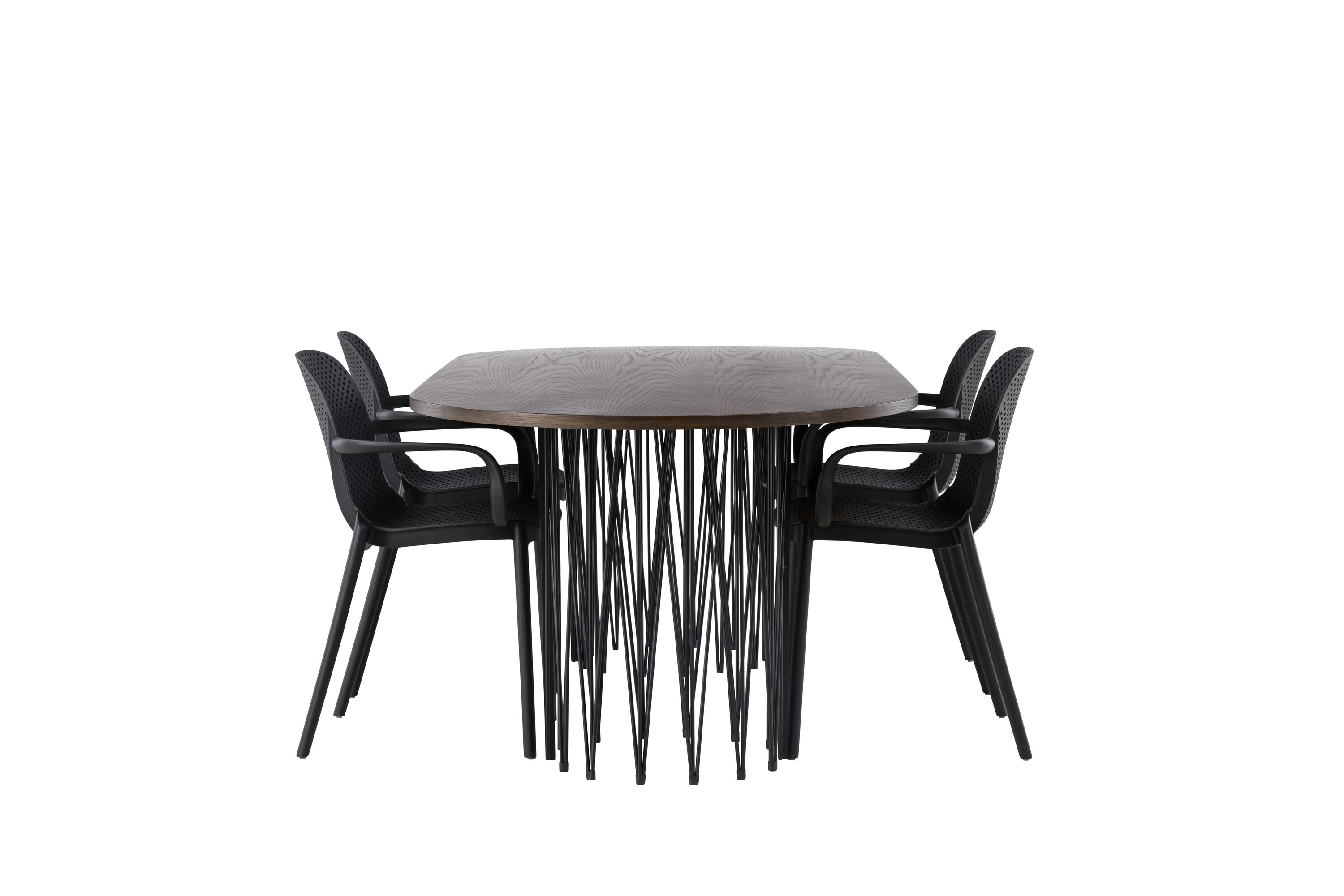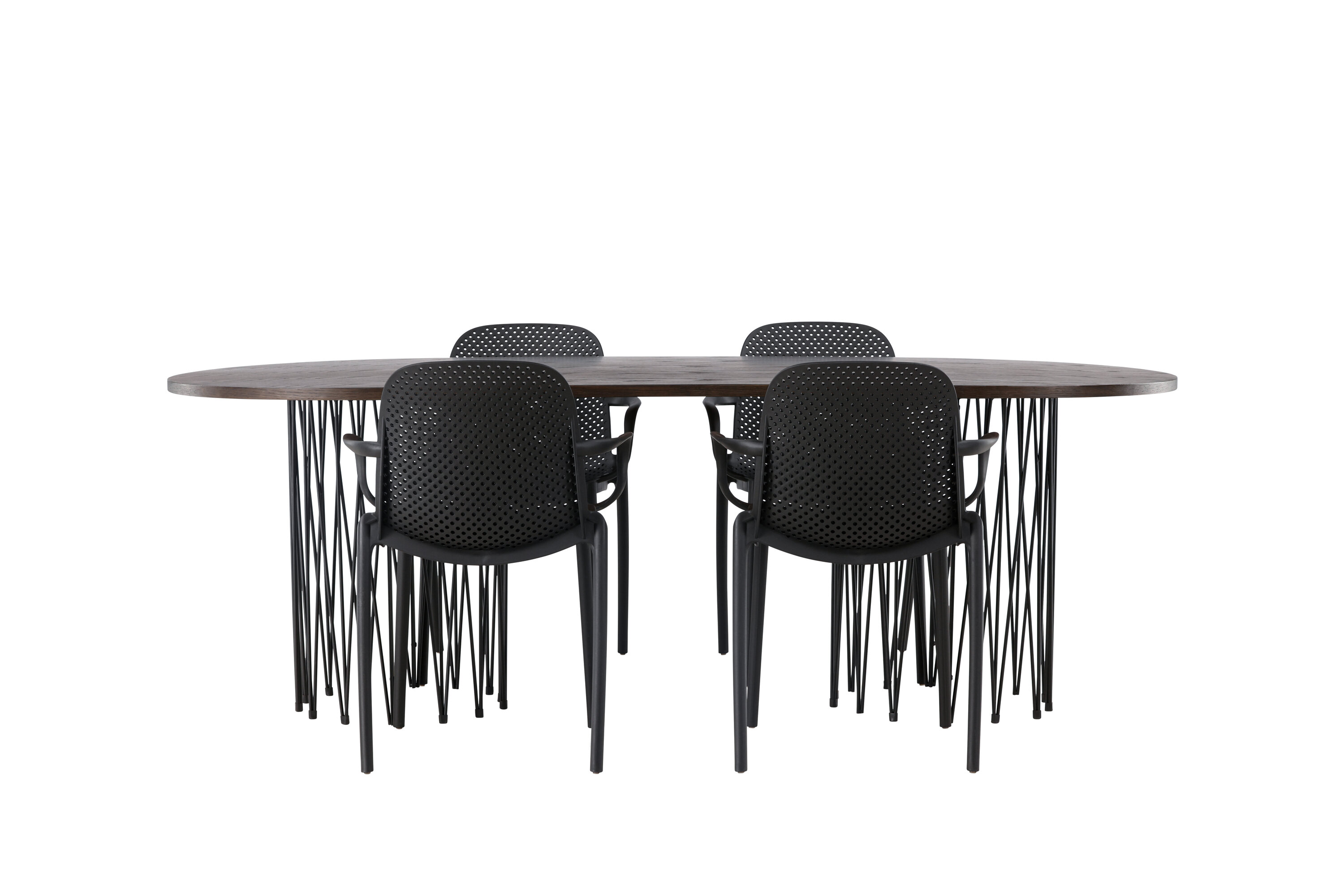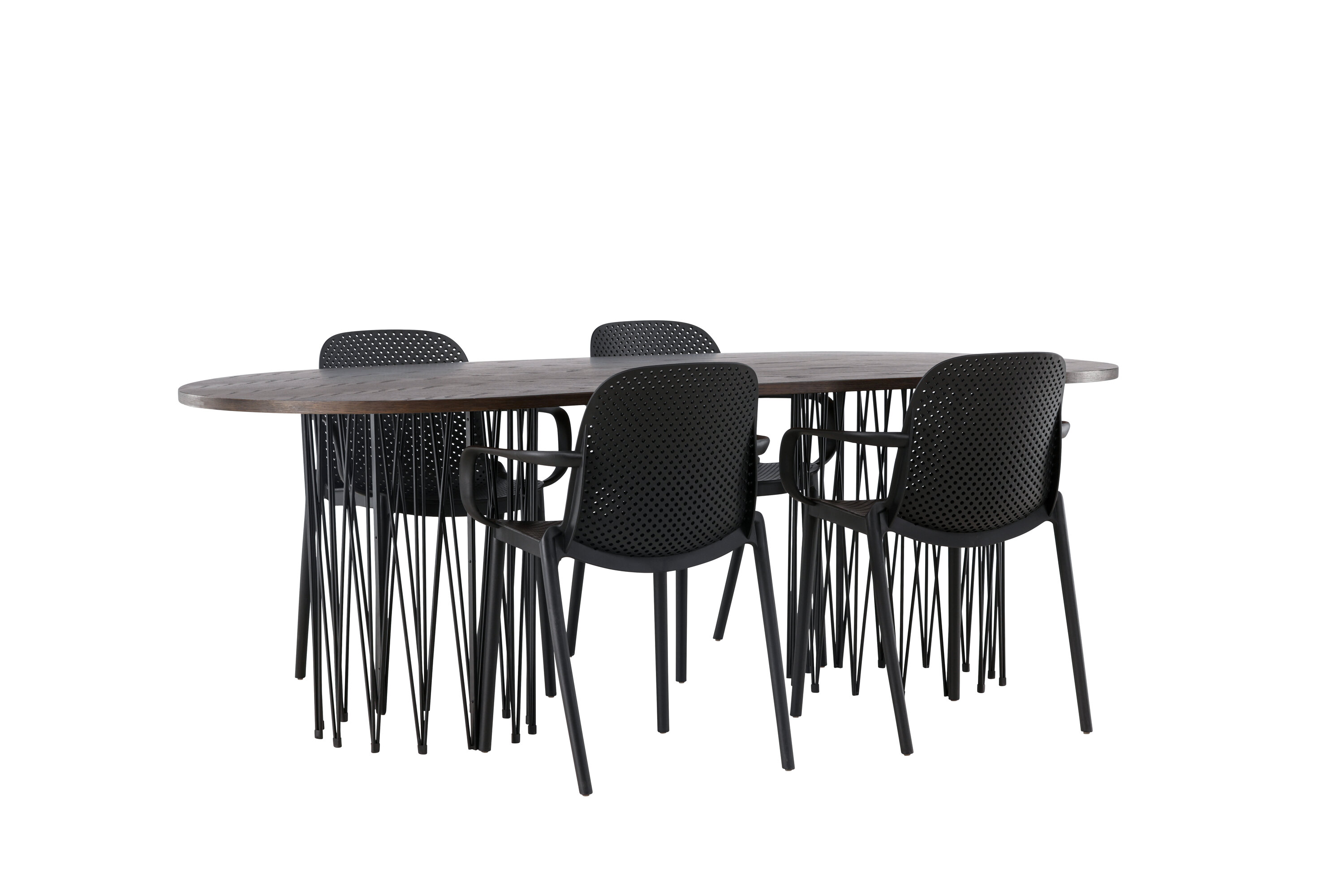 Eine Essgruppe im Industrial-Look! Unser ovaler Esstisch Stone besticht durch sein modebewusstes Design. Der Tisch hat eine schöne braune Tischplatte aus MDF mit Furnier und zwei dekorative zylindrische Rahmen aus schwarzem Metall. Hier zusammen mit unseren smarten Esszimmerstühlen aus der Serie Baltimore. Der Stuhl ist aus schwarzem Kunststoff gefertigt und das Design ist trendy mit geraden nordischen Formen und integrierten Armlehnen für zusätzlichen Komfort. Eine langlebige Essgruppe, die den Test der Zeit besteht! Tischabmessungen: 220x100cm.